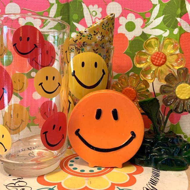 70'S USA Vintage RD/YE Smile glass。 70年代 ヴィンテージ スマイルフェイスのガラス製グラスタンブラーです。 イエローとレッドのスマイルがヴィンテージならではな、とっても可愛い雰囲気です。 底の方のイエローのスマイルの表情が1つだけShitの表情なのも可愛いポイントです。 経年による擦れや小さなシミ、底面に曇りが見られます。 若干の経年感は見られますが、近年なかなか見かけることが少なくなってきている希少なアイテムかと思います。 口径 約6.8cm 高さ 約14cm ■発送・注文に関する情報や注意事項 ご注文後、通常3~5営業日以内に発送いたします。宅配便にてお届けいたしますので、配送先の住所が正確であることをご確認ください。 ■ その他の情報や注意事項 在庫には限りがありますので、売り切れの場合はご了承ください。また、お使いのディスプレイによって色合いに若干の違いが見られることがあります。