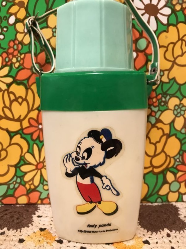 1963'S DEADSTOCK Andy Panda 水筒です。当時のユニバーサル・ピクチャーのアニメーションに登場していたキャラクターです。ファニーな表情やお帽子をかぶったスタイルがとっても可愛いです。レトロなグリーンベースのカラーも可愛いですね。外蓋は回して開けるタイプです。内蓋は上に引いて開けるタイプで賞状の筒を開ける時のようなポンッという音がします。保管の際にできたと思われる若干の色褪せやキズが見られますがご使用に支障は無いかと思います。 高さ 約19cm 底の直径 約7.5cm 肩から掛けた紐の長さ 約42cm プラスチック製 ■発送・注文に関する情報や注意事項 ご注文後、通常3~5営業日以内に発送いたします。宅配便にてお届けいたしますので、配送先の住所が正確であることをご確認ください。 ■ その他の情報や注意事項 在庫には限りがありますので、売り切れの場合はご了承ください。また、お使いのディスプレイによって色合いに若干の違いが見られることがあります。