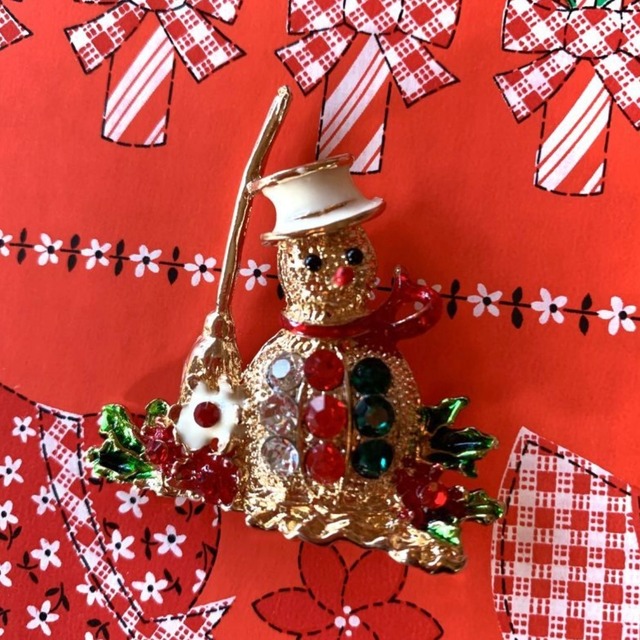 60'S USA Christmas motif rhinestone brooch。 60年代 クリスマスモチーフのラインストーンブローチです。 ホワイトハットのスノーマン。 ゴールド調のメタルにクリア、レッド、グリーンのラインストーンがとっても可愛いデザインです。 横のホウキや両サイドのクリスマスフラワーも可愛いですね。 木の枝のようなお鼻も可愛いポイントです。 ニットやカーディガン、アウターやバッグ、スカーフなど留めるだけでキラキラと華やかで可愛い雰囲気があります。 クリスマスシーズンがますます楽しくなりそうですね。 気になるようなダメージは無くGood Conditionです。 縦 約5cm 1番長い横の長さ 約5cm ■発送・注文に関する情報や注意事項 ご注文後、通常3~5営業日以内に発送いたします。宅配便にてお届けいたしますので、配送先の住所が正確であることをご確認ください。 ■ その他の情報や注意事項 在庫には限りがありますので、売り切れの場合はご了承ください。また、お使いのディスプレイによって色合いに若干の違いが見られることがあります。