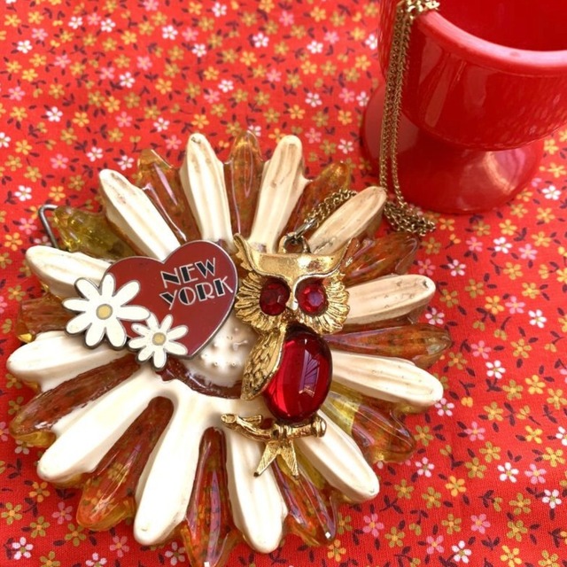 70'S USA Vintage rd rhinestone owl necklace。 70年代 ヴィンテージ ラインストーンのフクロウモチーフ ネックレスです。 ゴールドとキラキラクリアなレッドのラインストーンのデザインがとっても可愛いアイテムです。 枝にとまったフクロウのフォルムもとっても可愛いです。 留め具の彫りの装飾やしっかりとした作りもヴィンテージならではでとっても素敵な雰囲気があります。 つけるだけで存在感があり、シンプルなスタイリングからヴィンテージスタイルまで、いろいろなコーデでお楽しみ頂けるかと思います。 気になるようなダメージは無くGood Conditionです。 フクロウの縦 約5cm チェーンの長さ 約22cm(留め具をした状態で採寸) ■発送・注文に関する情報や注意事項 ご注文後、通常3~5営業日以内に発送いたします。宅配便にてお届けいたしますので、配送先の住所が正確であることをご確認ください。 ■ その他の情報や注意事項 在庫には限りがありますので、売り切れの場合はご了承ください。また、お使いのディスプレイによって色合いに若干の違いが見られることがあります。
