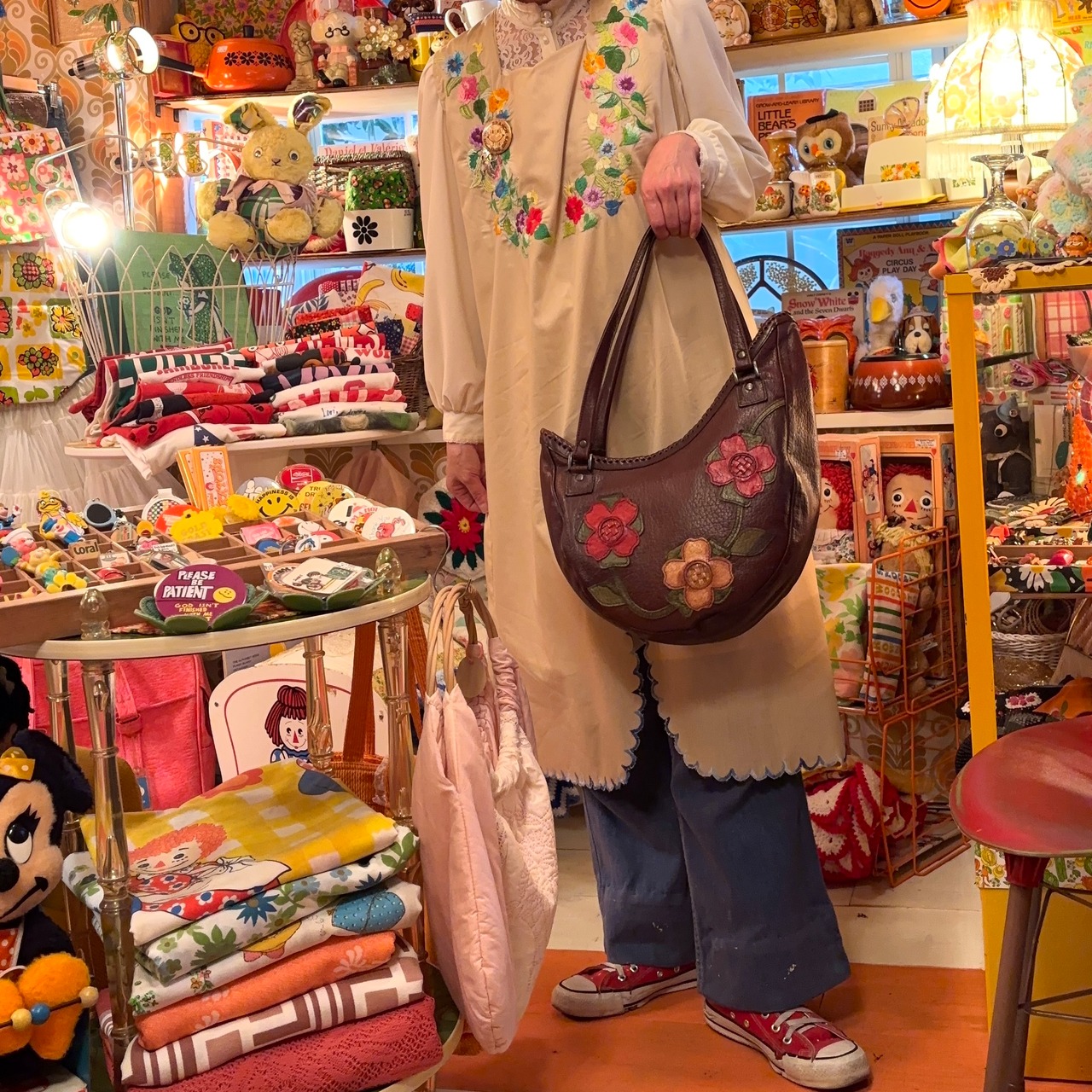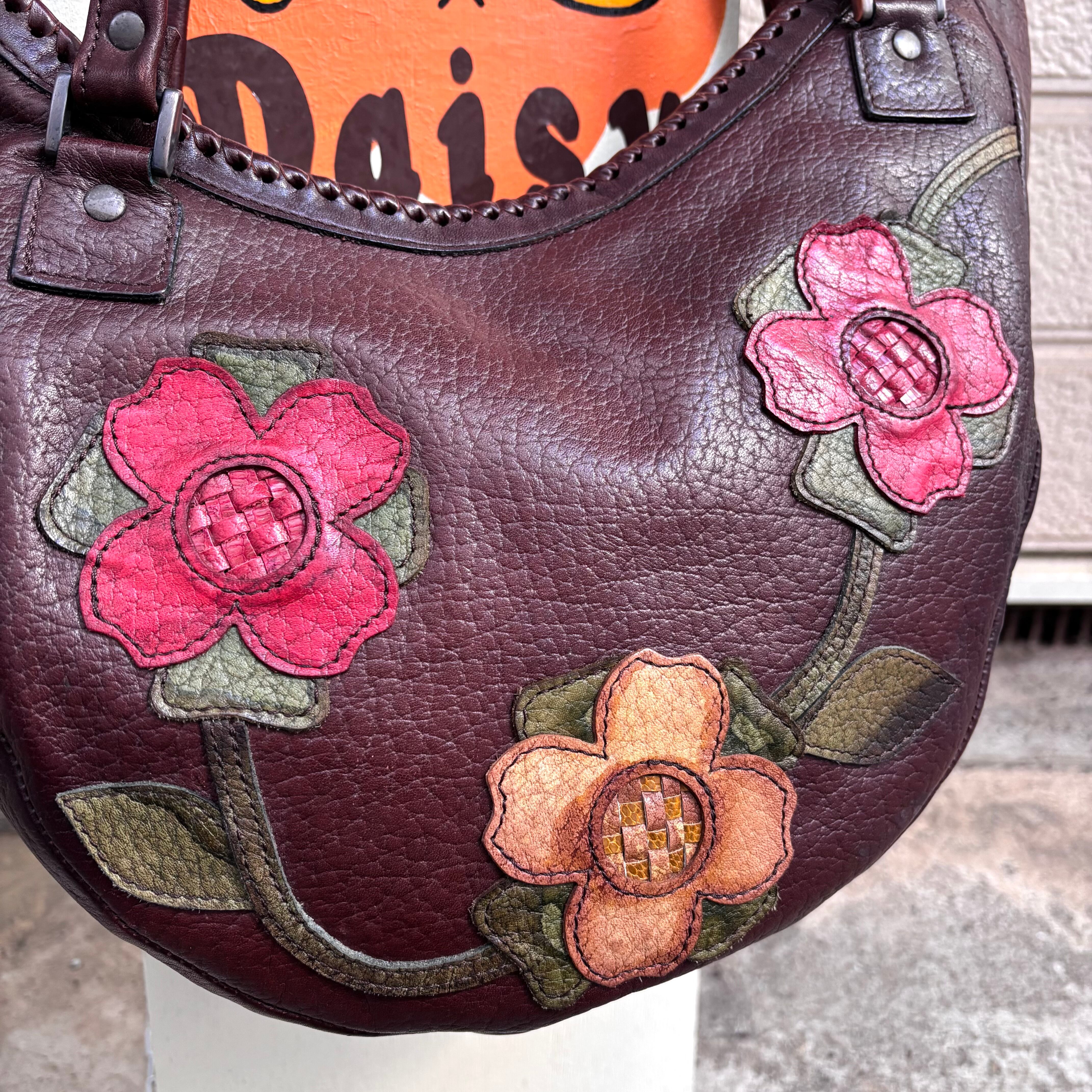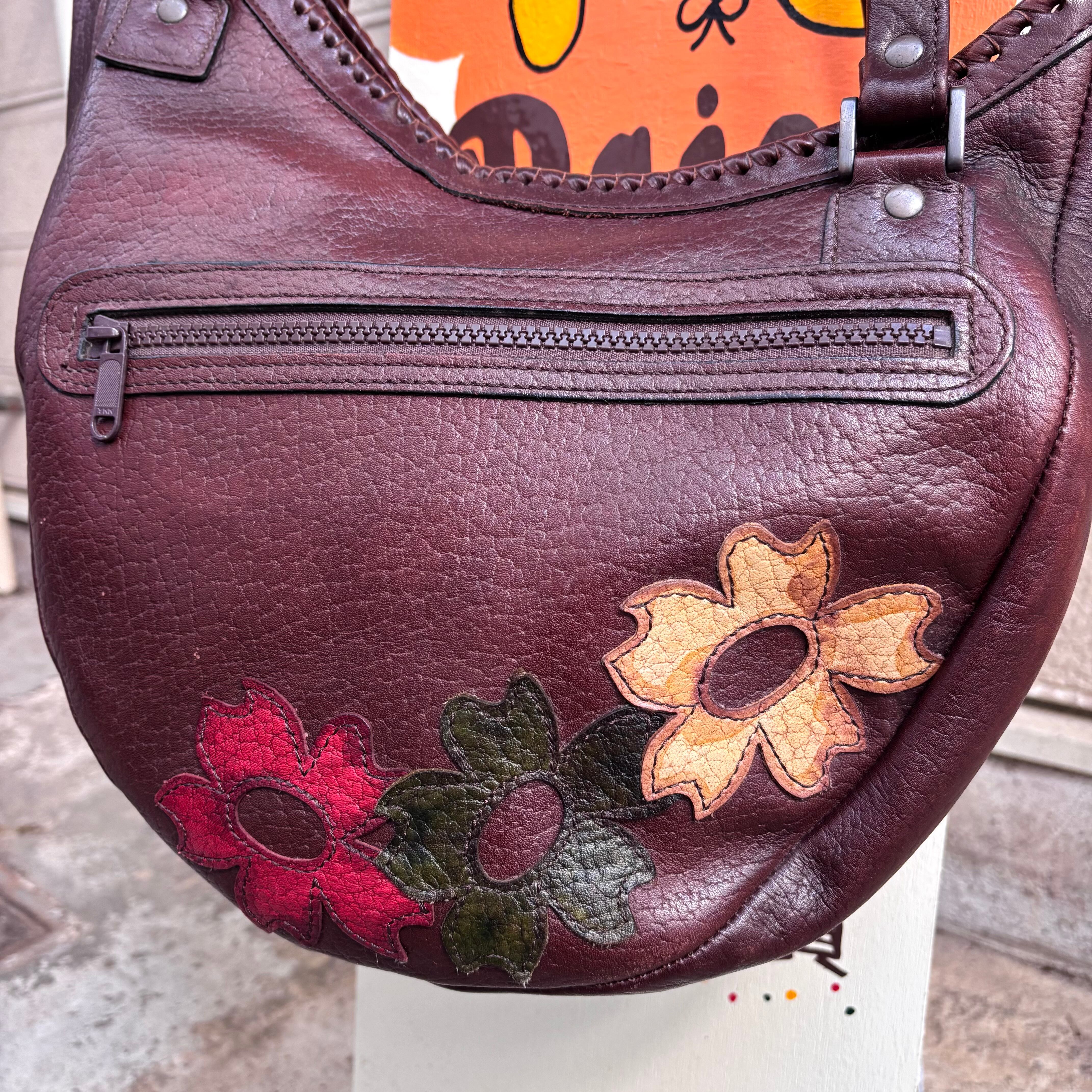 Vintage flower patch leather shoulder bag