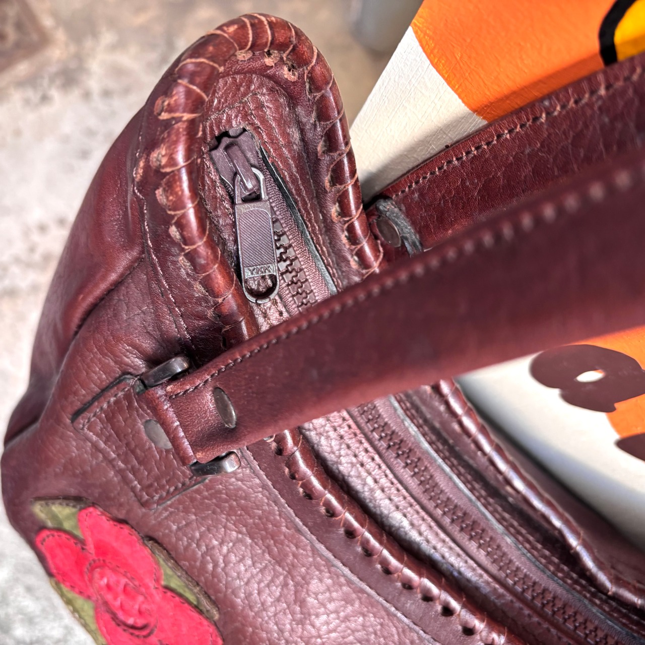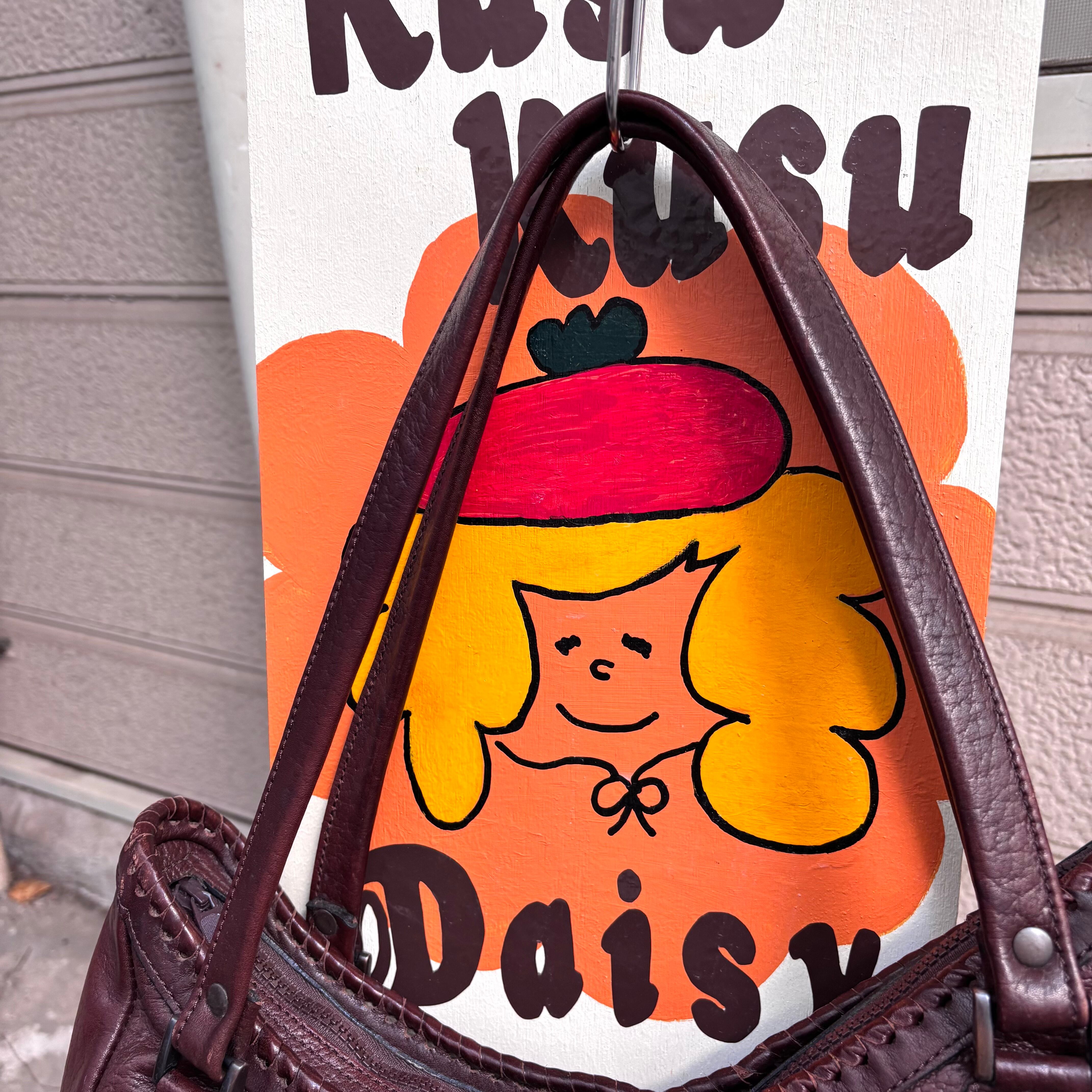 チョコレートブラウンのレザーに両面の異なるデザインのレッド、マスタードイエローのレザーフラワーパッチがとっても可愛いアイテムです。