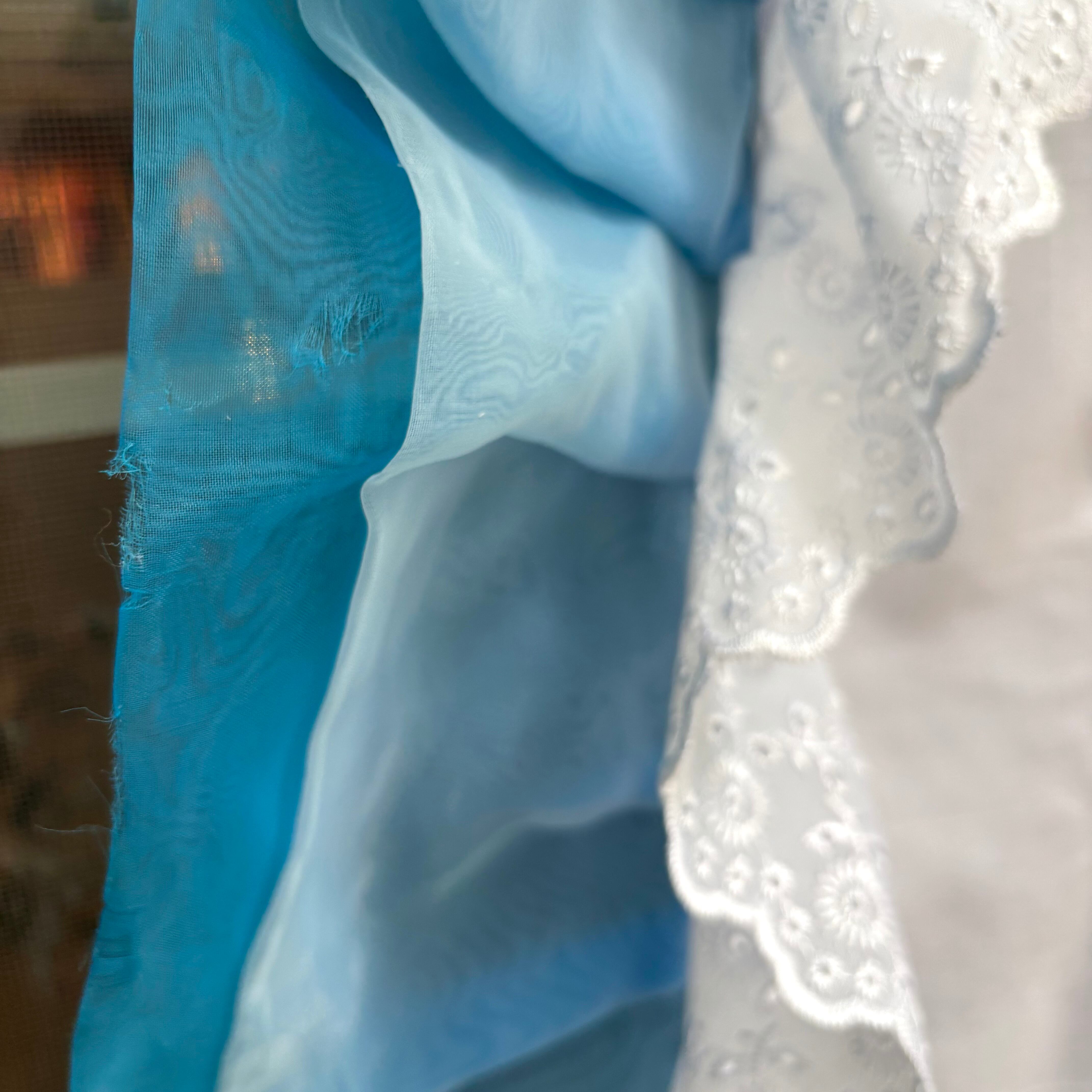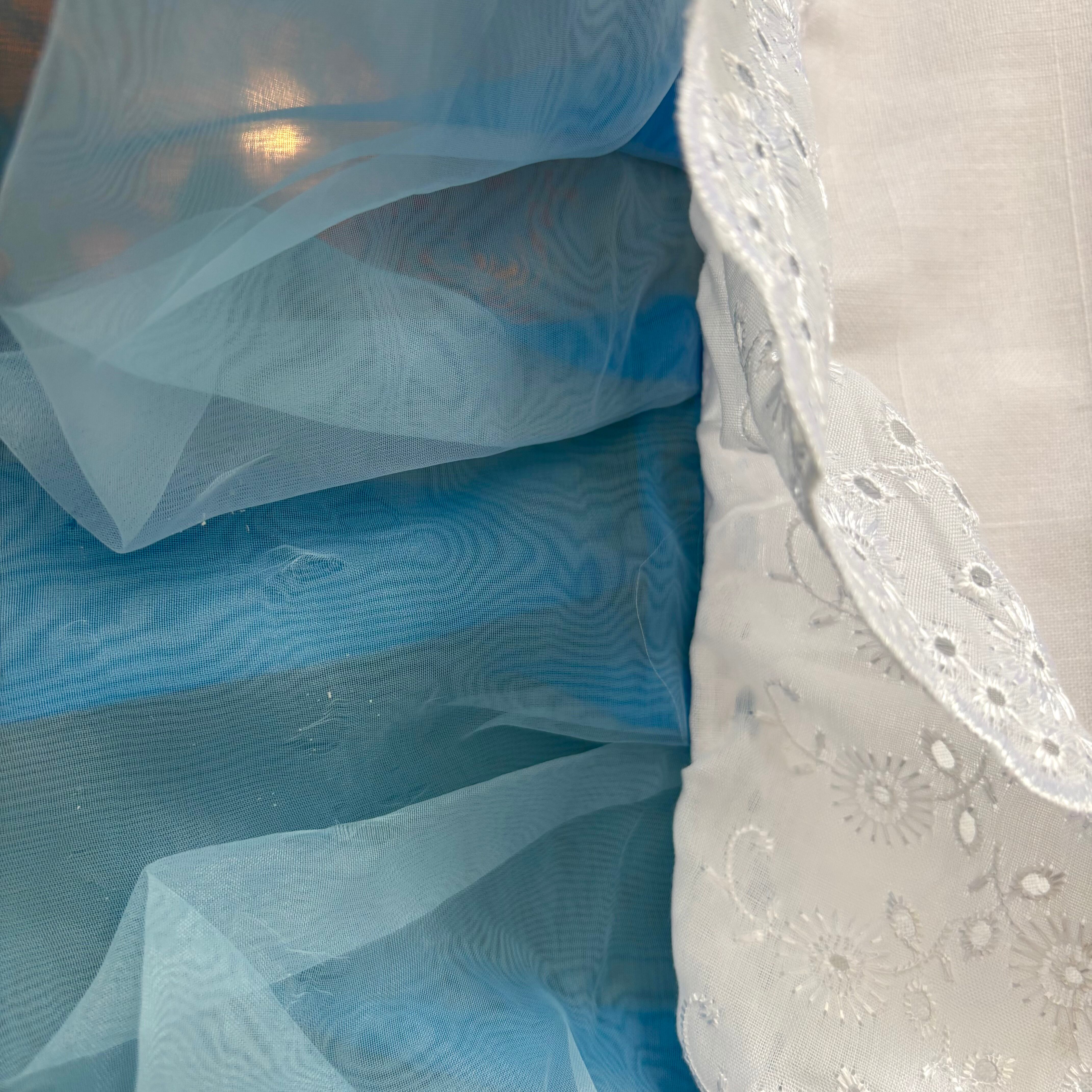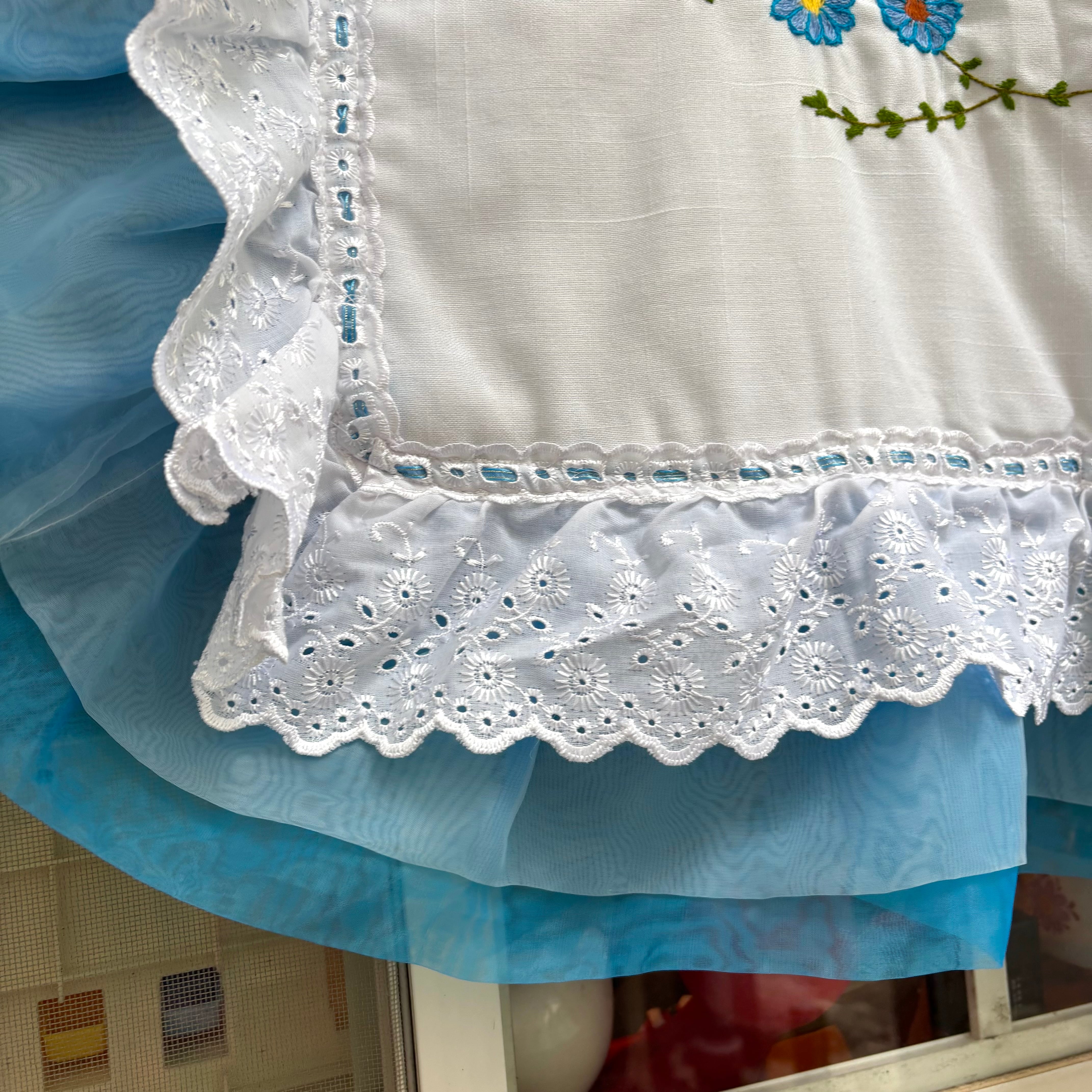ラメ入りのリボンテープが施されたフラワーレースや2トーンのライトブルーのシフォンフリルの縁取りもヴィンテージならではな とっても可愛いデザインです。