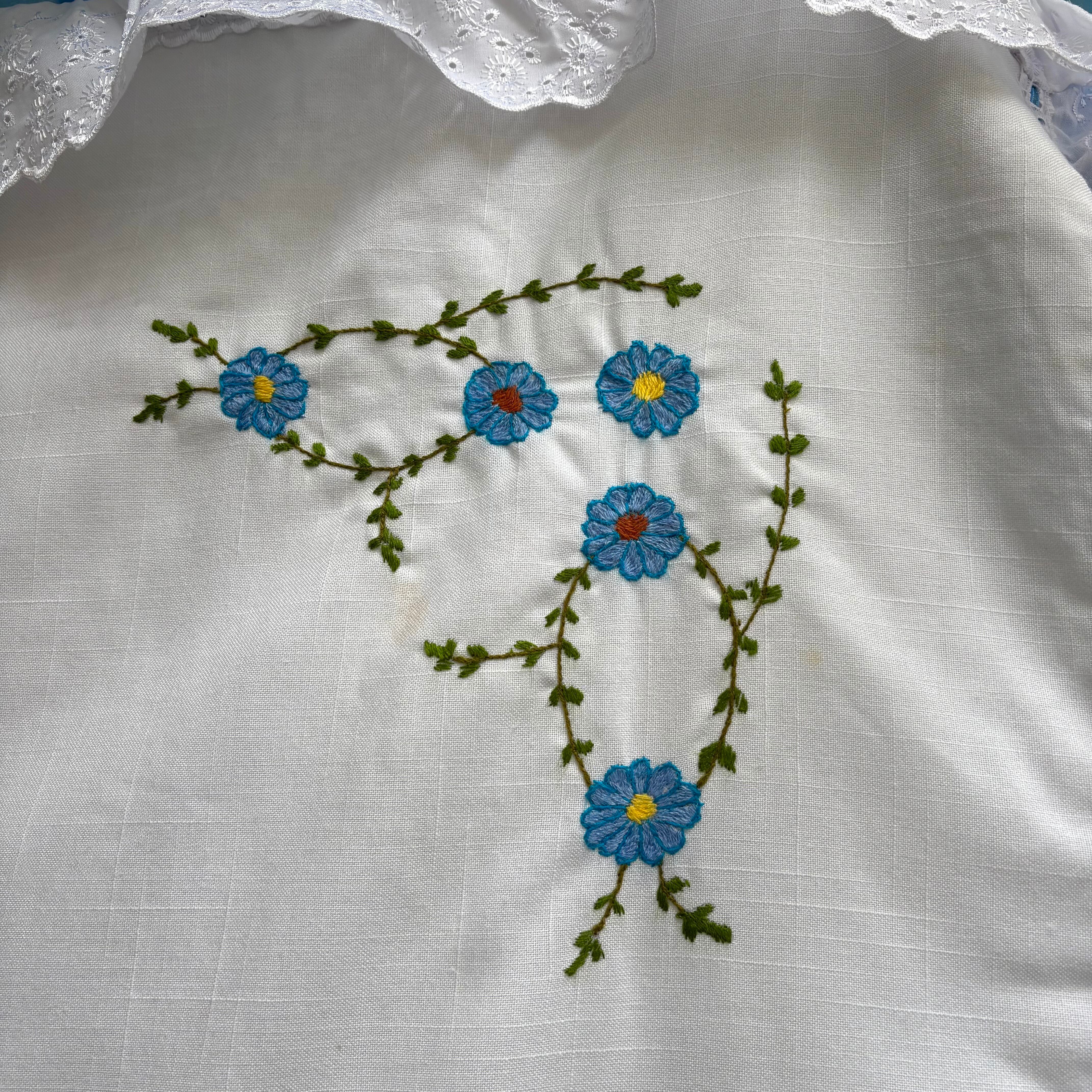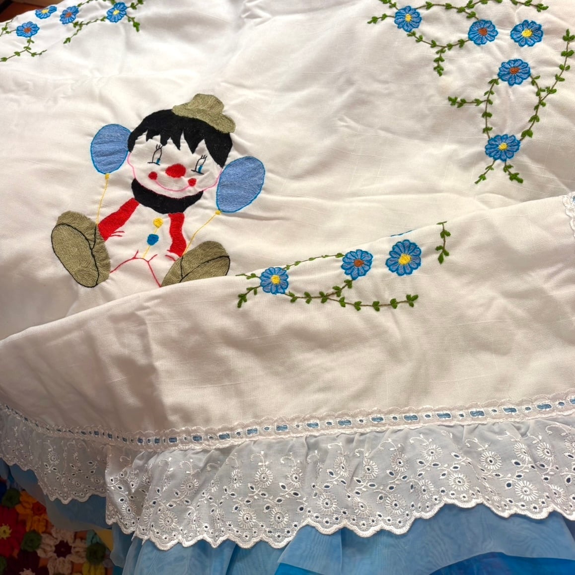 中央のピエロのような男の子やブルーベースのお花など当時のハンドワークによる刺繍がとっても可愛いアイテムです。
