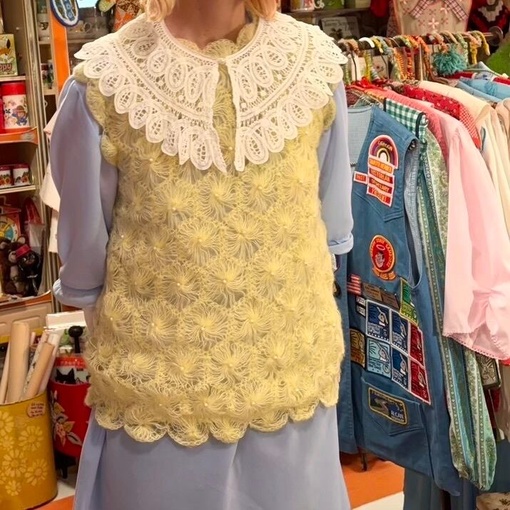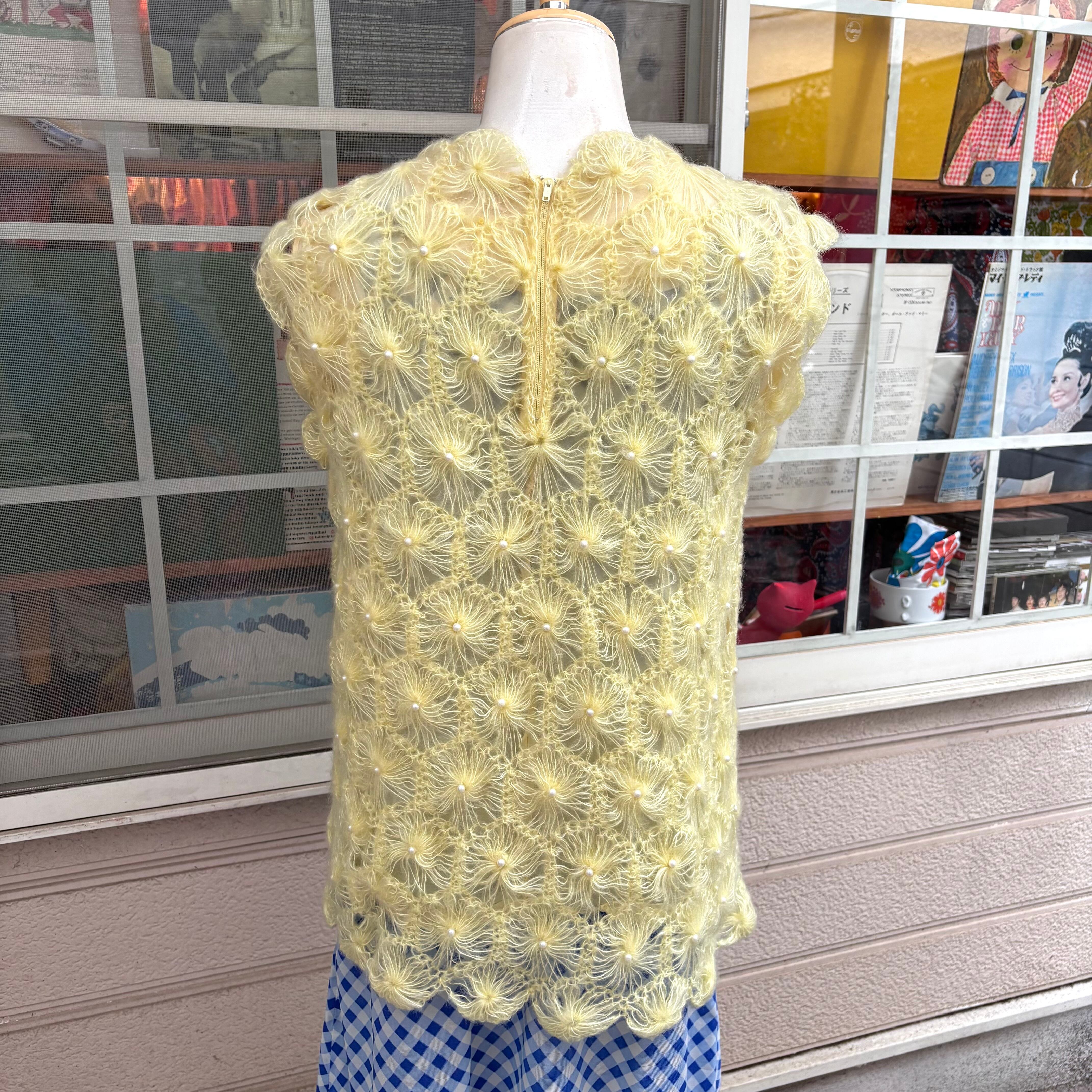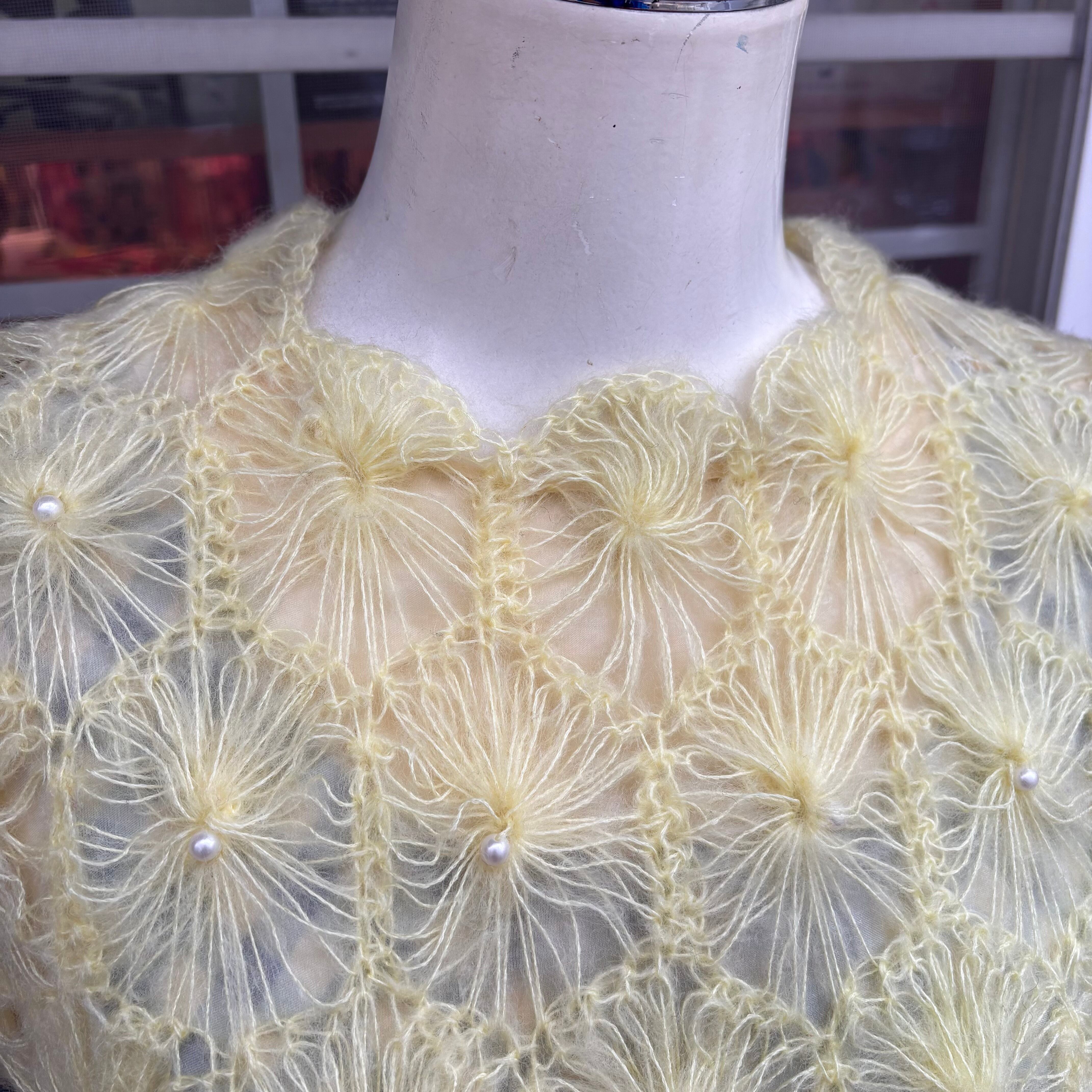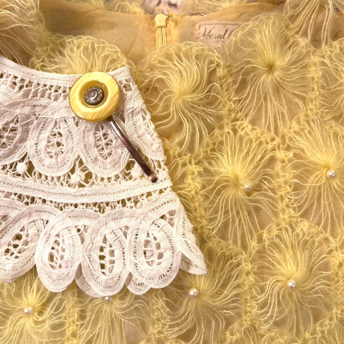 ライトなレモンイエローカラーで、細い糸で編まれたフワフワとした毛足のフラワーモチーフがとっても可愛い1着です。