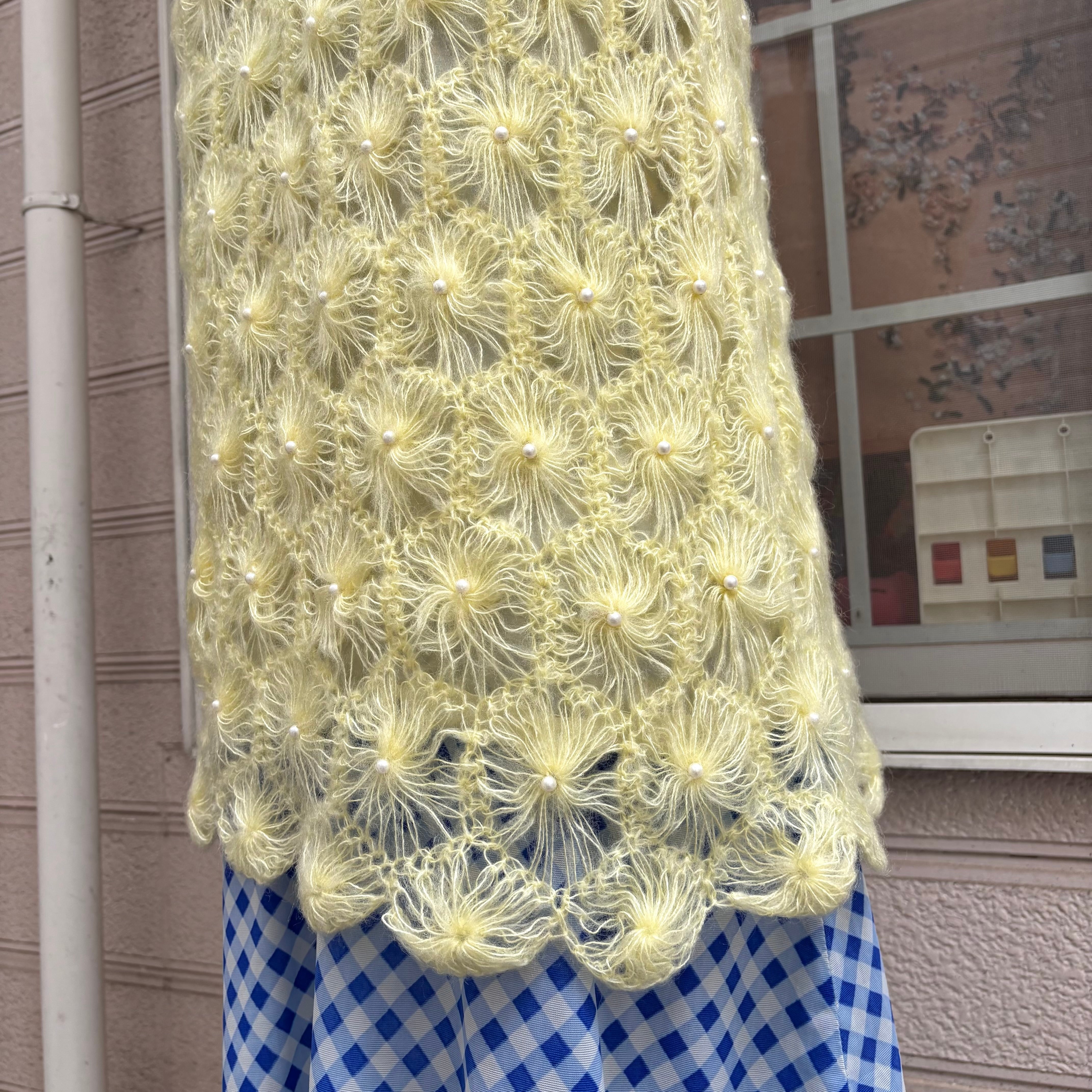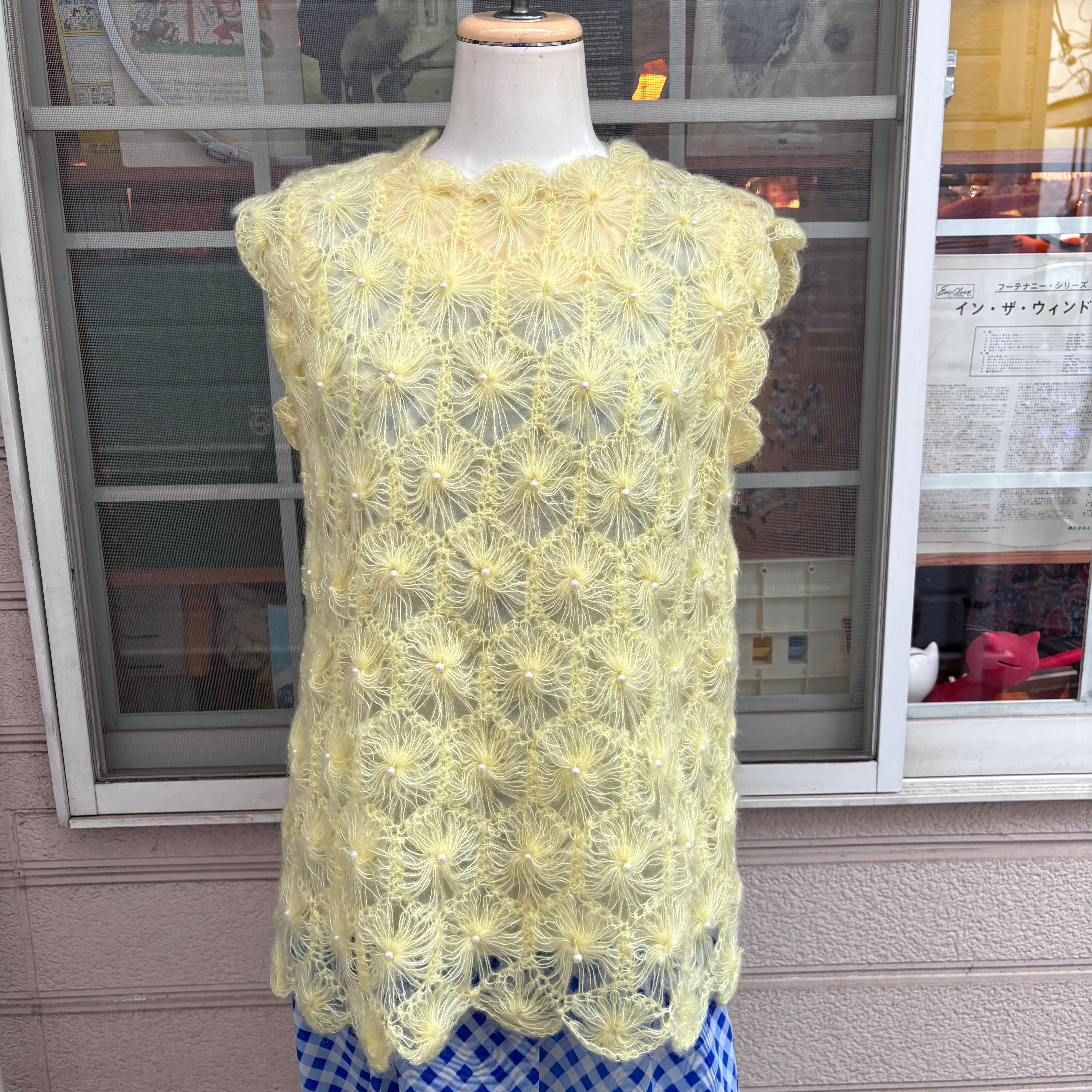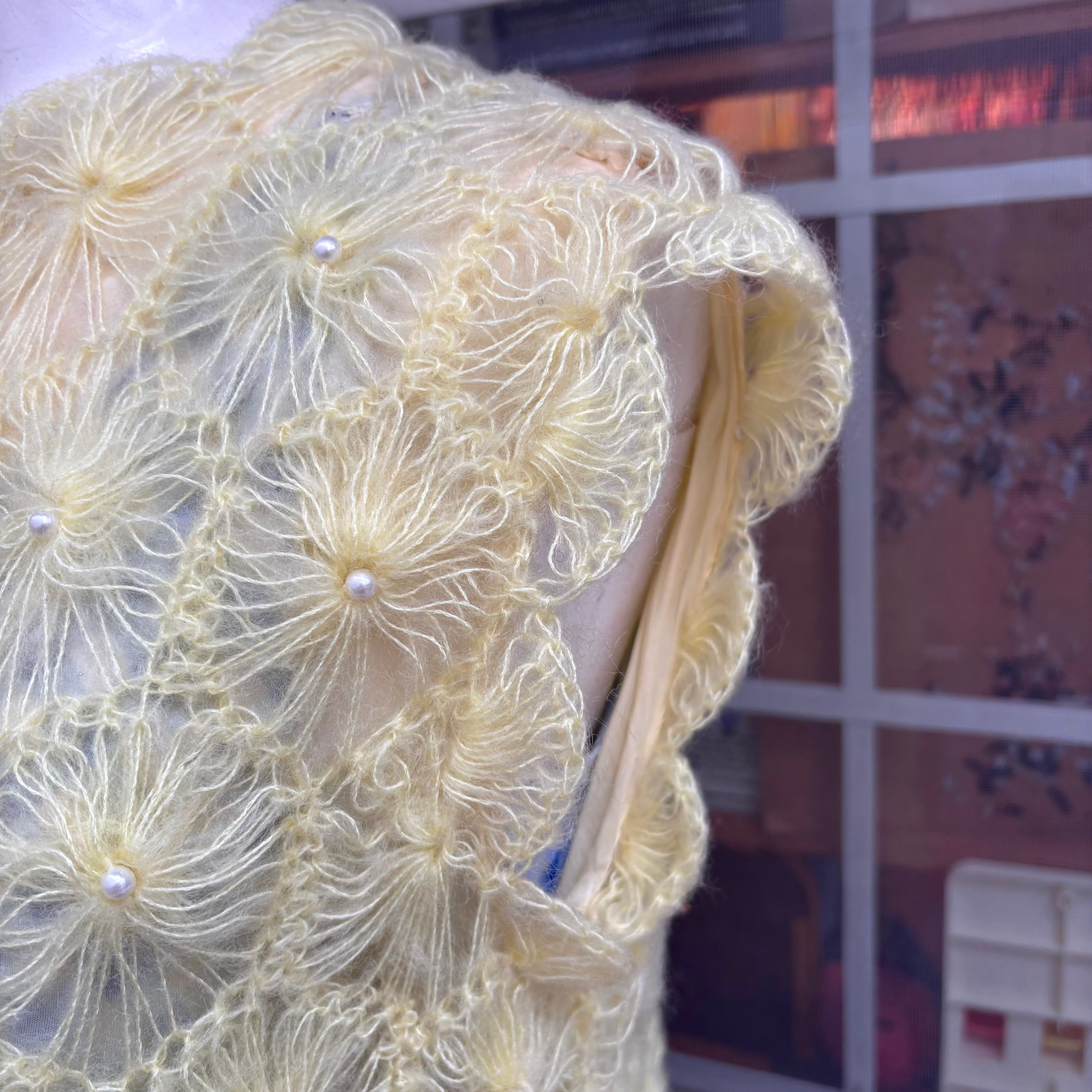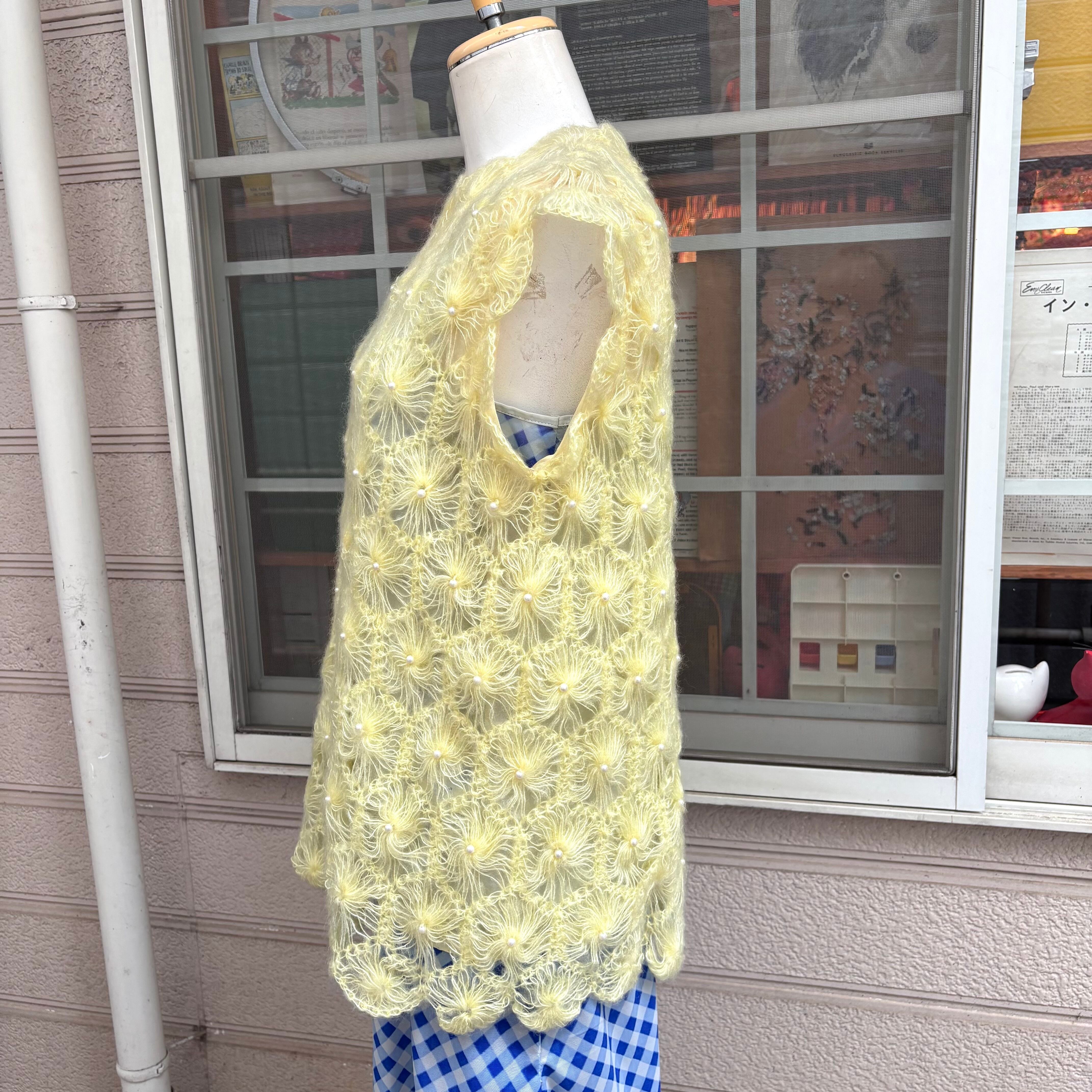 ライトなレモンイエローカラーで、細い糸で編まれたフワフワとした毛足のフラワーモチーフがとっても可愛い1着です。