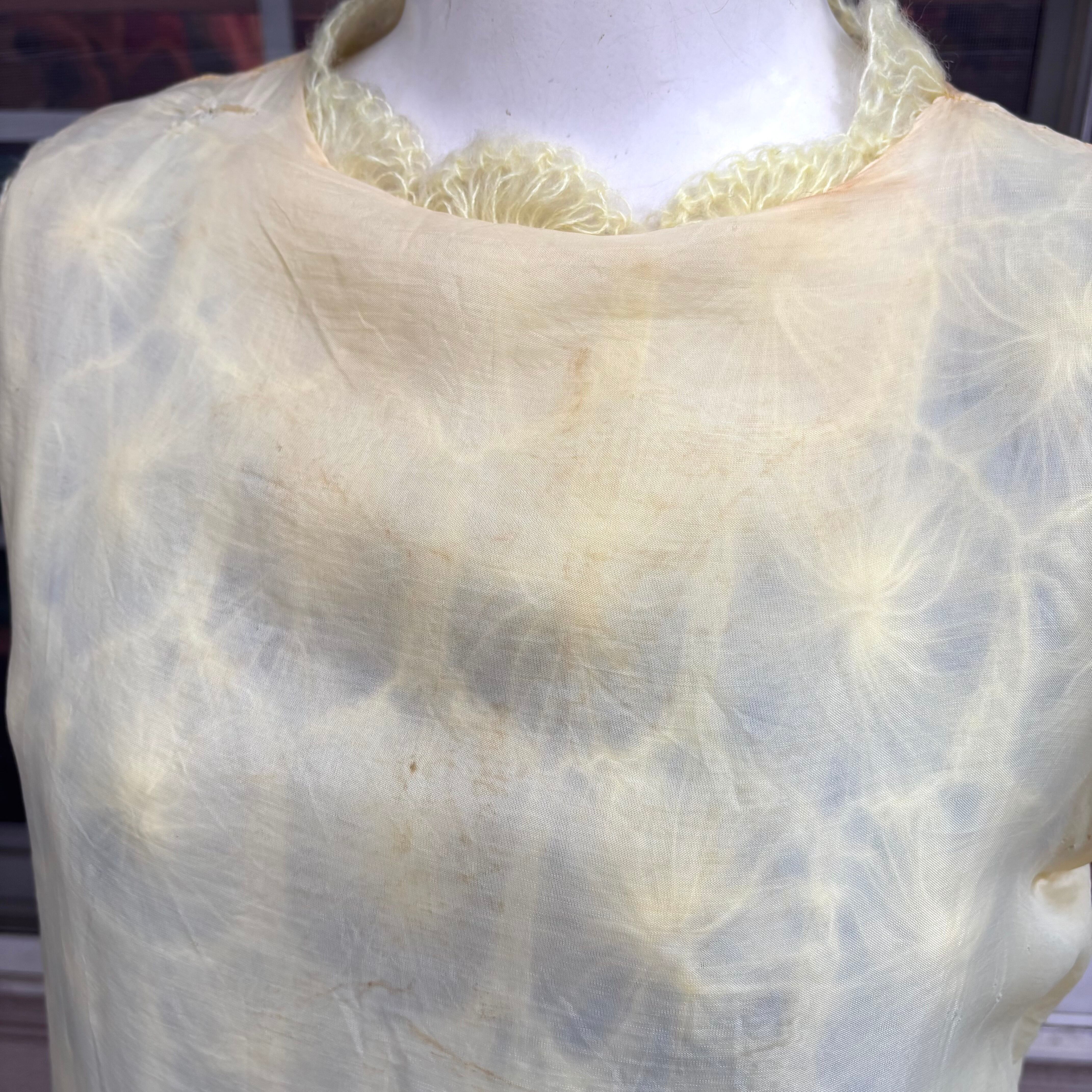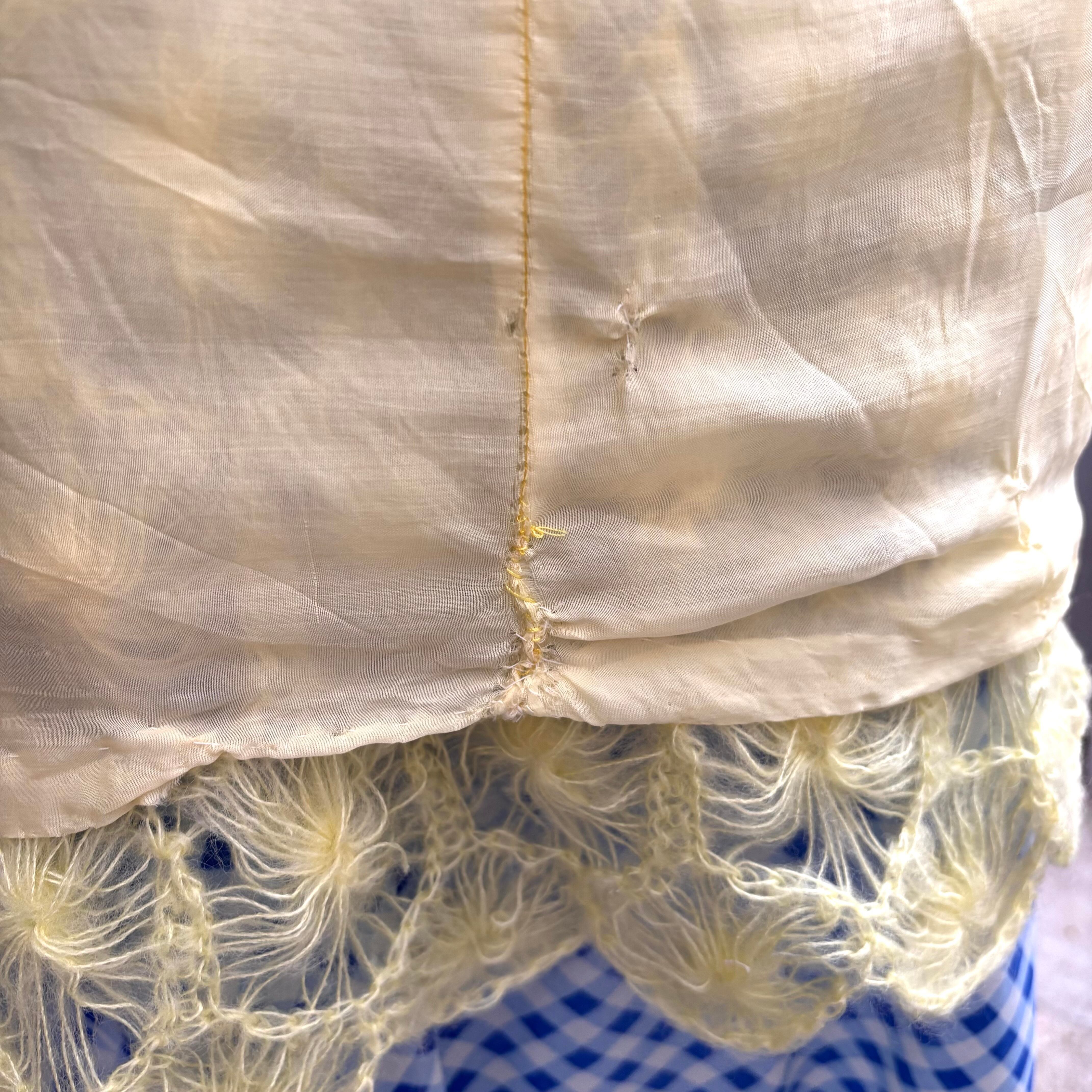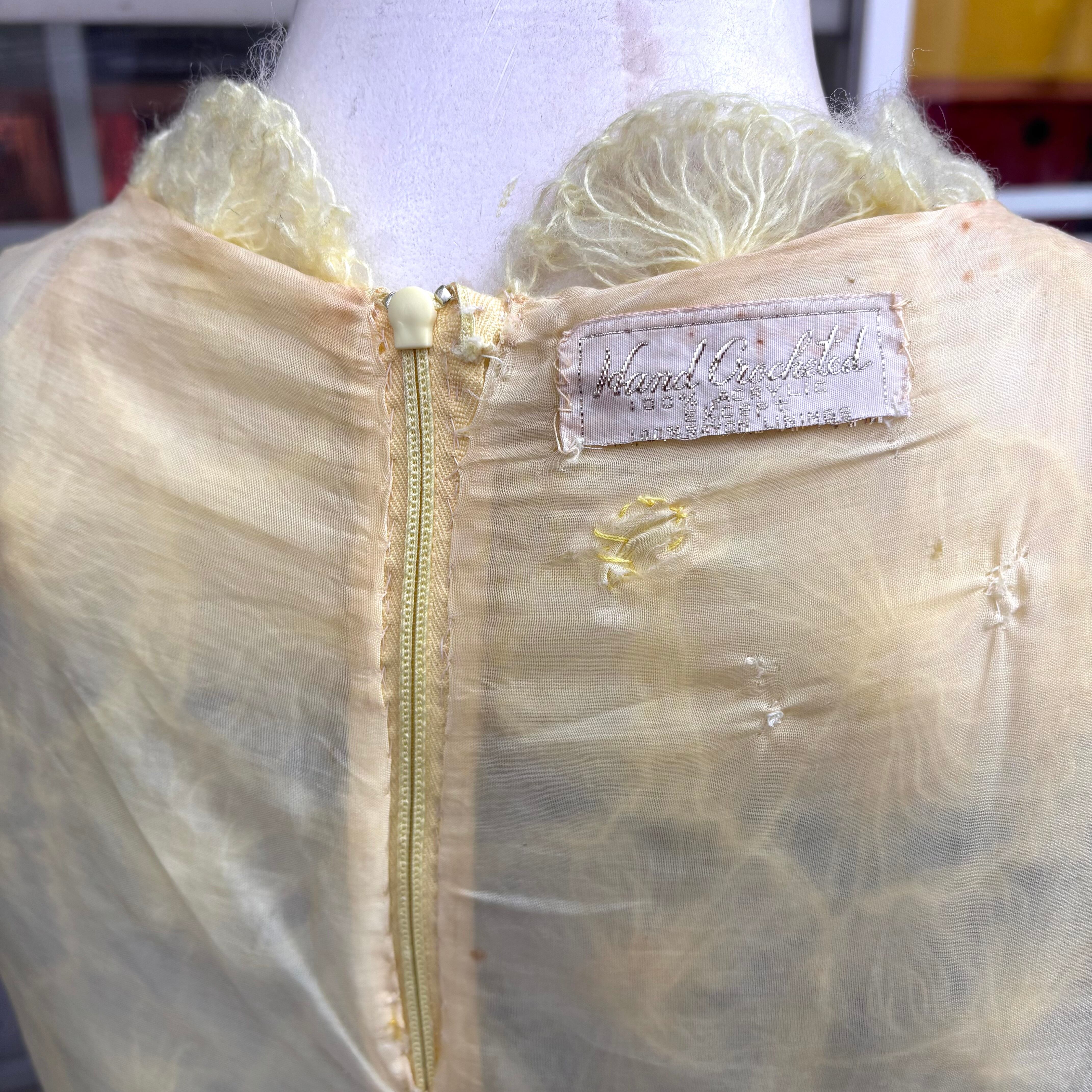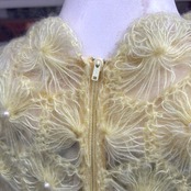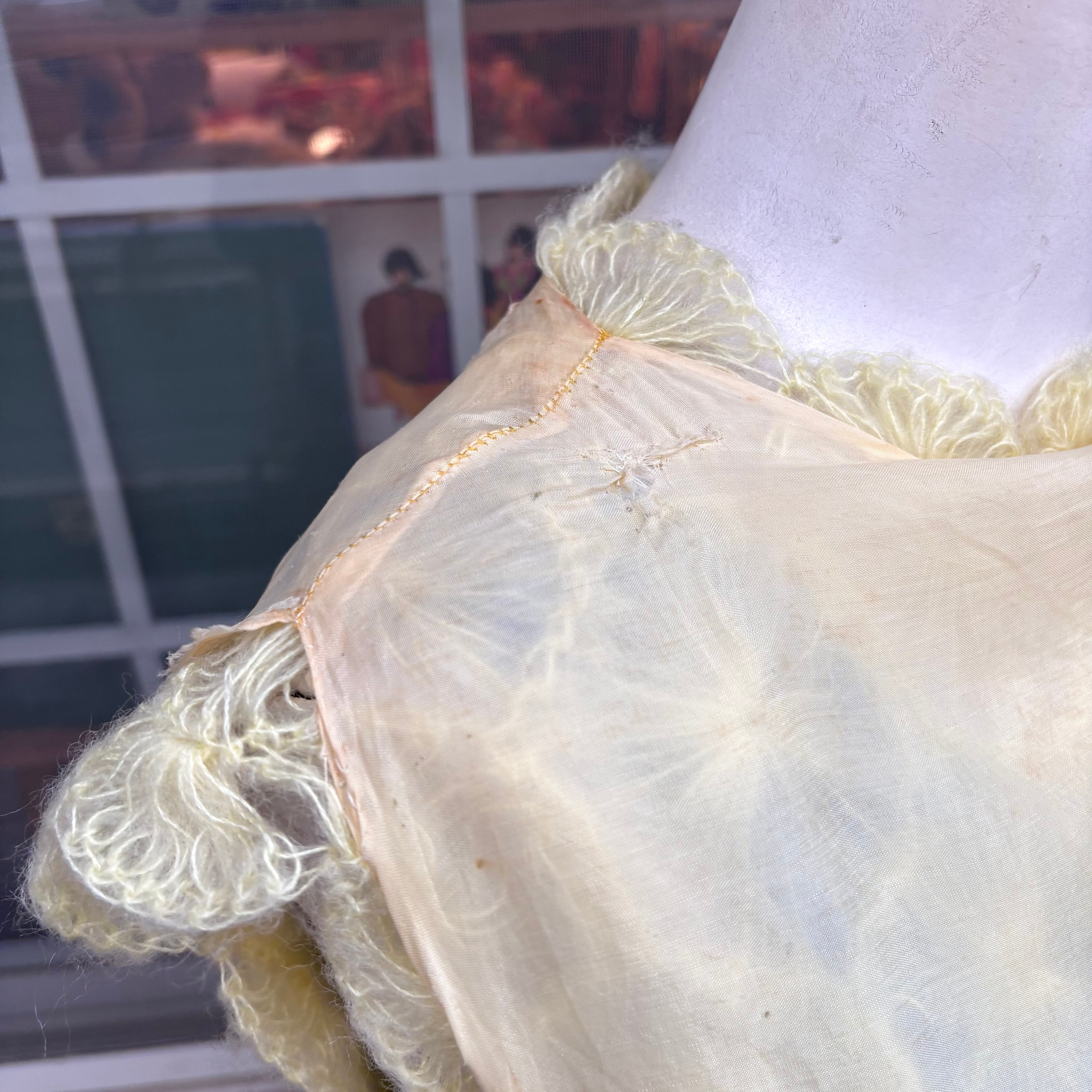 ライトなレモンイエローカラーで、細い糸で編まれたフワフワとした毛足のフラワーモチーフがとっても可愛い1着です。