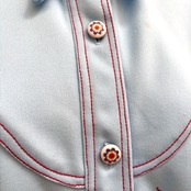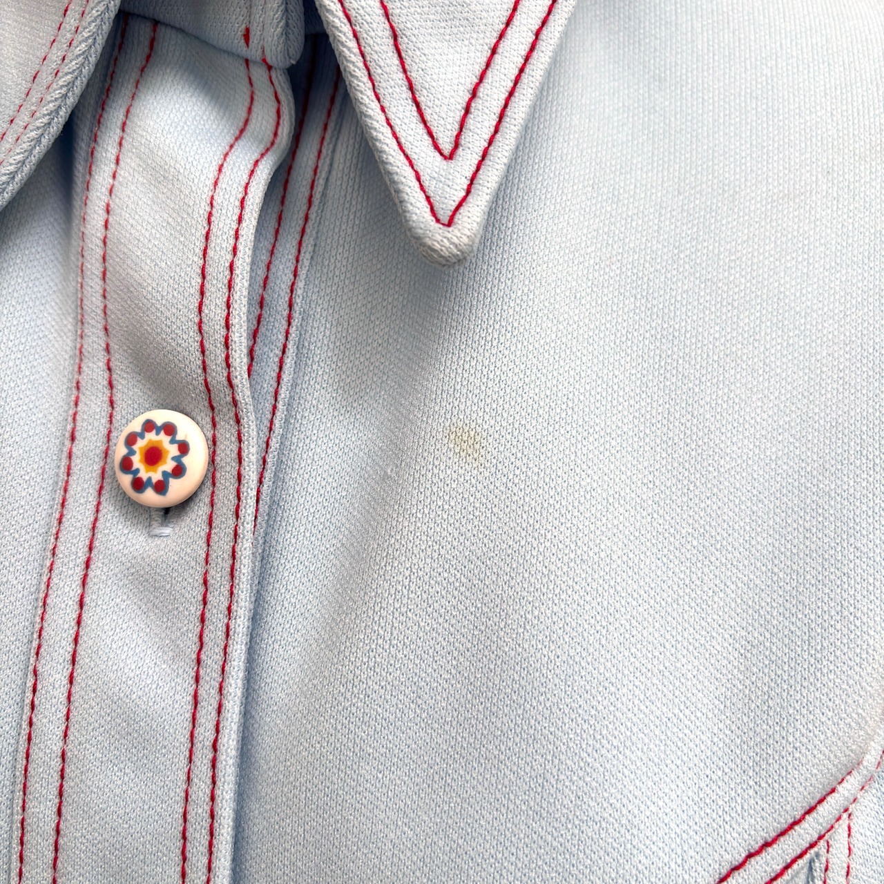 ライトブルーのポリ生地にレッドのステッチライン、ネイティブ柄のステンシルペイントがとっても可愛い1着です。