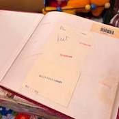 当時のアメリカの図書館に置かれていた本で図書カードを入れる袋やスタンプ、サインがあります。