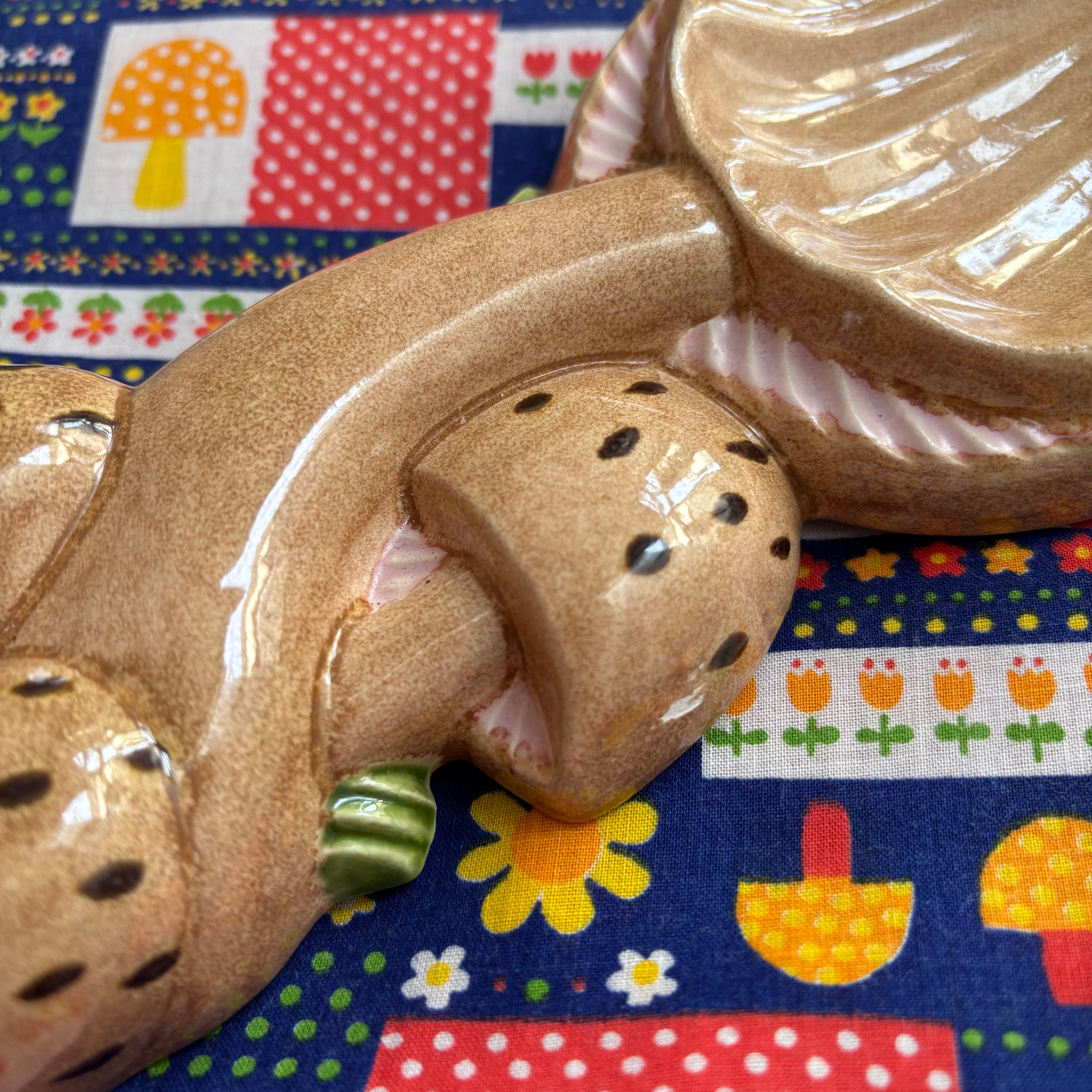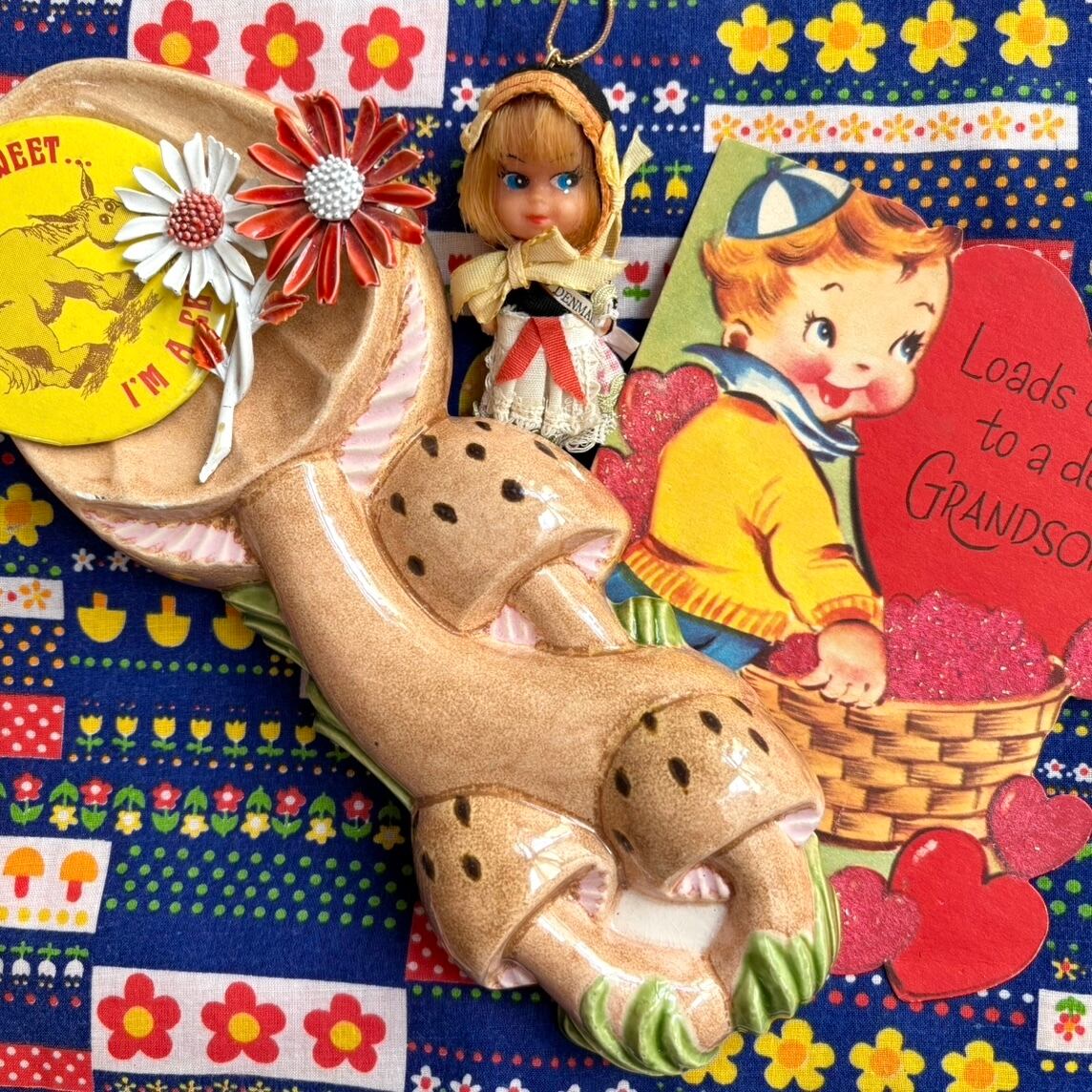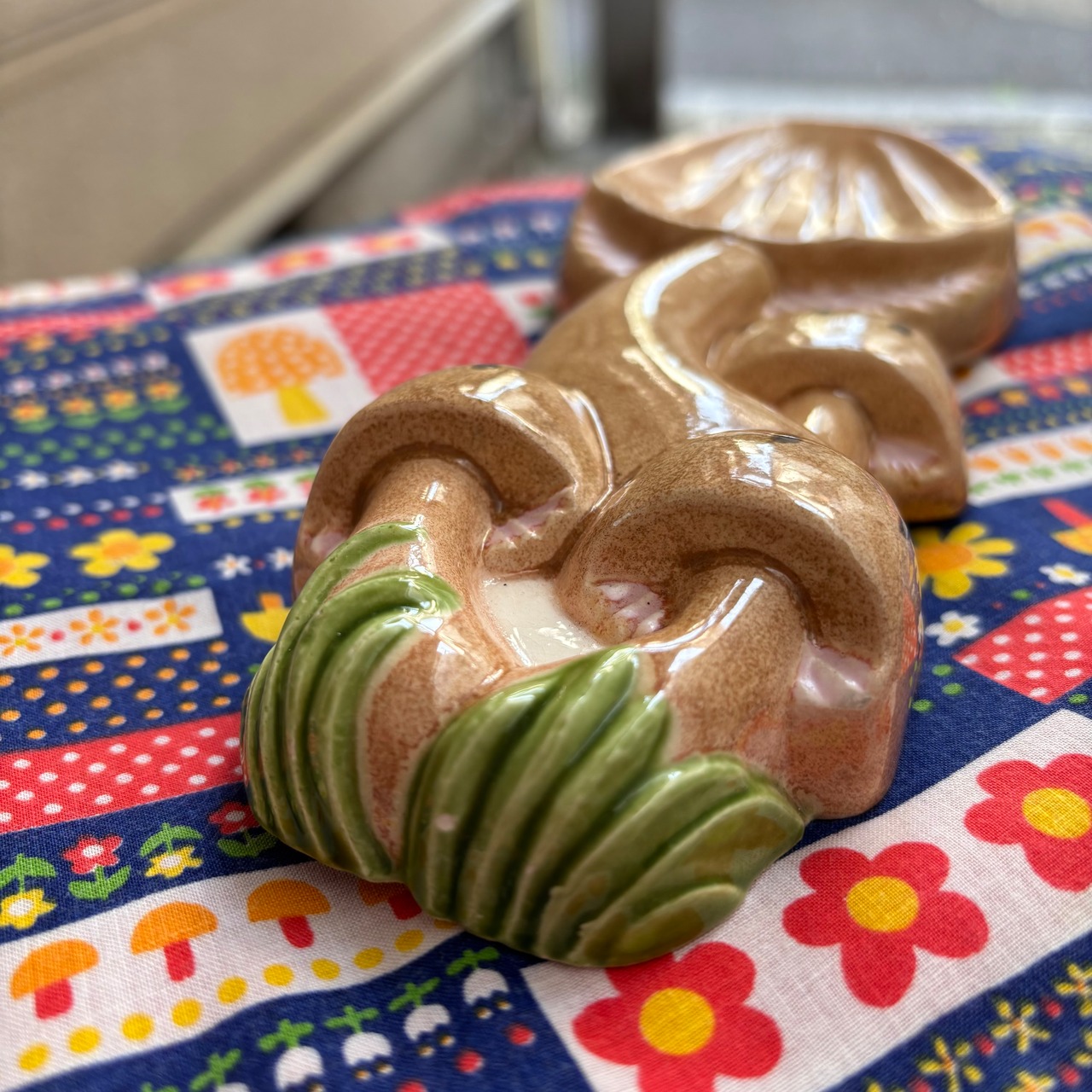 ライトベージュとライトピンクベースのカラーリングの立体感のあるキノコや当時のハンドワークによる作りがとっても可愛いアイテムです。