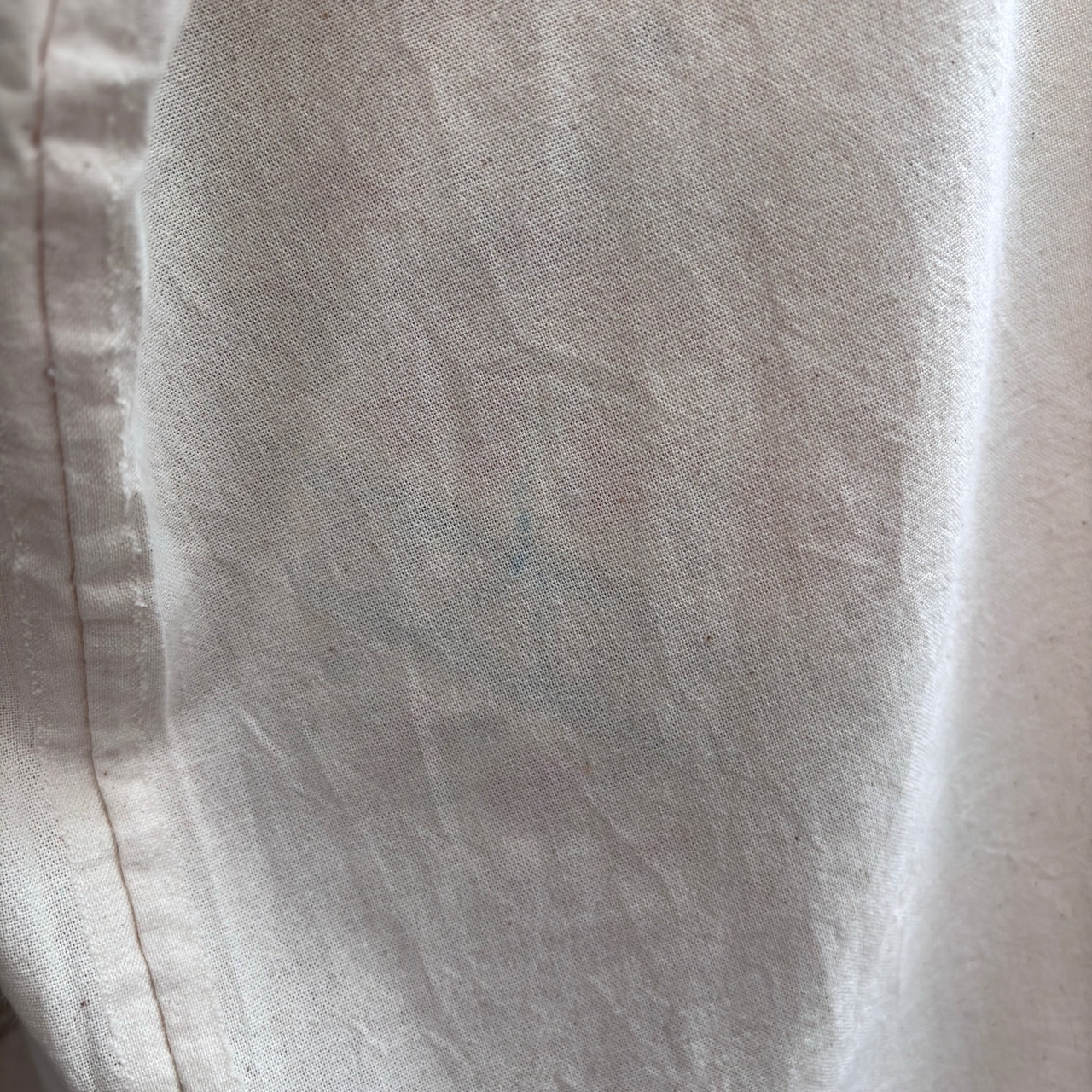 コットン生地特有のシワのクセ、フロント、バック供に中央より下の右側に薄らと青い色移りが僅かにありますが、あまり気にならない程度かと思います。