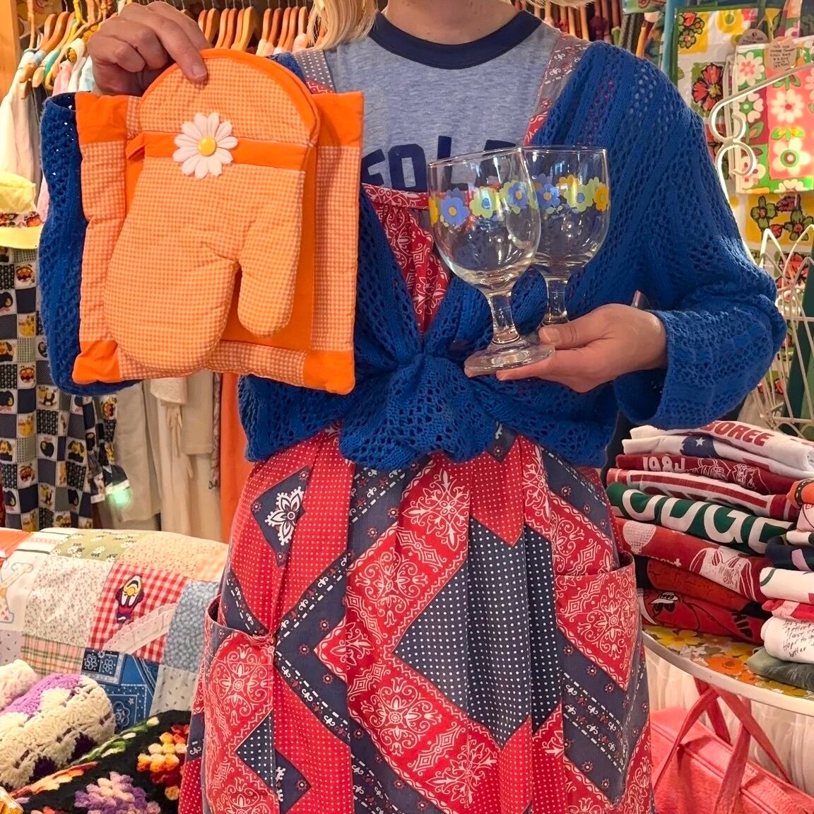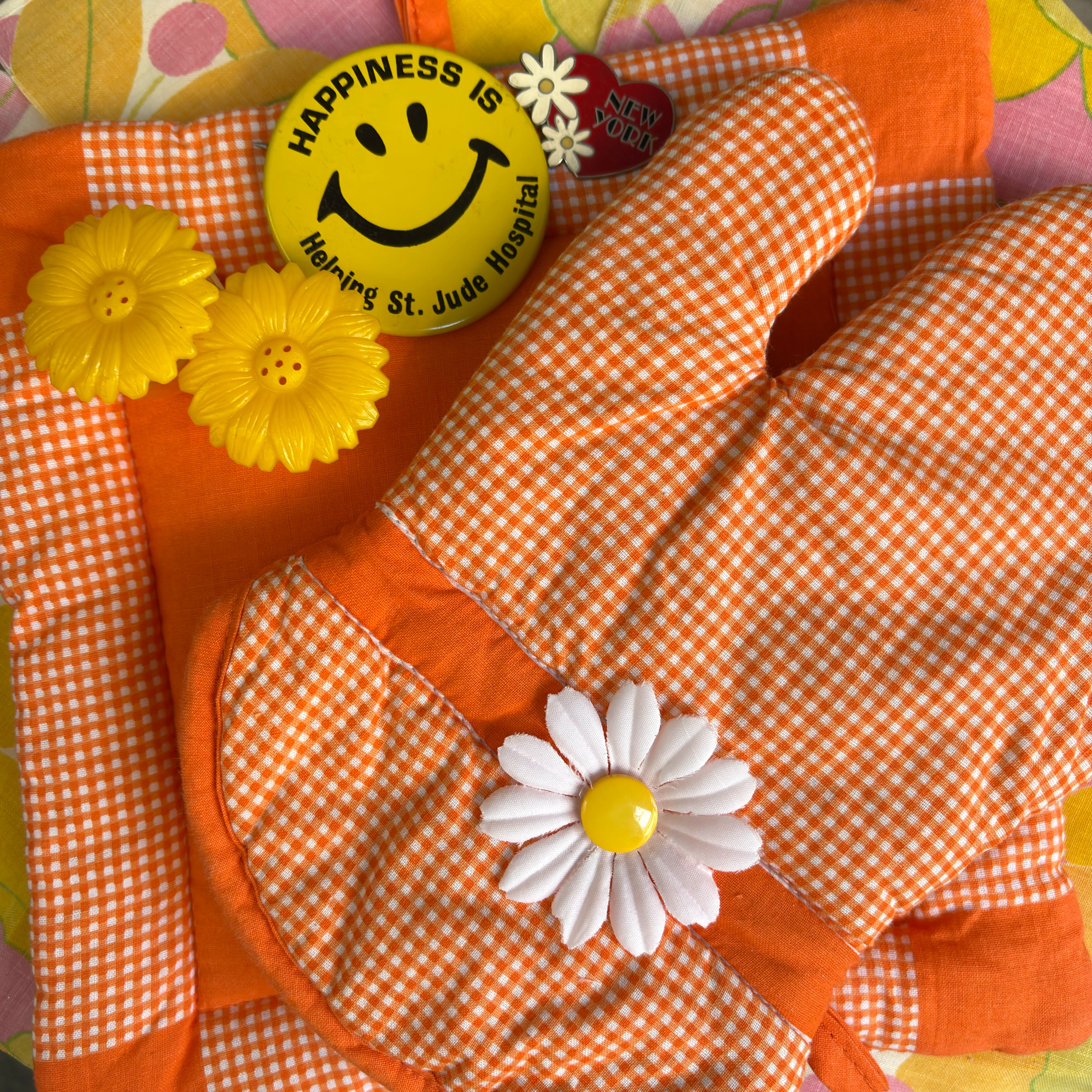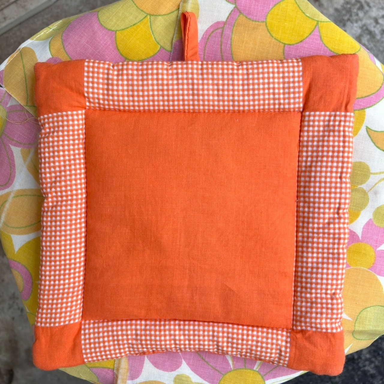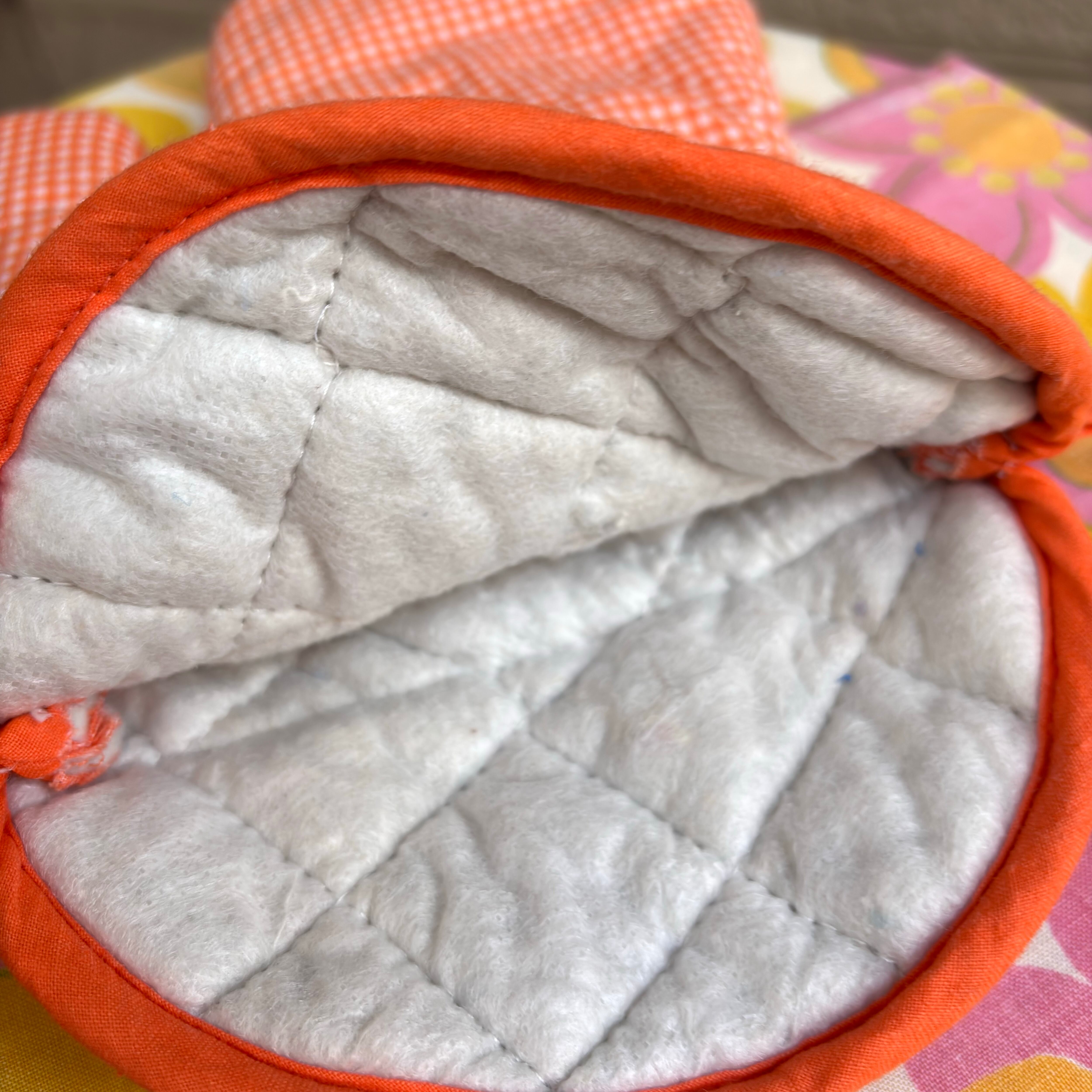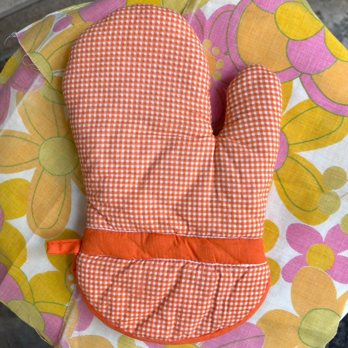 ヴィンテージ 当時のハンドメイド1点もの オレンジギンガムチェック フラワーデコレーション ミトンと鍋敷きのセットです。
