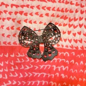 真鍮を燻したような素材でリボンのフォルムや小さなお花モチーフやステンドグラスのようなデザイン、細やかなカットワークがとっても可愛いアイテムです。