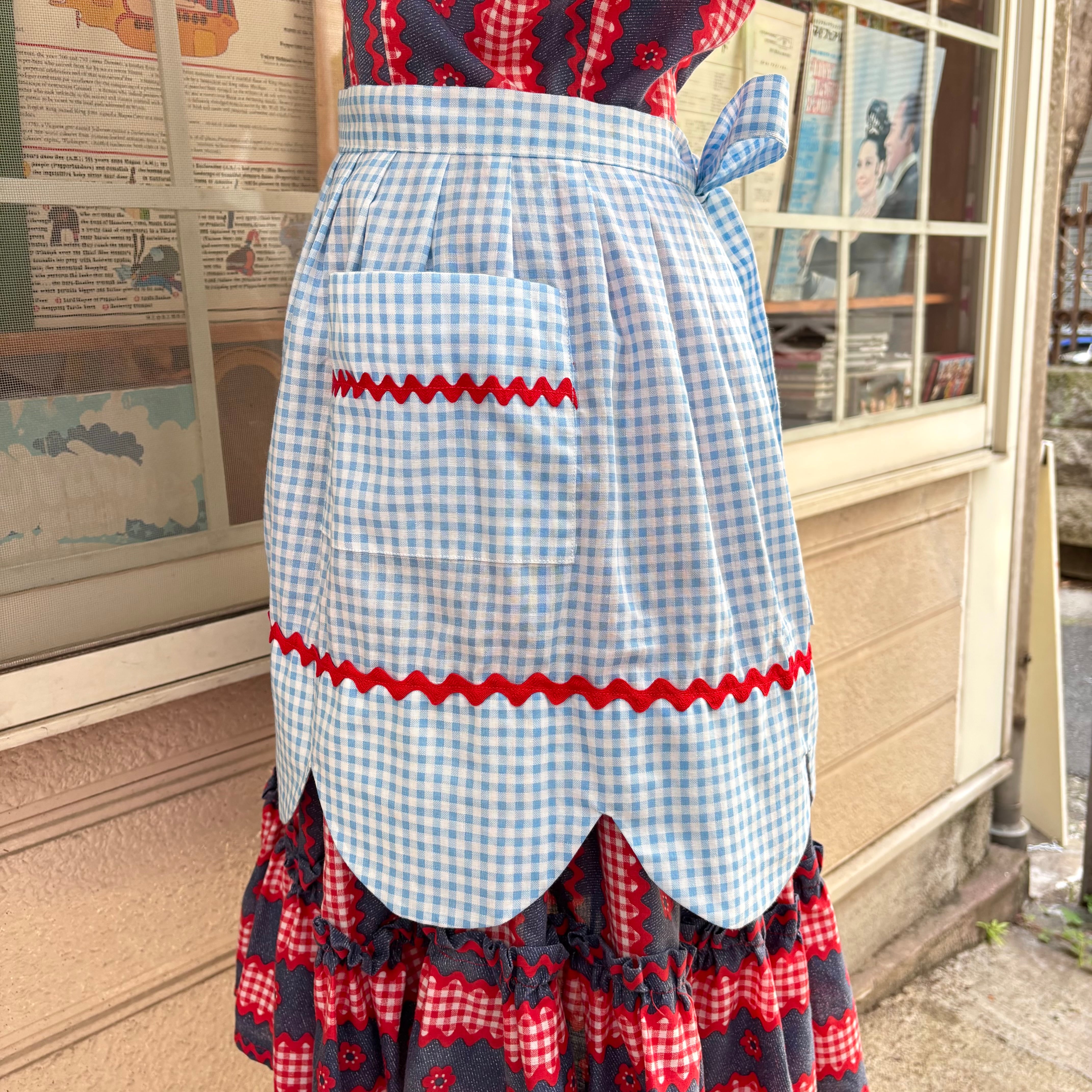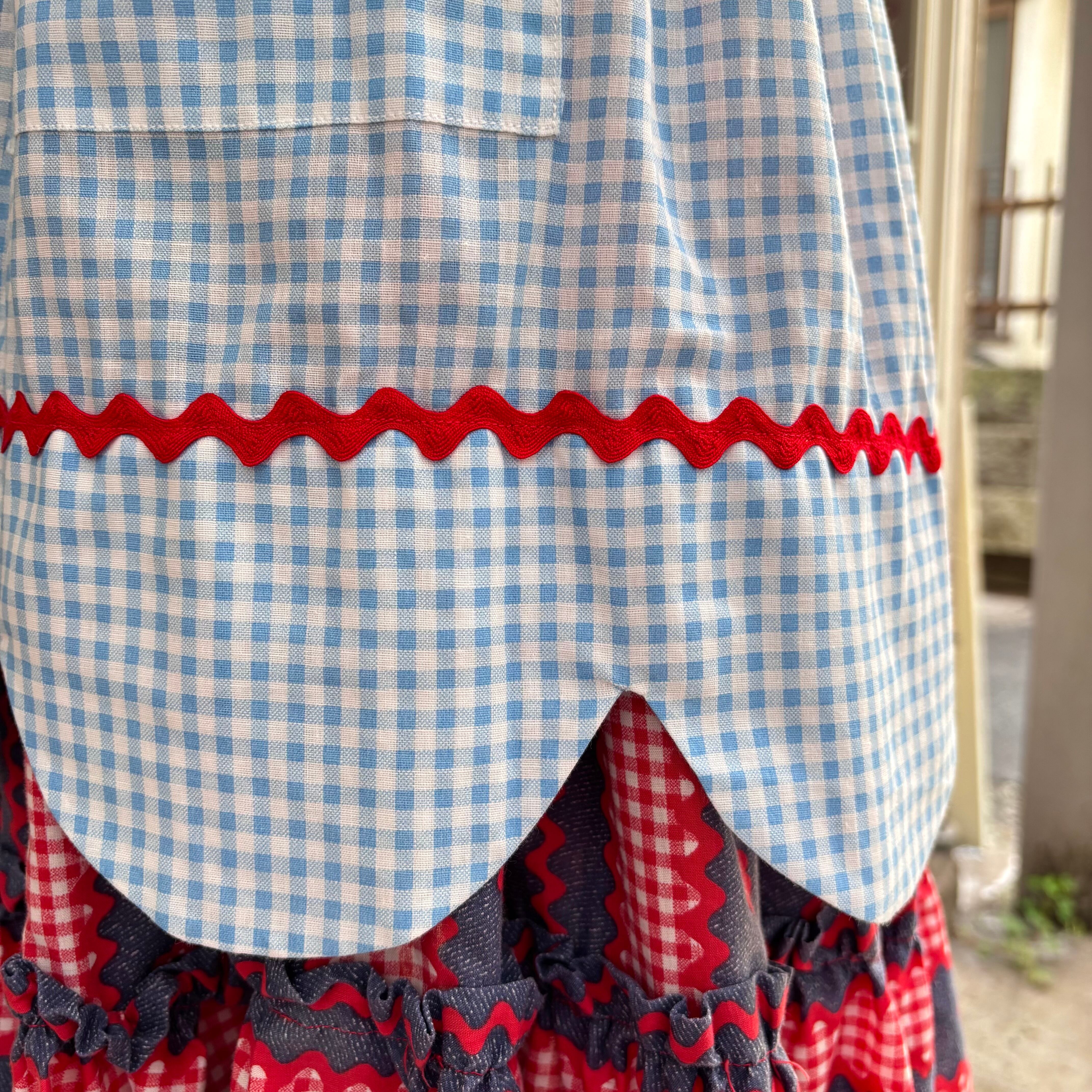 ライトブルーのギンガムチェックに両サイドのポケットや裾上のレッドのなみなみテープのデザインがとっても可愛いアイテムです。