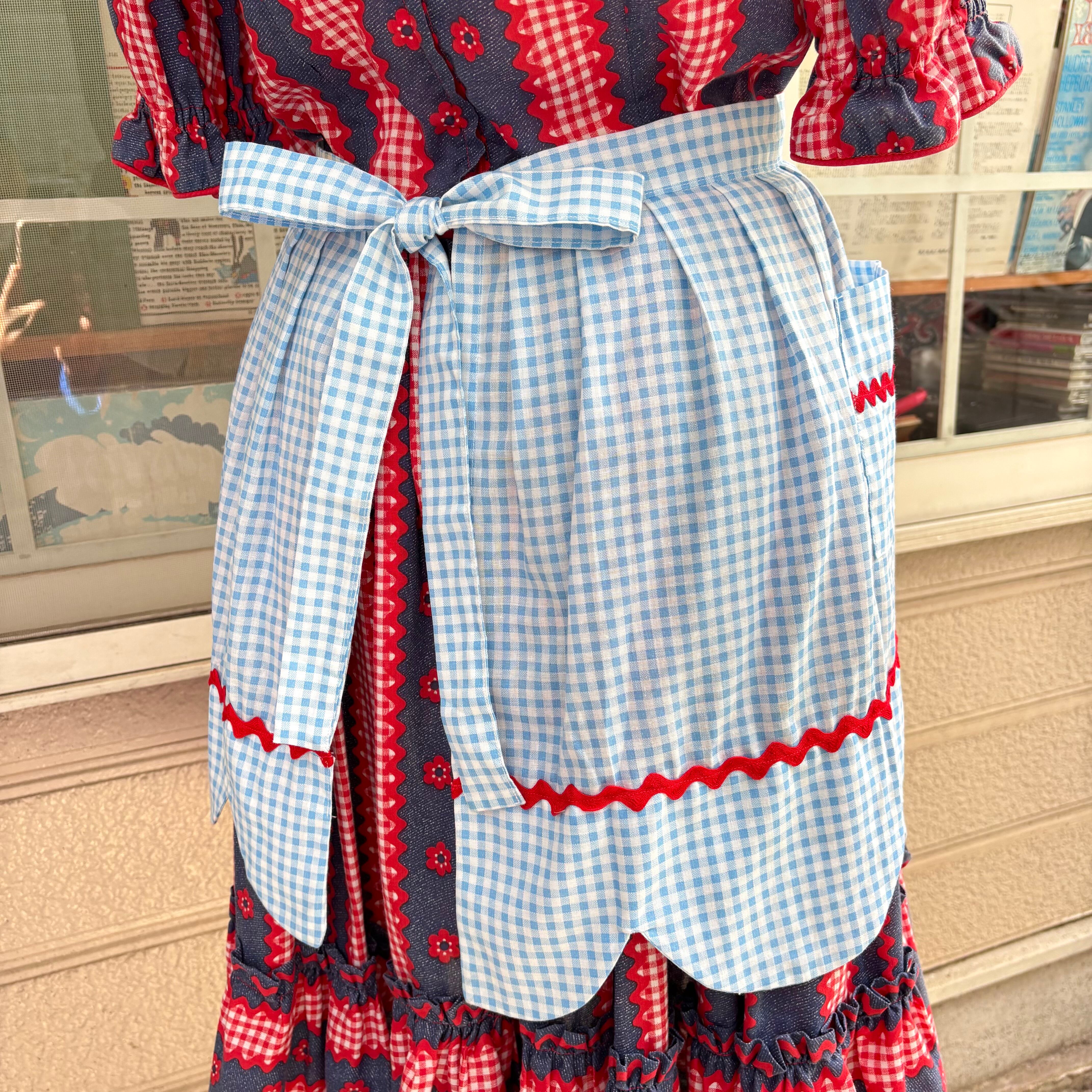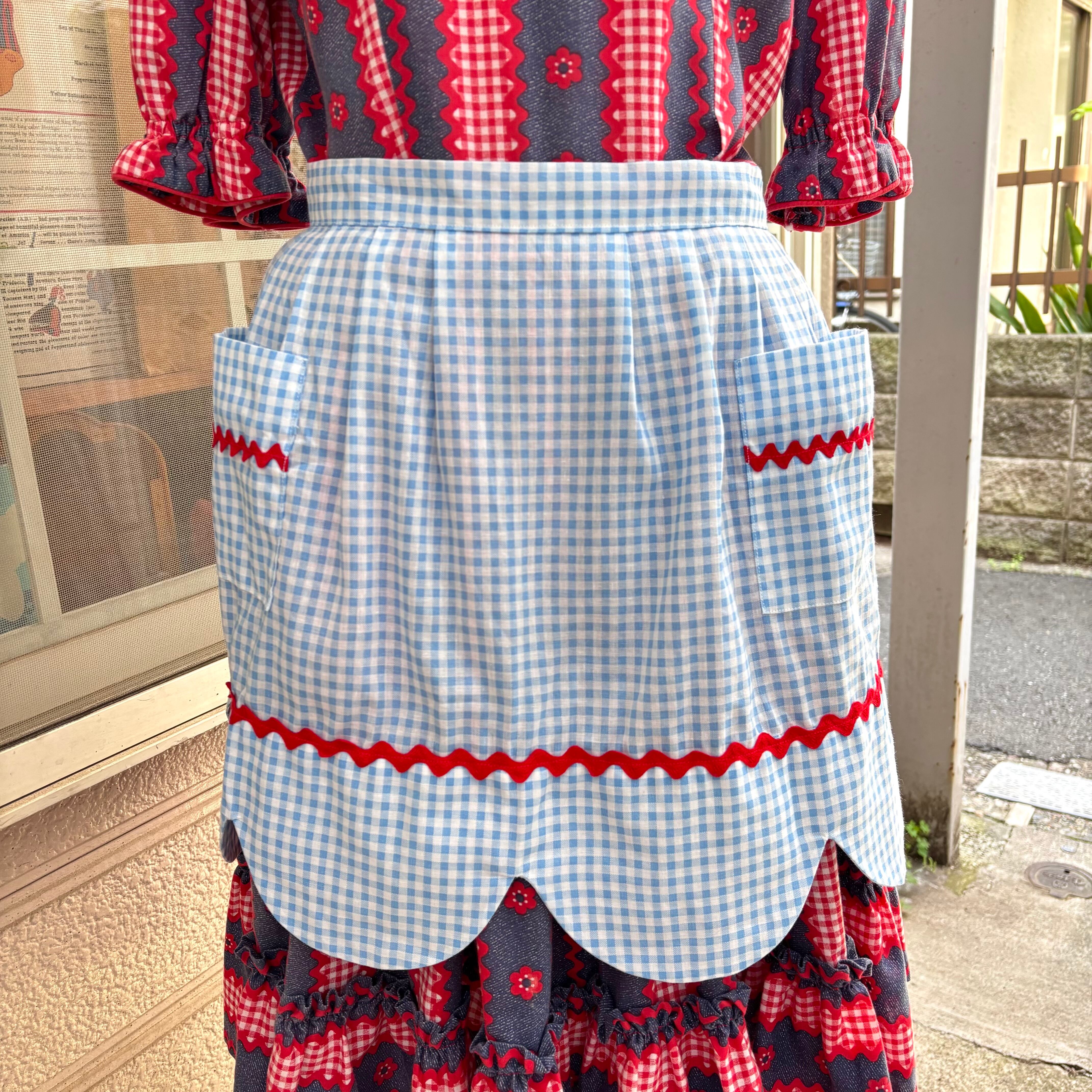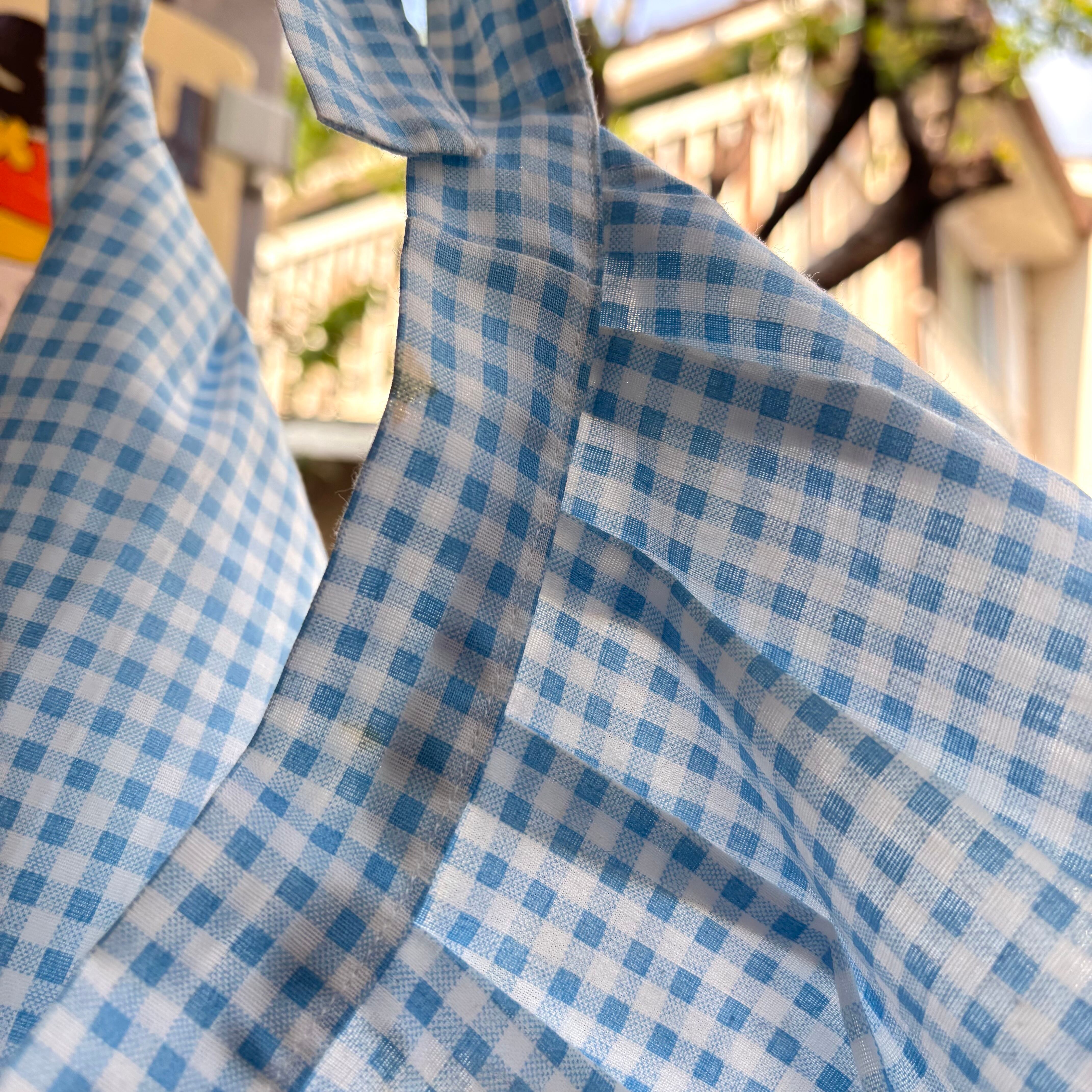 70'S USA Vintage light blue checkered apron。