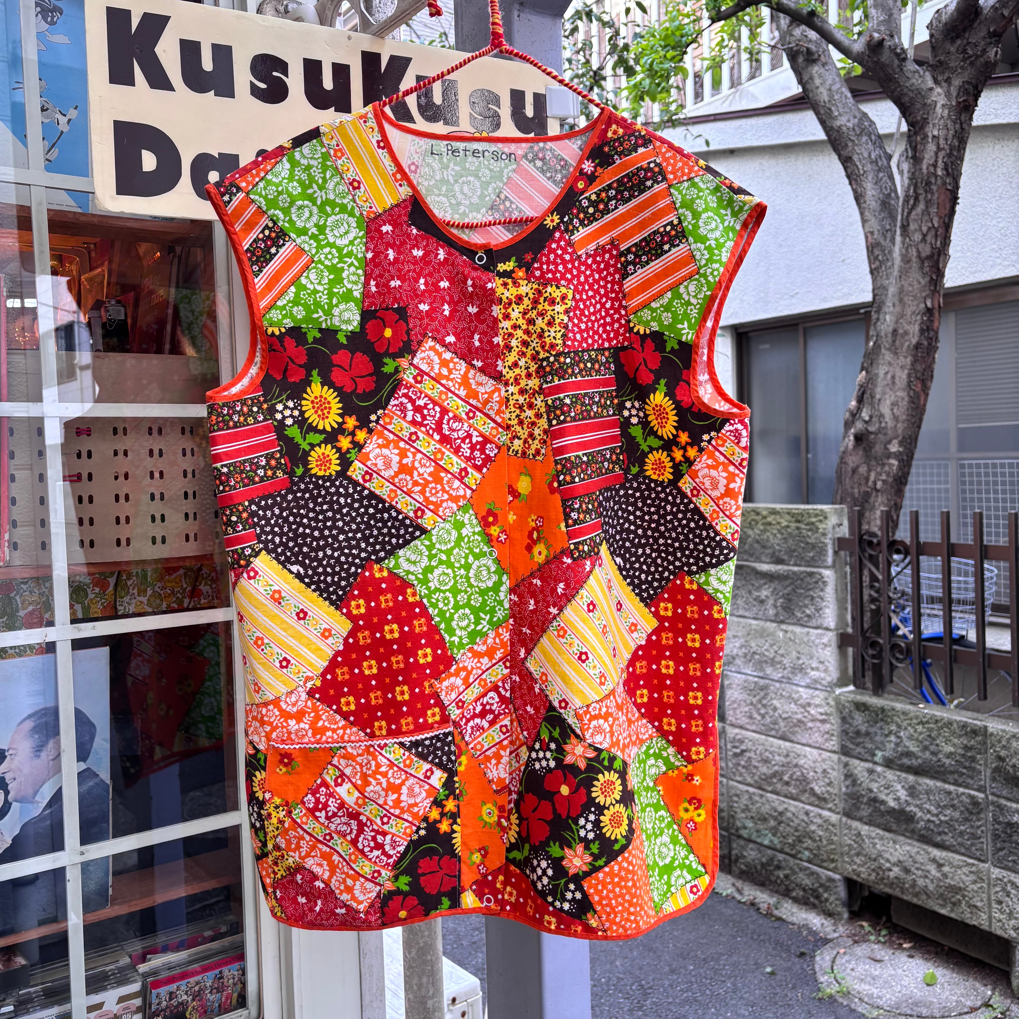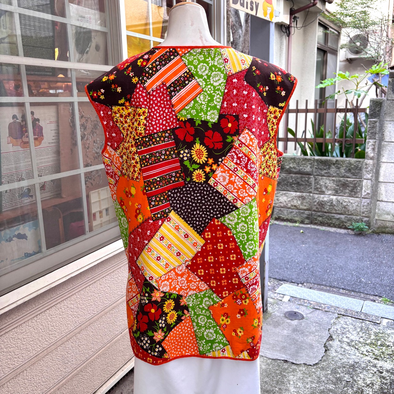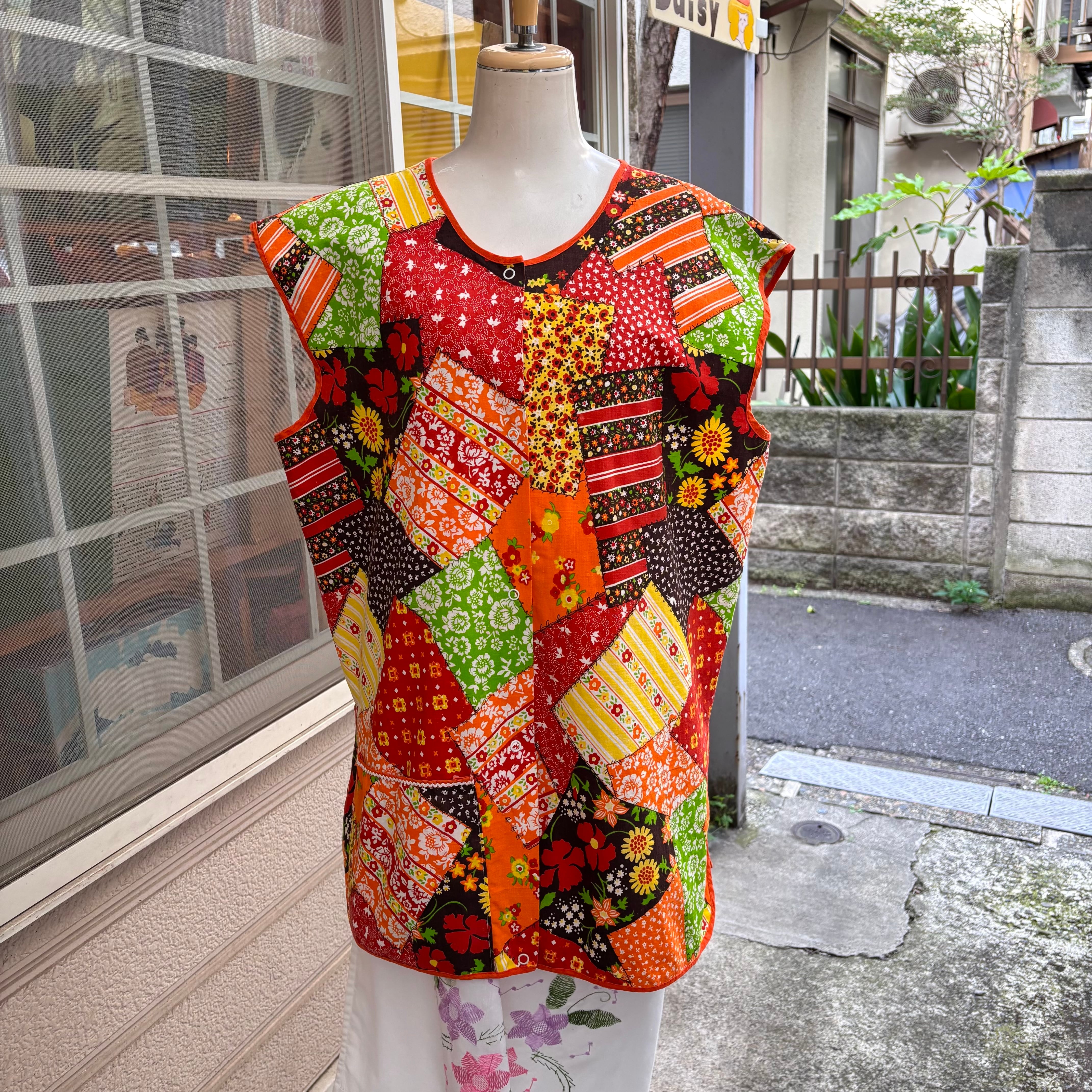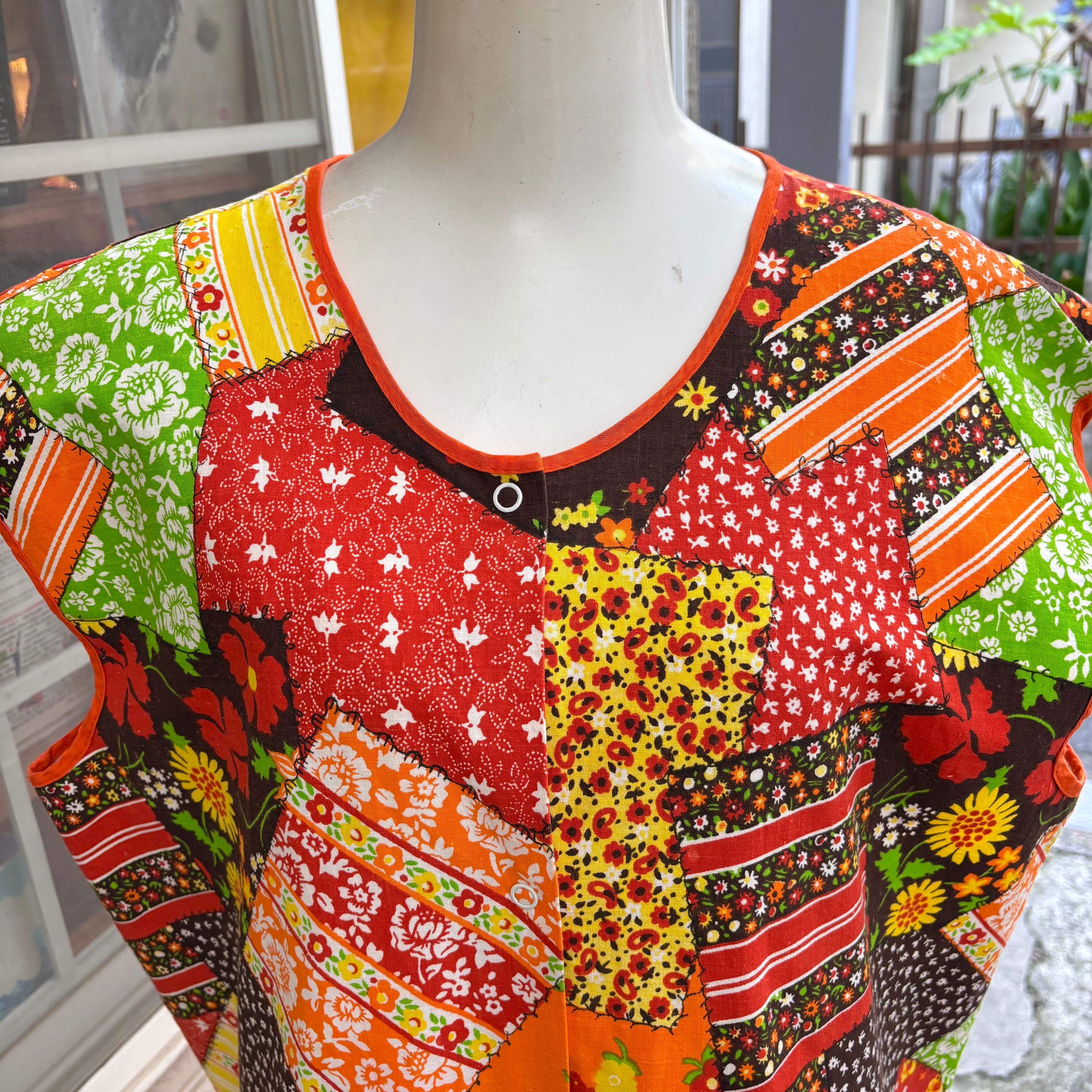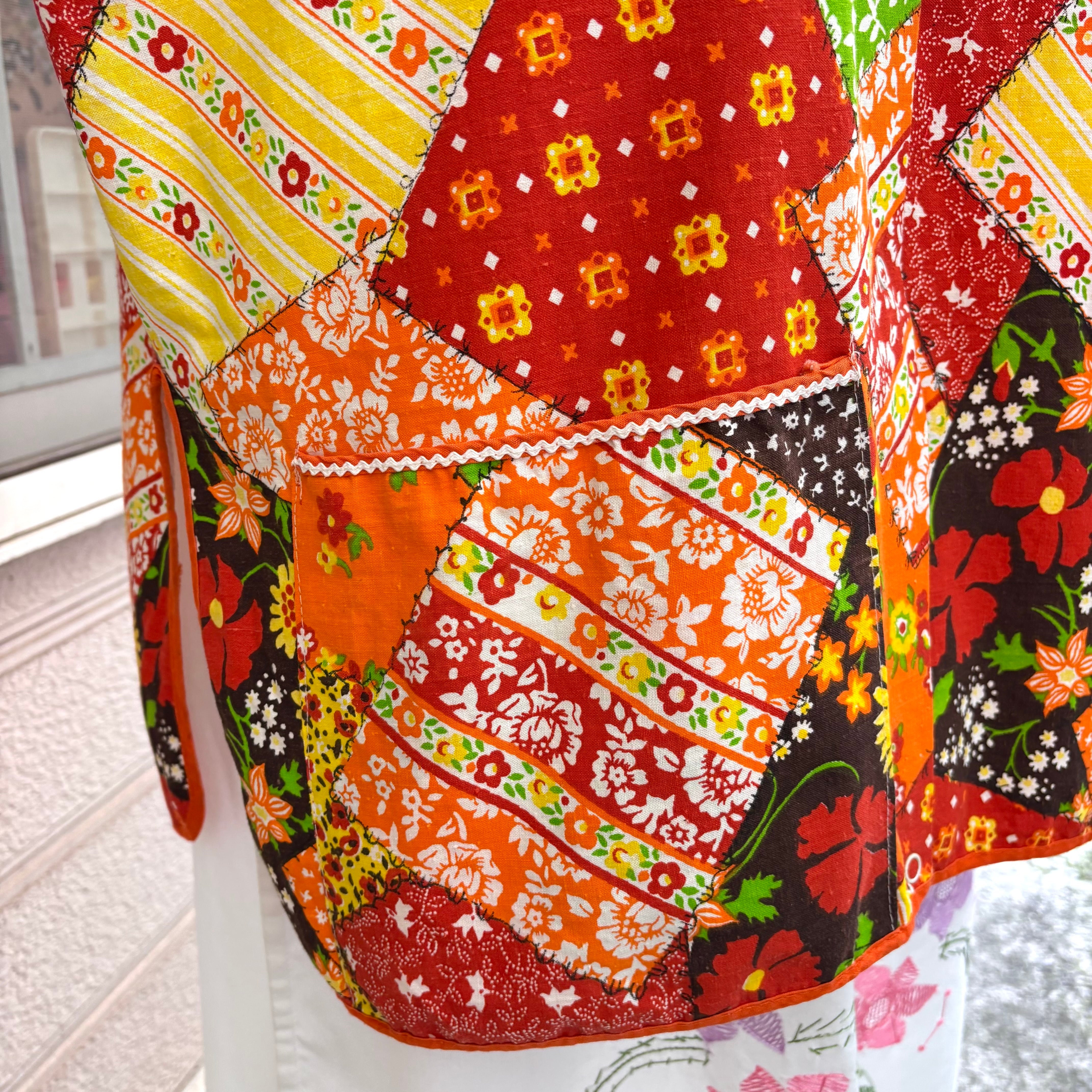 70年代 当時のハンドメイド1点もの ヴィンテージ カラフルフラワー パッチワーク柄 コットントップスです。