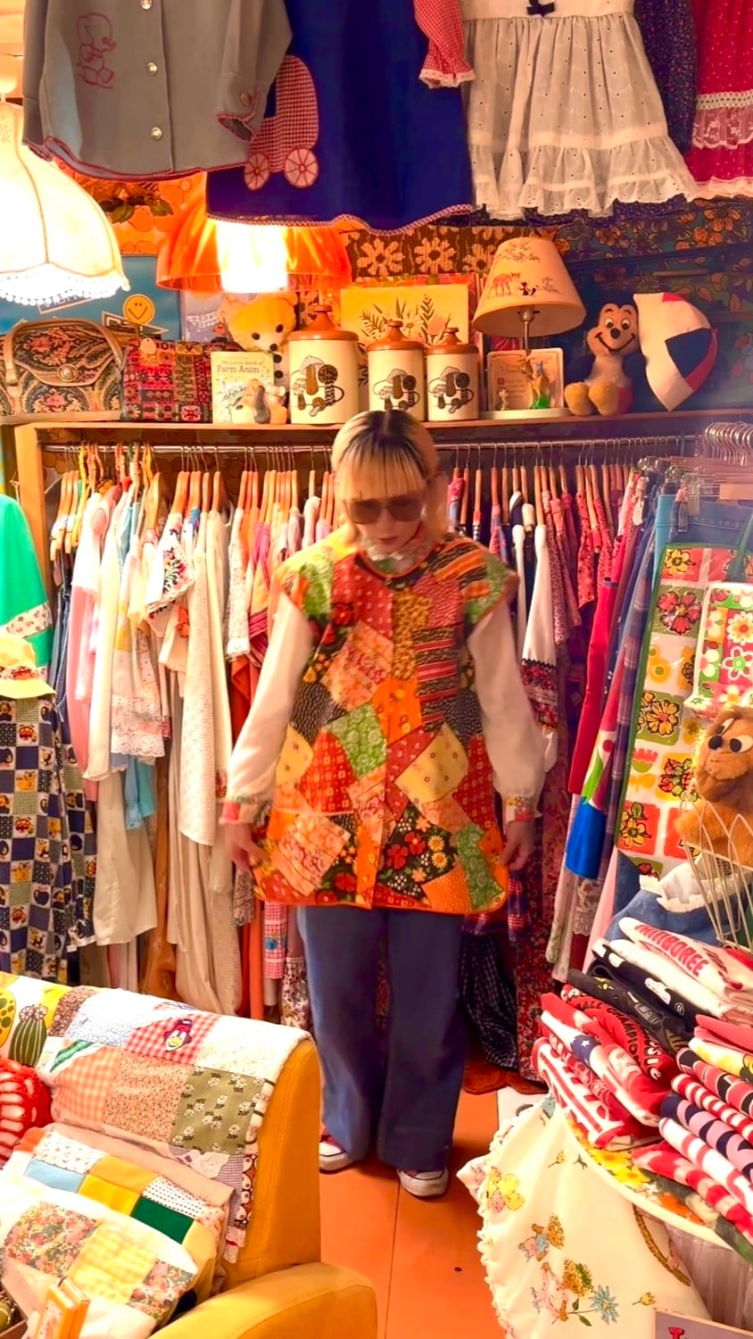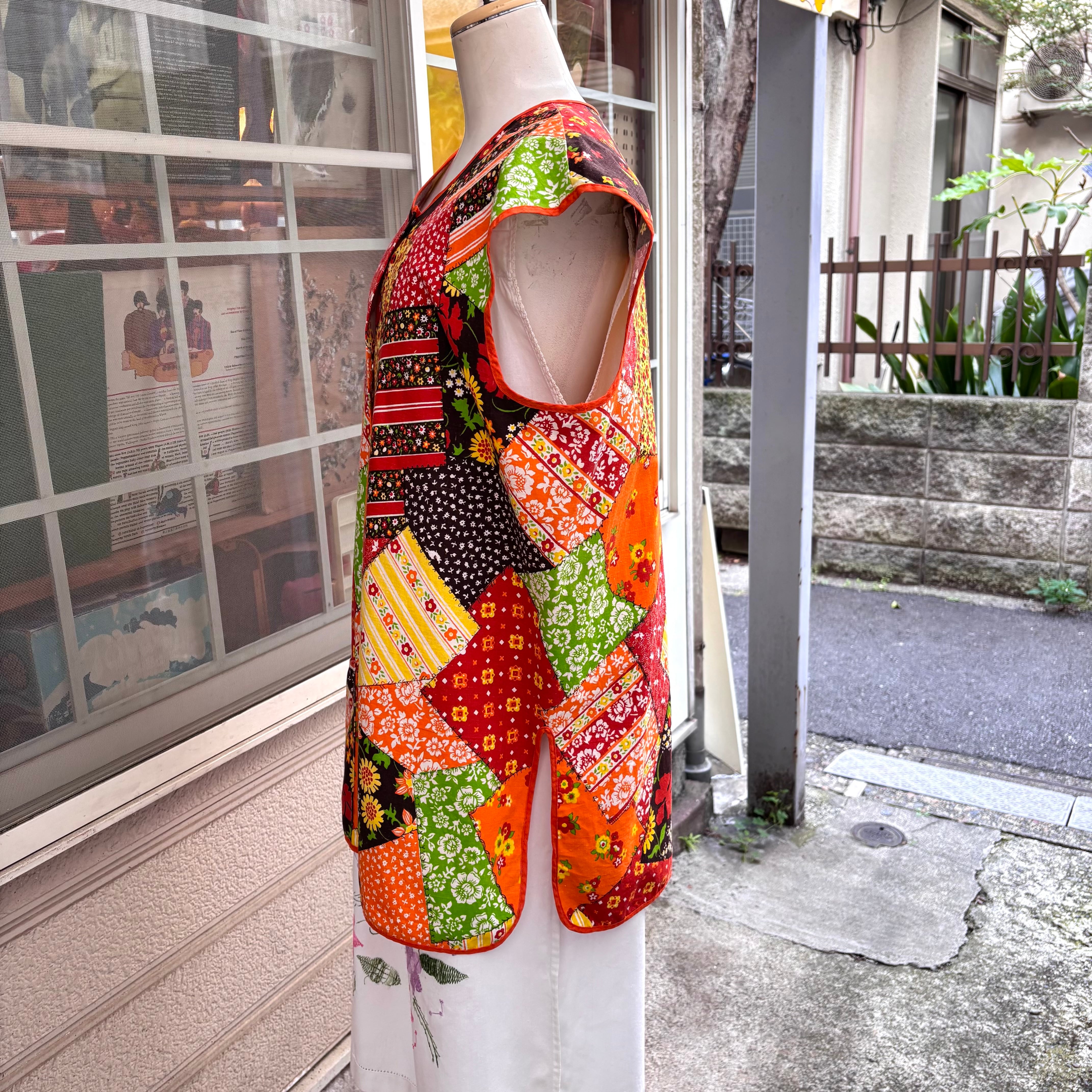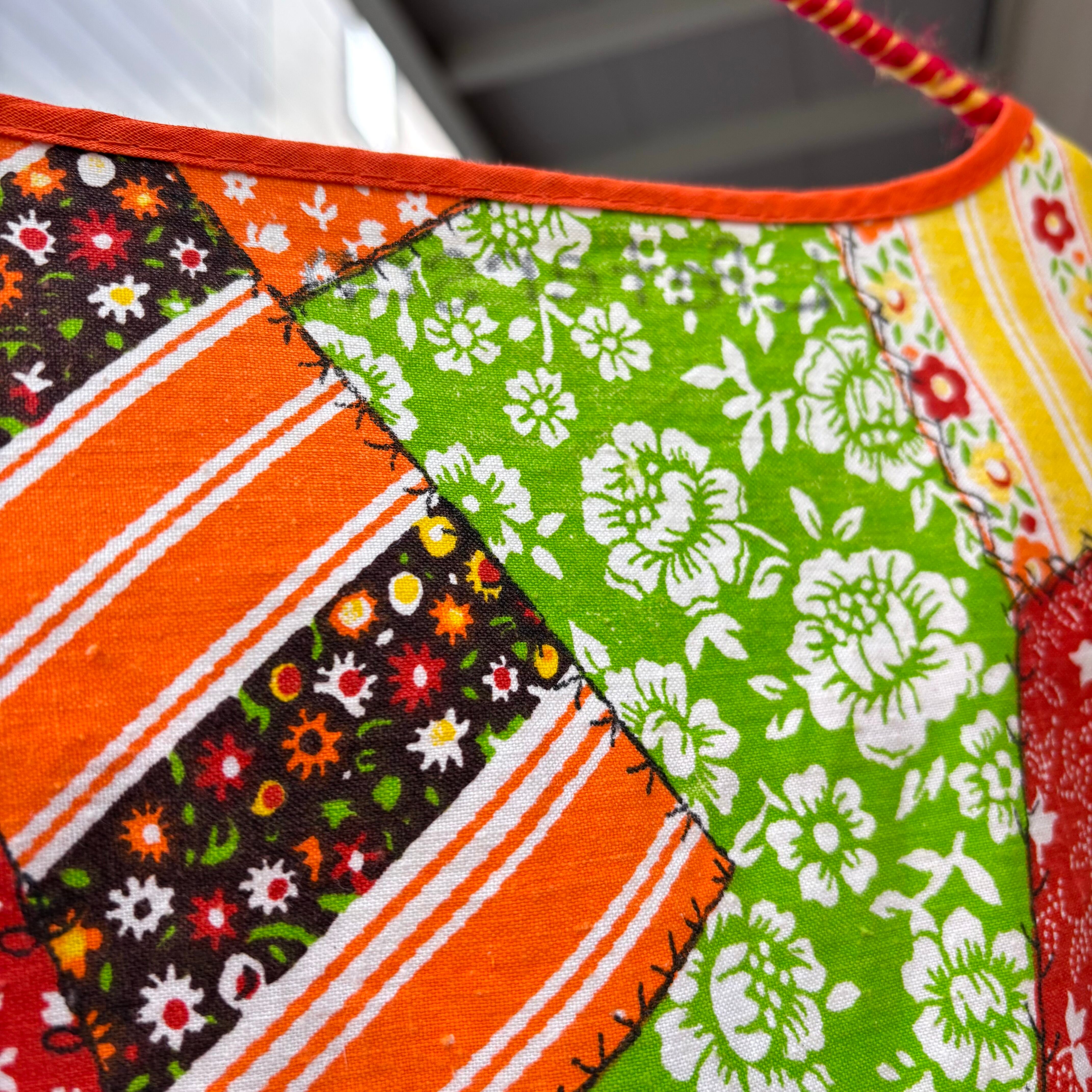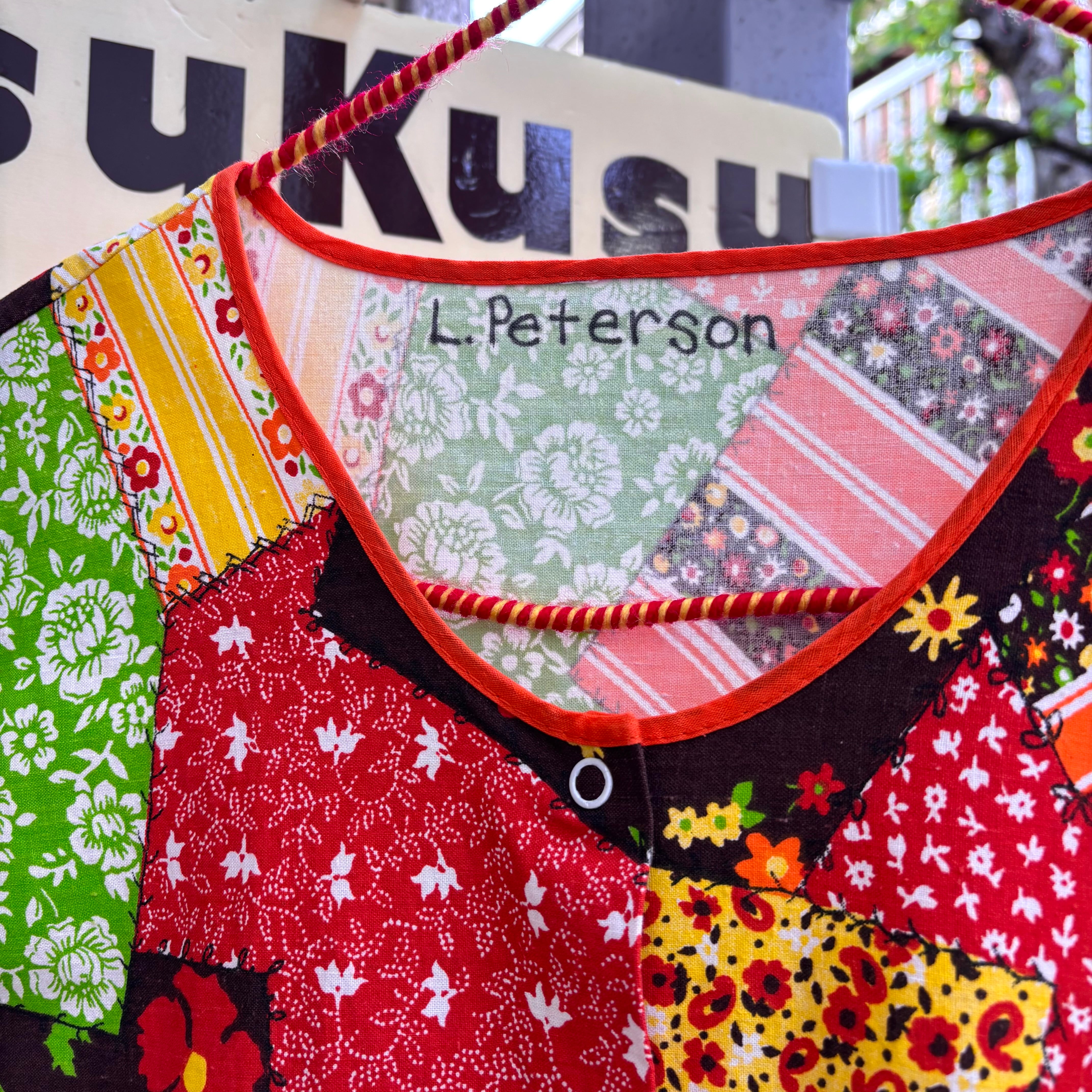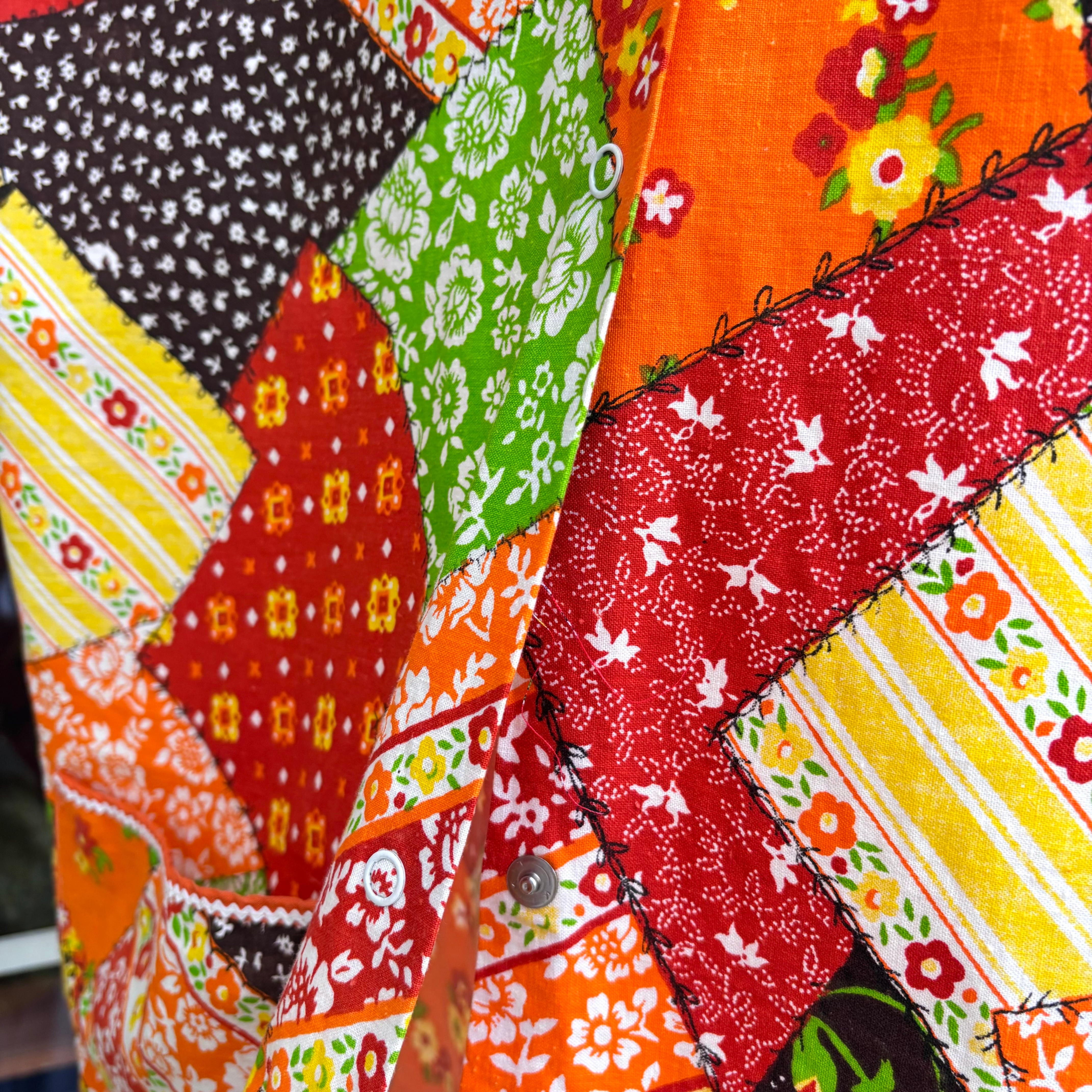 70年代 当時のハンドメイド1点もの ヴィンテージ カラフルフラワー パッチワーク柄 コットントップスです。