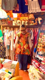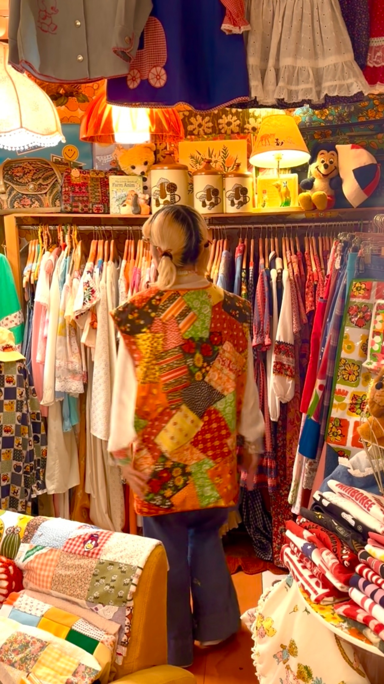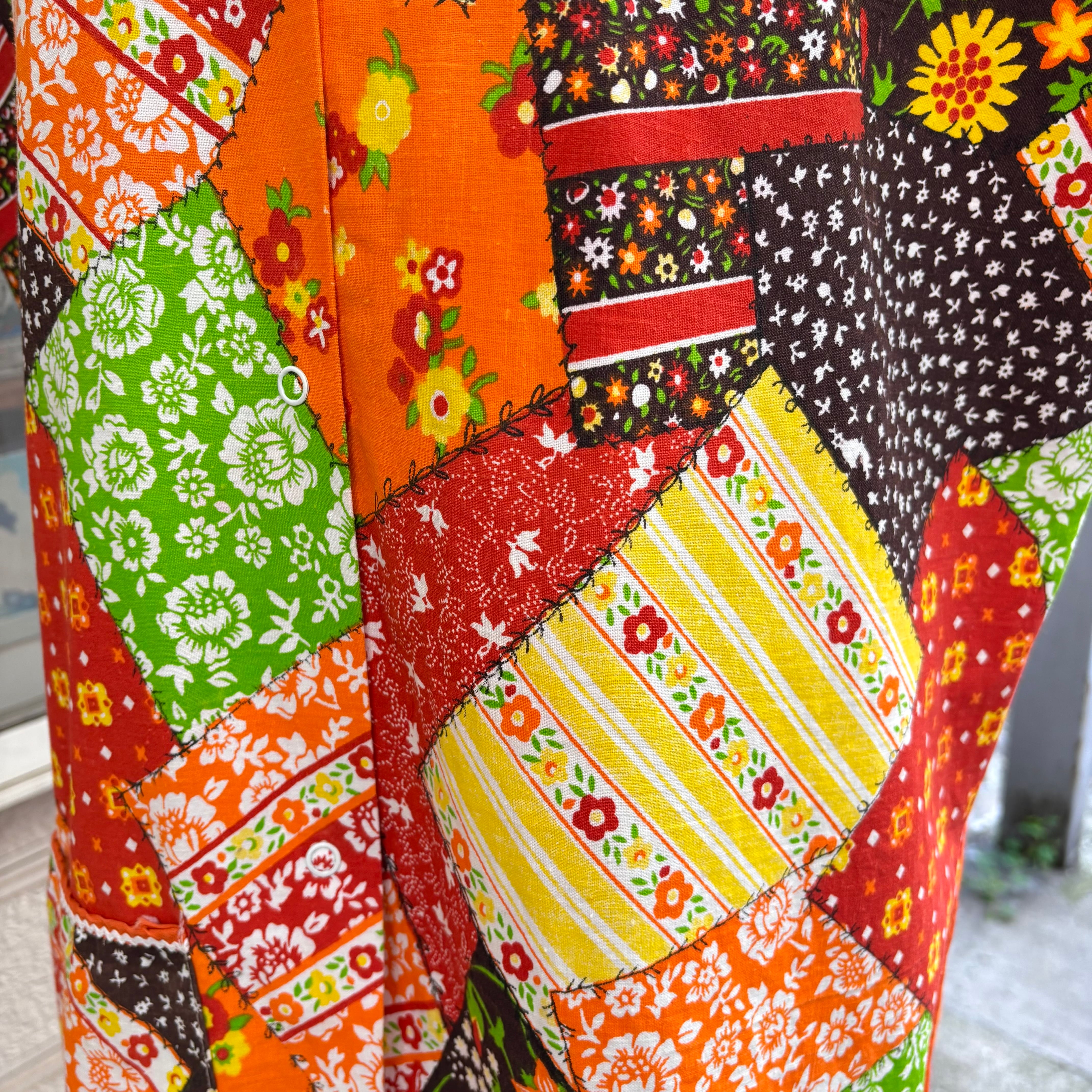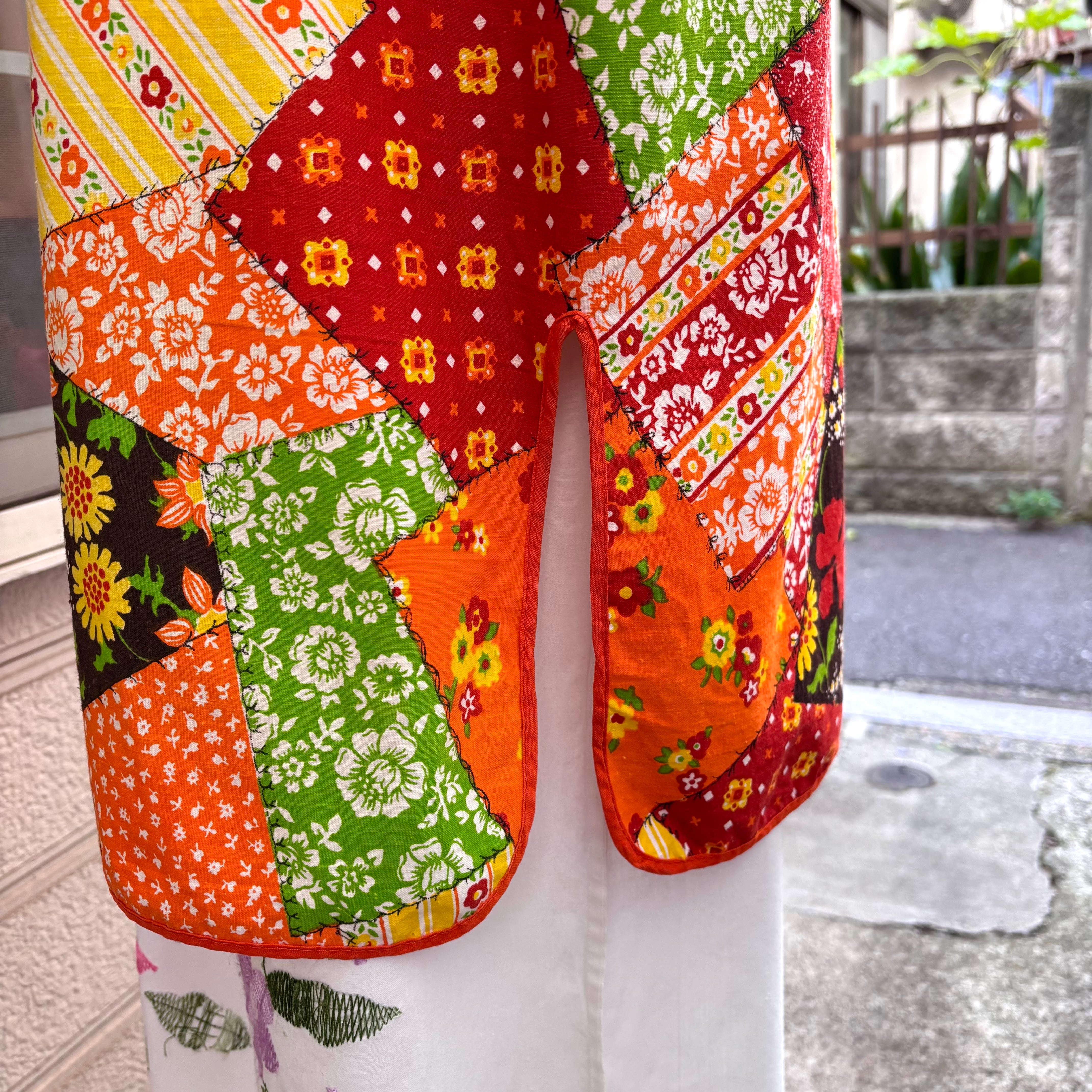 風合いのあるコットン生地にブラウン、レッド、オレンジ、イエロー、ライトグリーン、ホワイトのカラフルなカラーリングやフラワー柄のパッチワークプリントがとっても可愛い1着です。
