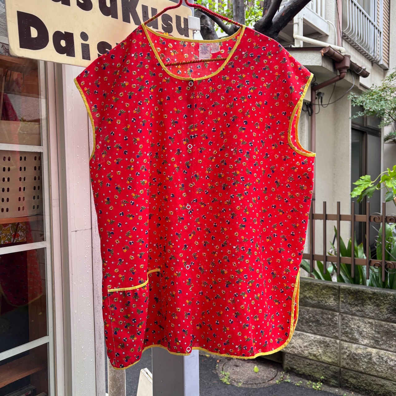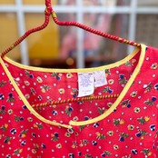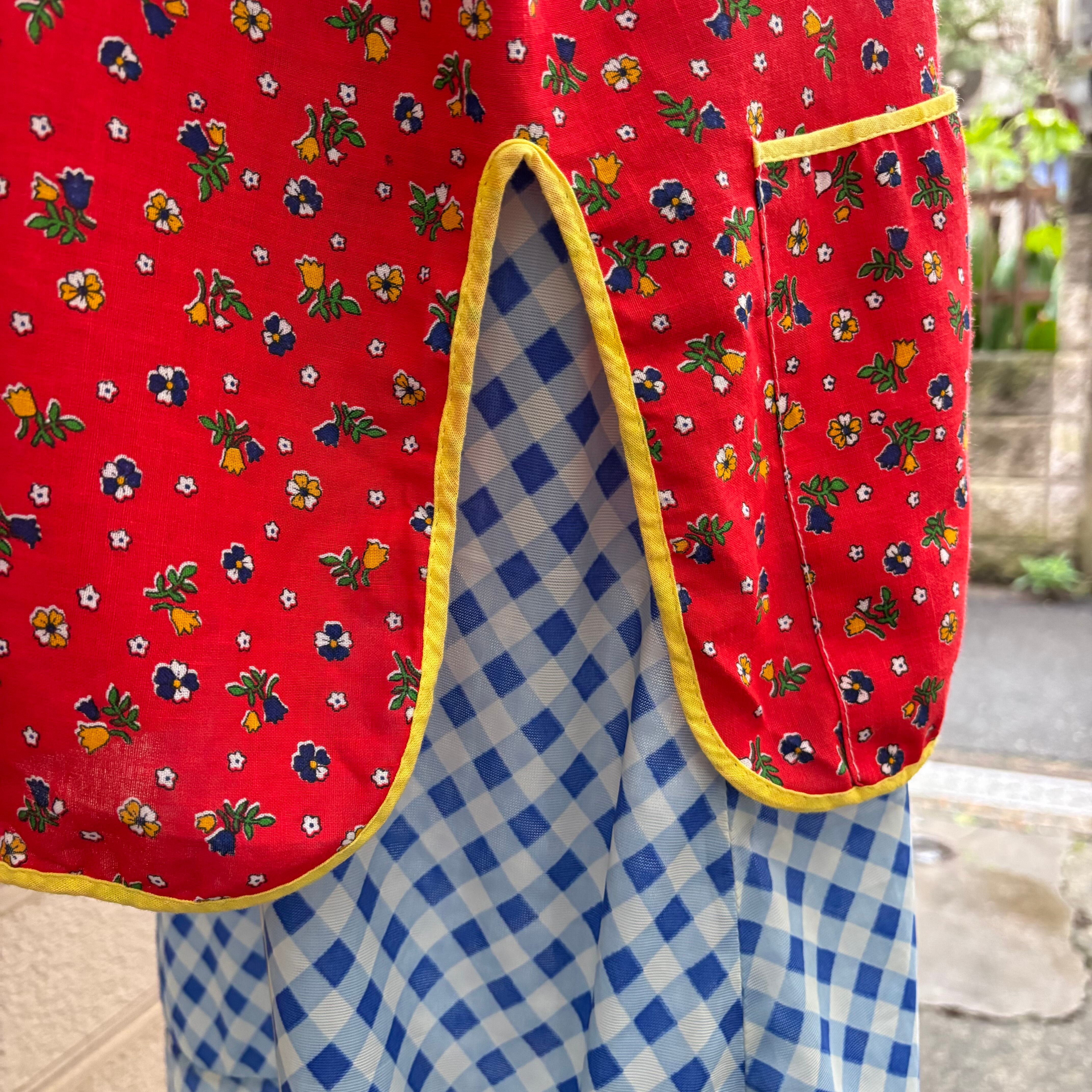 レッドカラーのボディーにオレンジ、ホワイト、ネイビー、グリーンの小花柄がとっても可愛い1着です。
