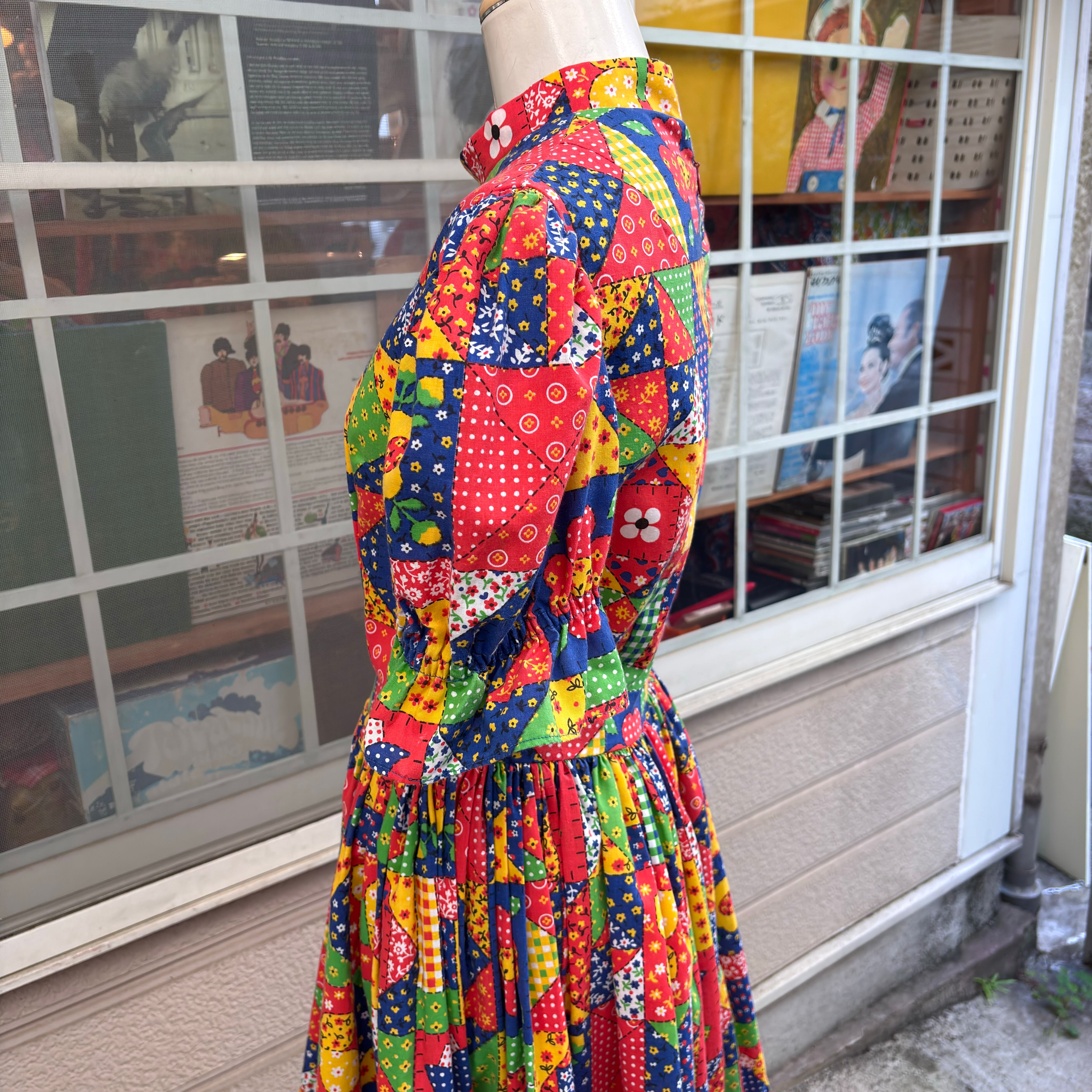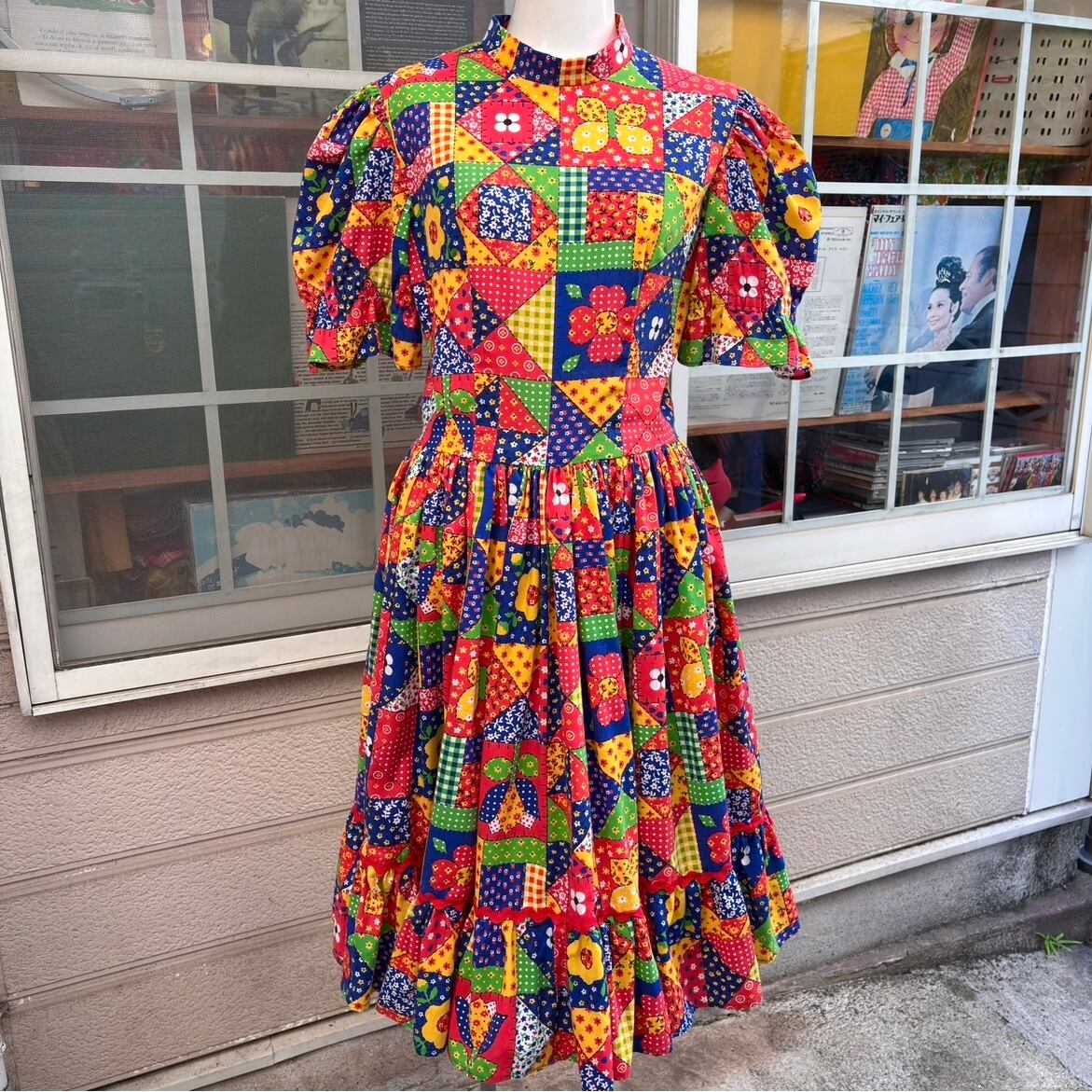 70年代 当時のハンドメイド1点もの ヴィンテージ カラフル パッチワーク柄 ドレスです。