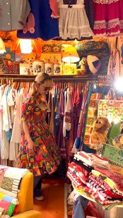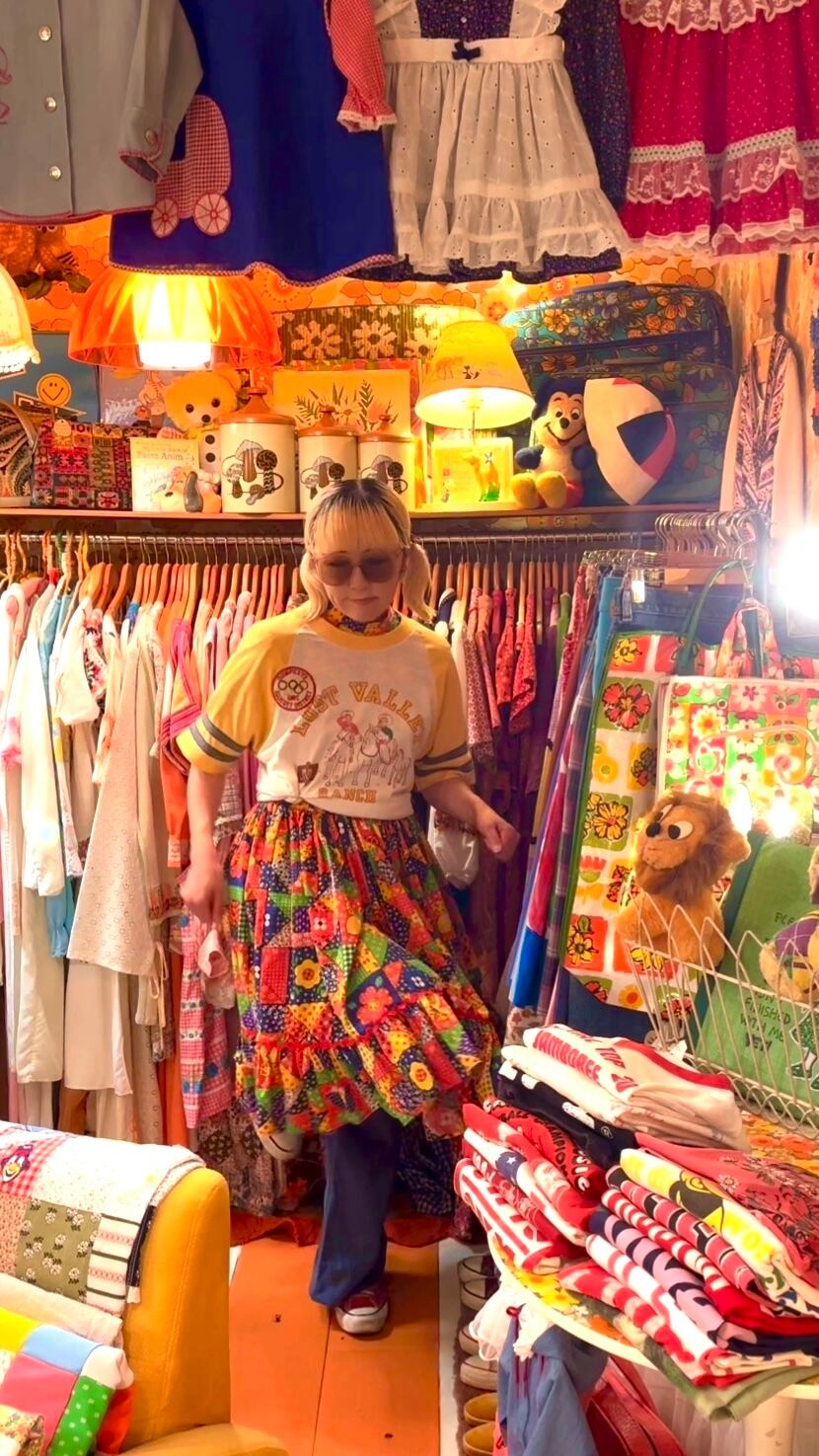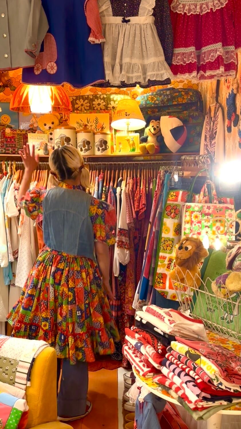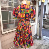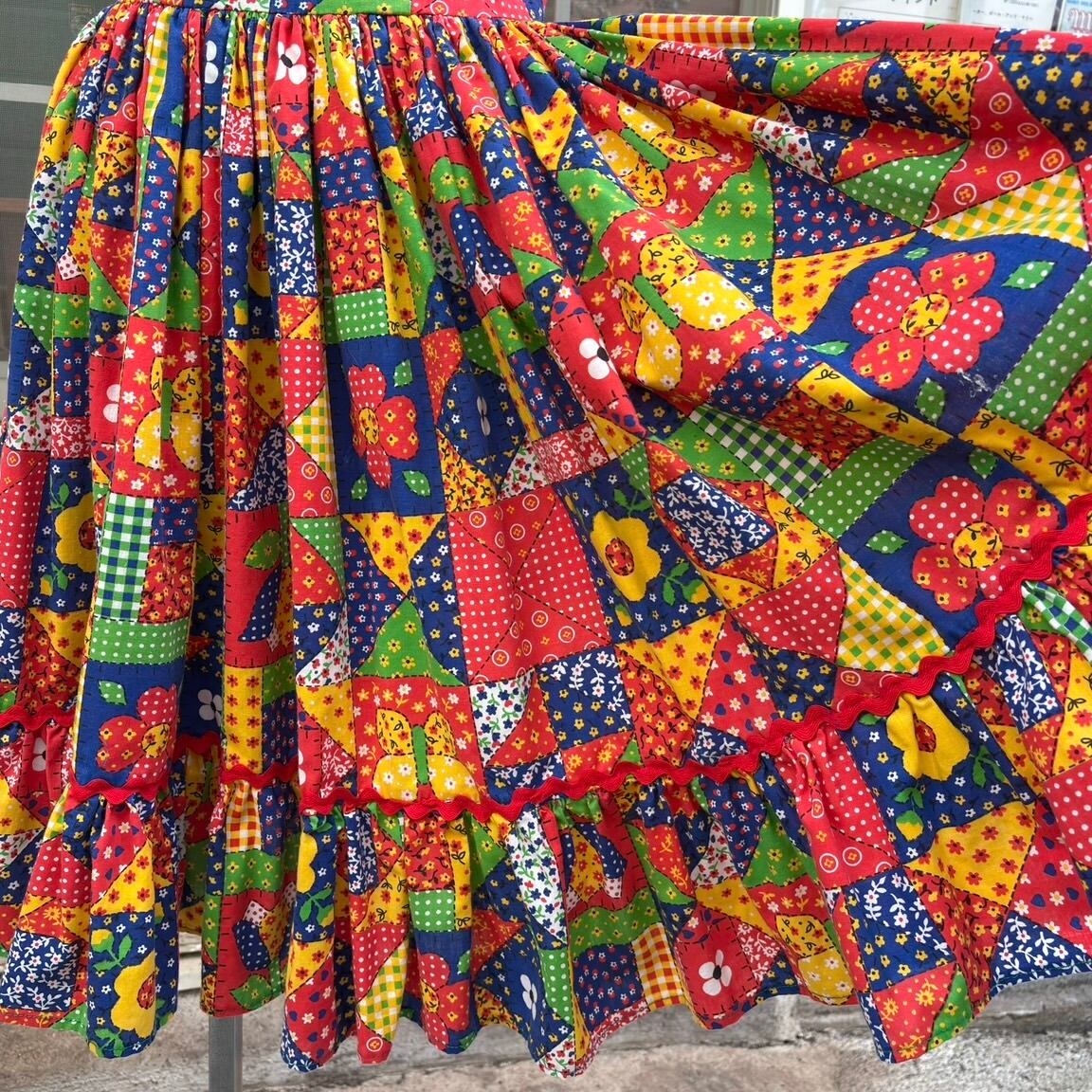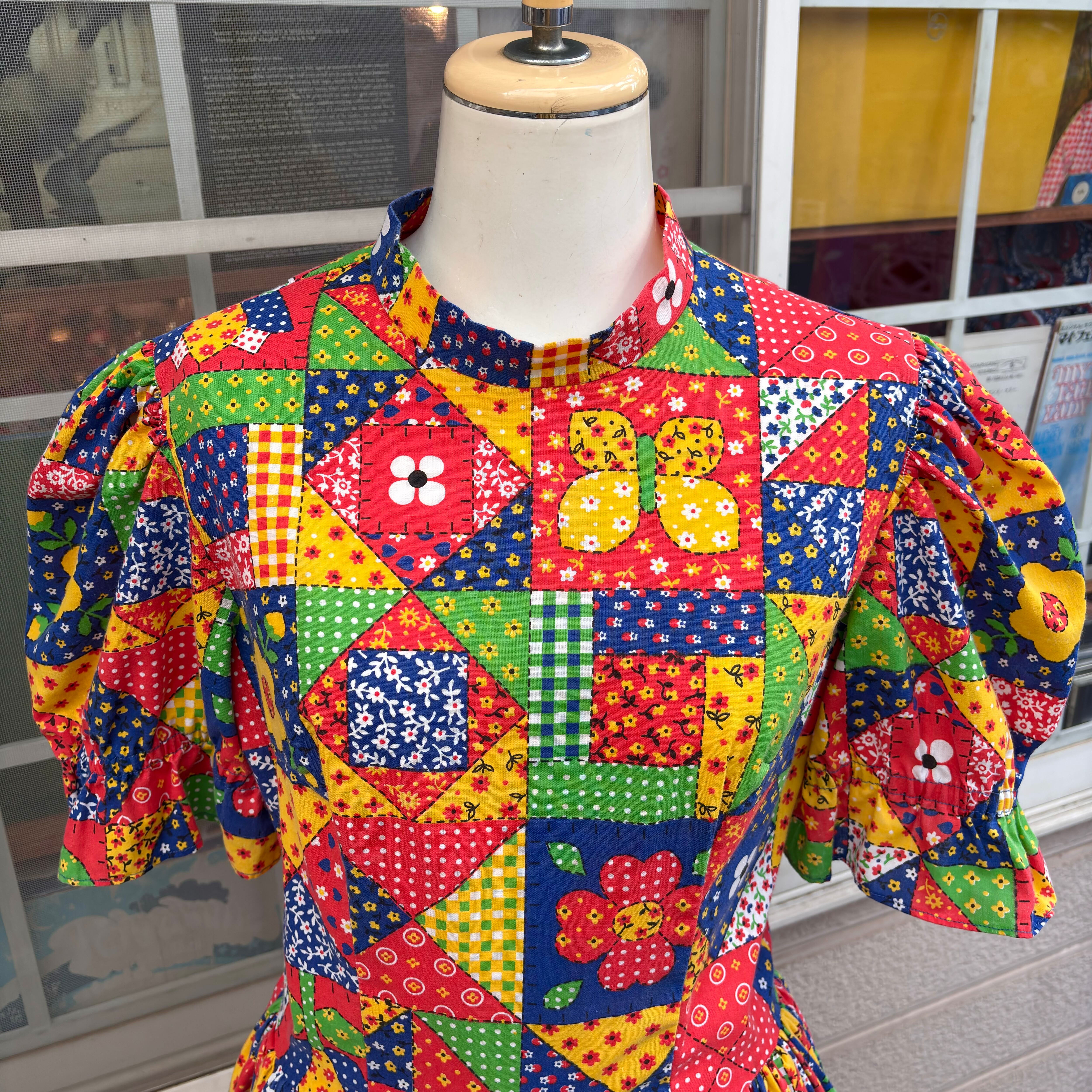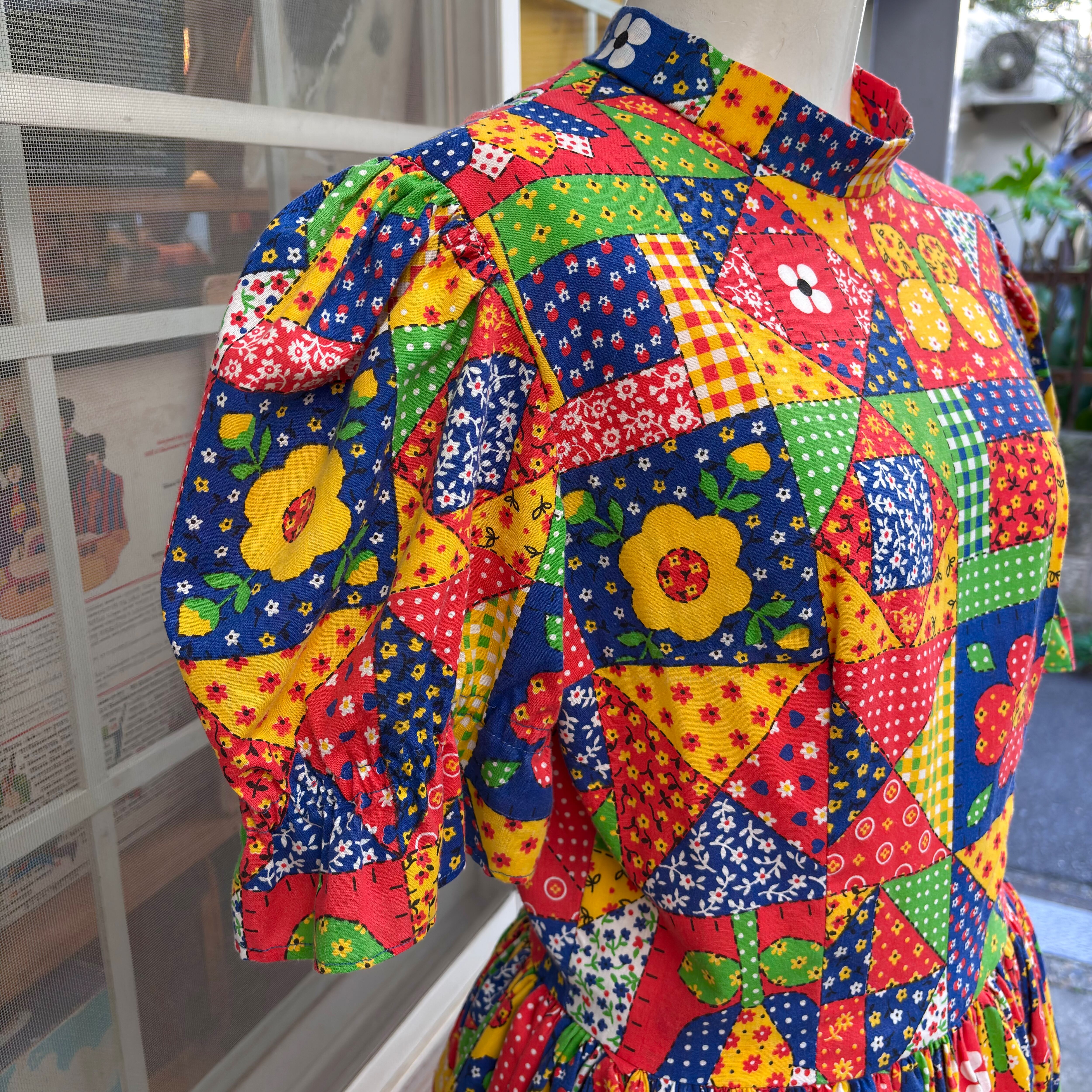 レッド、ネイビー、ライトグリーン、イエロー、ホワイトのカラフルなカラーリングやフラワー柄やドットやチェック、バタフライなど70年代ならではなパッチワーク柄がとっても可愛い1着です。