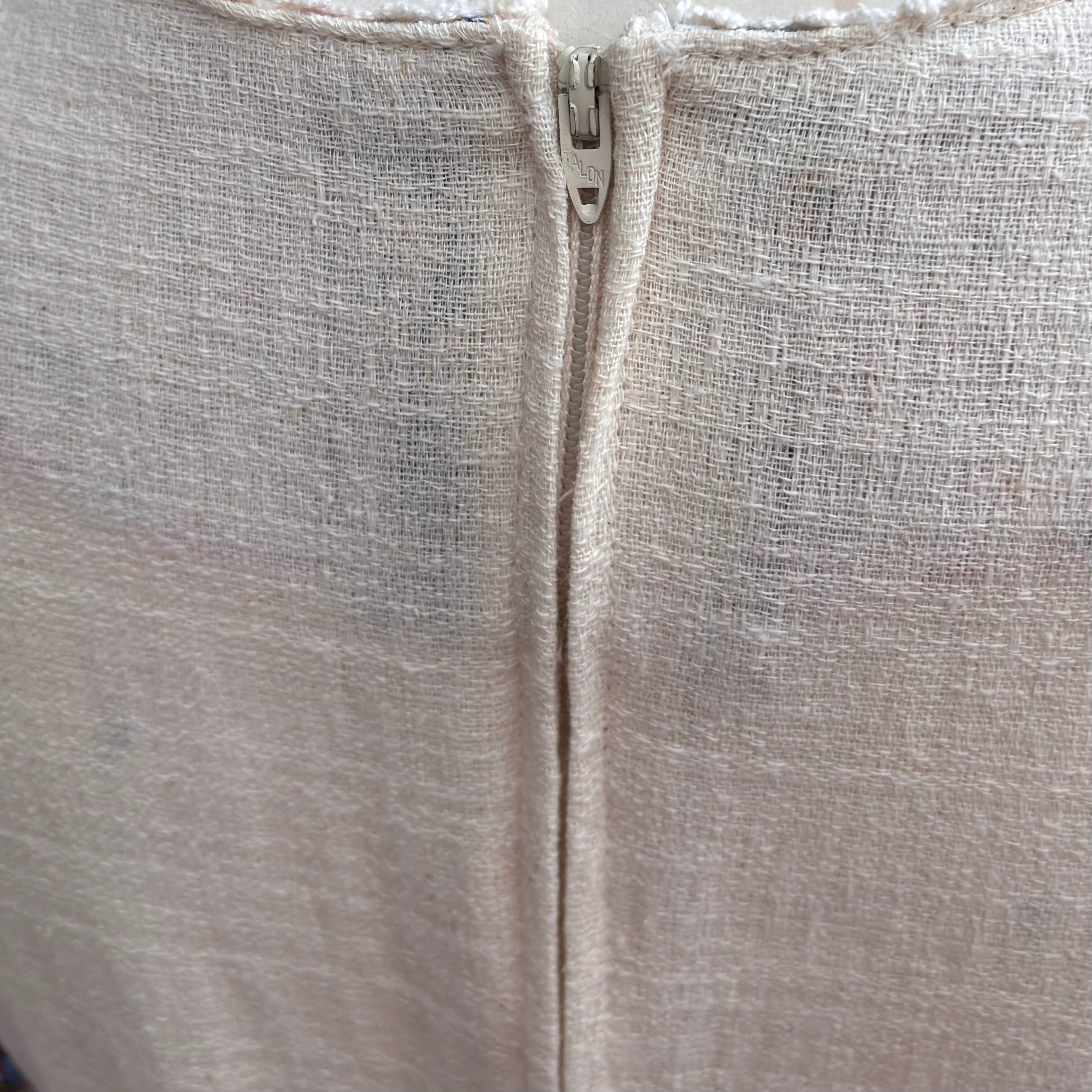 風合いのある織りの入ったクリームカラーの生地とパッチワーク柄の生地の切り替えのデザインがとっても可愛い1着です。