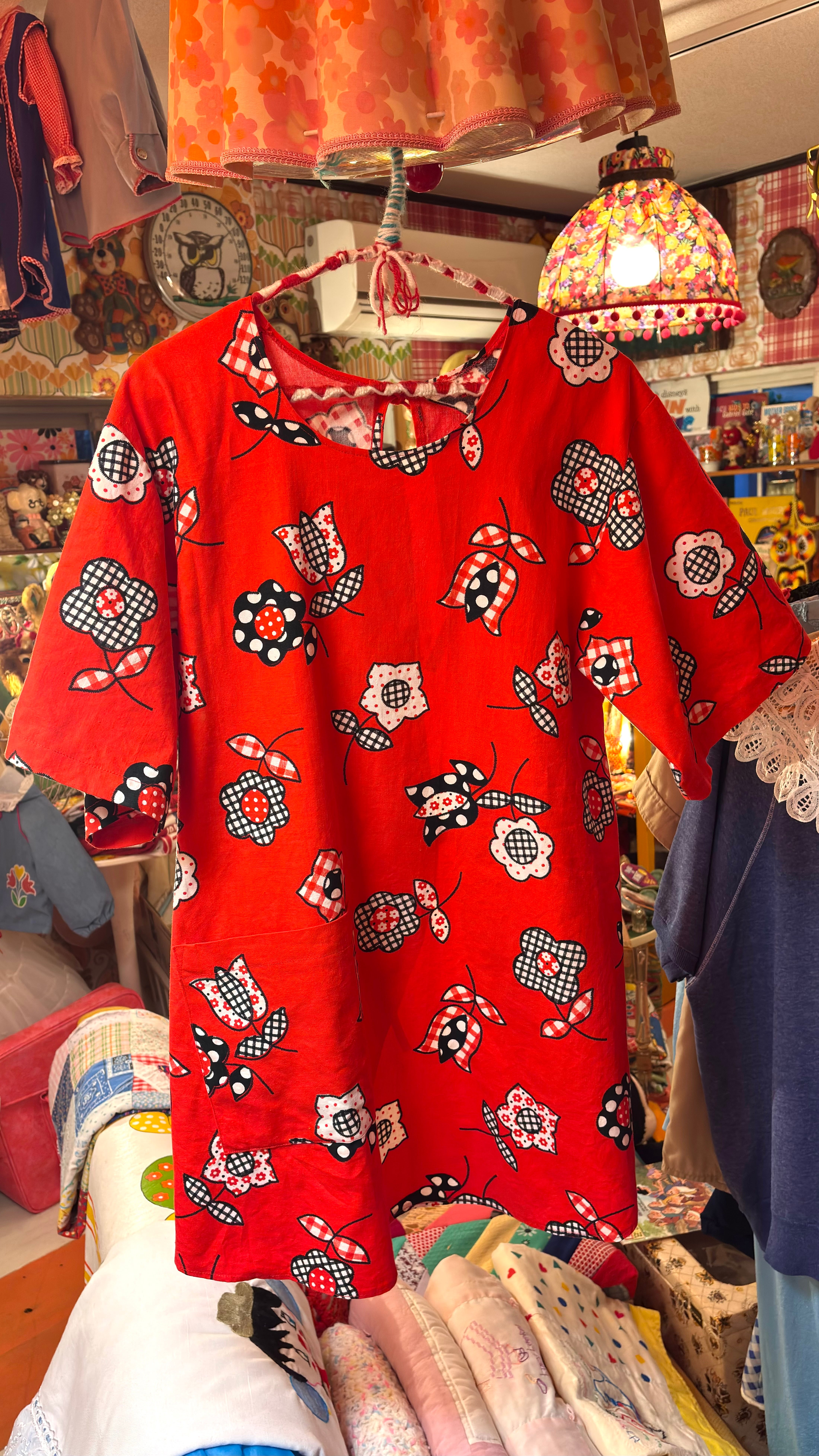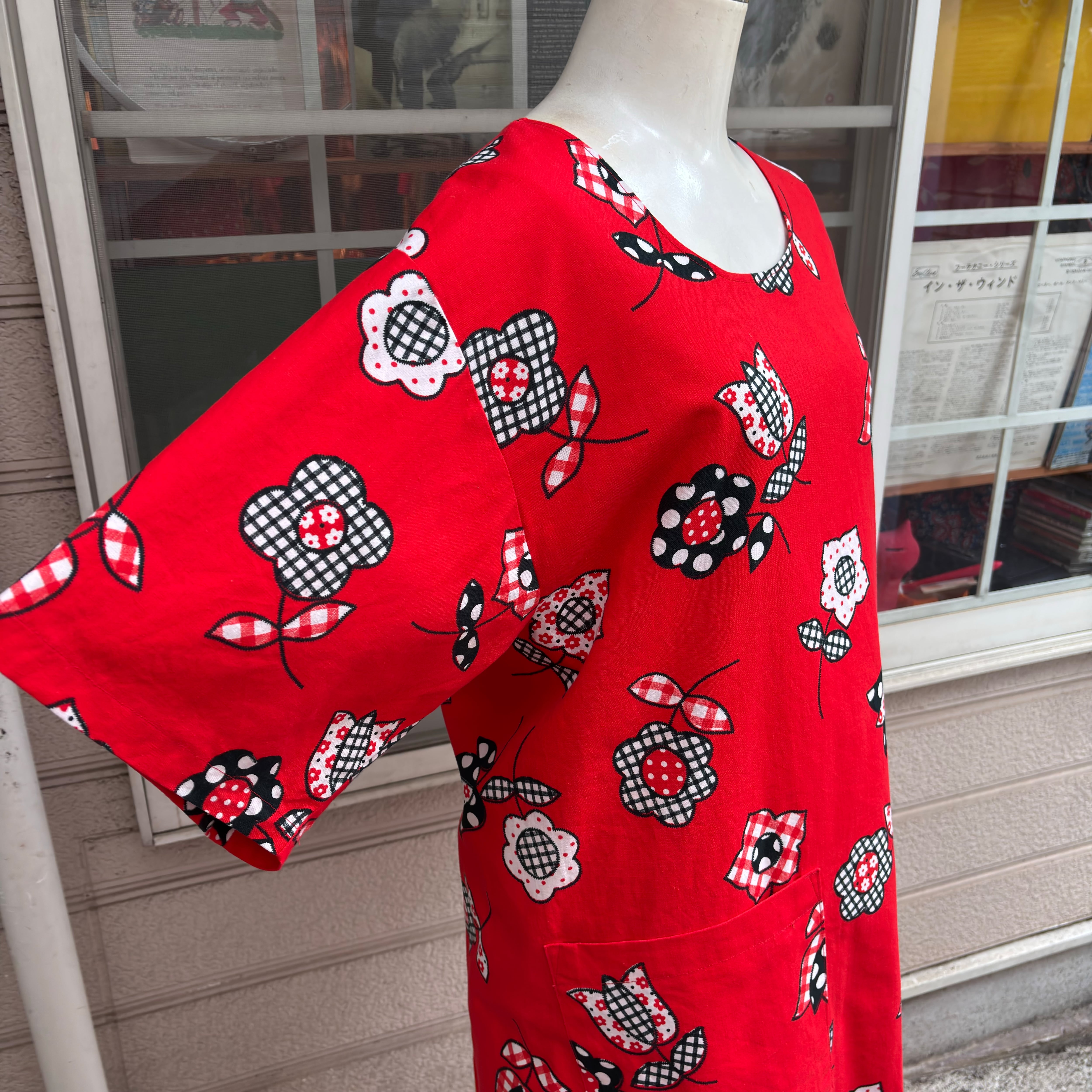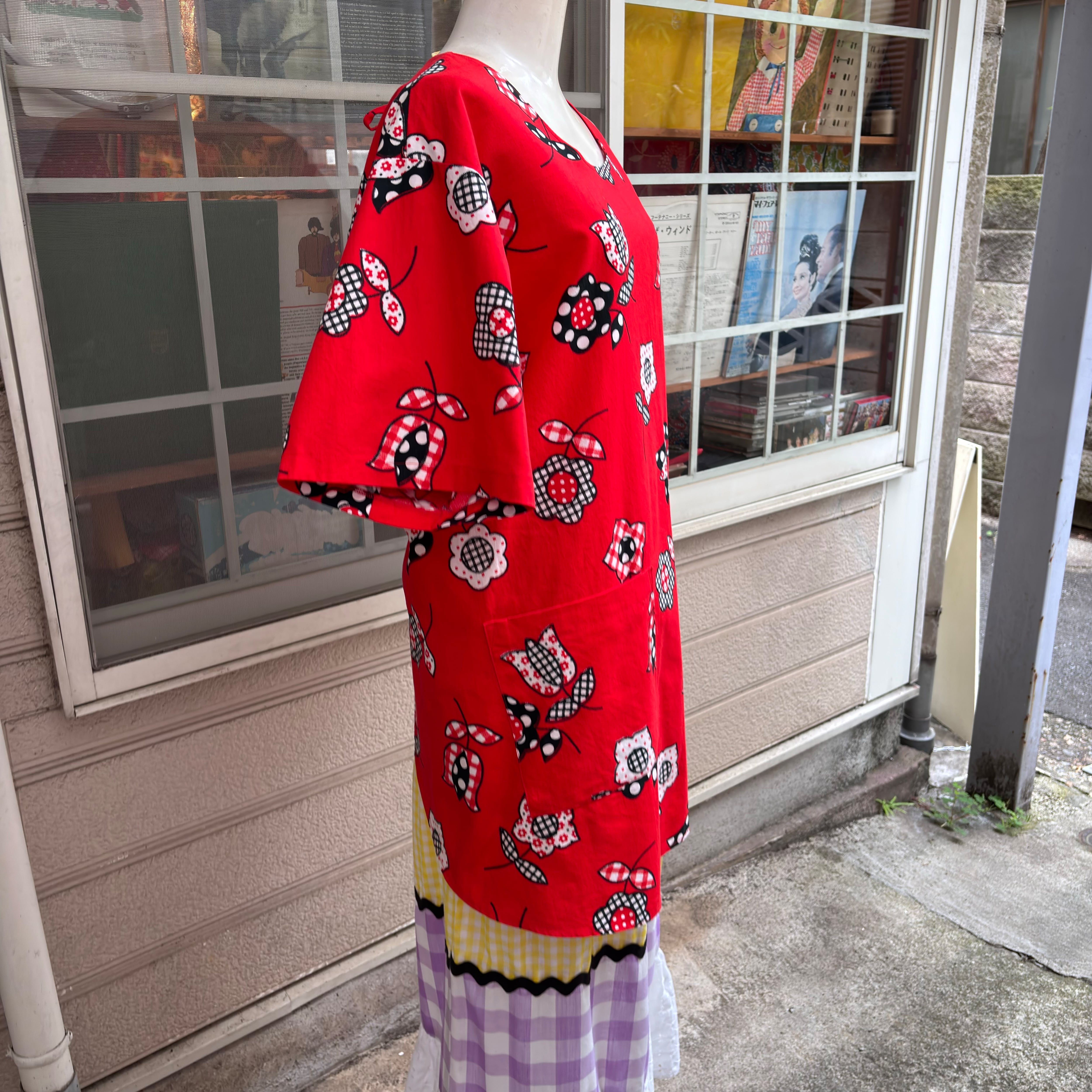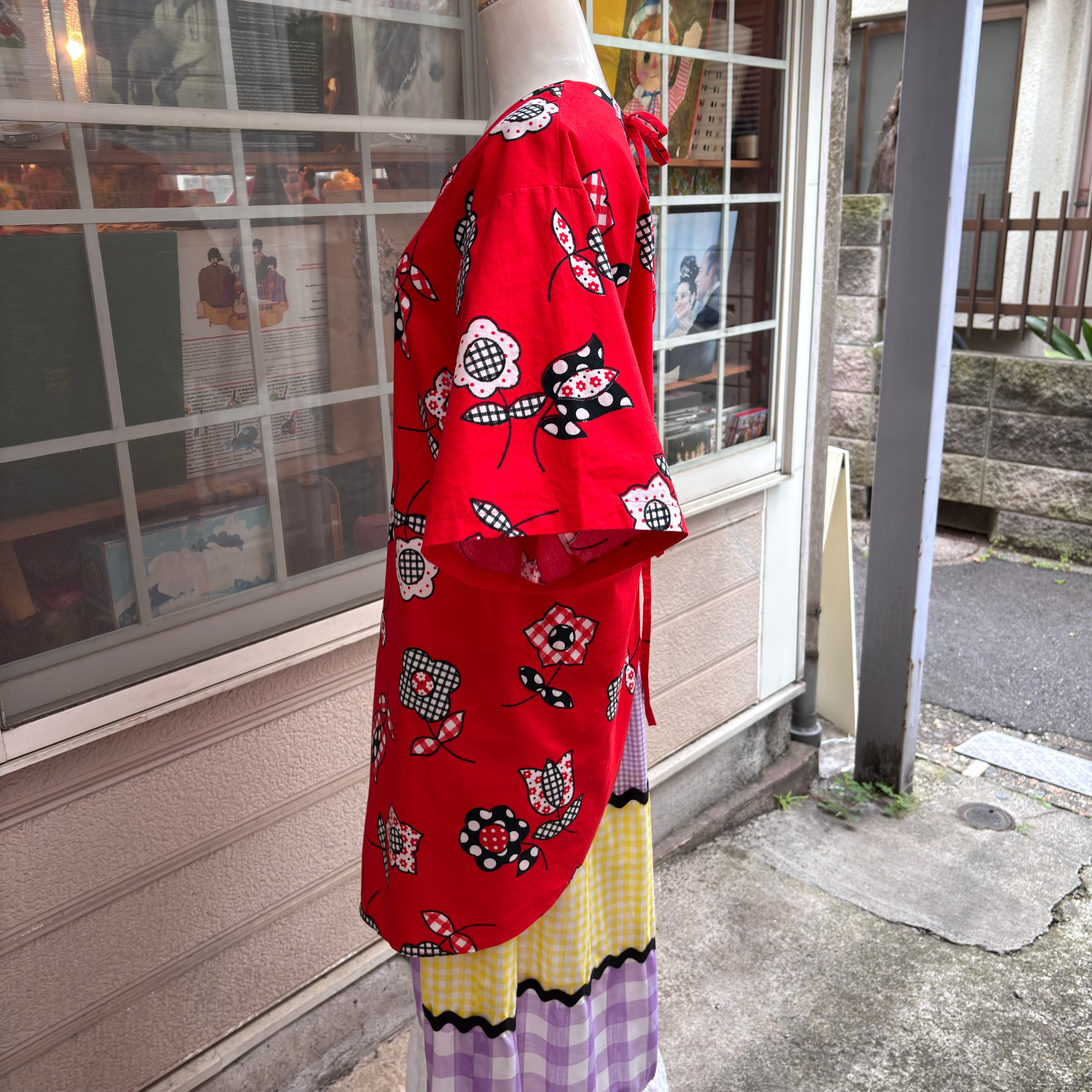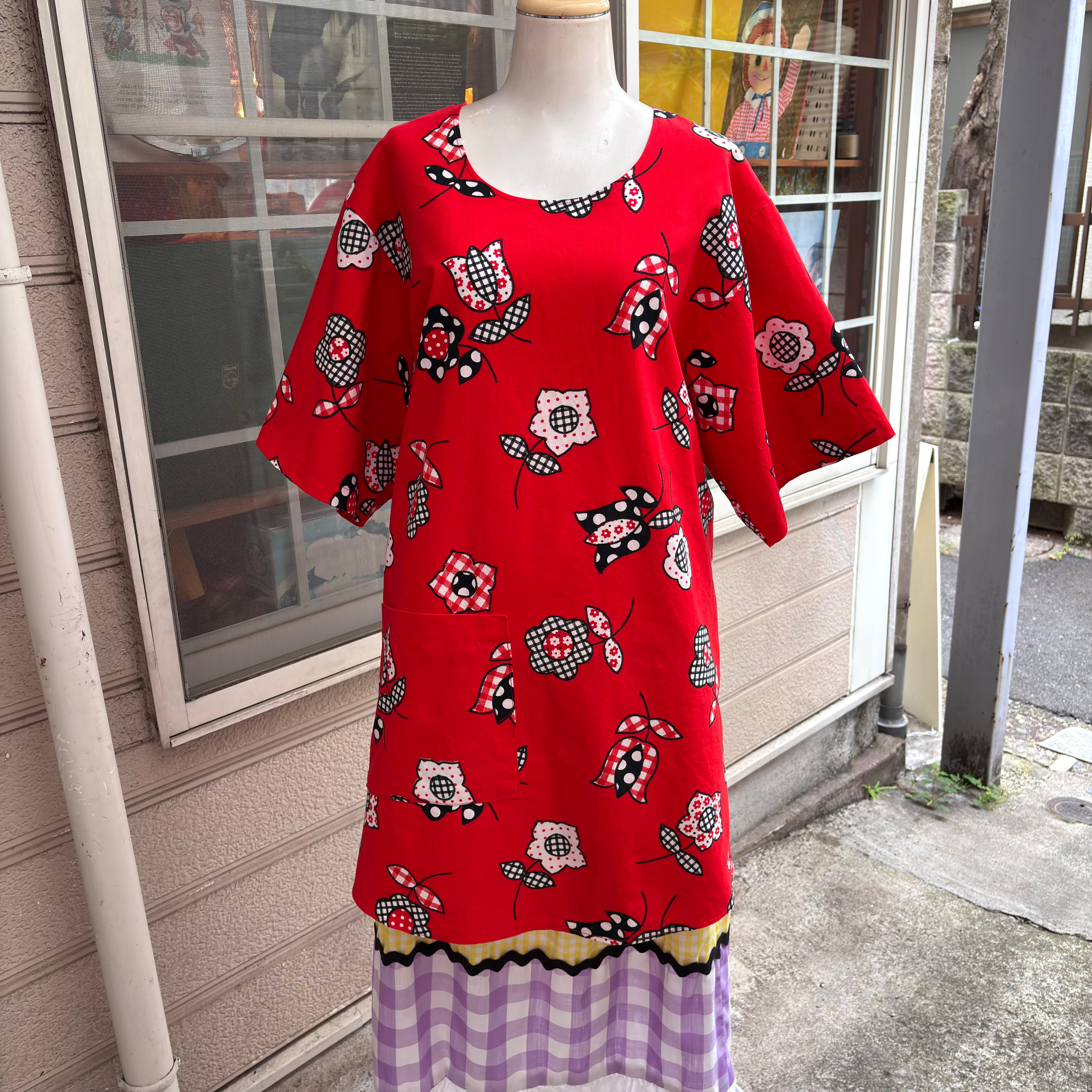 しっかりとしたコットン素材の生地で、レッドベースにギンガムチェックやドットのレトロポップなフラワー柄がとっても可愛い1着です。