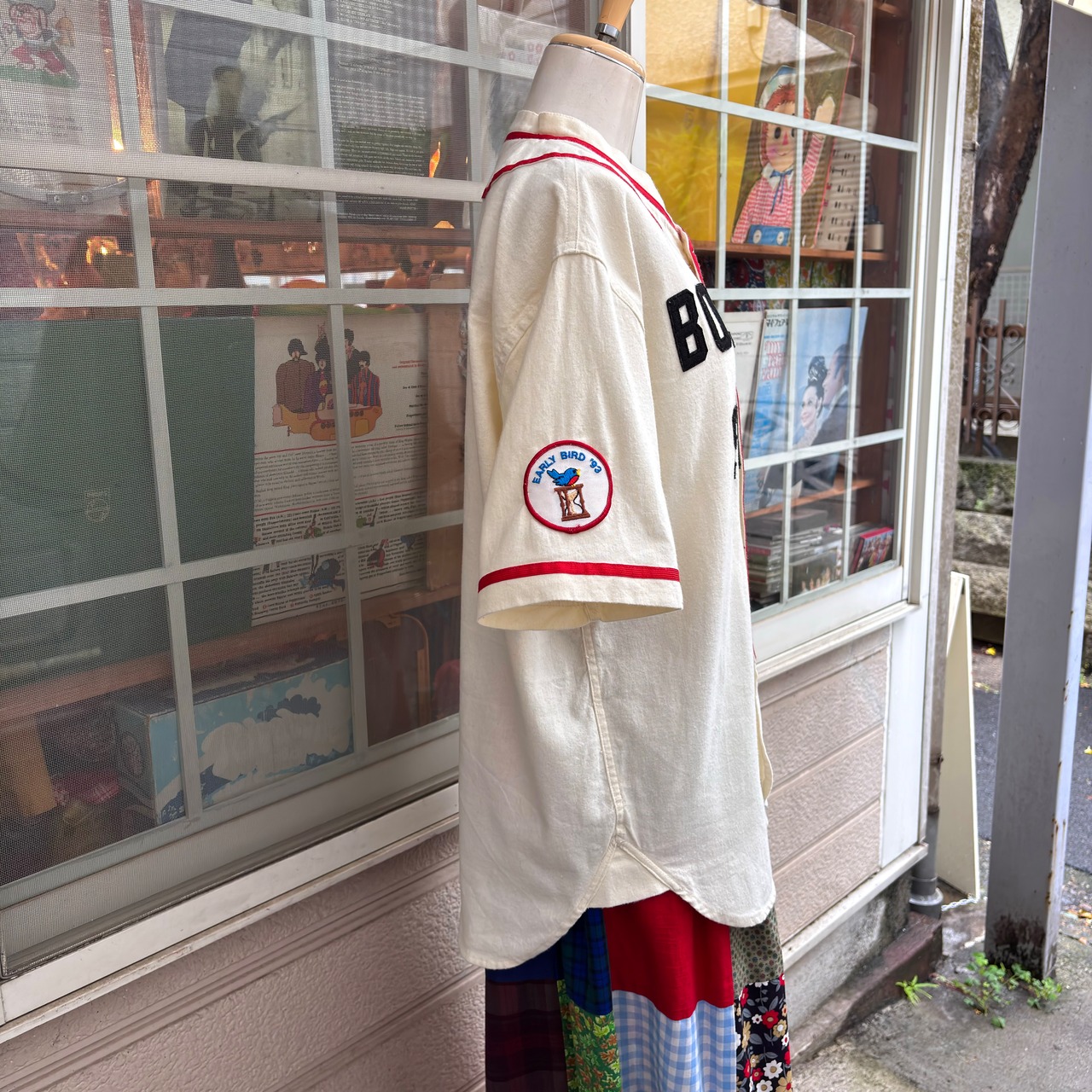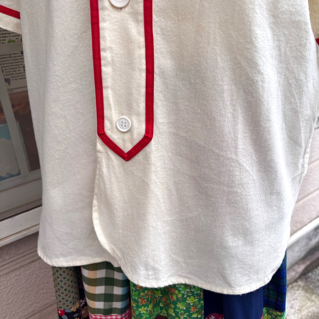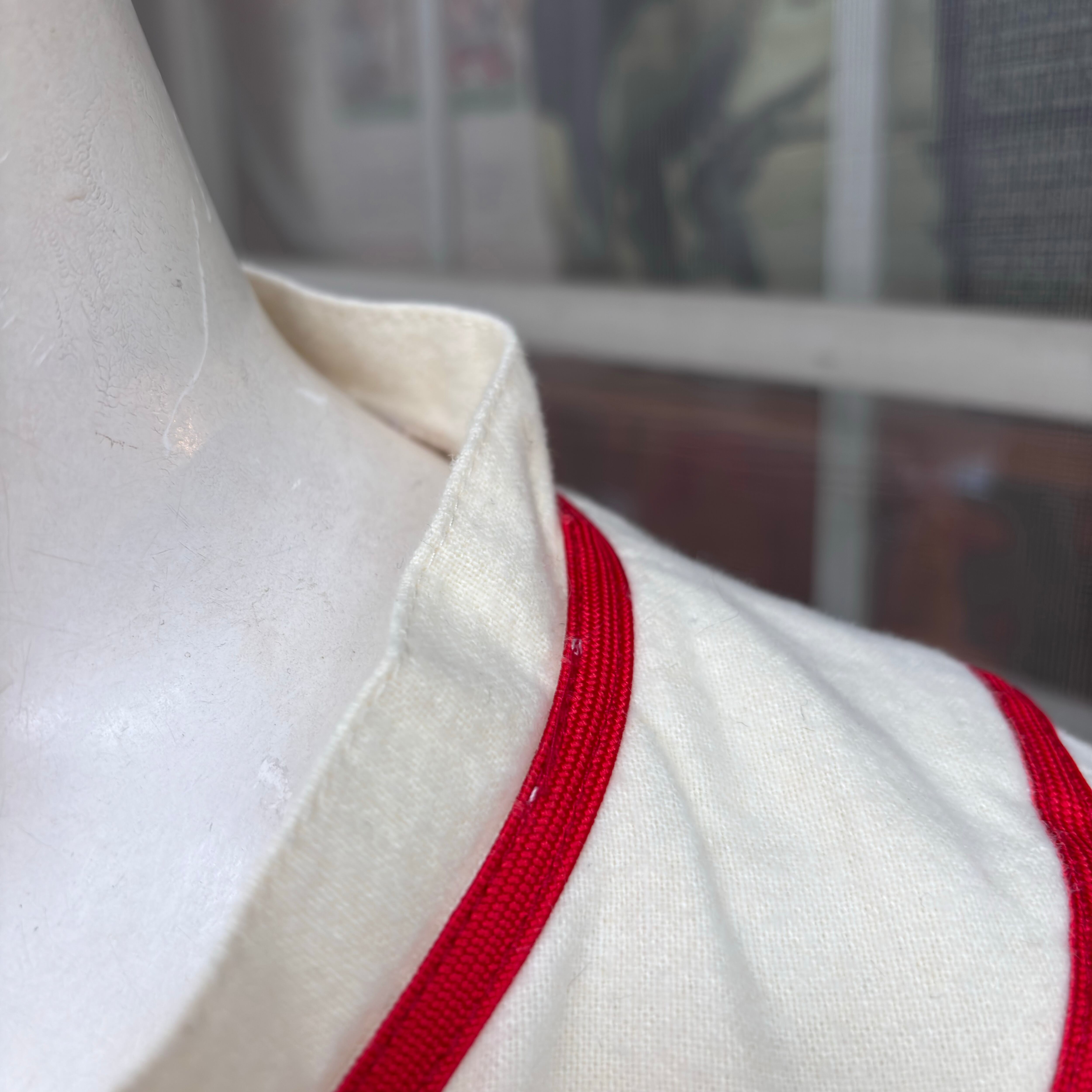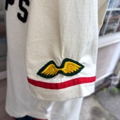 クリームカラーのライトなフランネル生地にチーム名のフェルトパッチやレッドのパイピングラインがとっても可愛い1着です。
