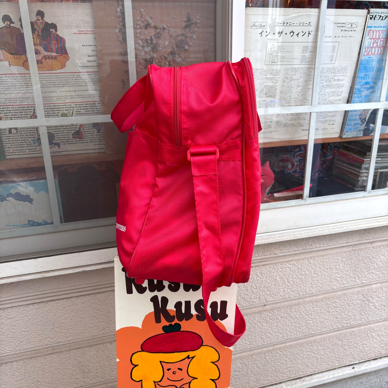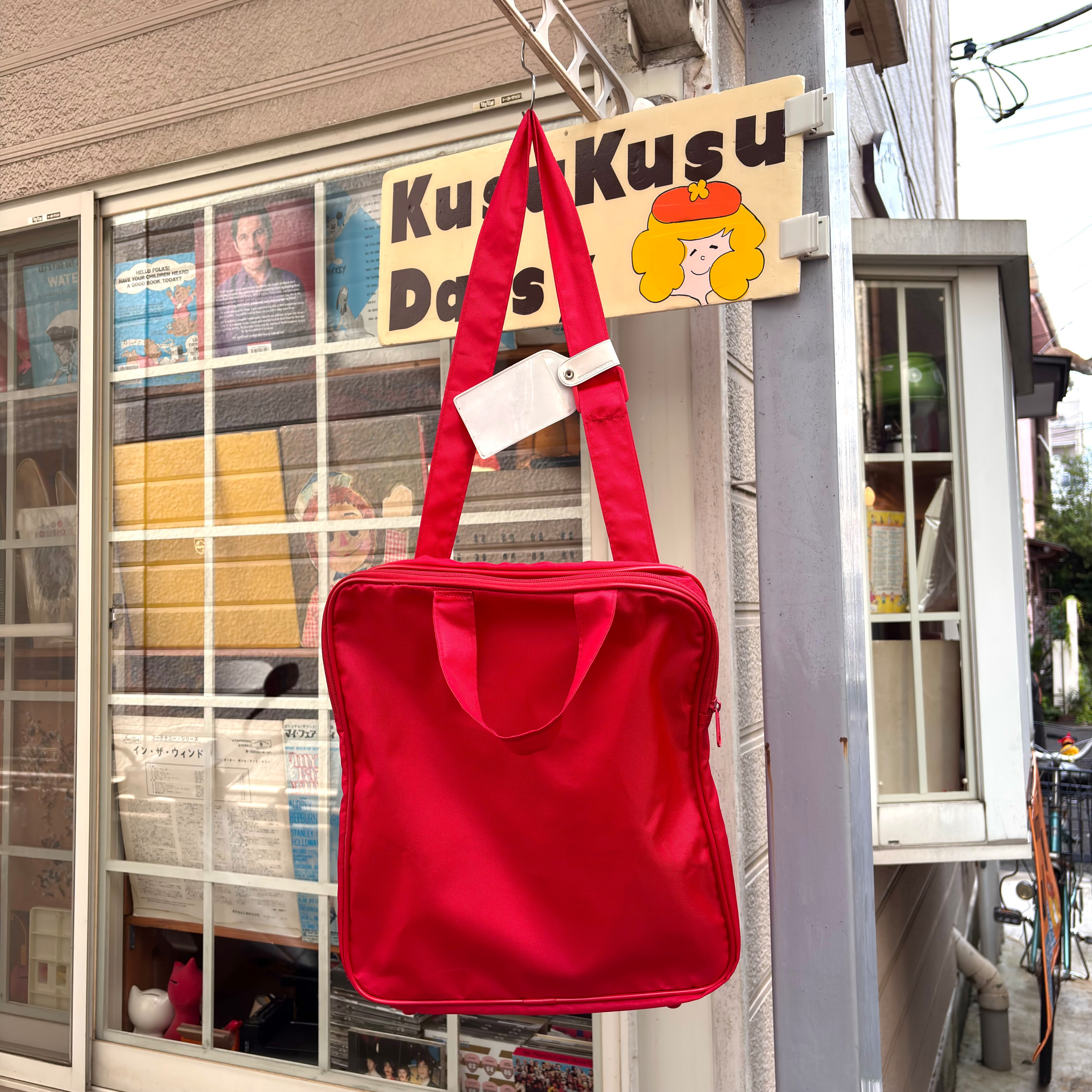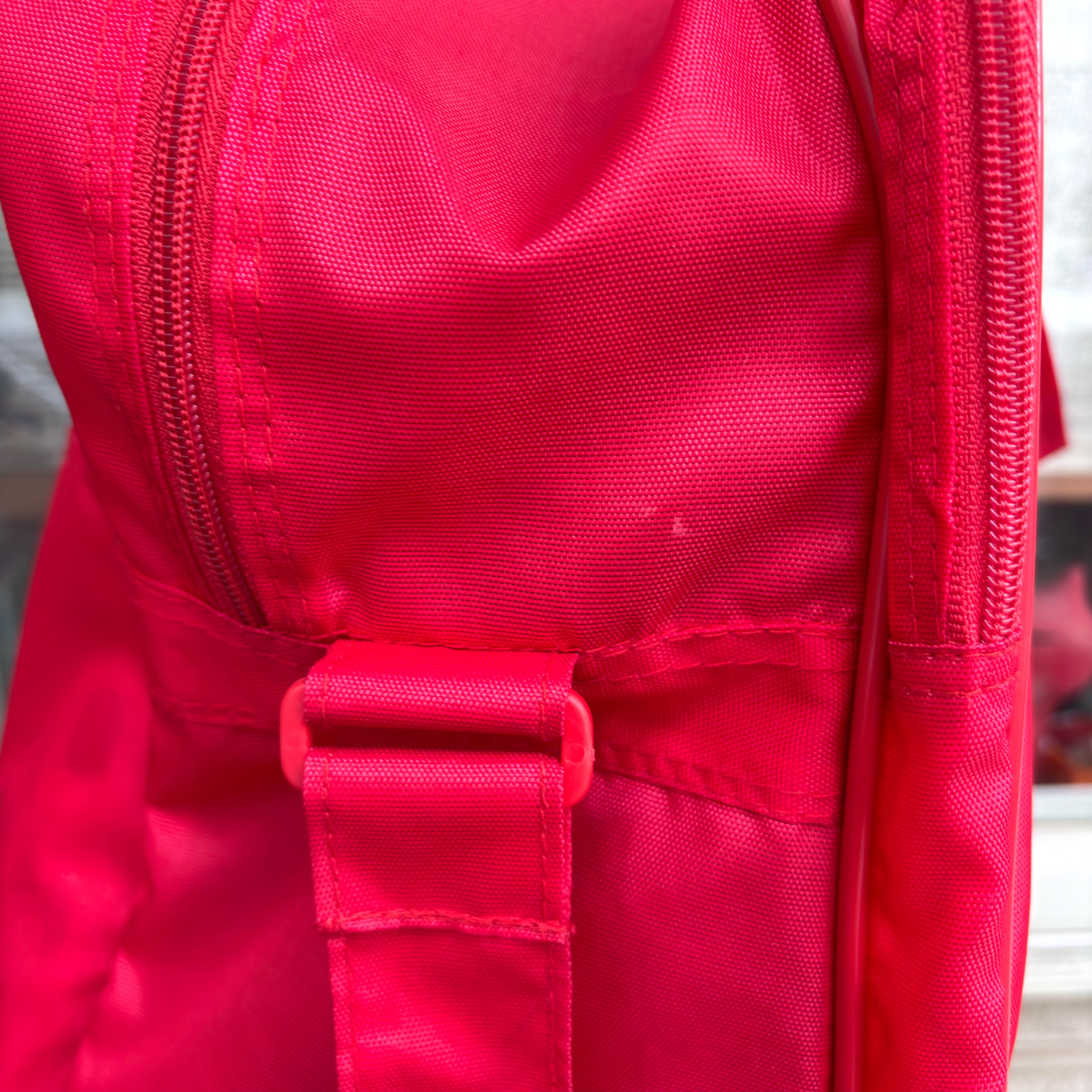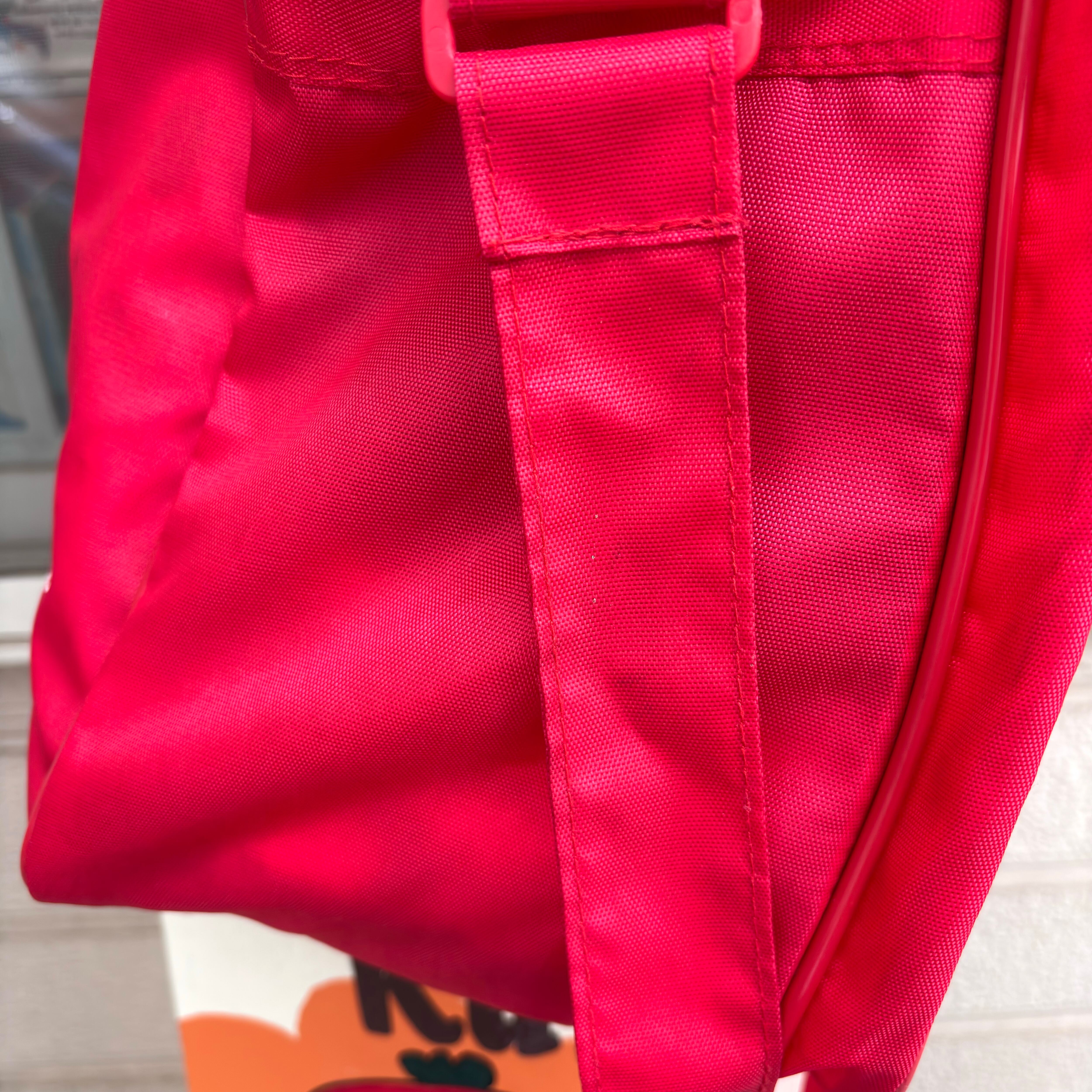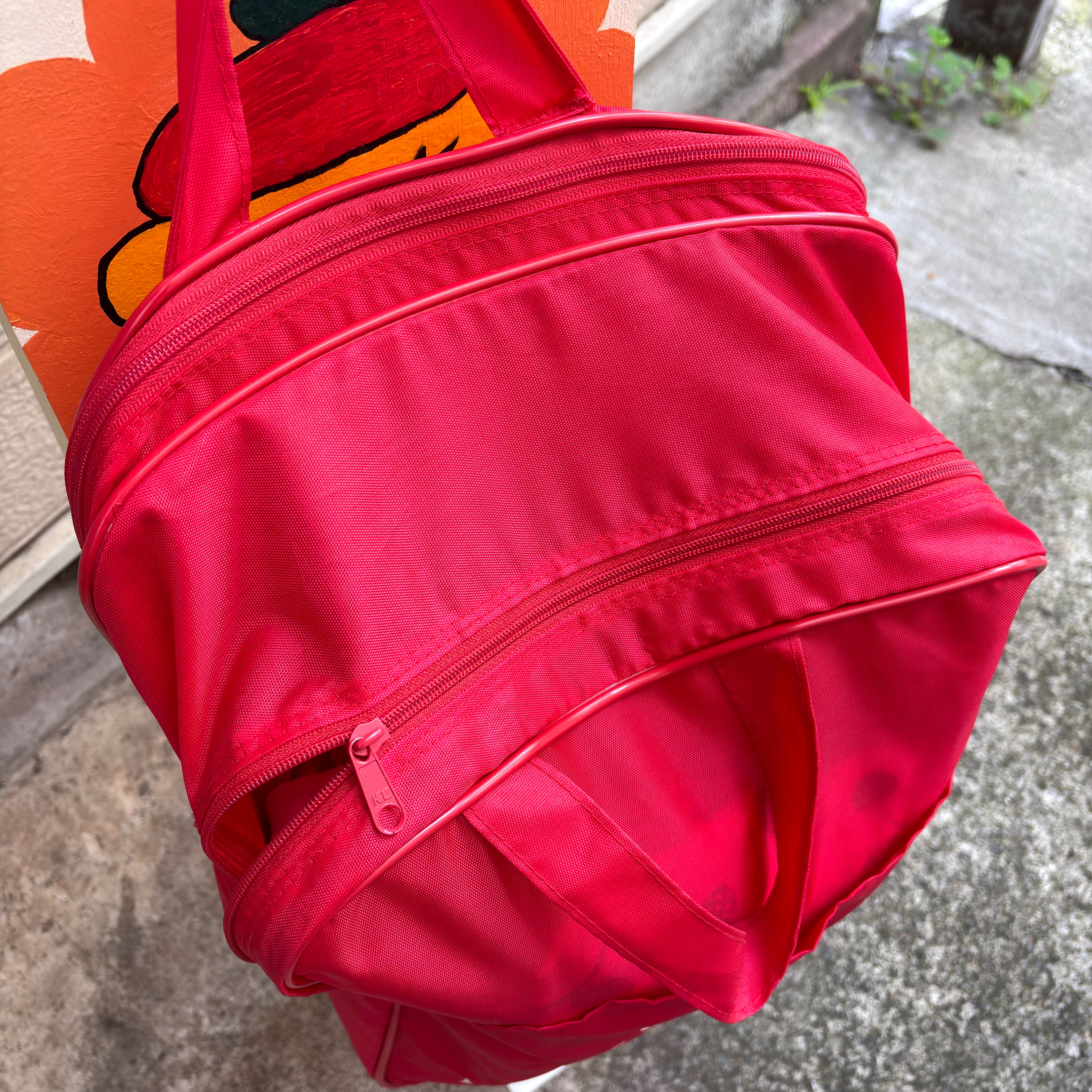 ヴィンテージ ならではな雰囲気のレッドカラーのナイロン素材のボディーにホワイトのロゴや英字のラバープリントがとっても可愛いアイテムです。