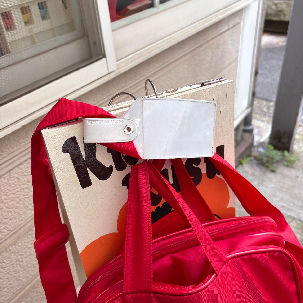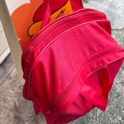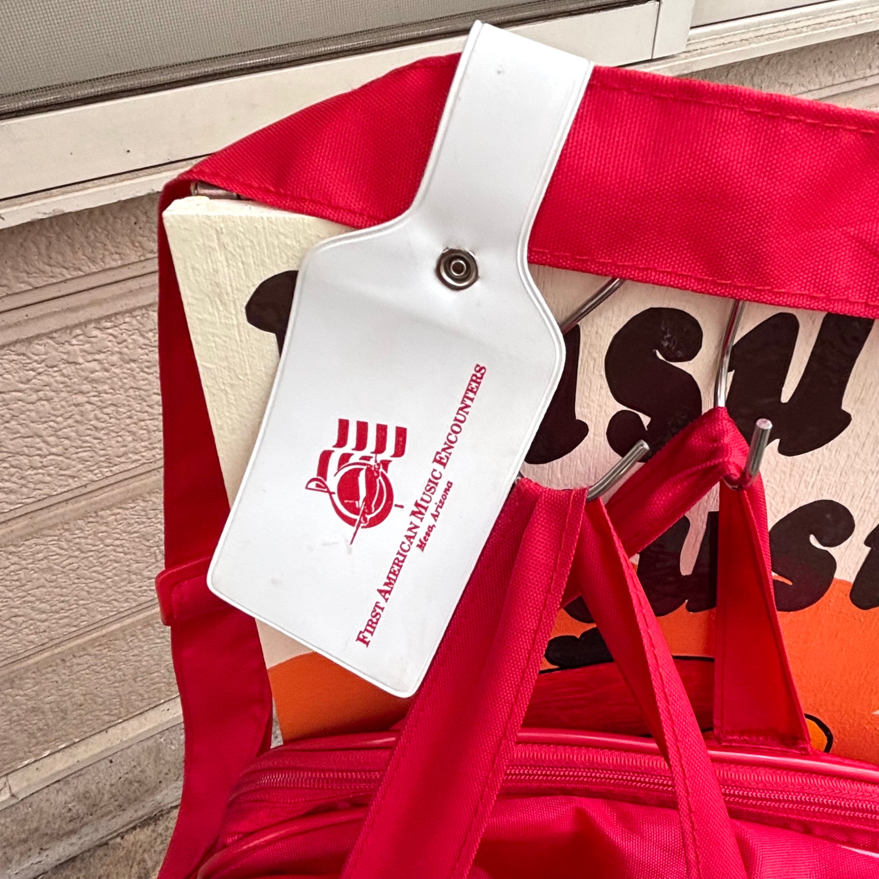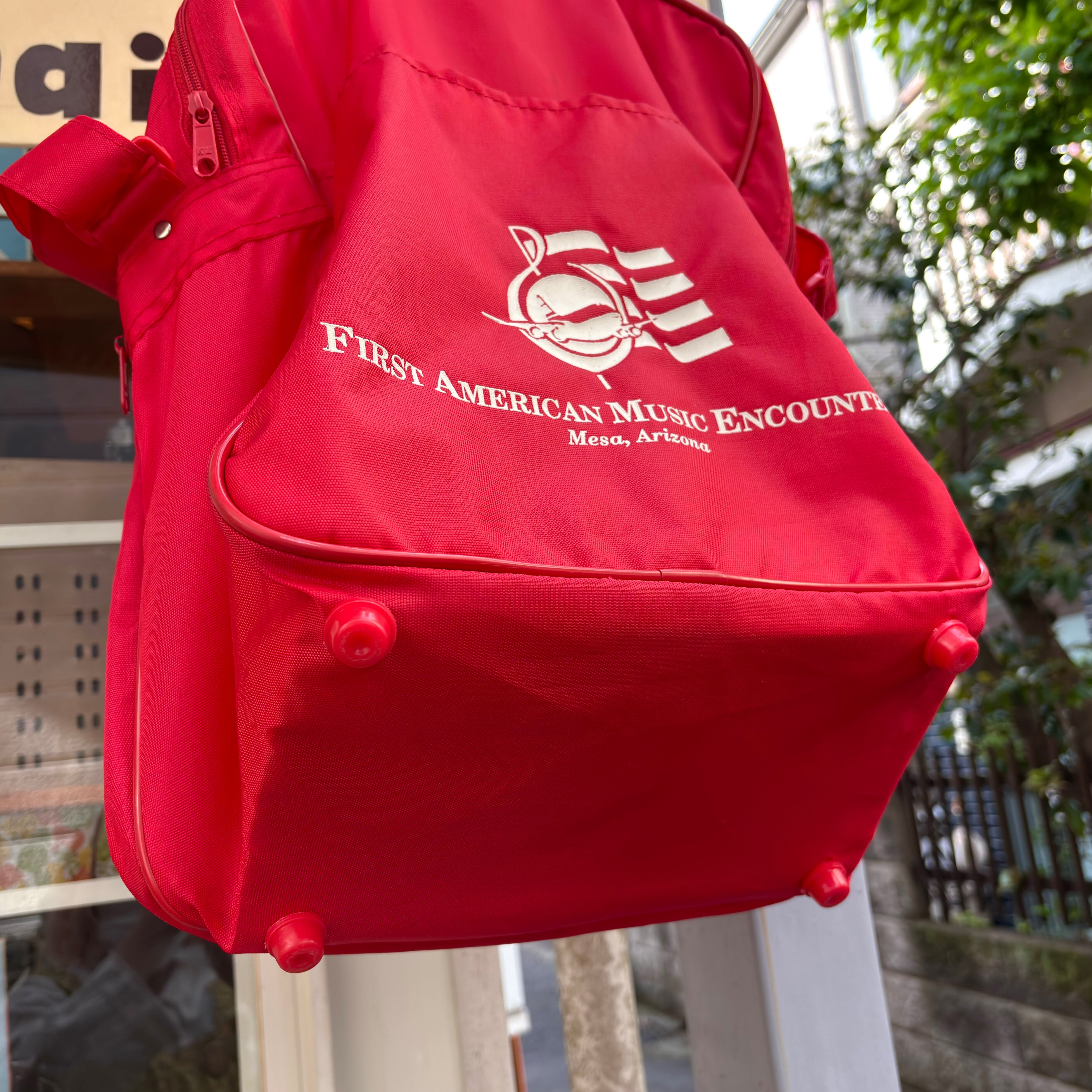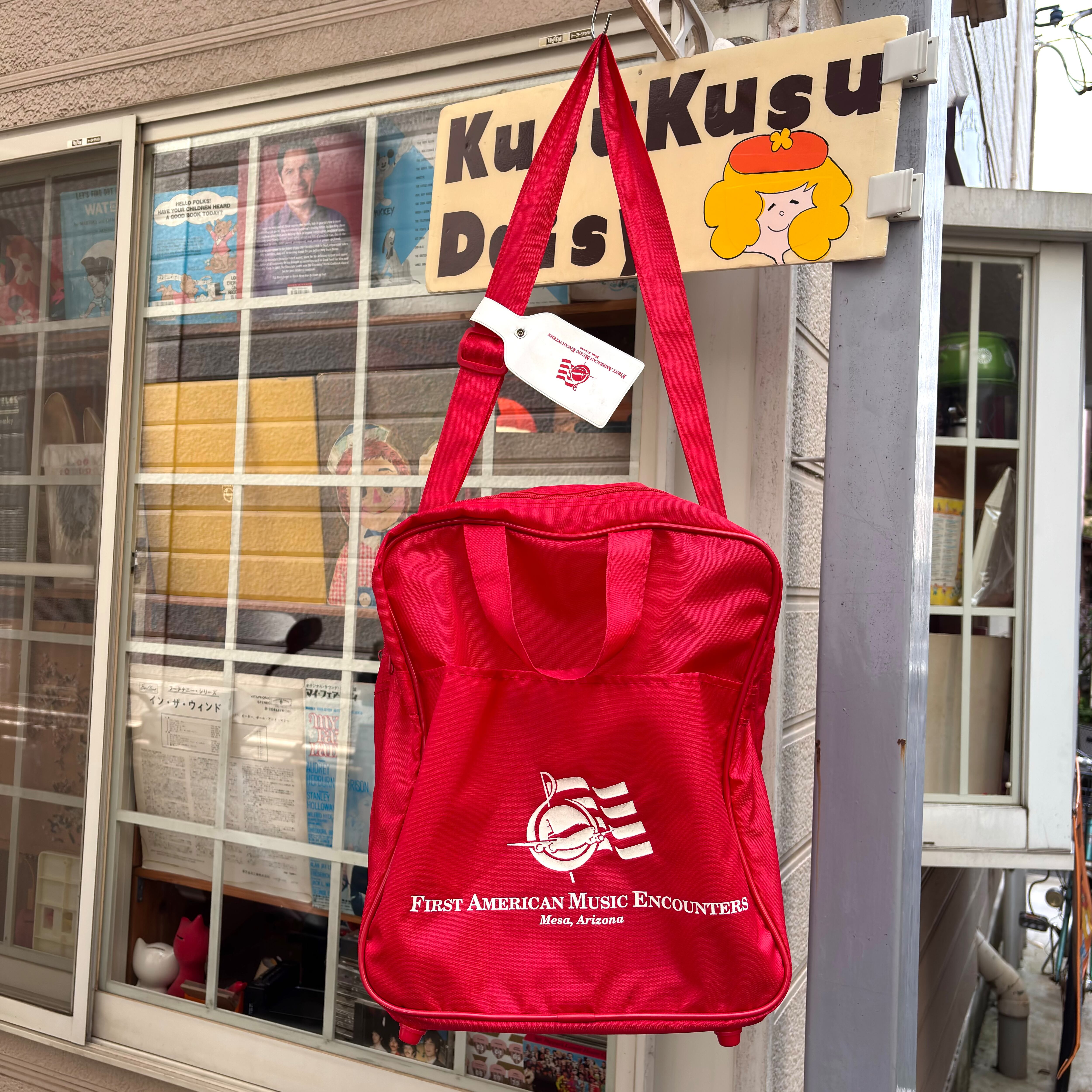 ヴィンテージ ならではな雰囲気のレッドカラーのナイロン素材のボディーにホワイトのロゴや英字のラバープリントがとっても可愛いアイテムです。