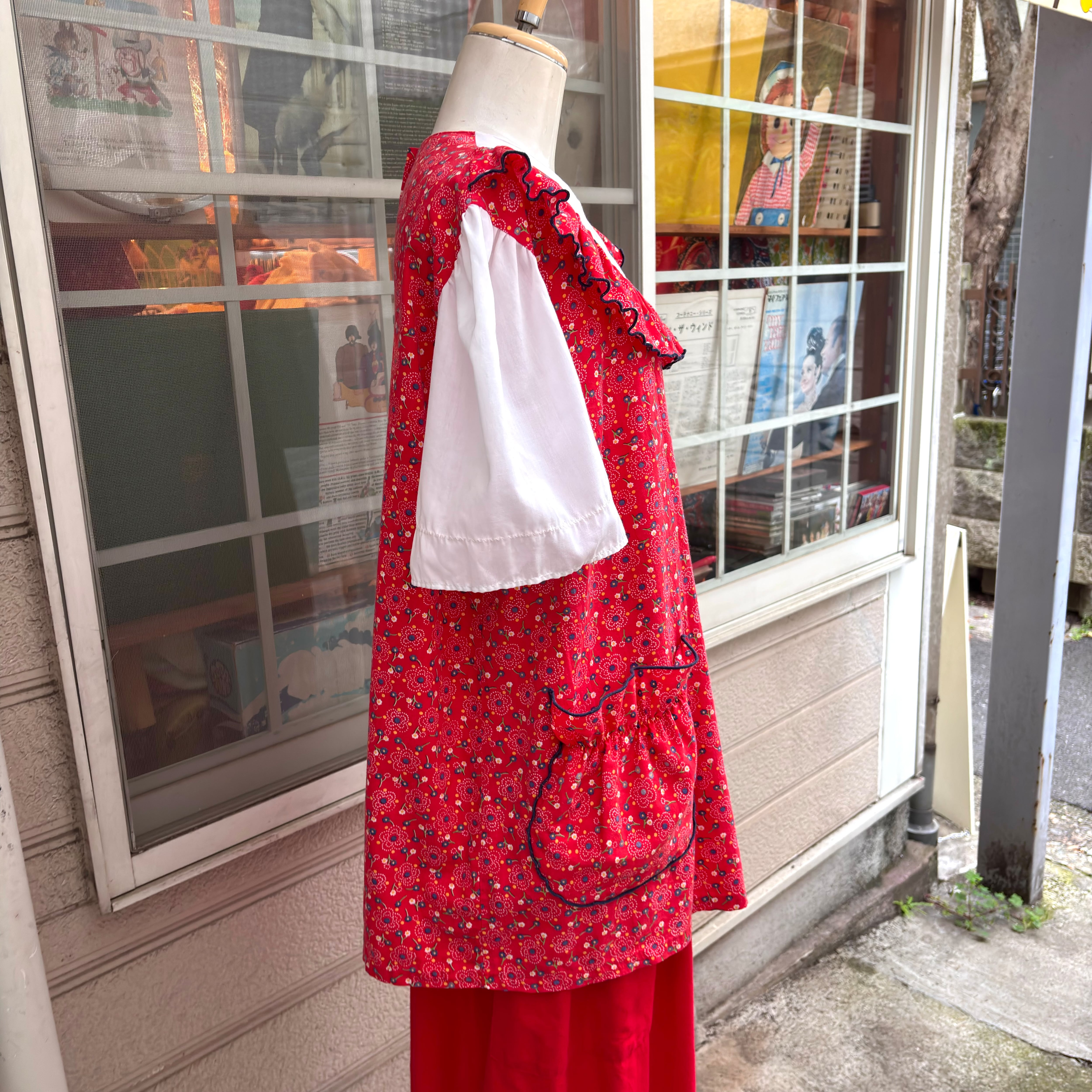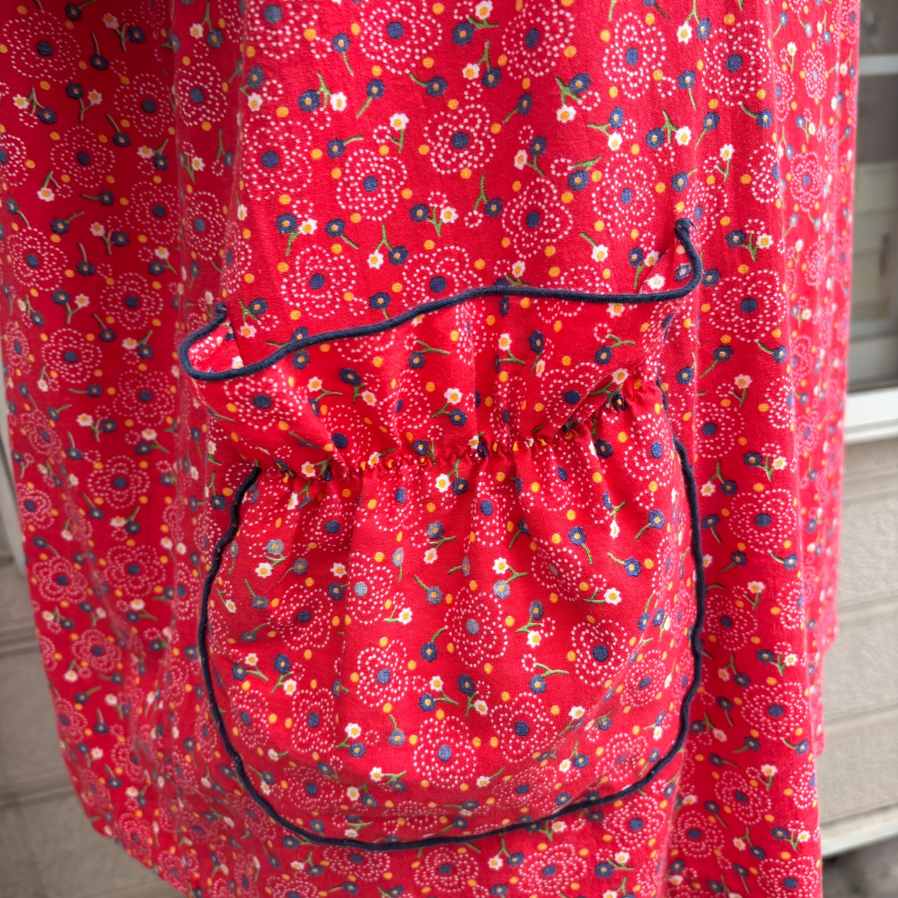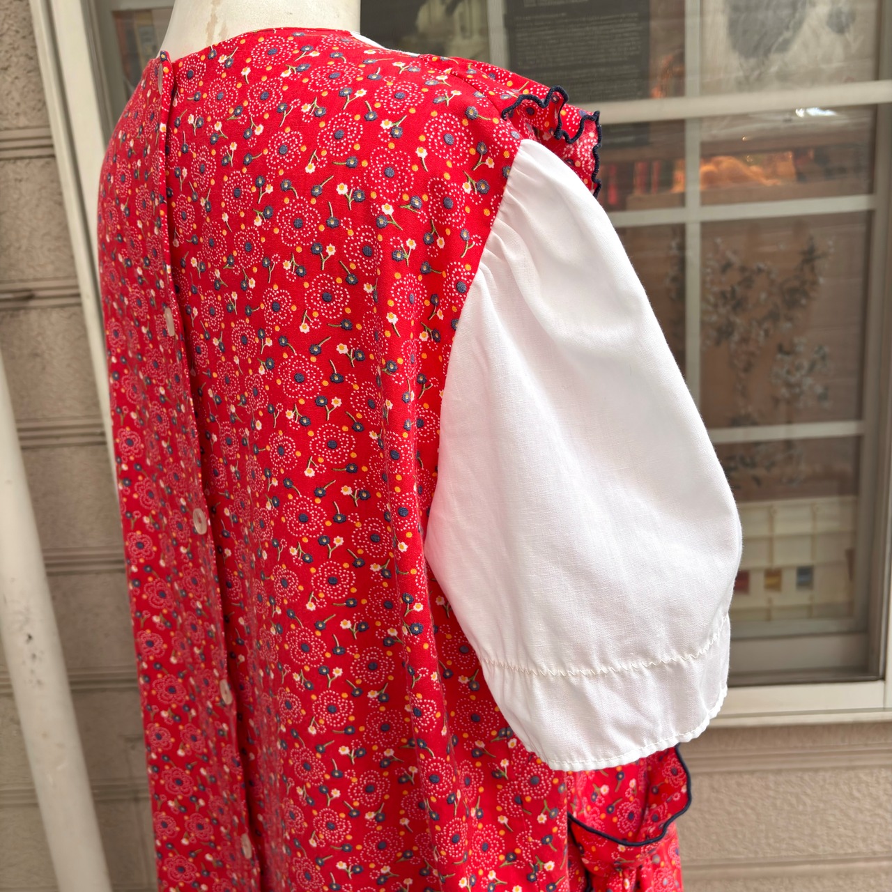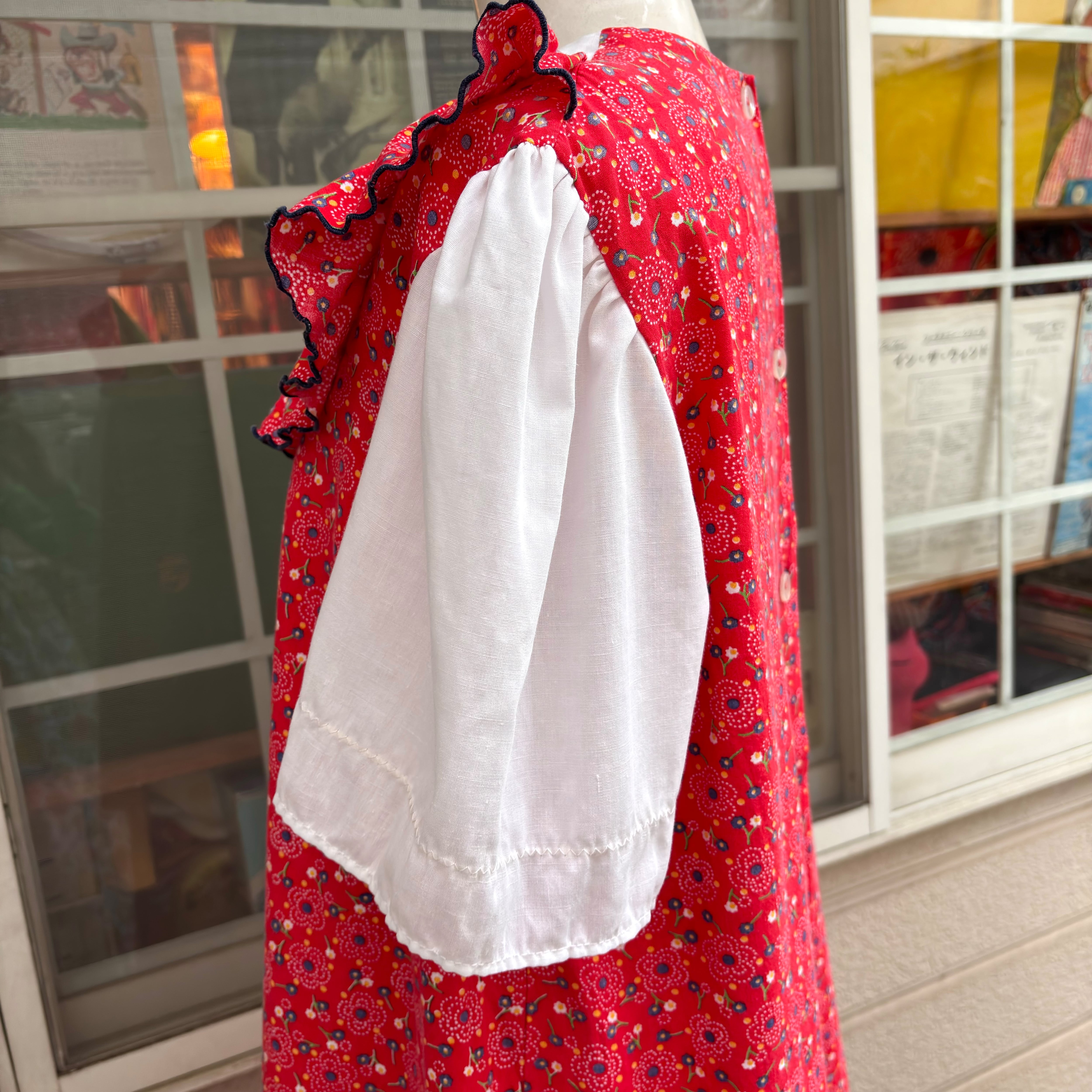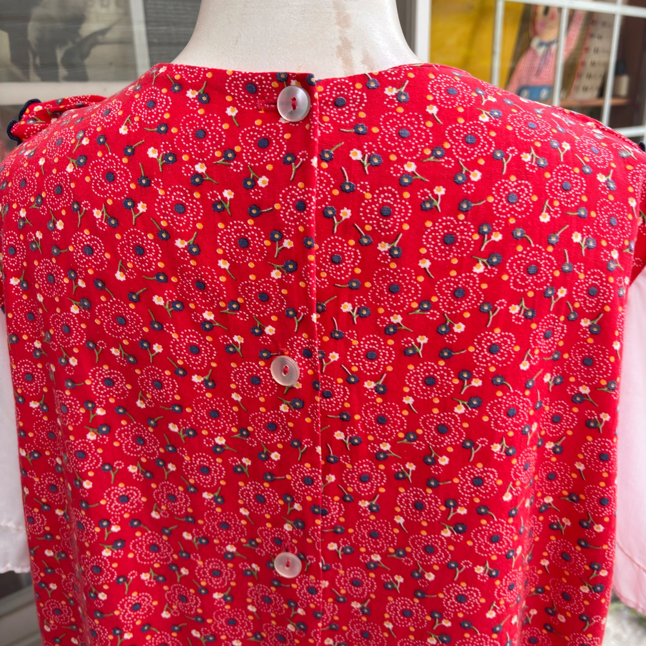レッドベースにピンドットが連なったフラワー柄やポップな小花柄、ホワイトのコットン生地のレイヤードスタイルのような切り替えのデザインがとっても可愛い1着です。