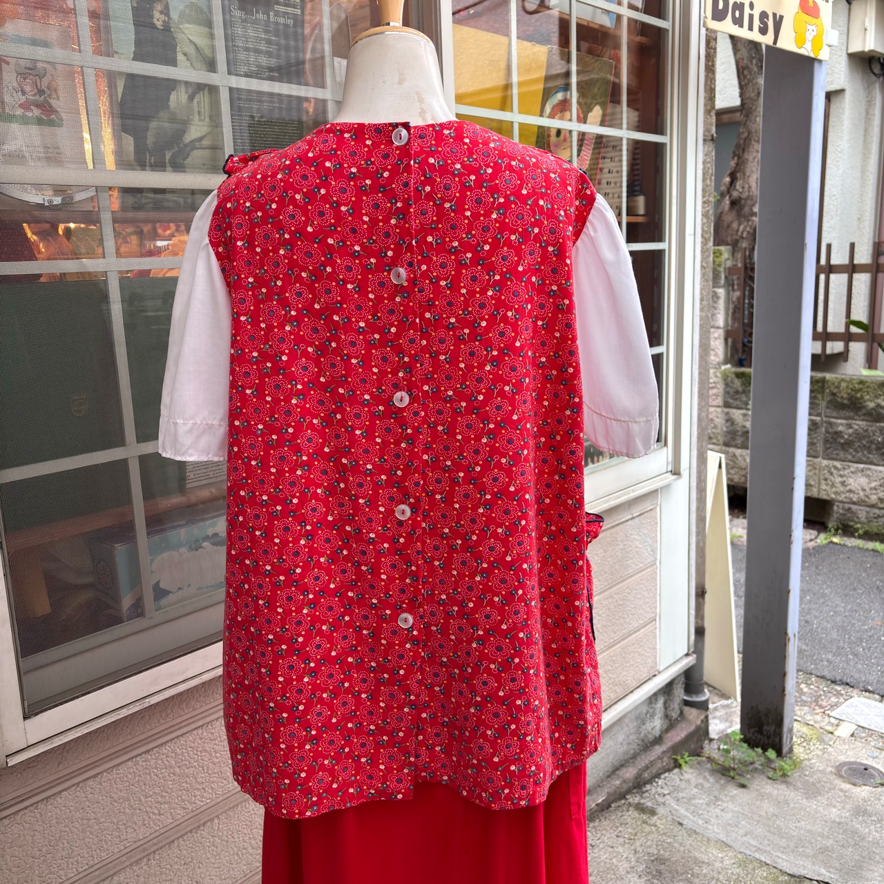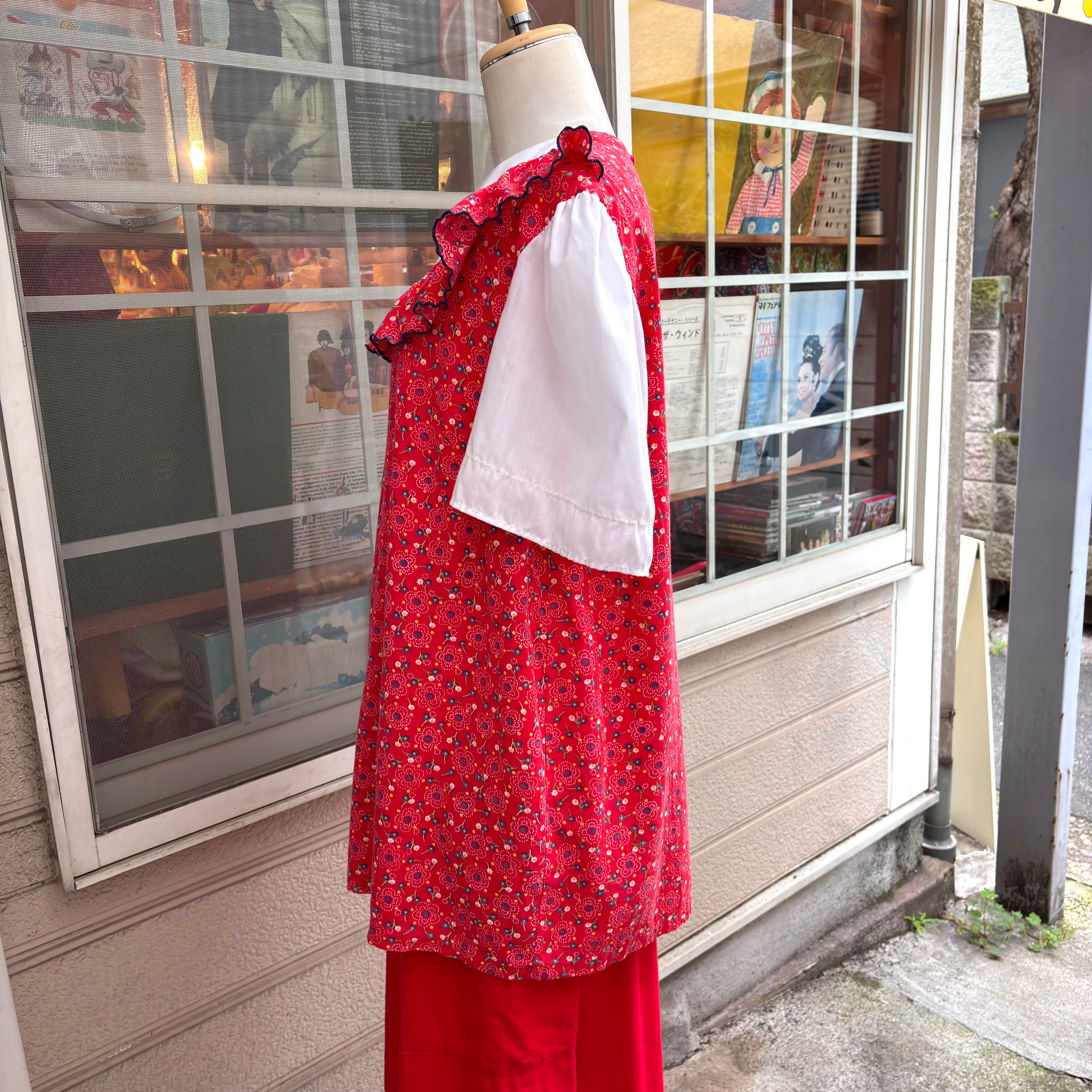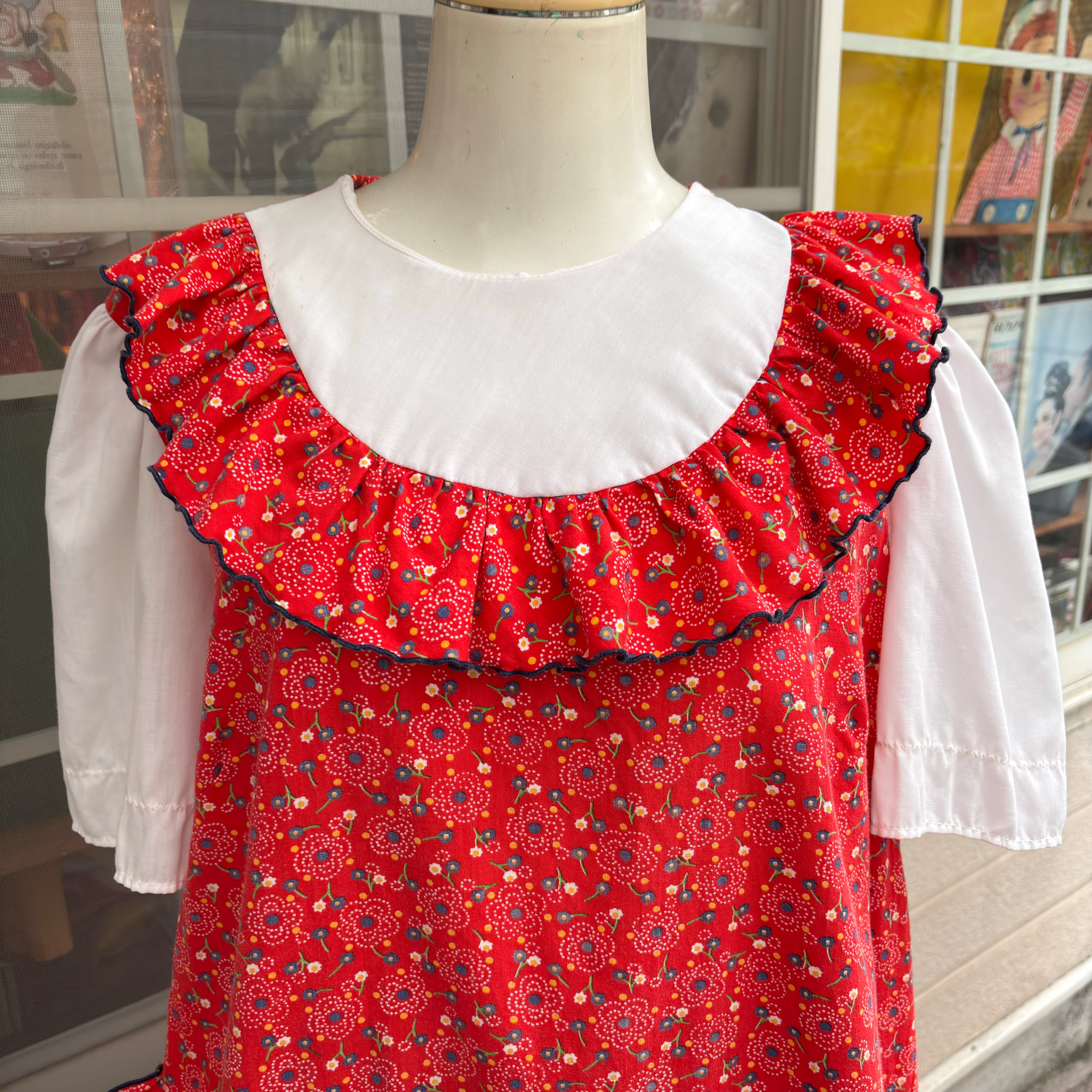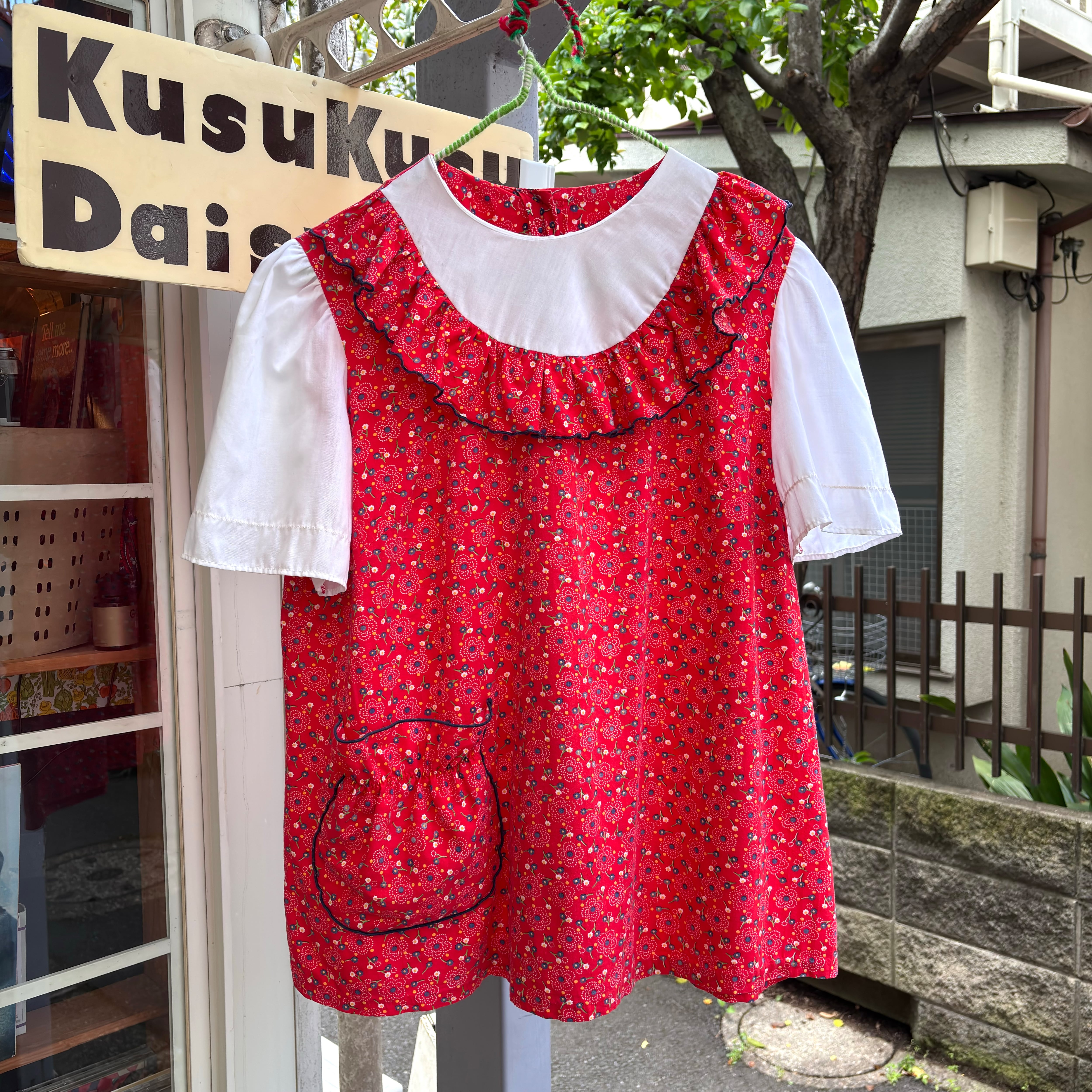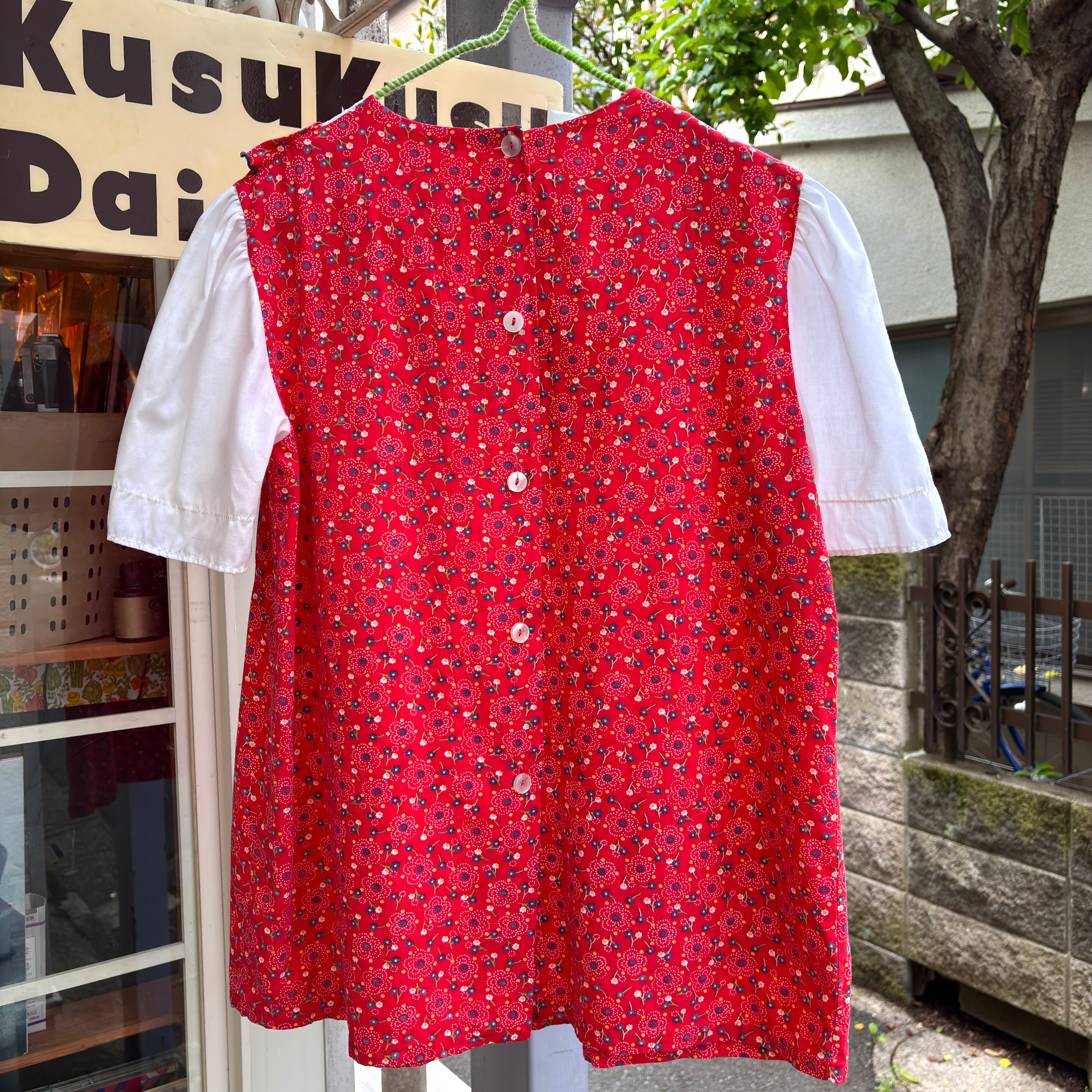 レッドベースにピンドットが連なったフラワー柄やポップな小花柄、ホワイトのコットン生地のレイヤードスタイルのような切り替えのデザインがとっても可愛い1着です。