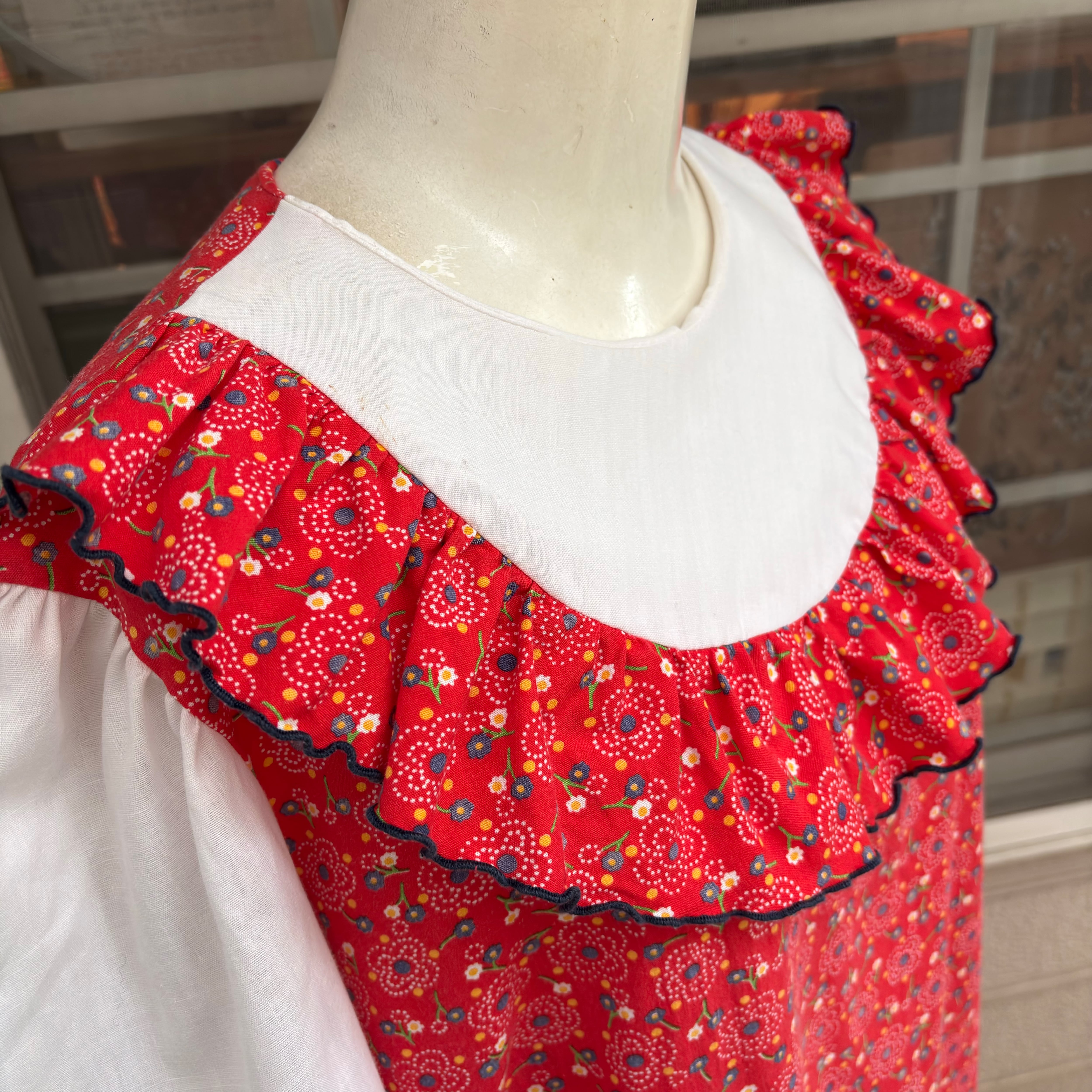 70年代 ヴィンテージ 当時のハンドメイド1点もの フラワー柄 フリルライン バックボタン トップスです。