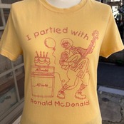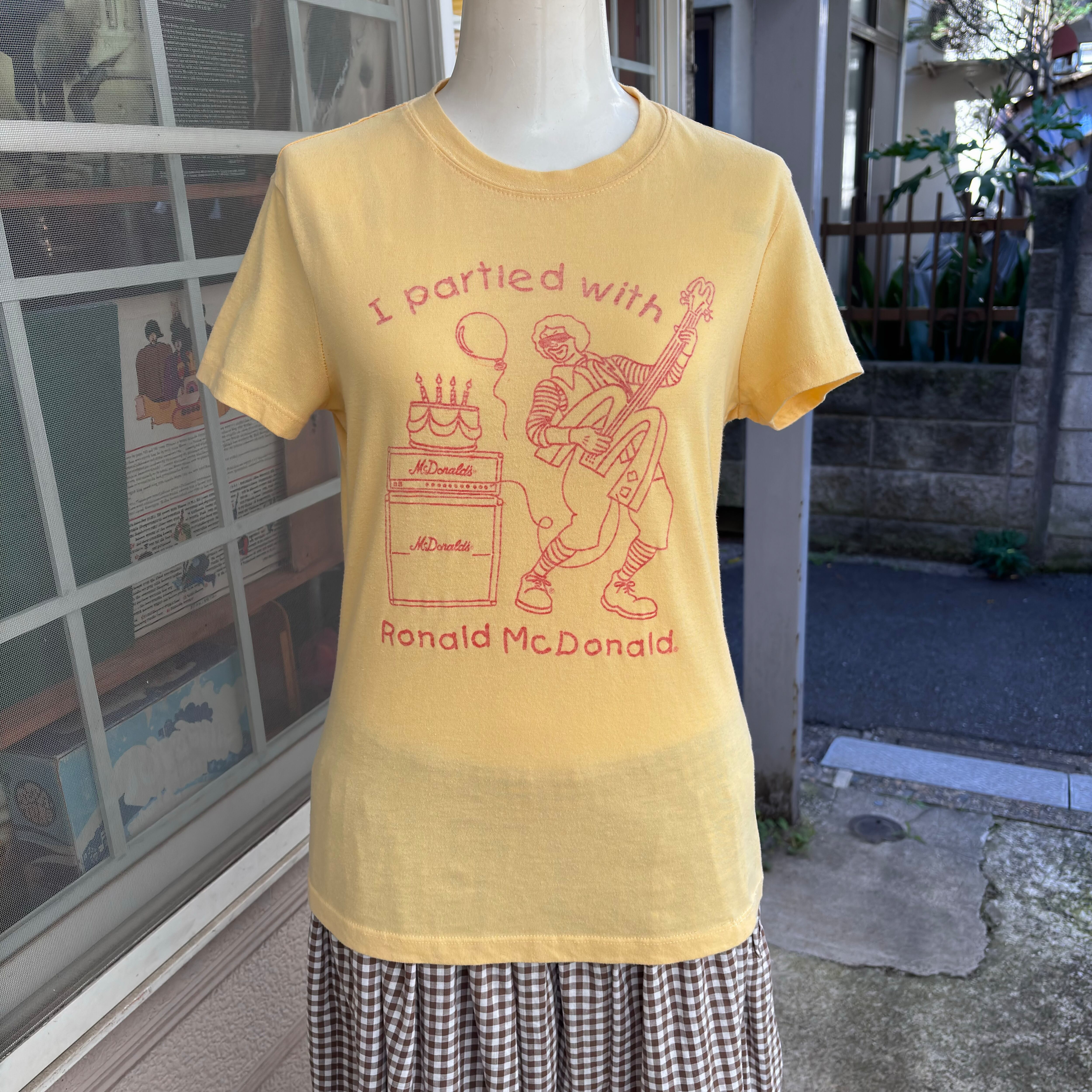 Mのフォルムが可愛いギターやアンプやスピーカーのMcDonaldsのロゴ、ケーキや風船、ノリノリのドナルドがヴィンテージ ならではなユーモアたっぷりの可愛いプリントです。