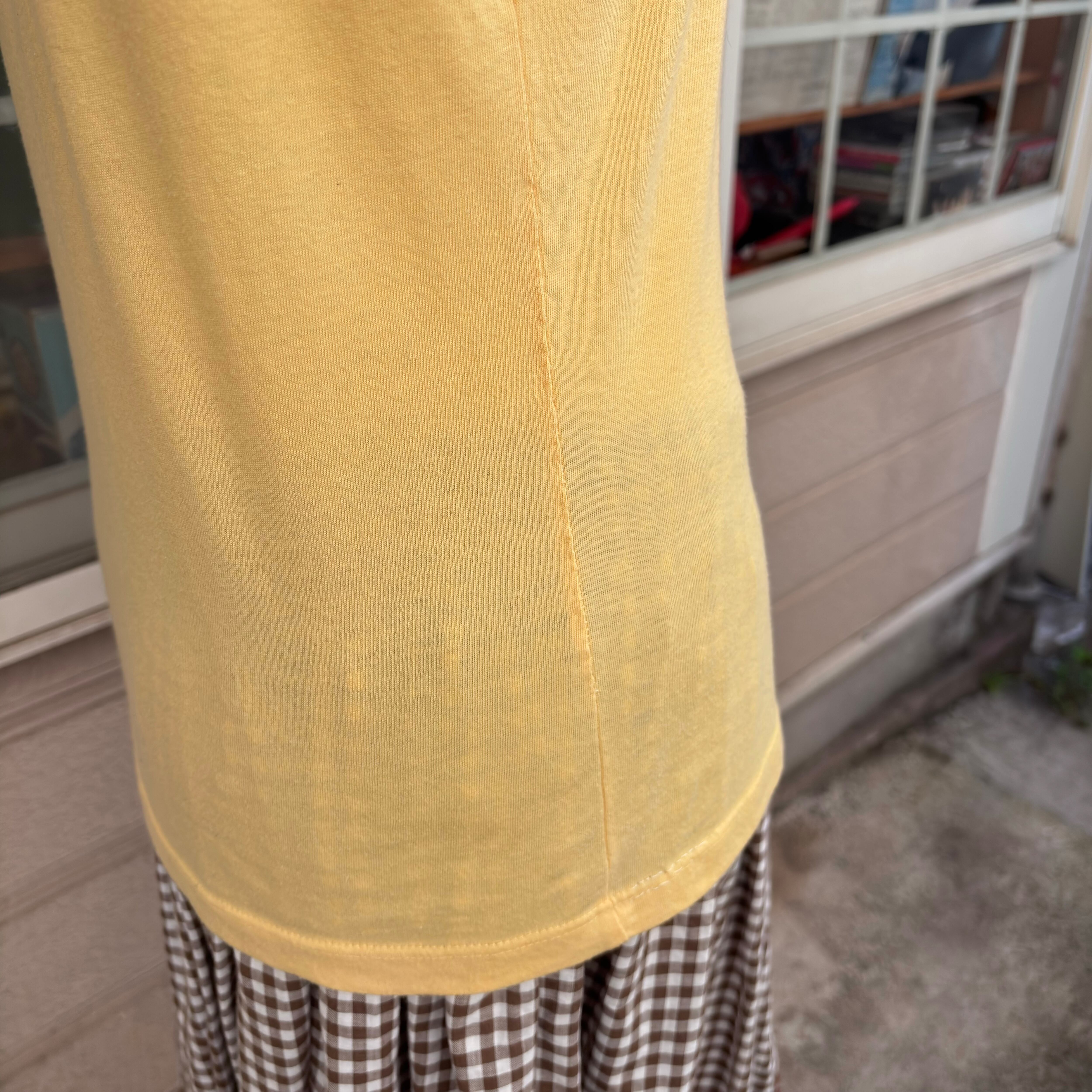全体的に色褪せ感や若干の毛羽立ち、プリントの散りによる僅かなシミ、両サイドと裾の縫い目にリペアがありますがヴィンテージのあじとして捉えて頂けたらと思います。