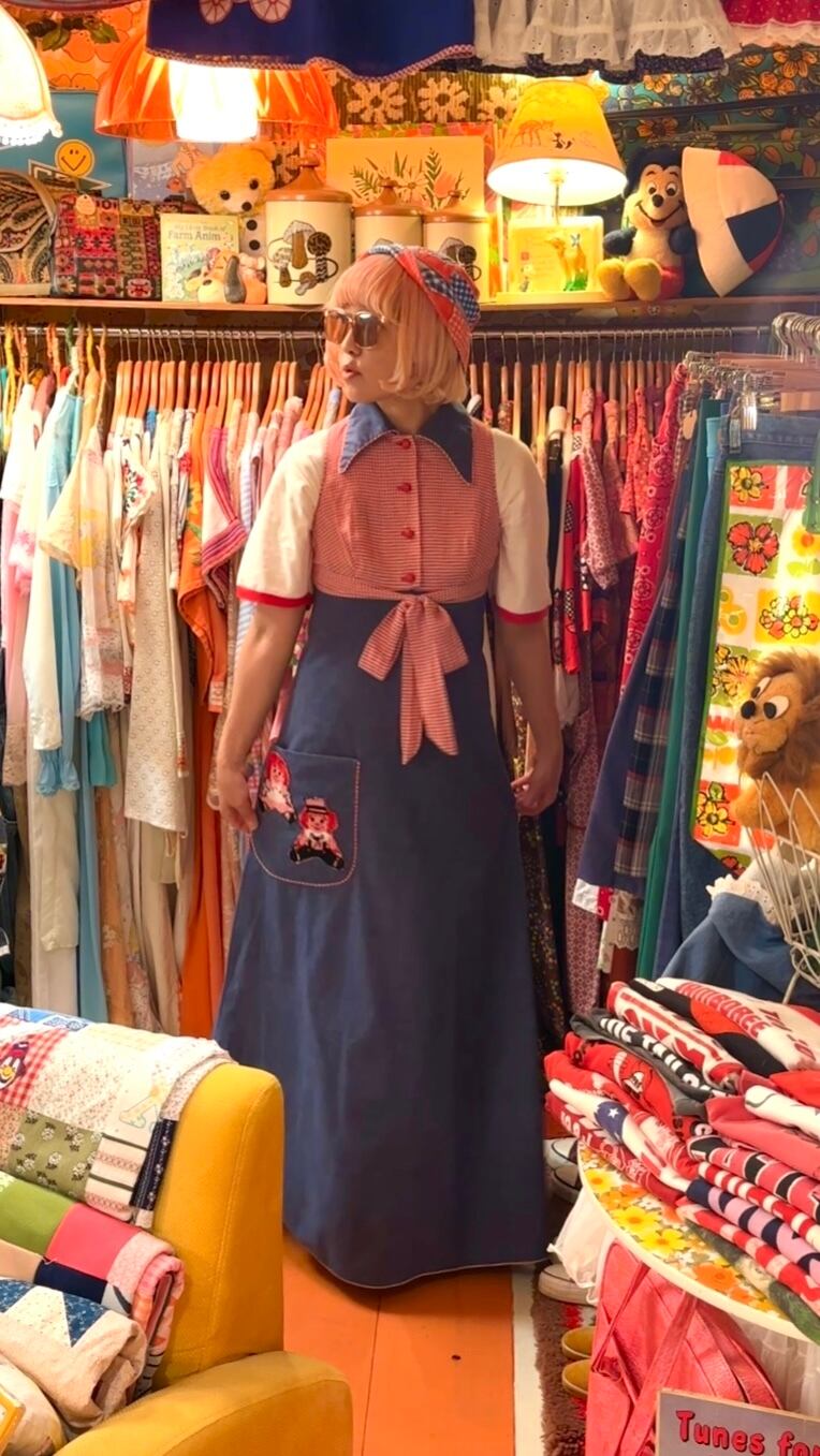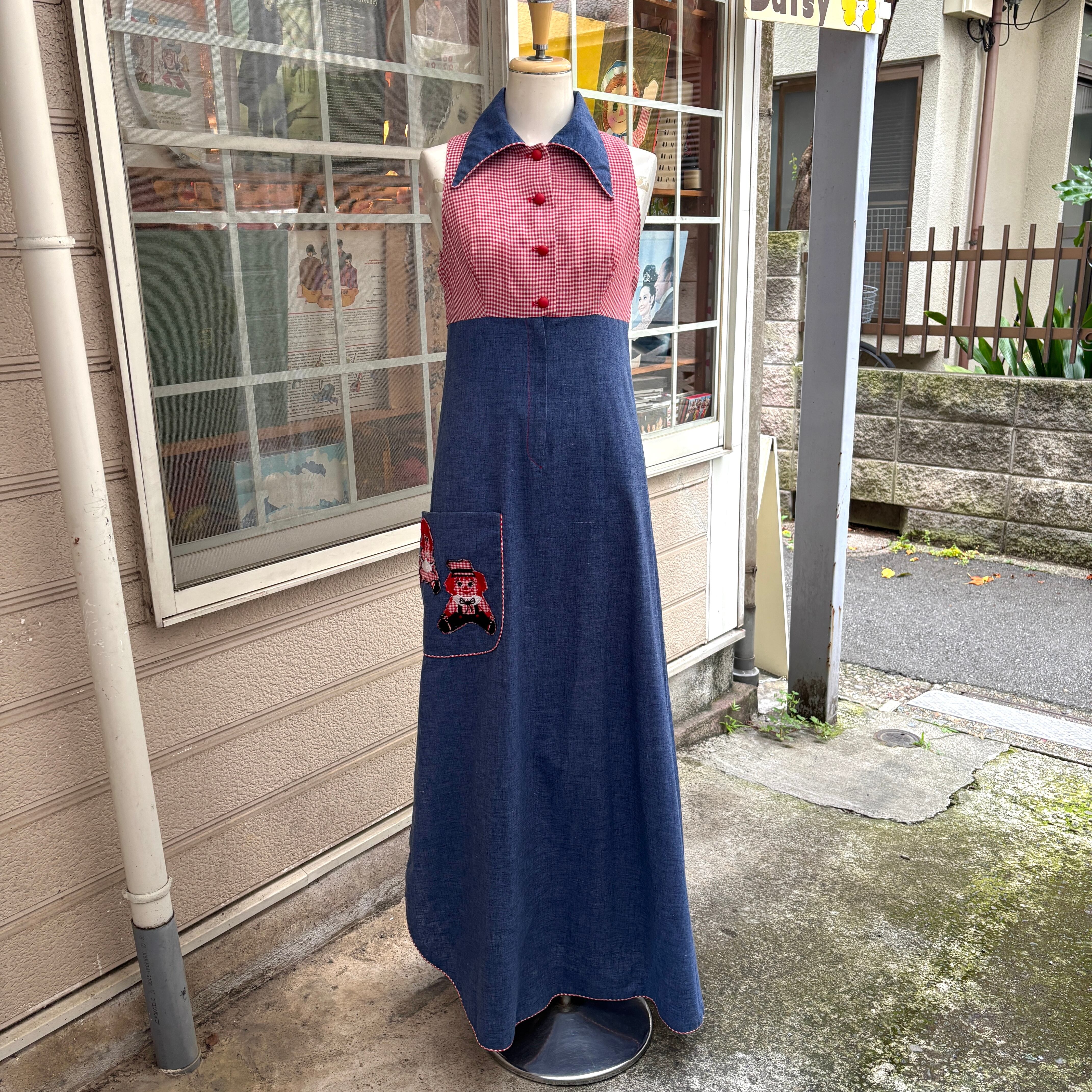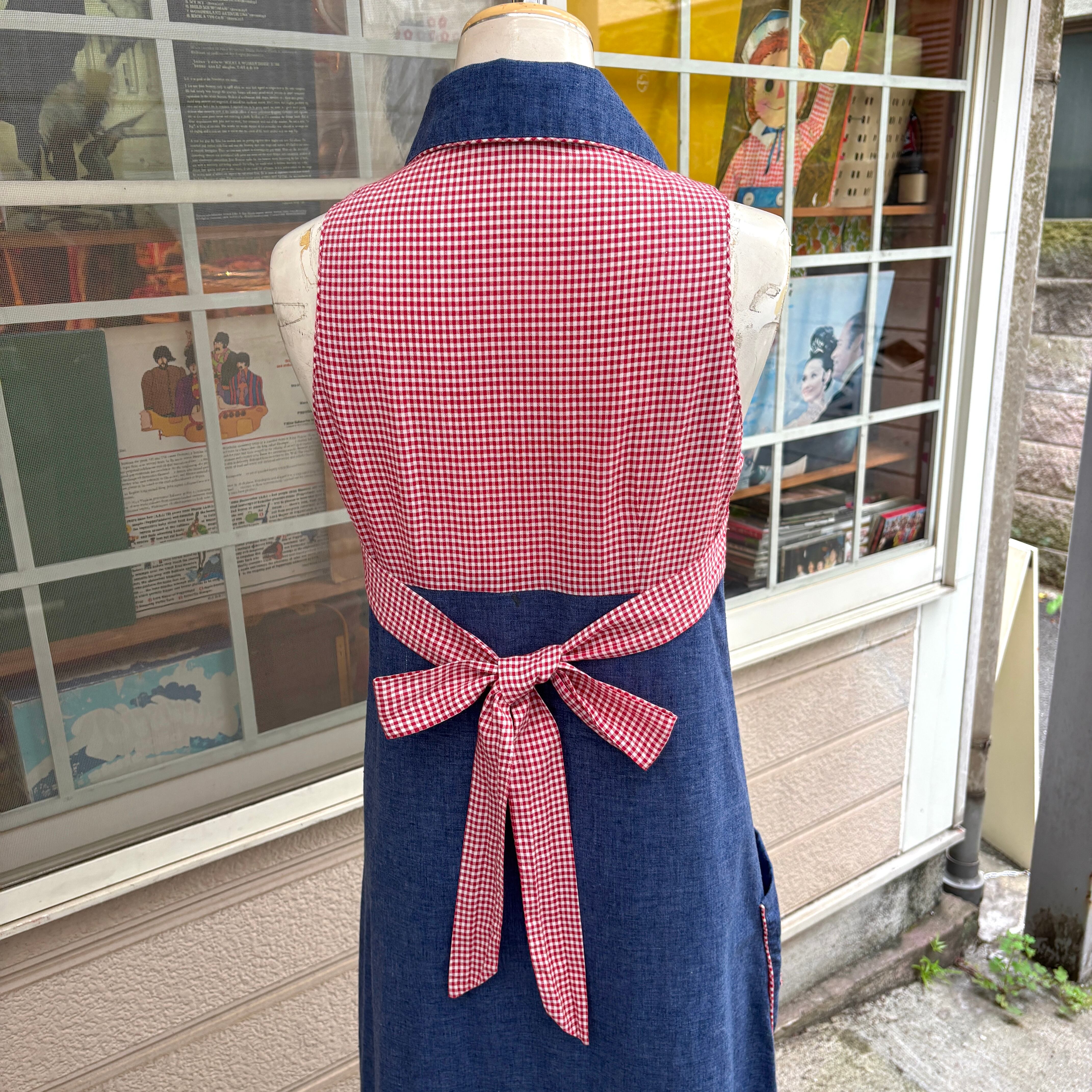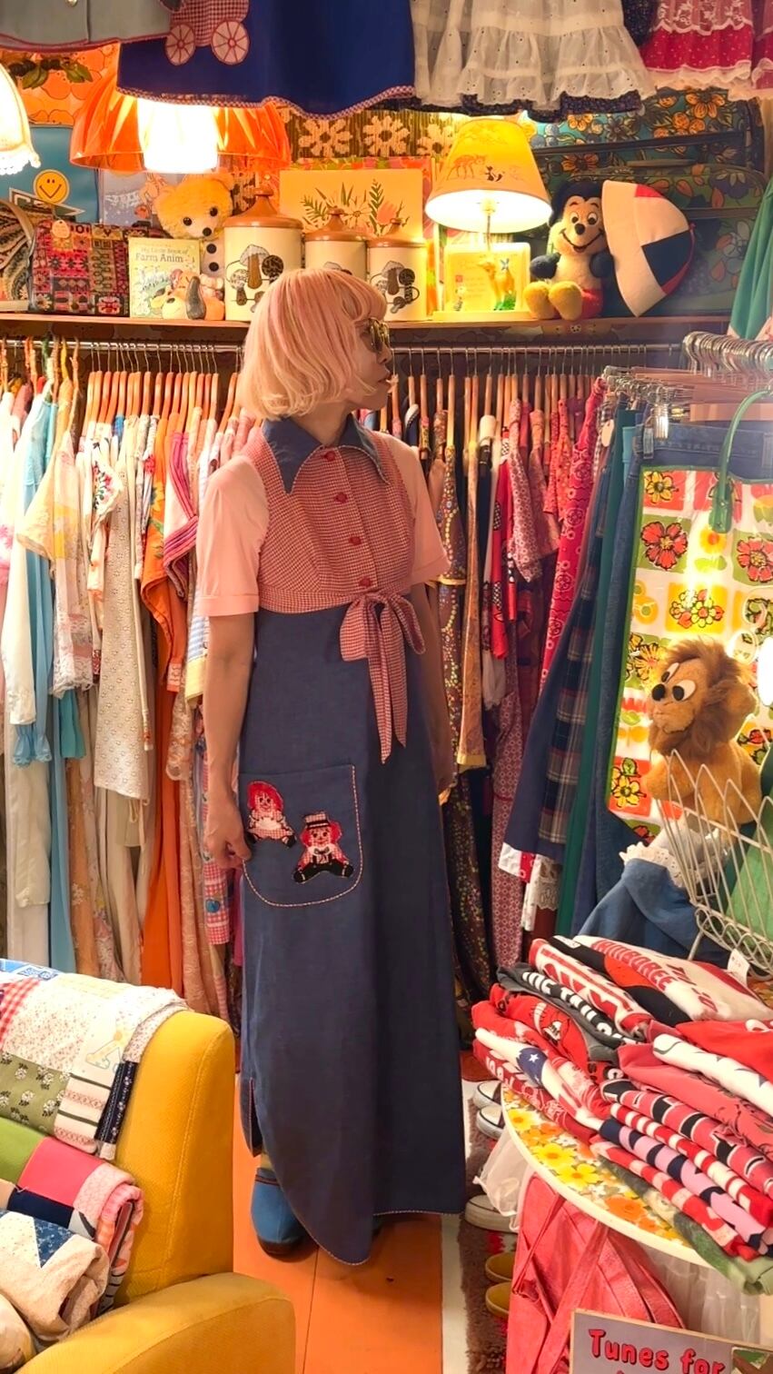 70年代らしい大きな襟やライトデニムとレッドのギンガムチェックの組み合わせ、アンとアンディのワッペン付きのポケットがとっても可愛い1着です。