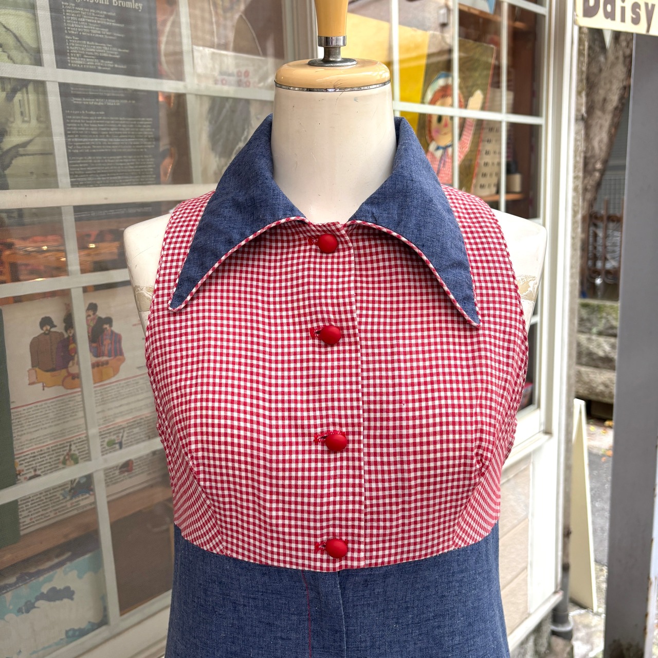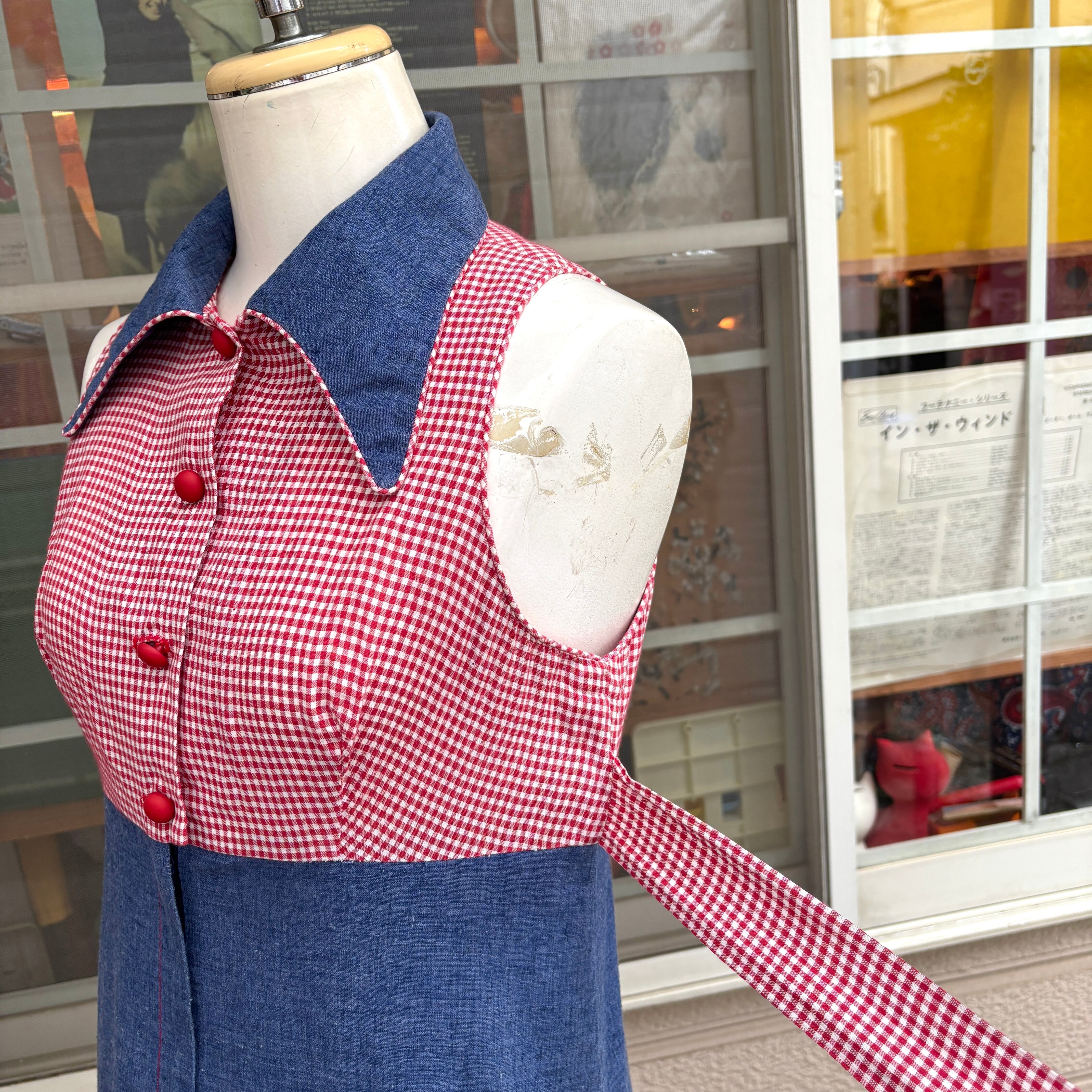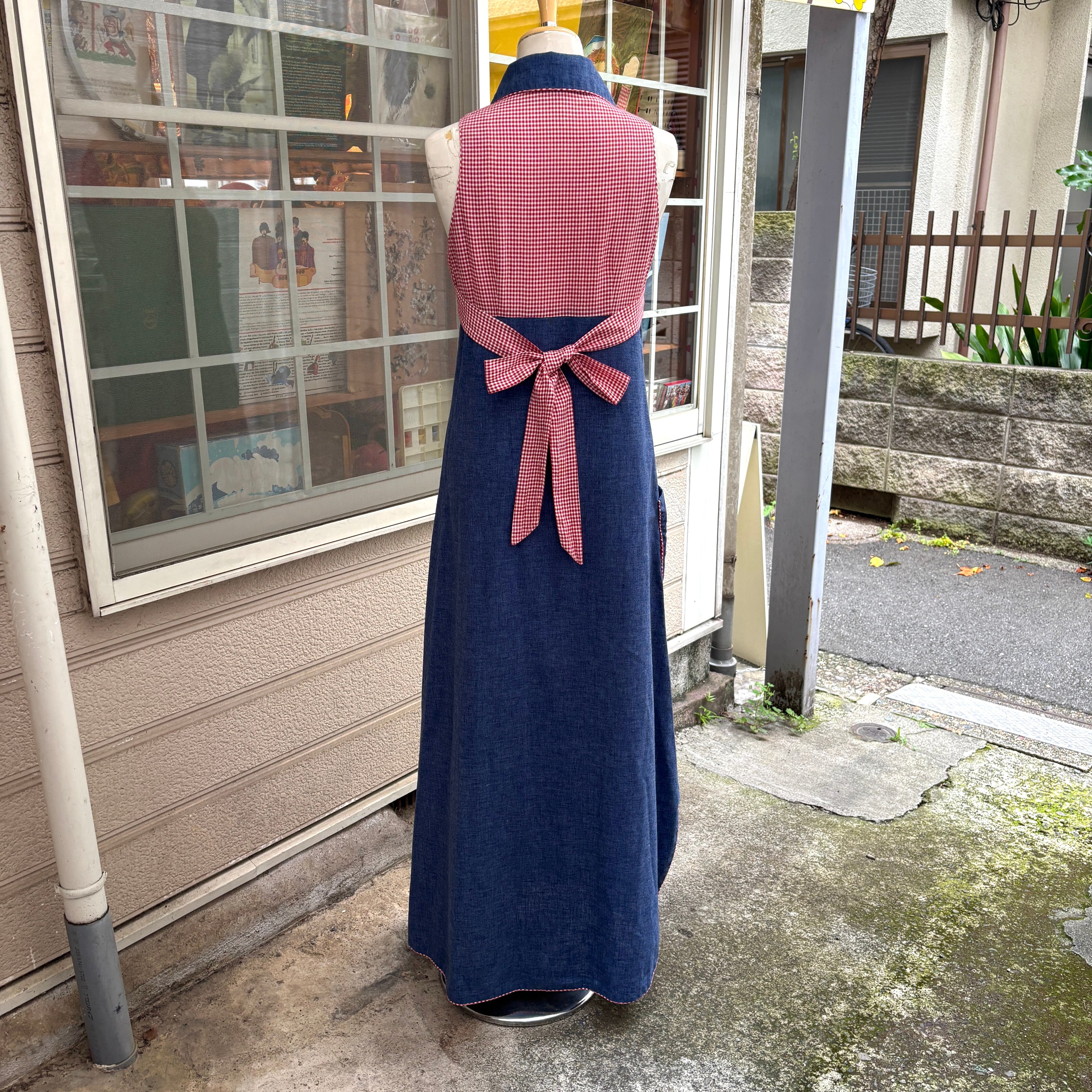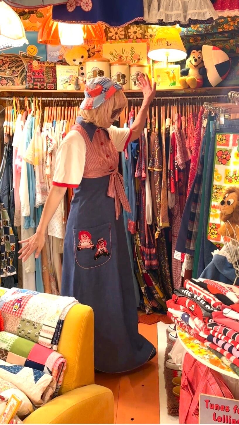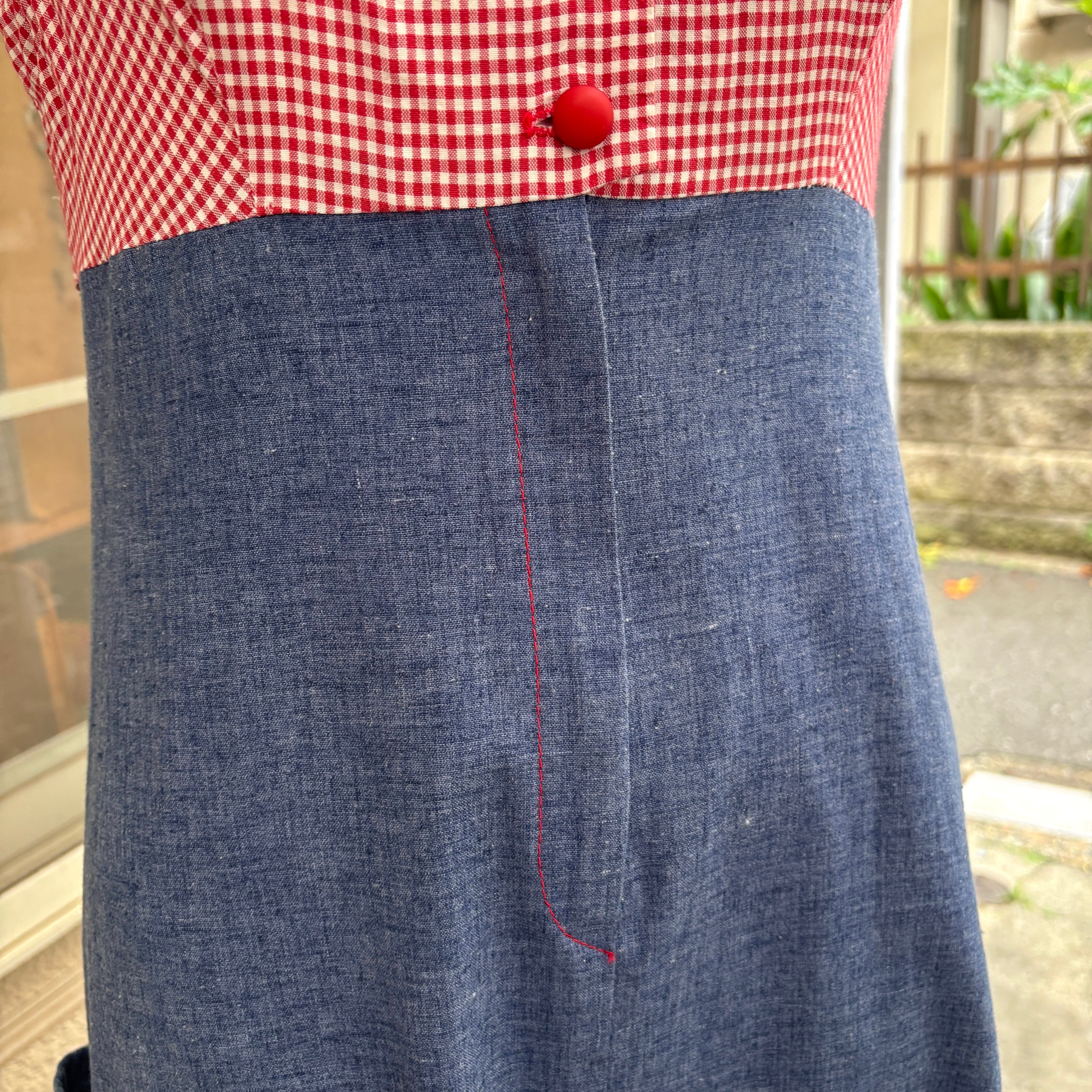 70年代らしい大きな襟やライトデニムとレッドのギンガムチェックの組み合わせ、アンとアンディのワッペン付きのポケットがとっても可愛い1着です。