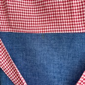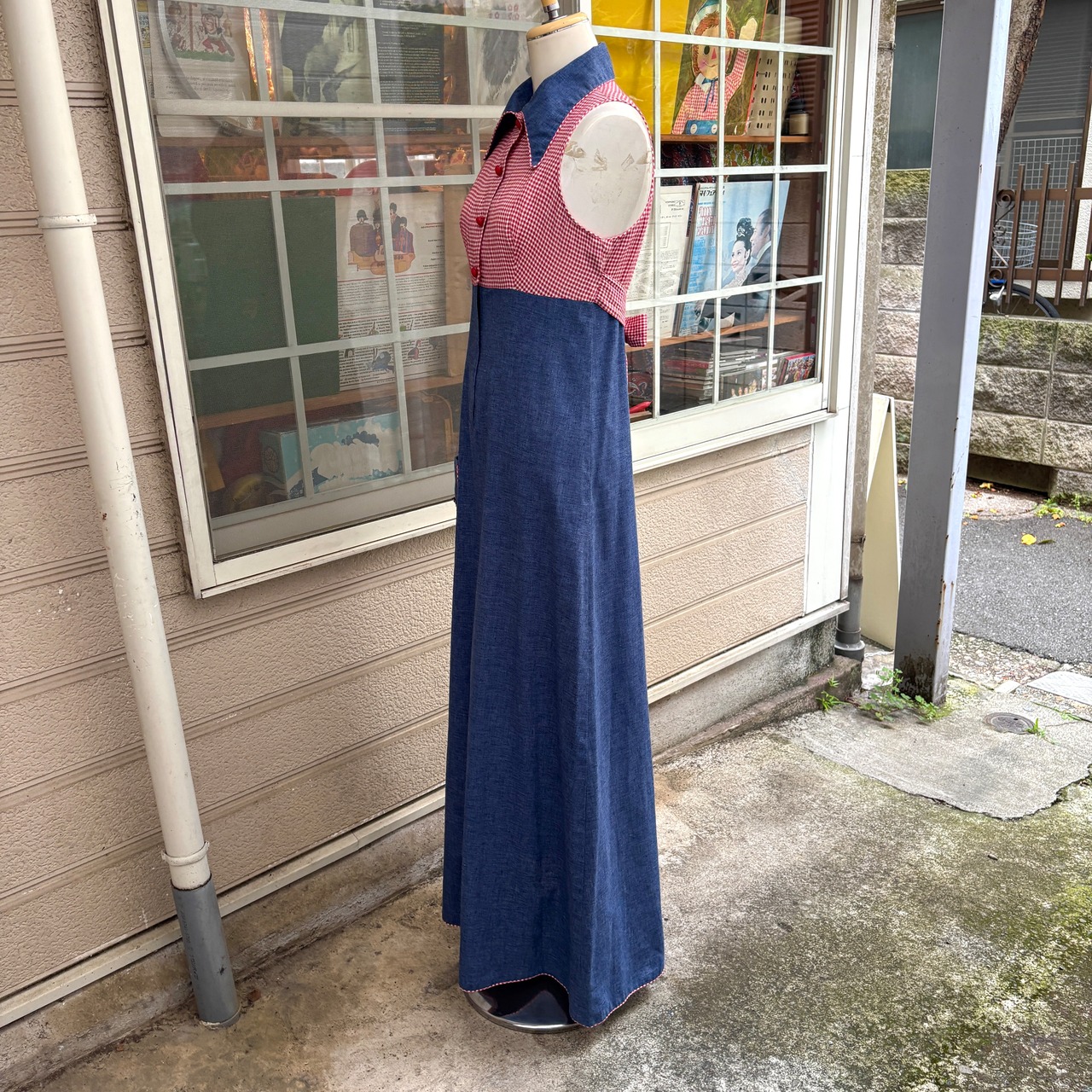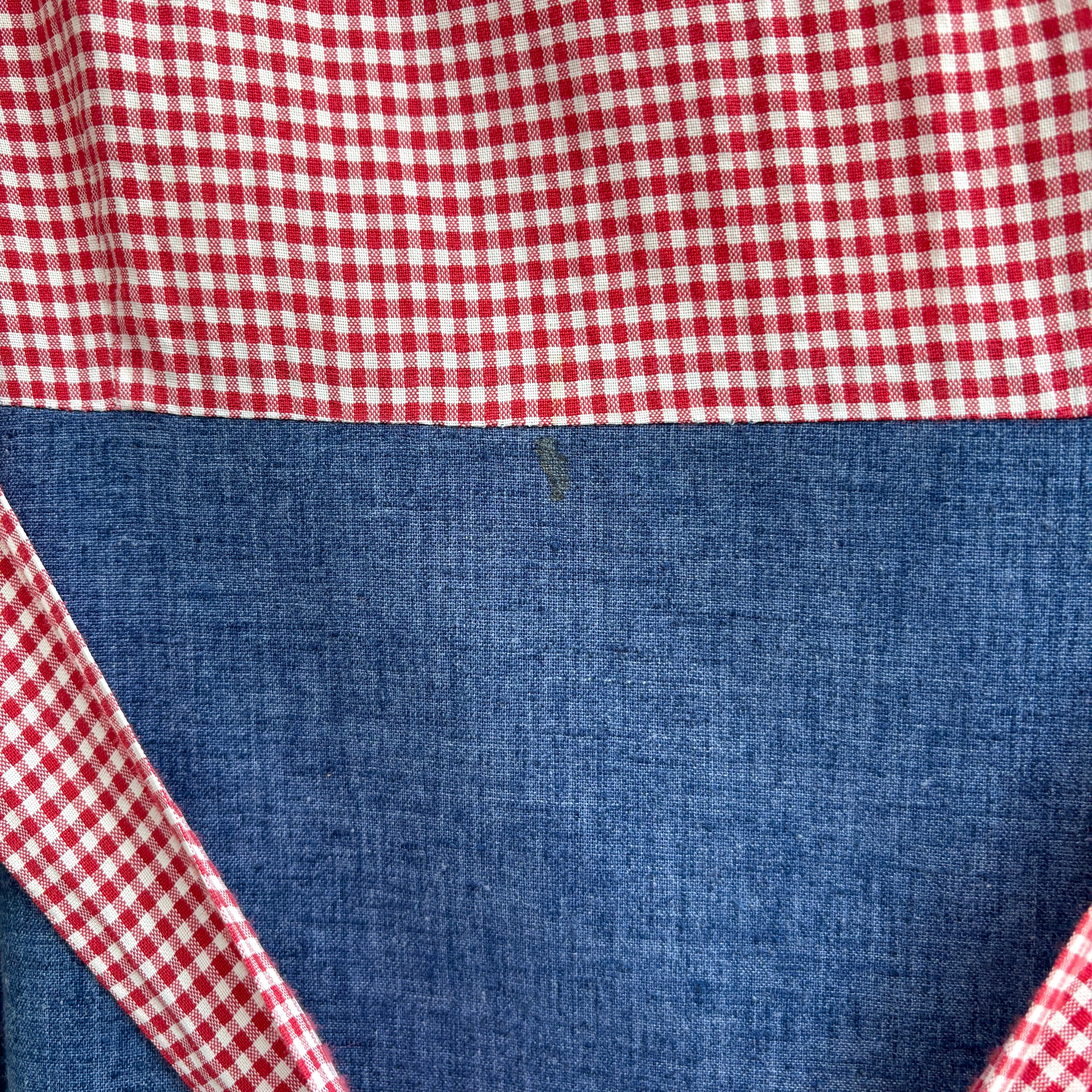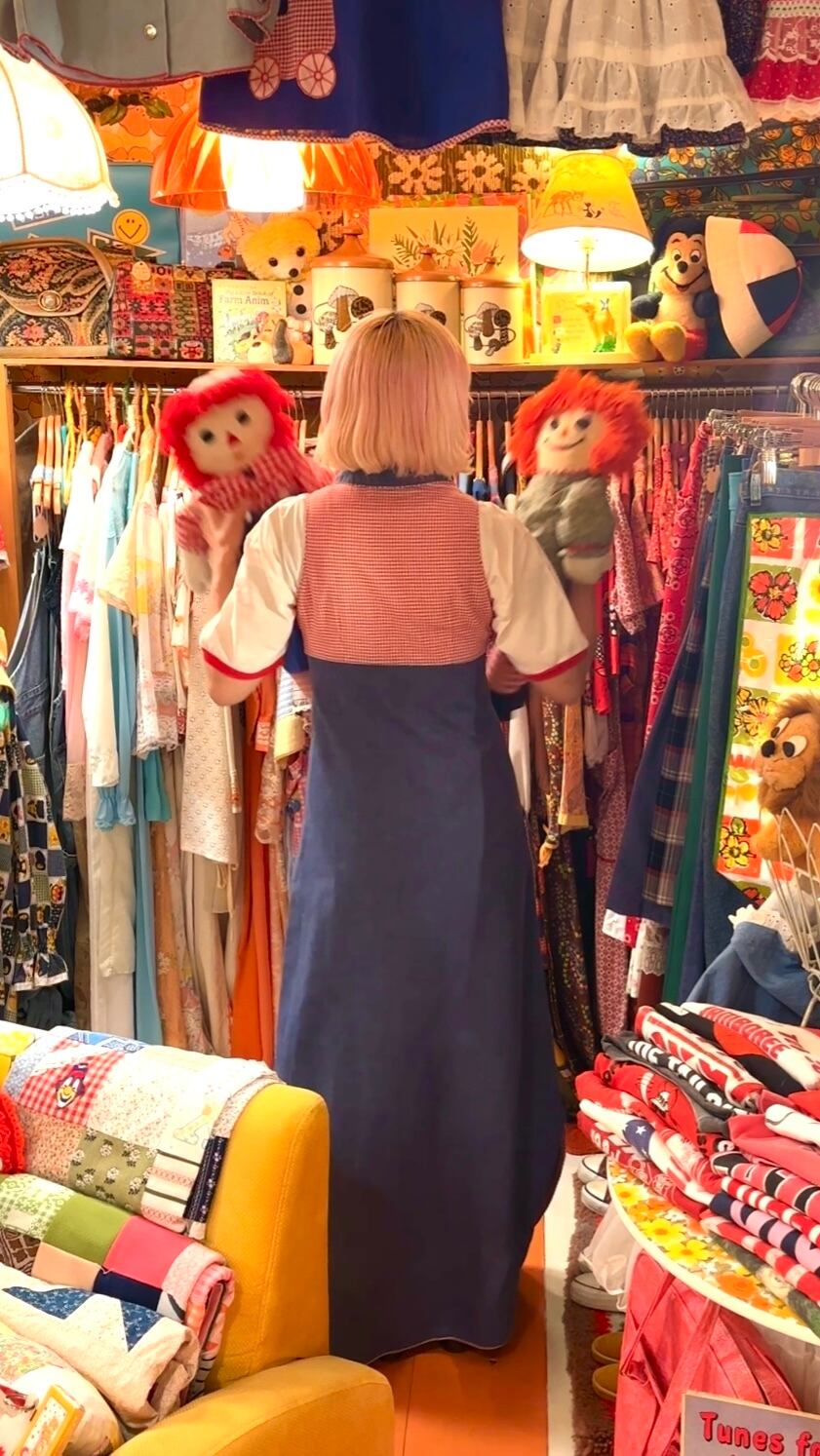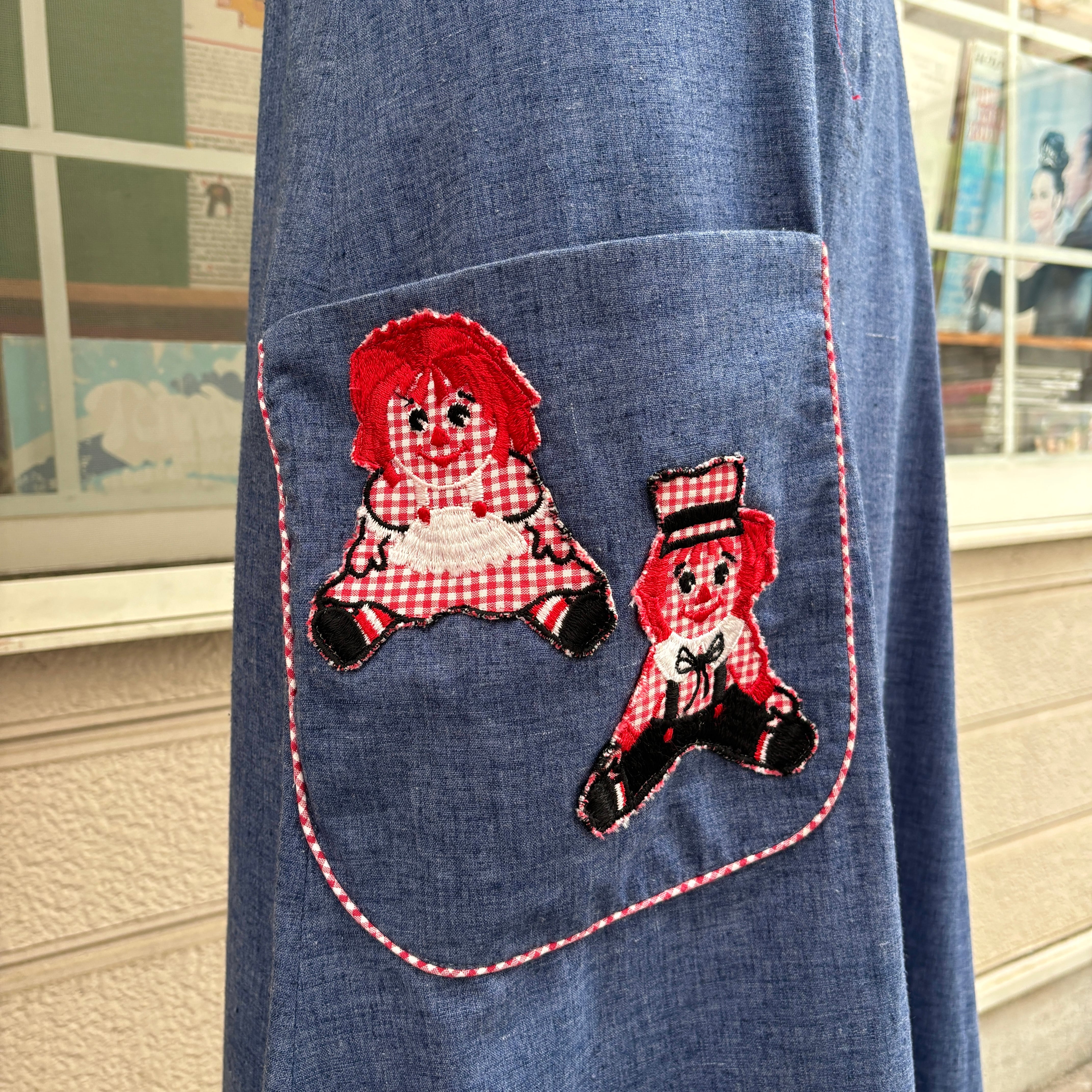 70年代らしい大きな襟やライトデニムとレッドのギンガムチェックの組み合わせ、アンとアンディのワッペン付きのポケットがとっても可愛い1着です。