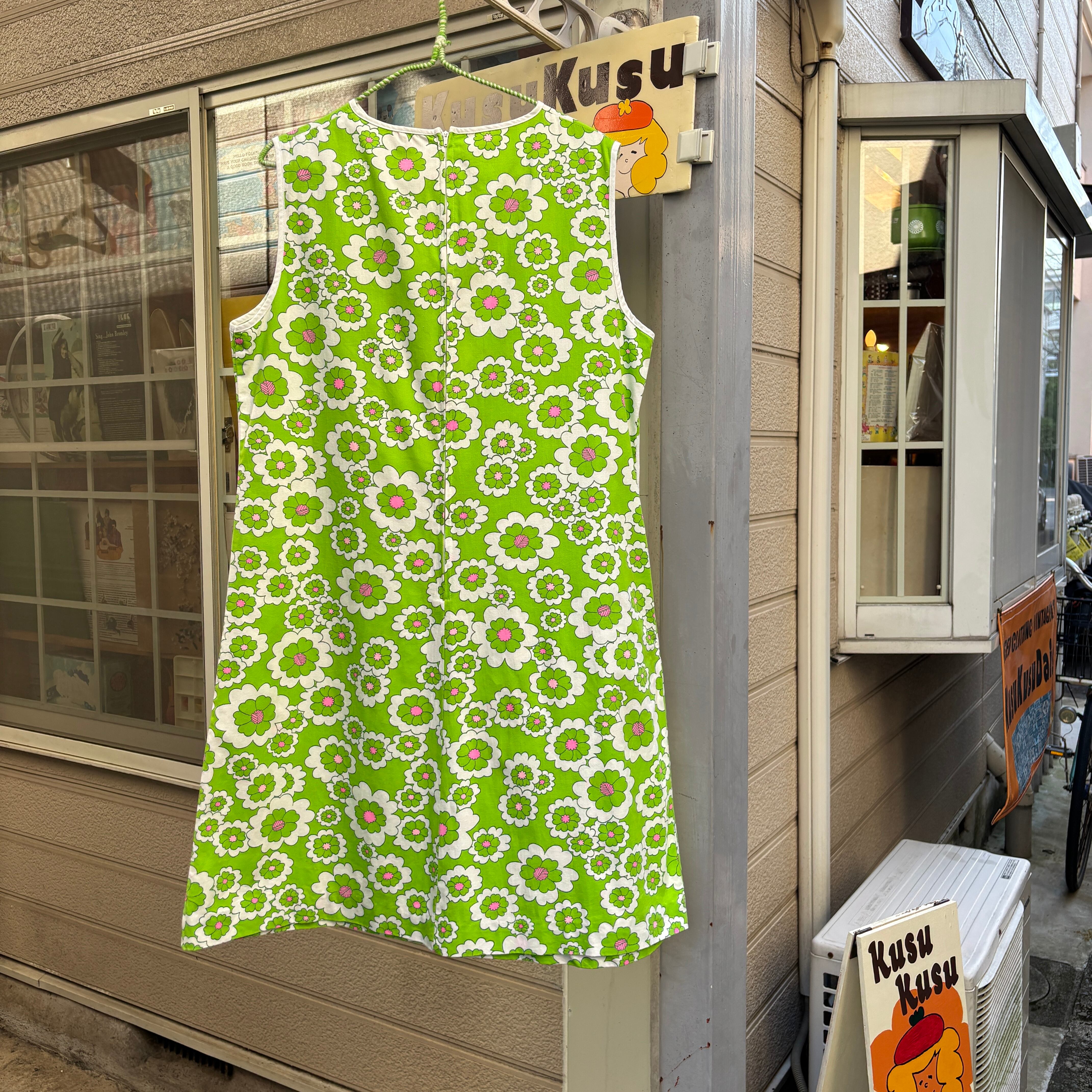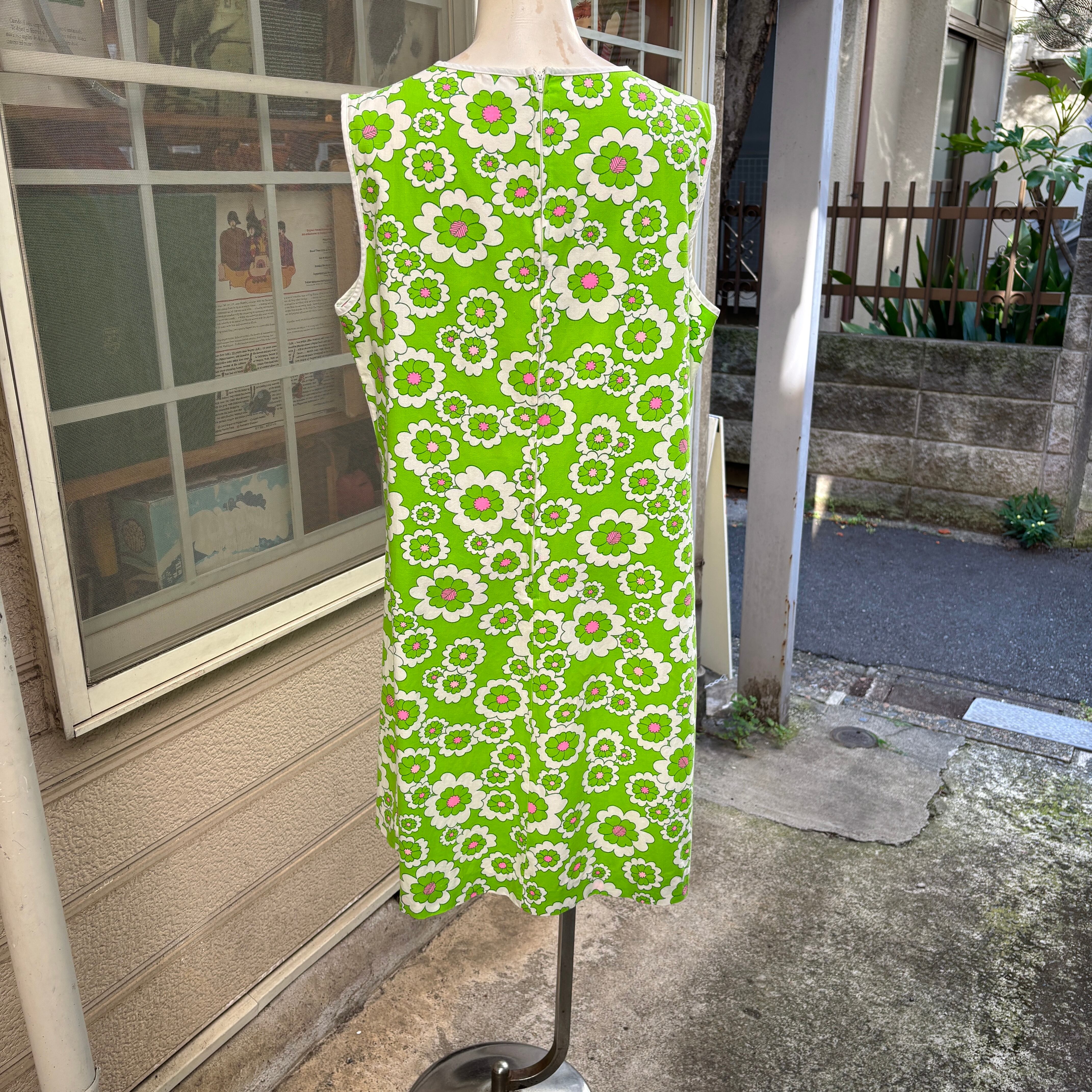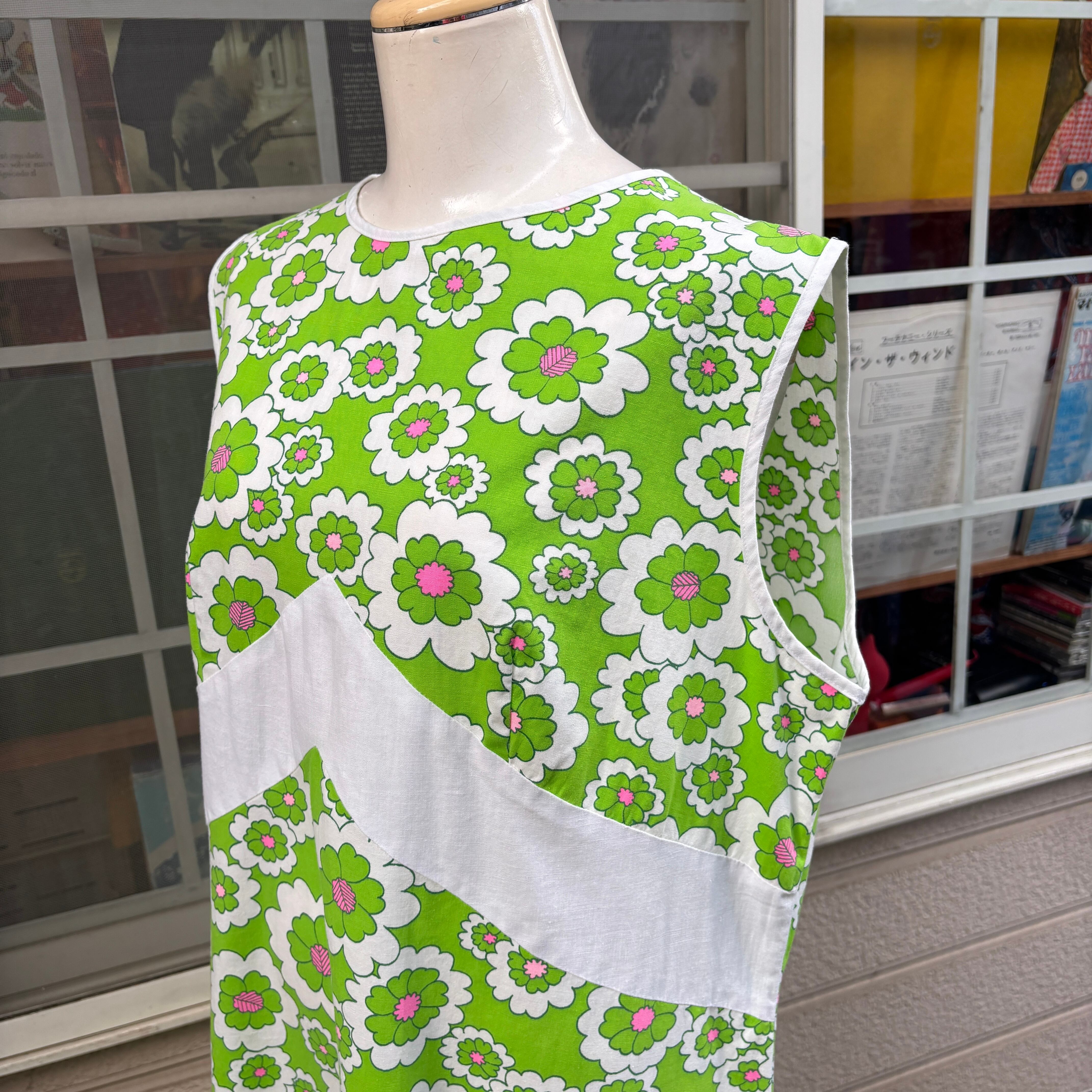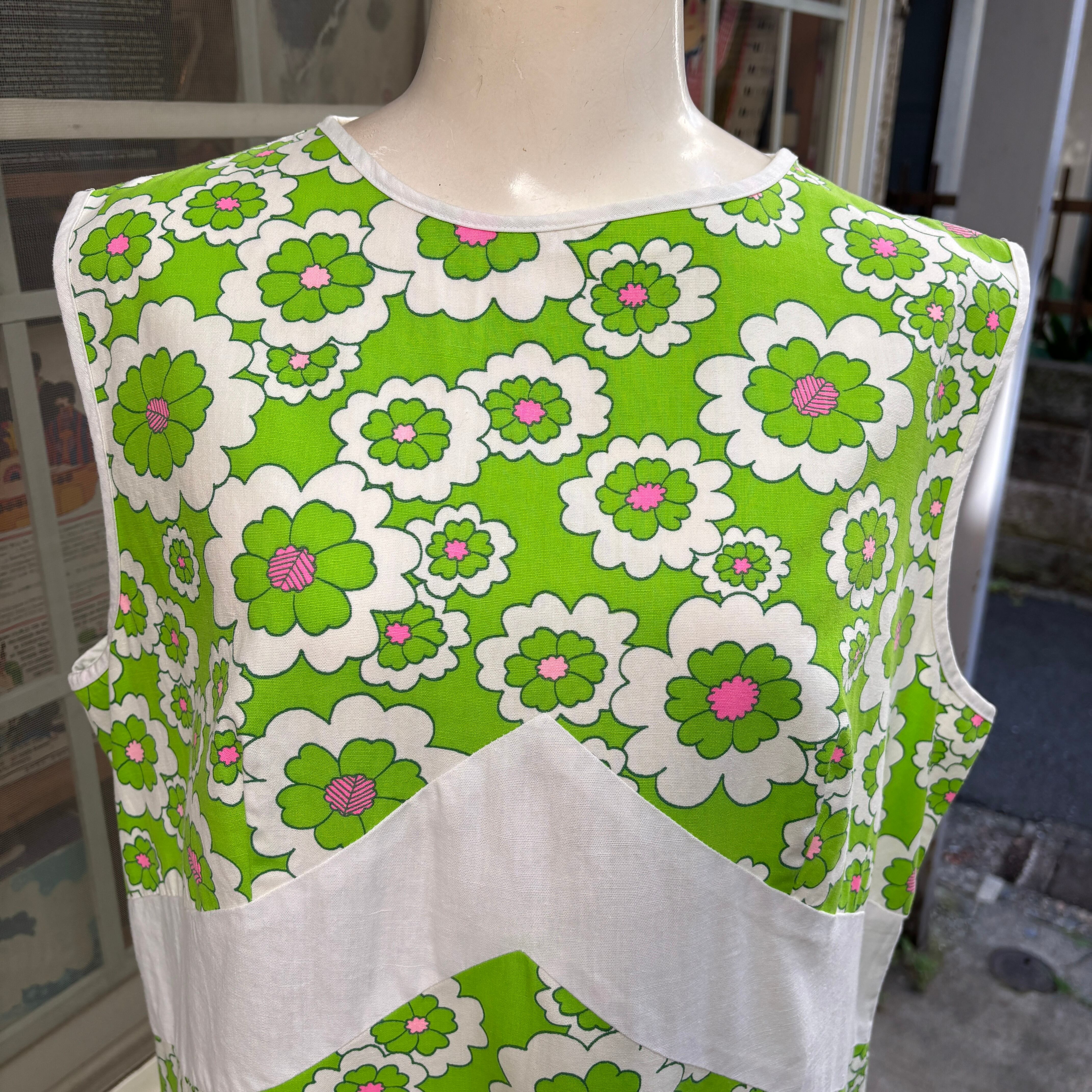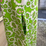 ヴィンテージ ならではなライトグリーンとライトピンク、ピンクのカラーリング、ポップなフラワー柄がとっても可愛い1着です。