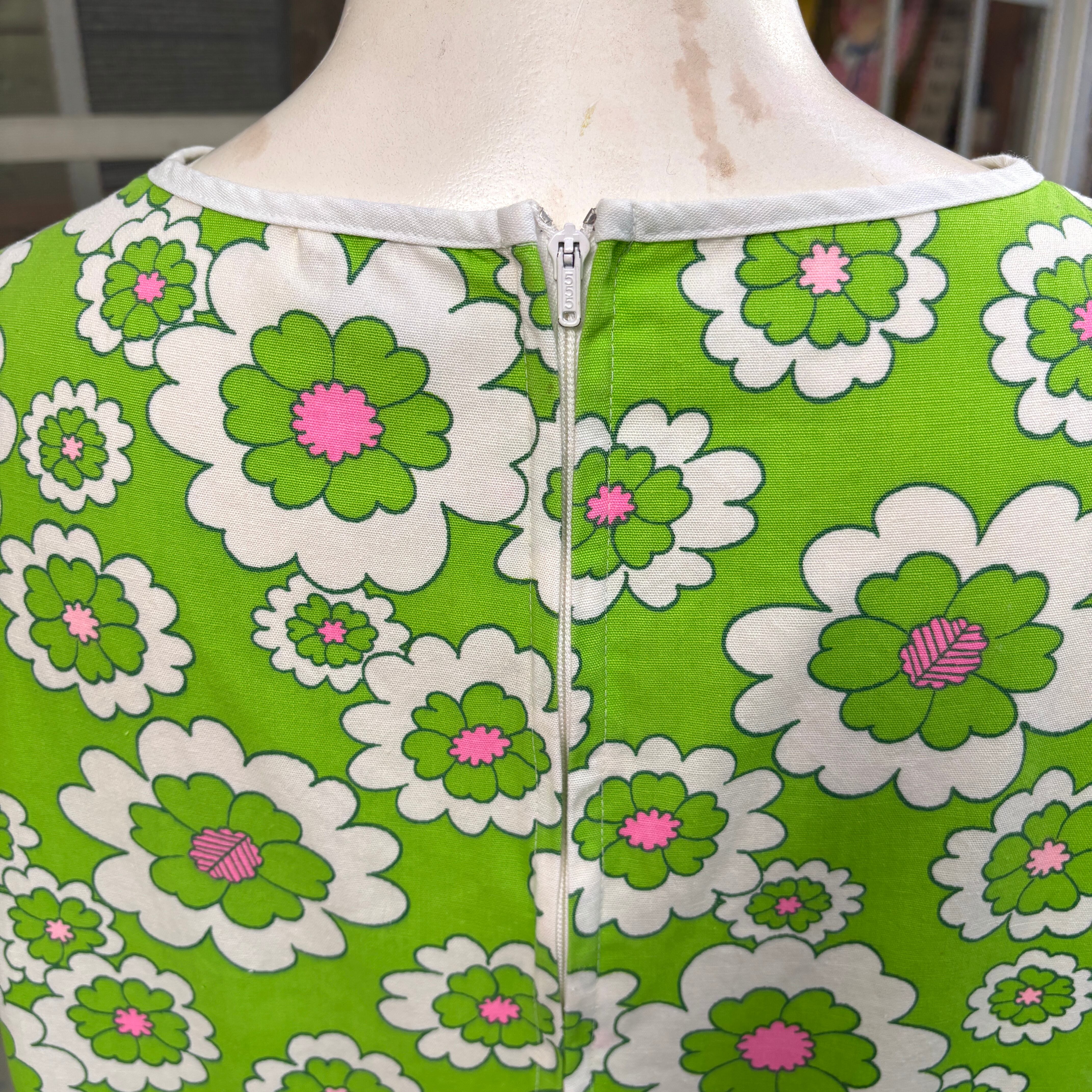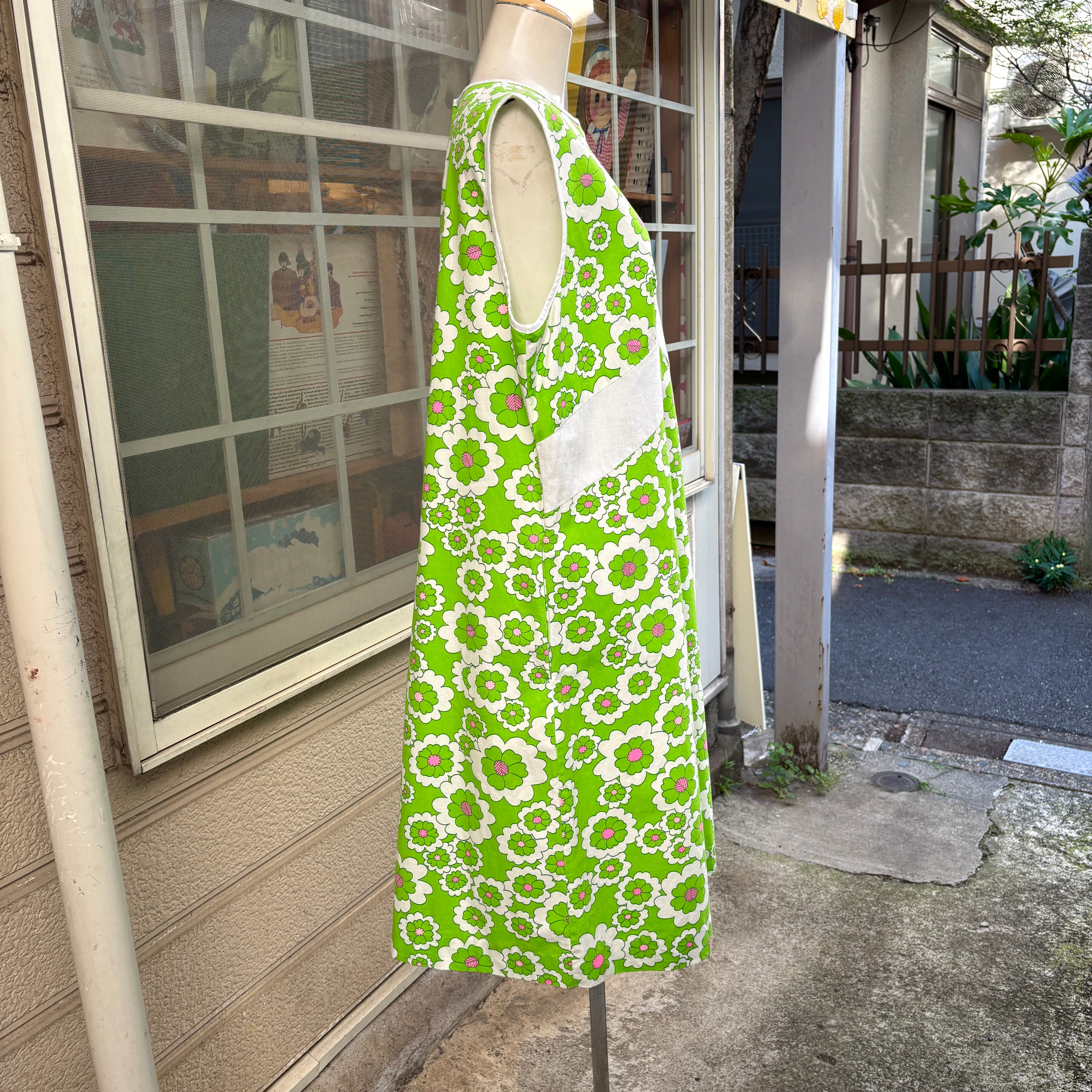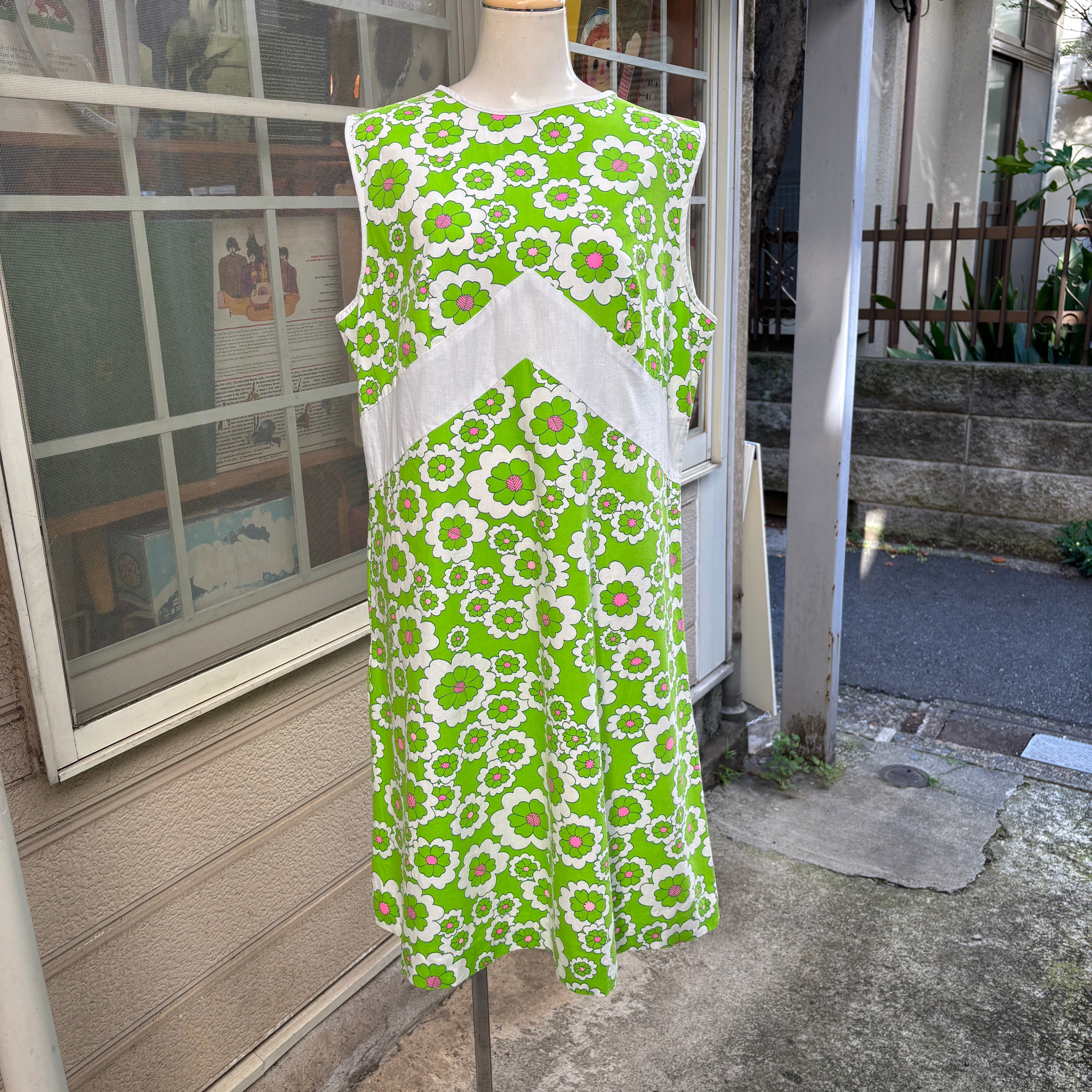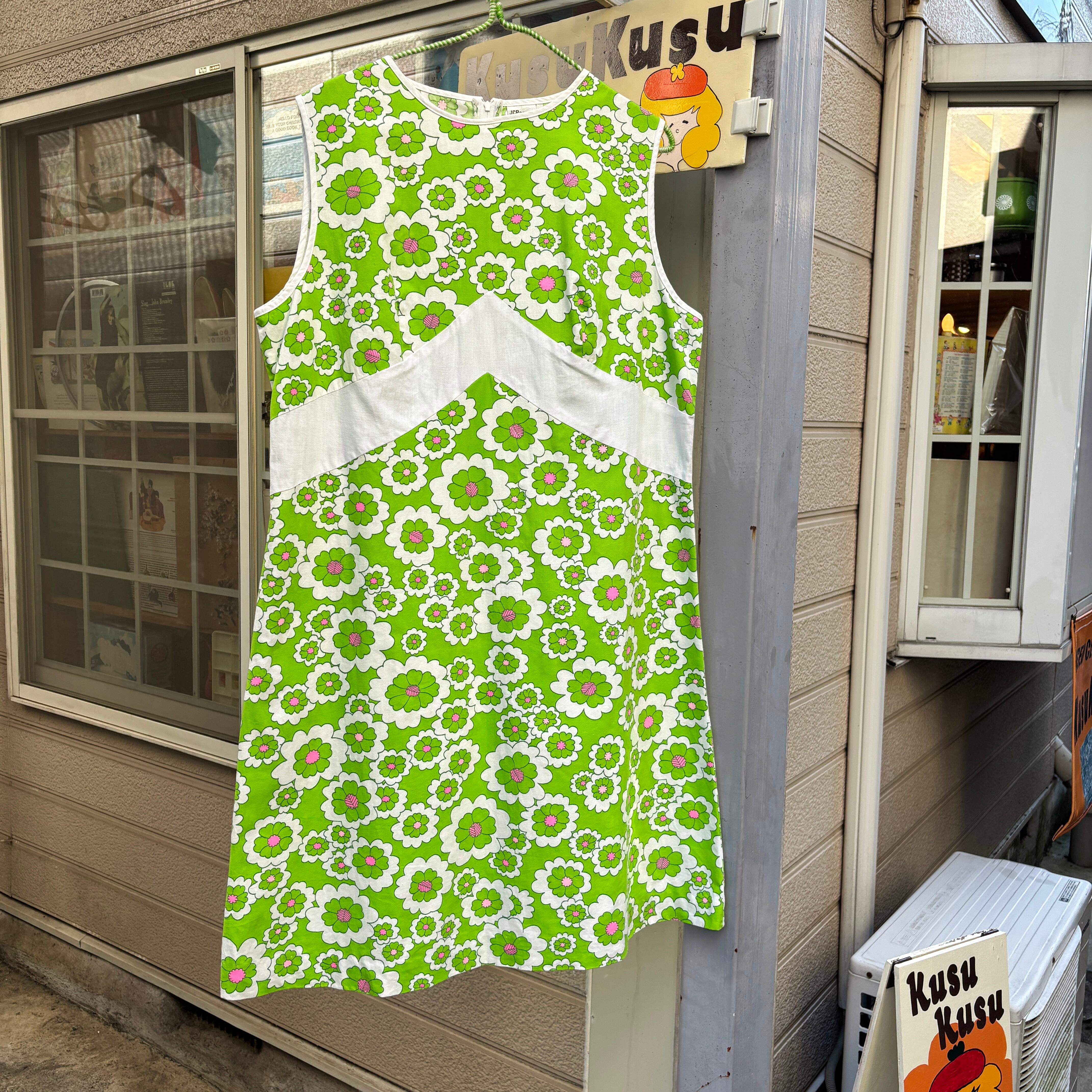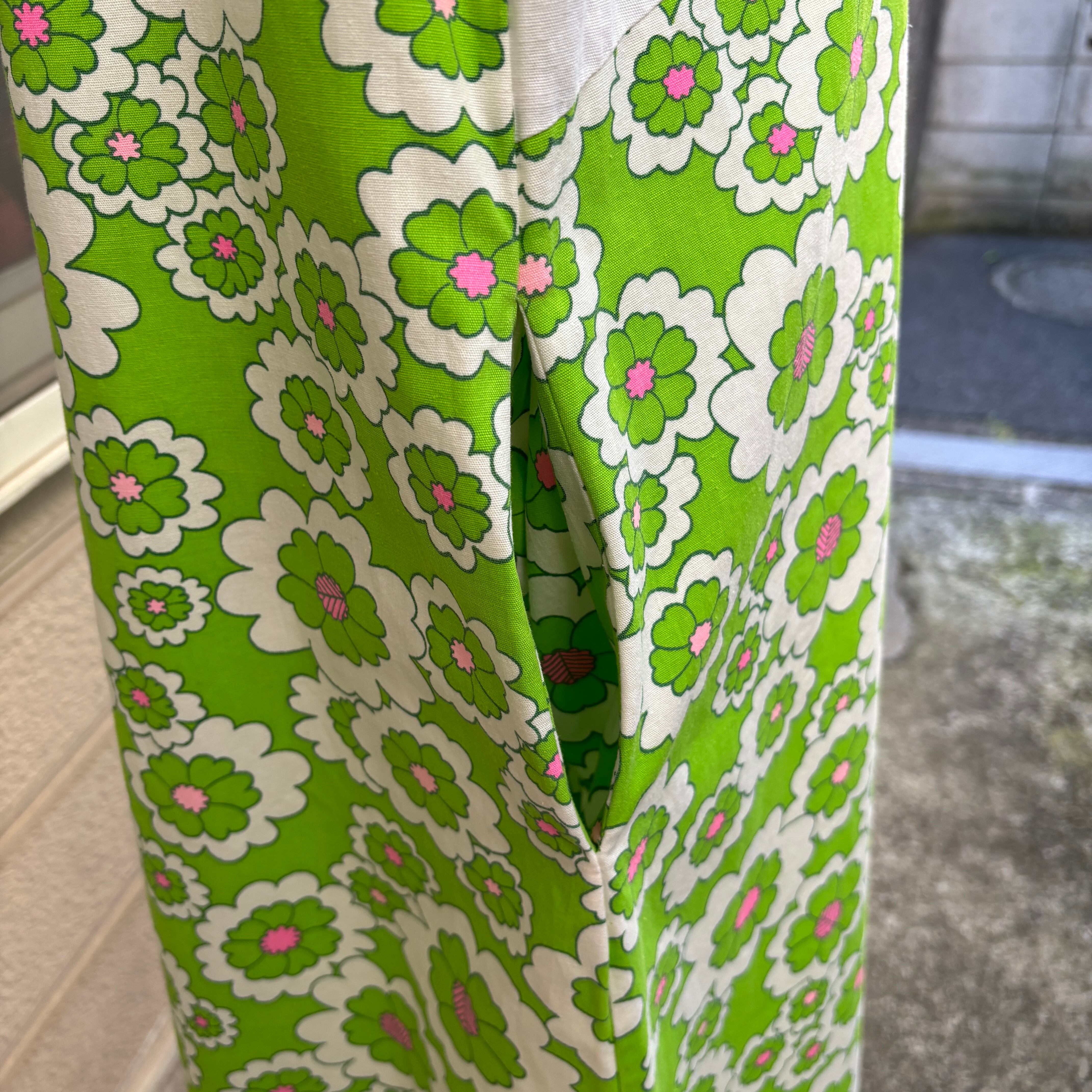 ヴィンテージ ならではなライトグリーンとライトピンク、ピンクのカラーリング、ポップなフラワー柄がとっても可愛い1着です。