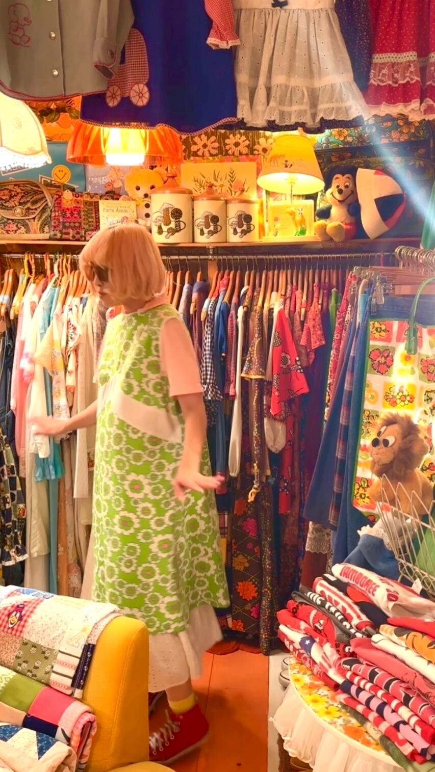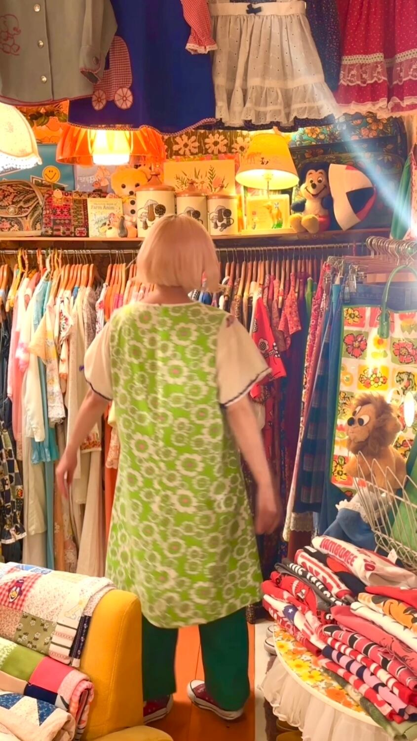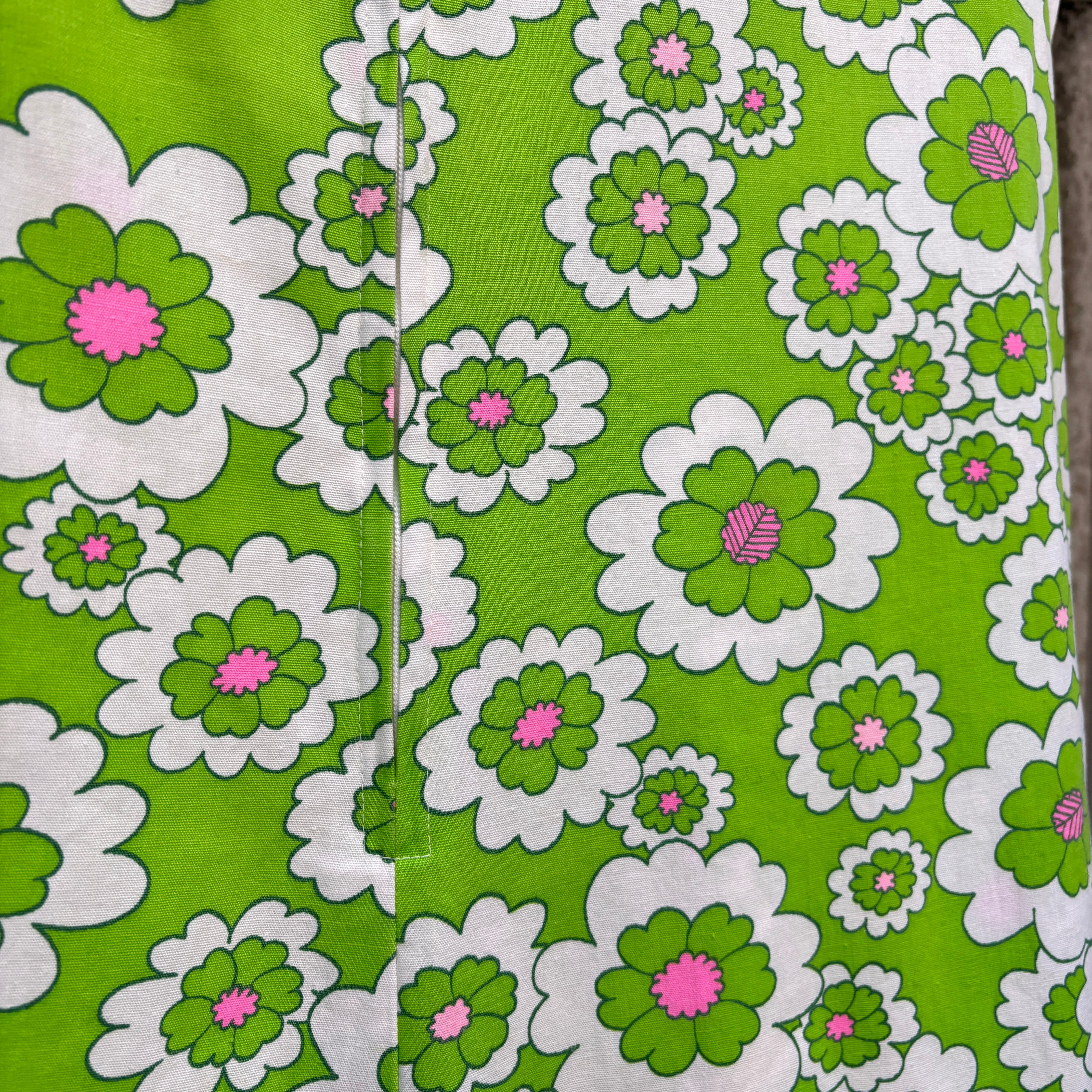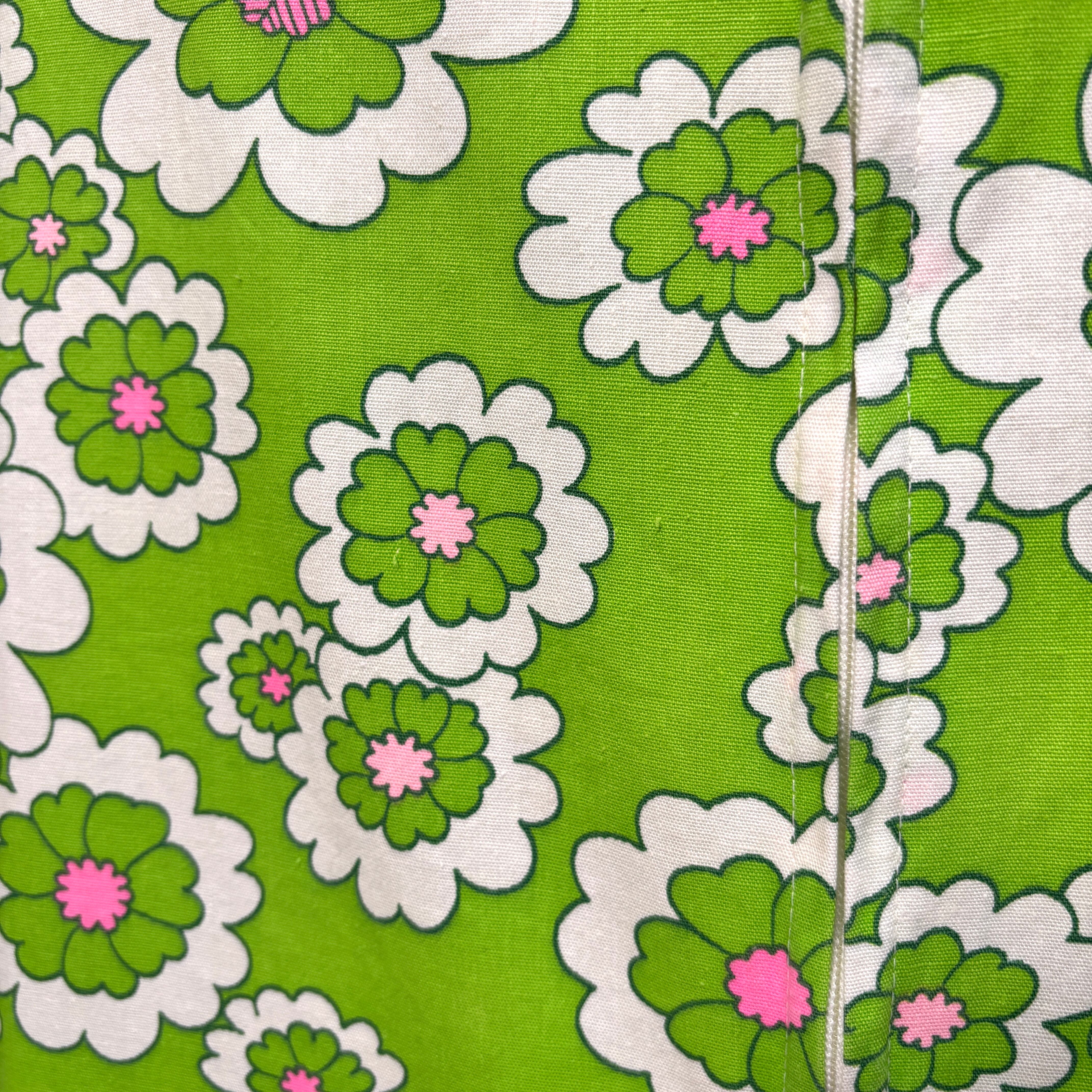 ヴィンテージ ならではなライトグリーンとライトピンク、ピンクのカラーリング、ポップなフラワー柄がとっても可愛い1着です。