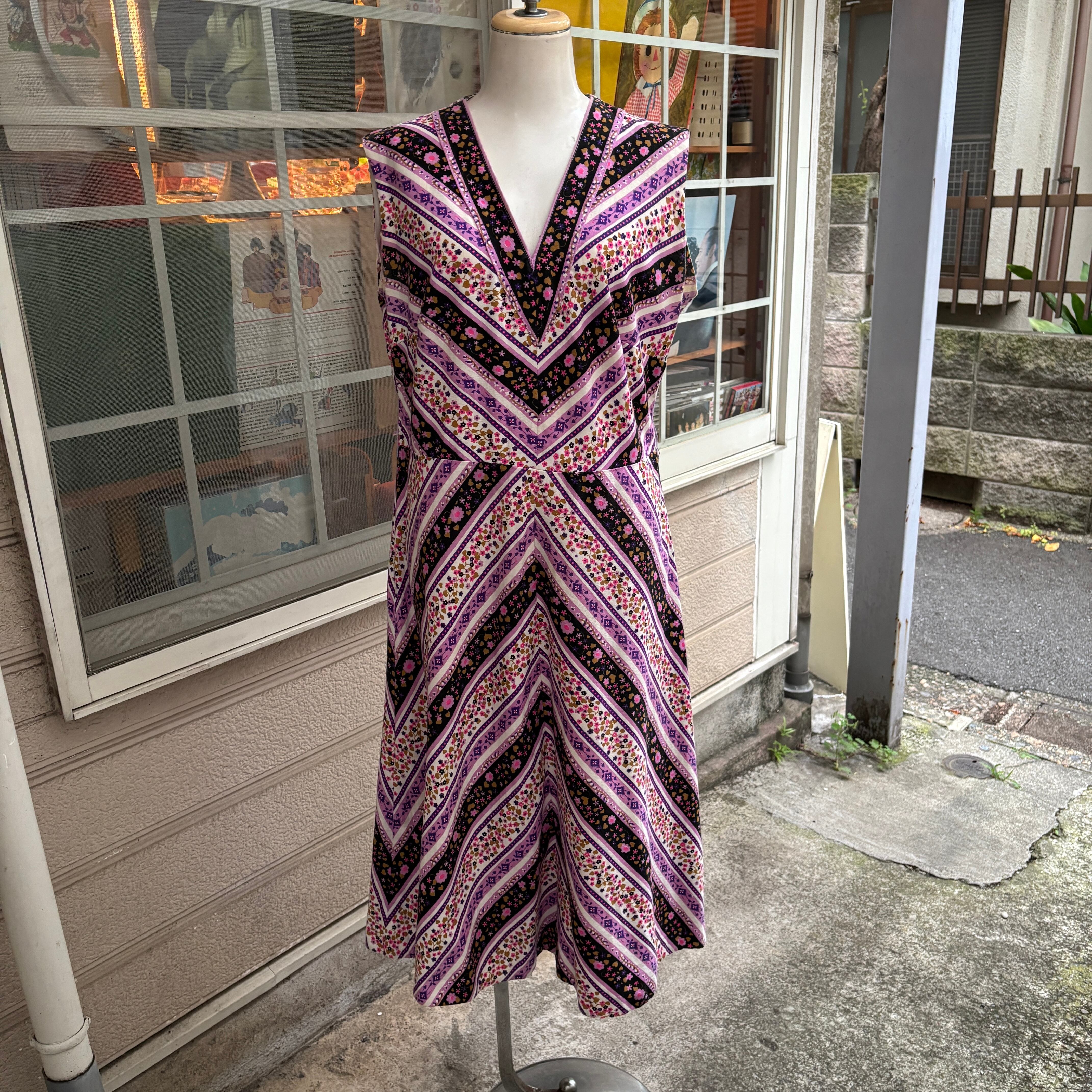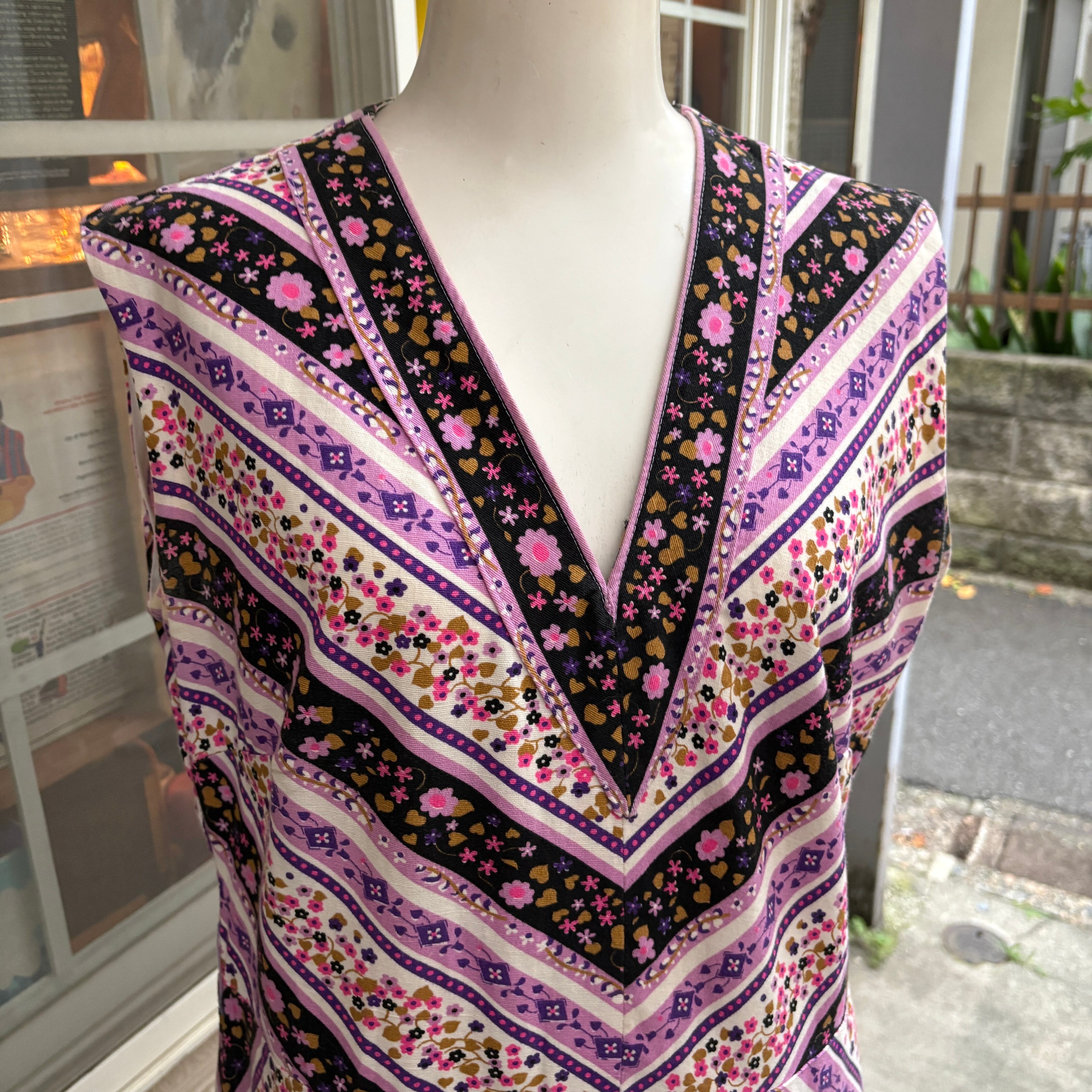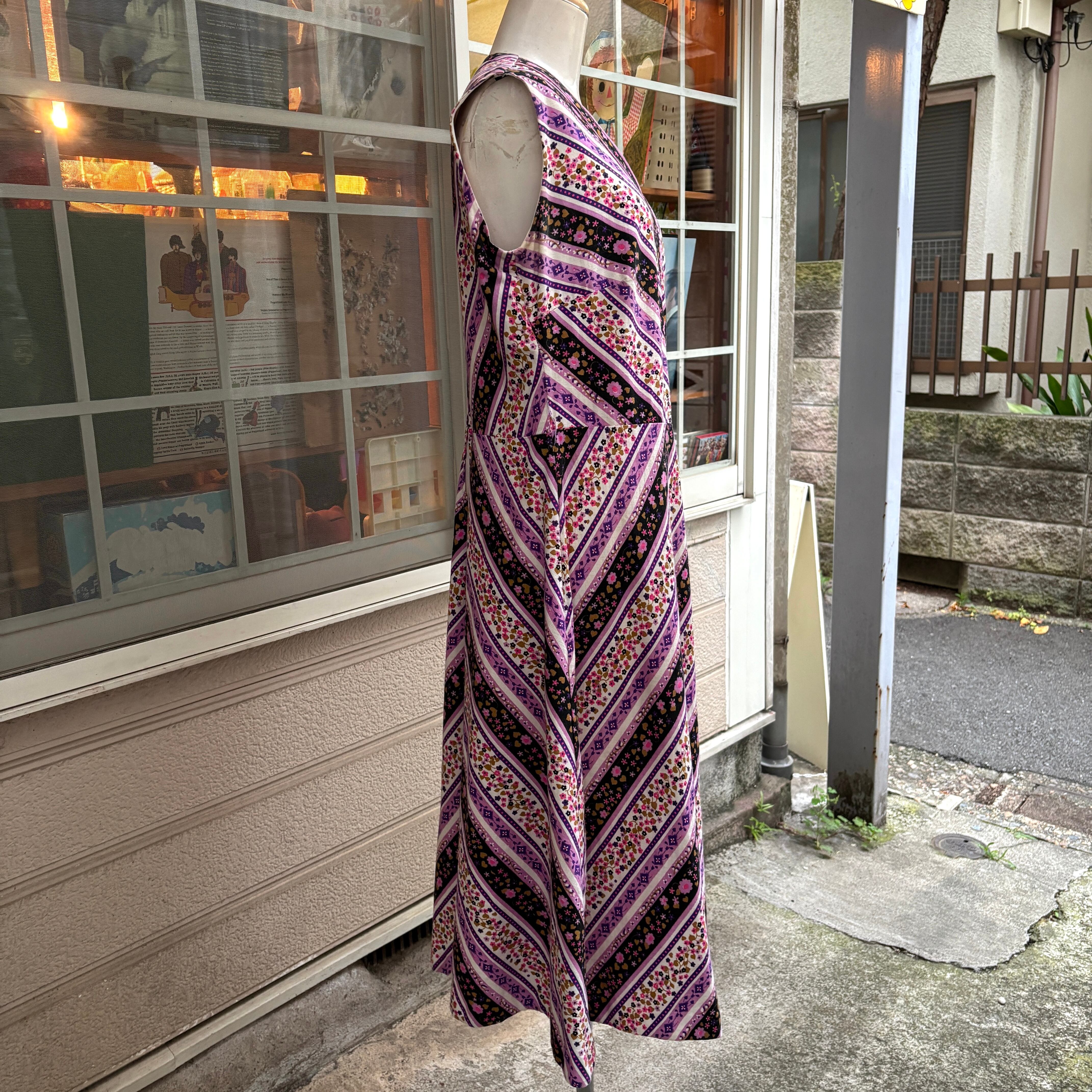 70年代 ヴィンテージ 当時のハンドメイド1点もの フラワー柄 ノースリーブドレスです。