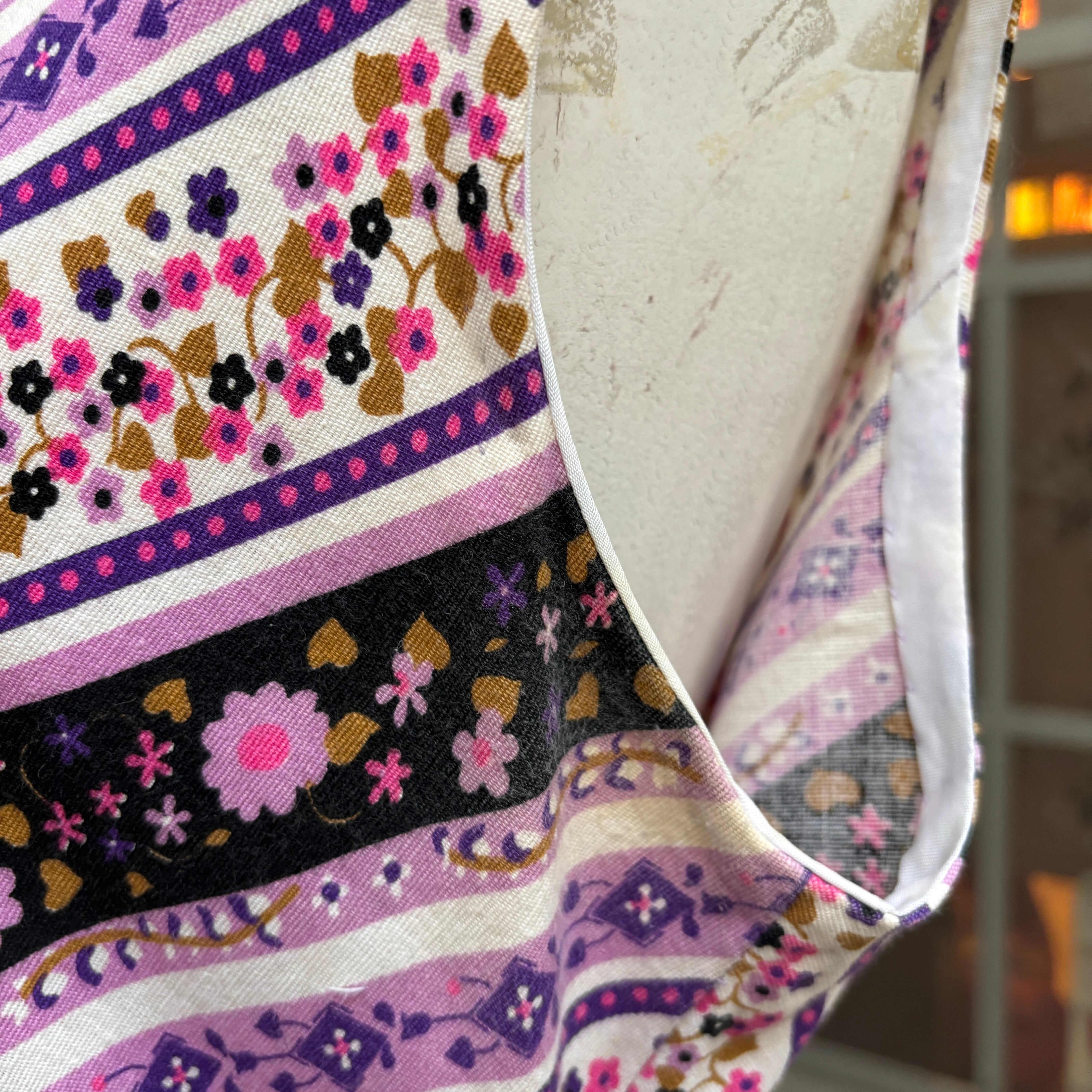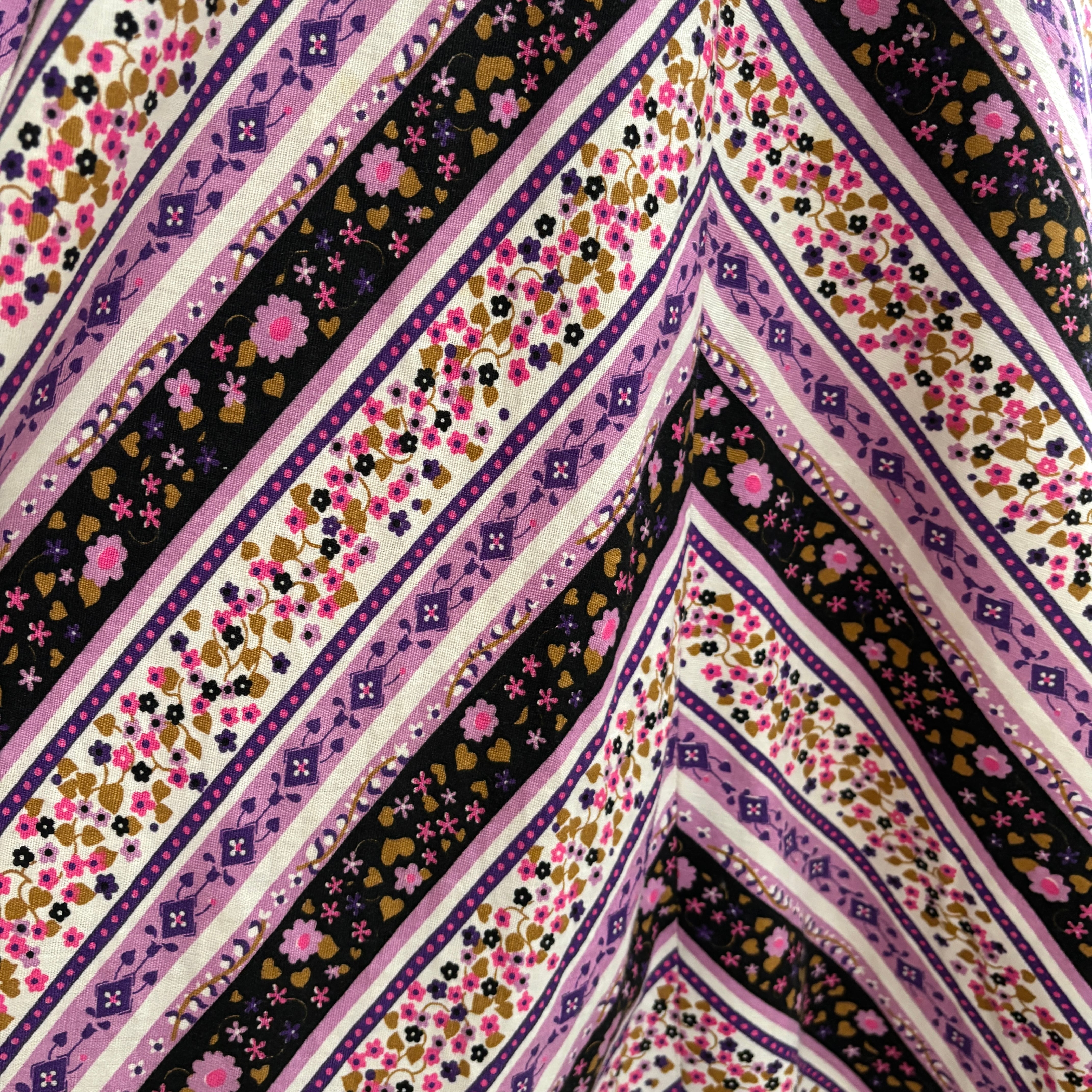 やや厚みのあるコットン生地でホワイトベースにブラック、ライトパープル、カーキ、ピンクのカラーリングやフラワー柄のリボンのようなラインがとっても可愛い1着です。