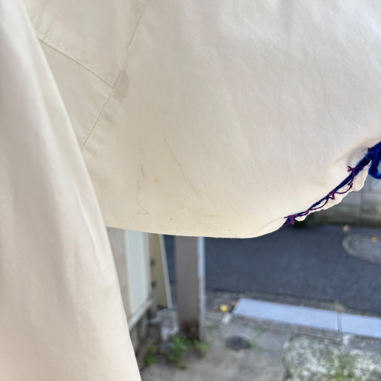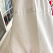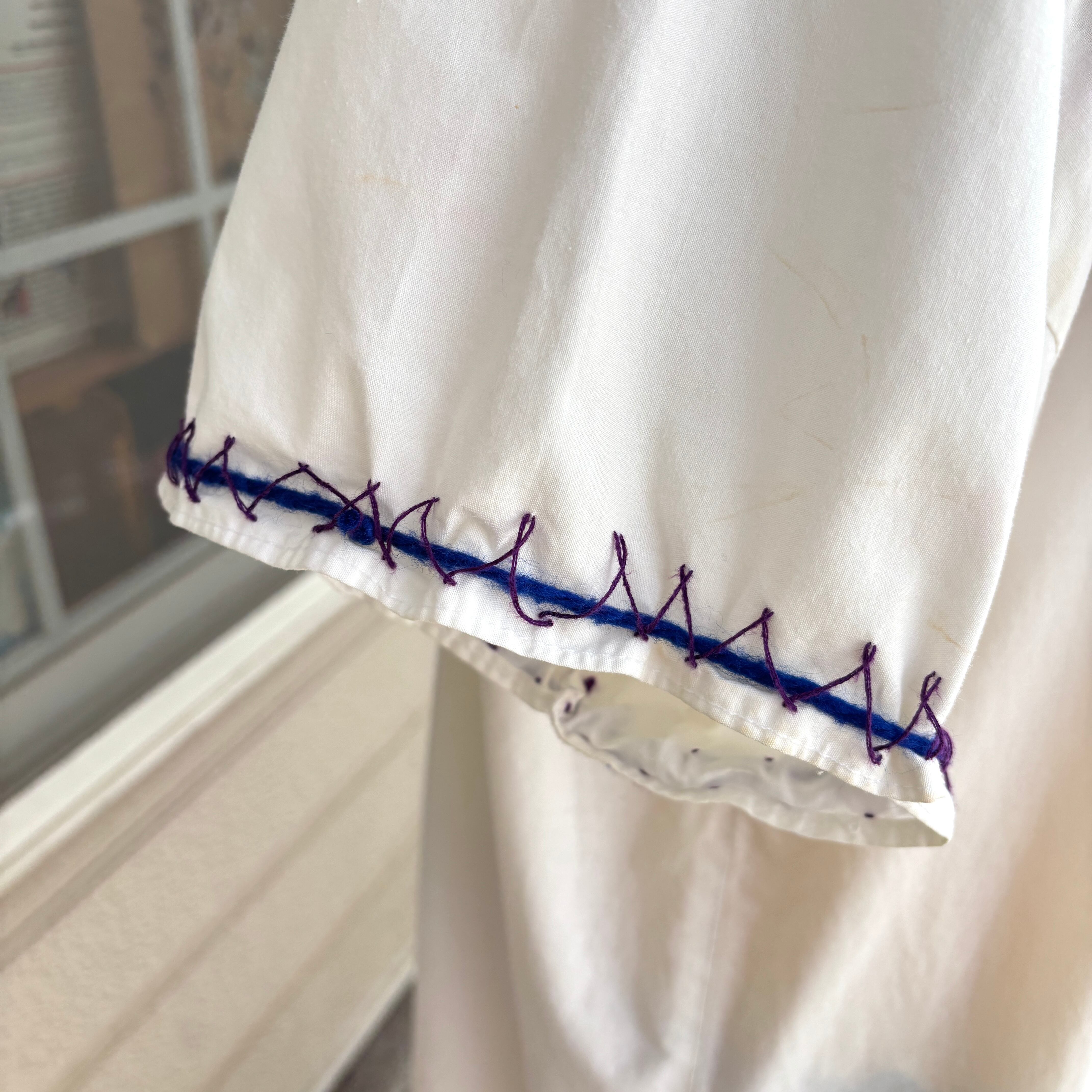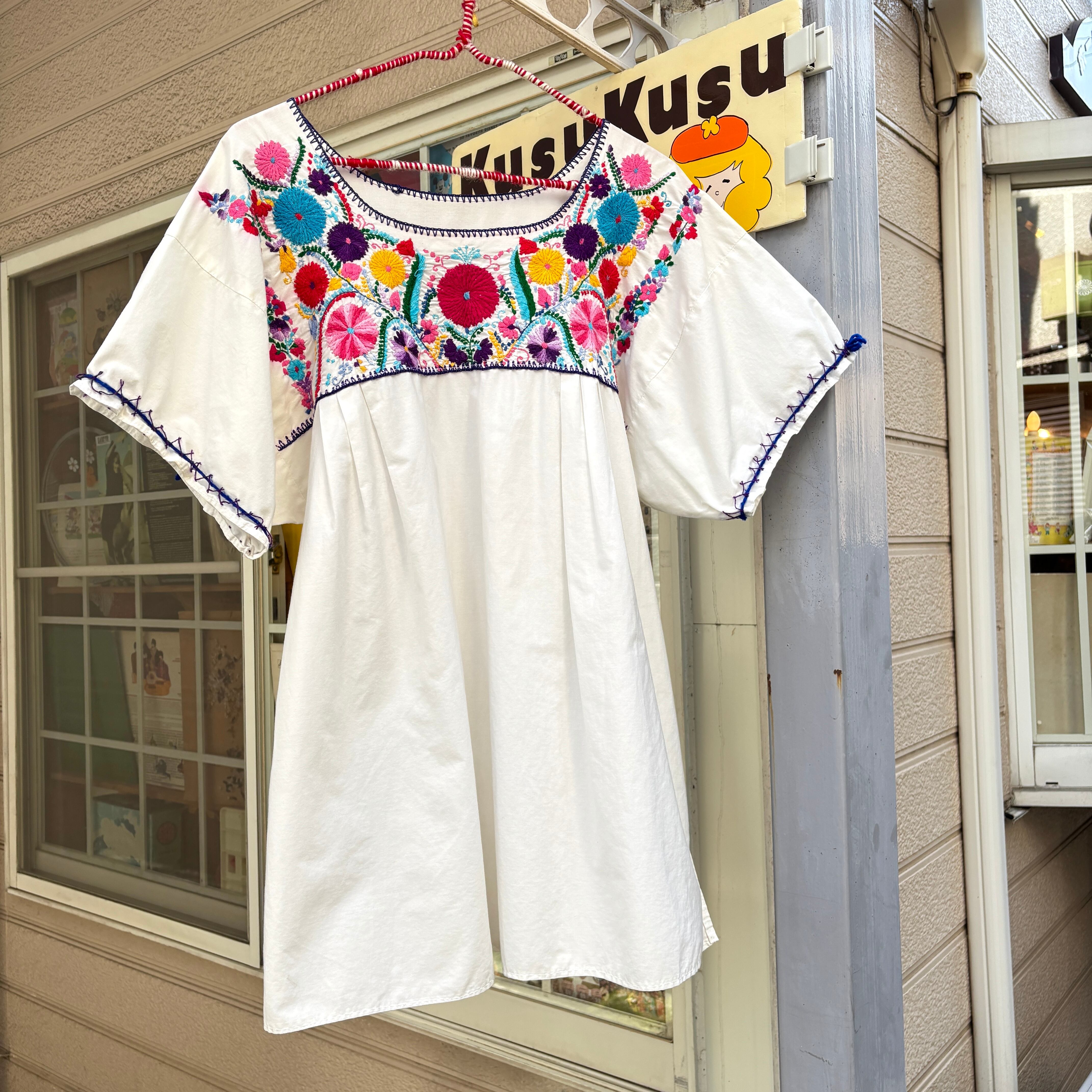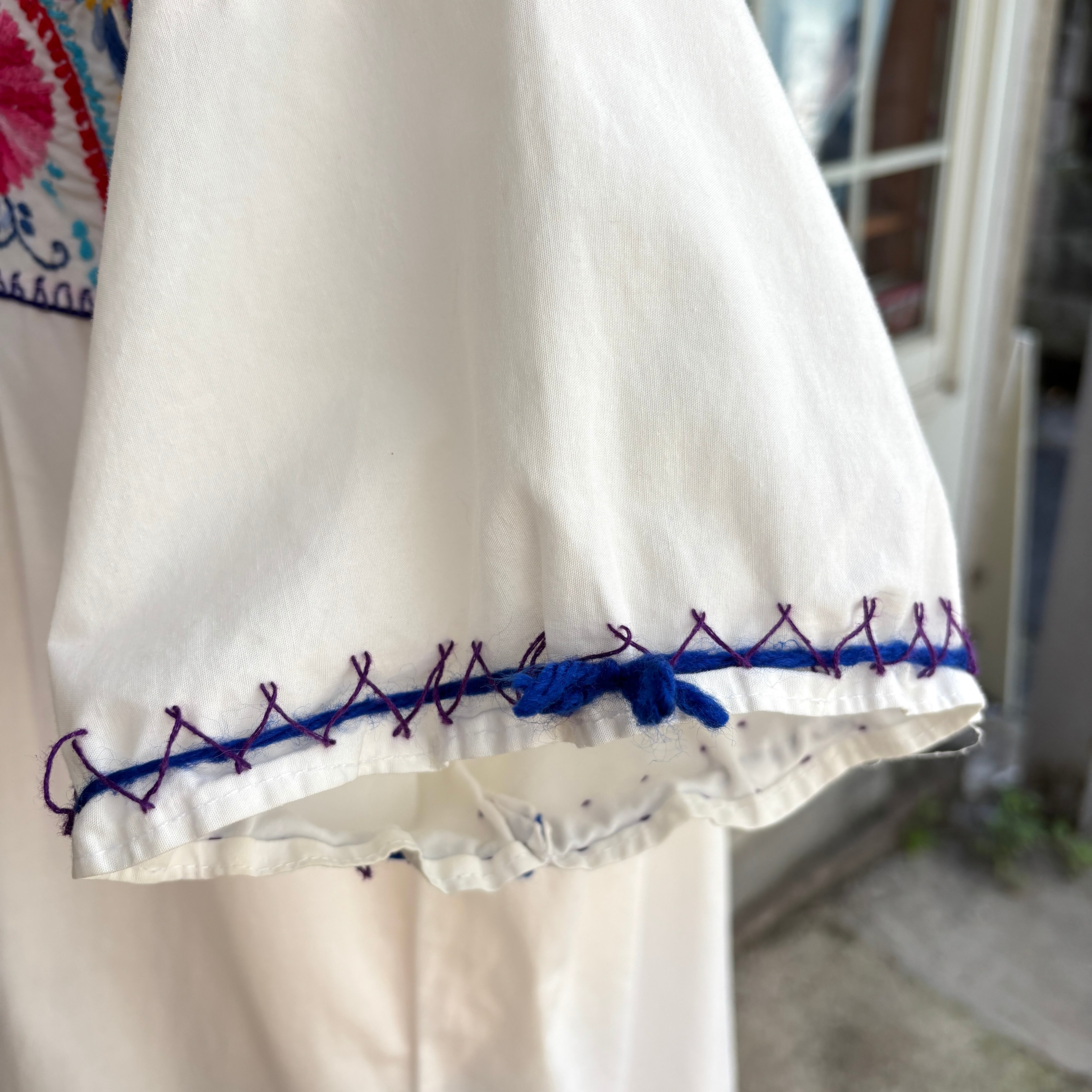 ホワイトのボディーにパープルのステッチライン、レッド、イエロー、ピンク、ライトブルー、パープル、グリーンの当時の手刺繍によるカラフルなフラワー刺繍がとっても可愛い1着です。
