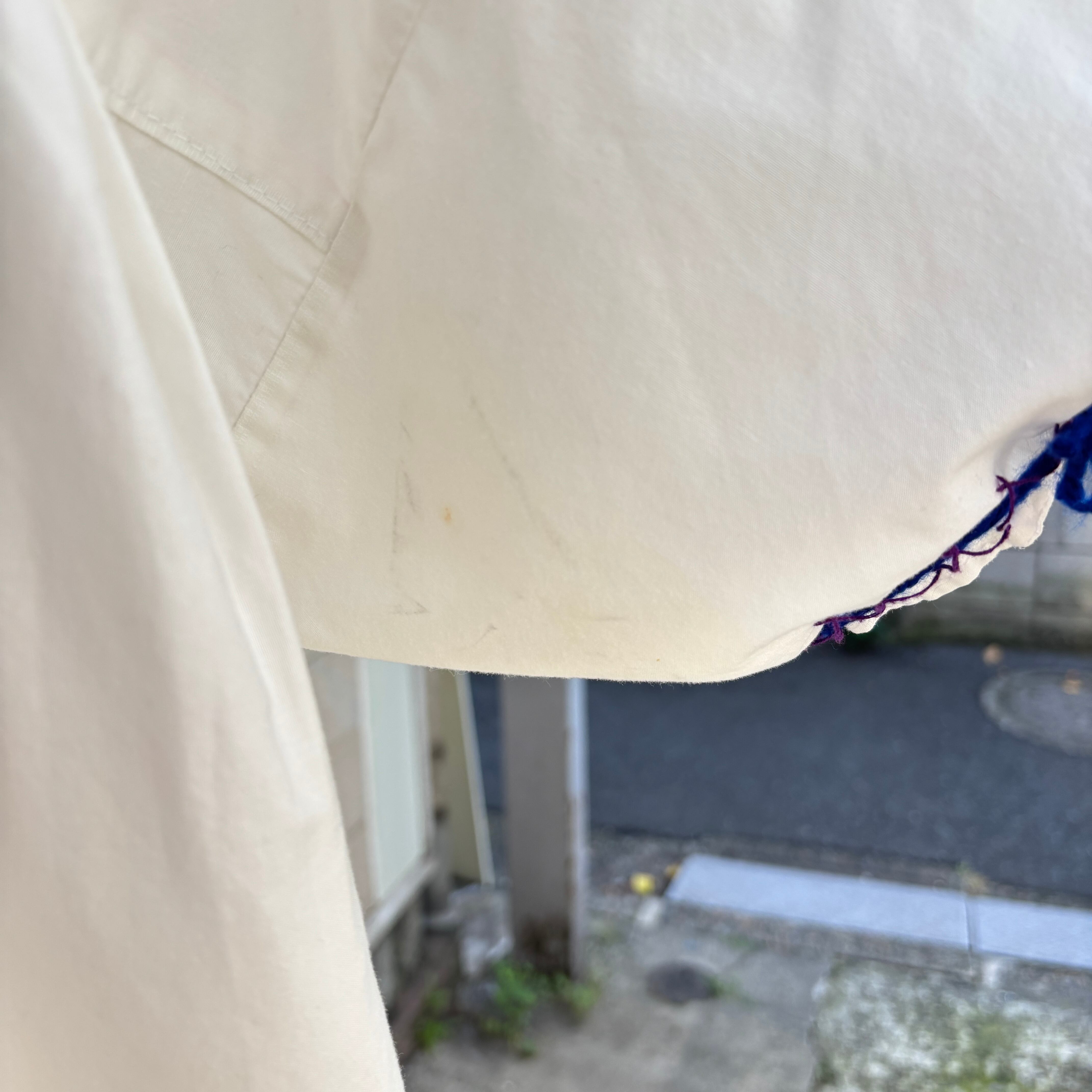 経年によるフロントの右下、右袖、背面側の右肩下に薄っすらとしたシミ、背面側の刺繍上、フロントの右肩に若干の色染み、刺繍に僅かな毛羽立ち、背面側の襟元にステッチの玉留め、袖口のステッチの糸の若干のゆるみ、毛糸の玉留めが見られますが、古着に慣れている方ですと、あまり気にならない程度かと思います。