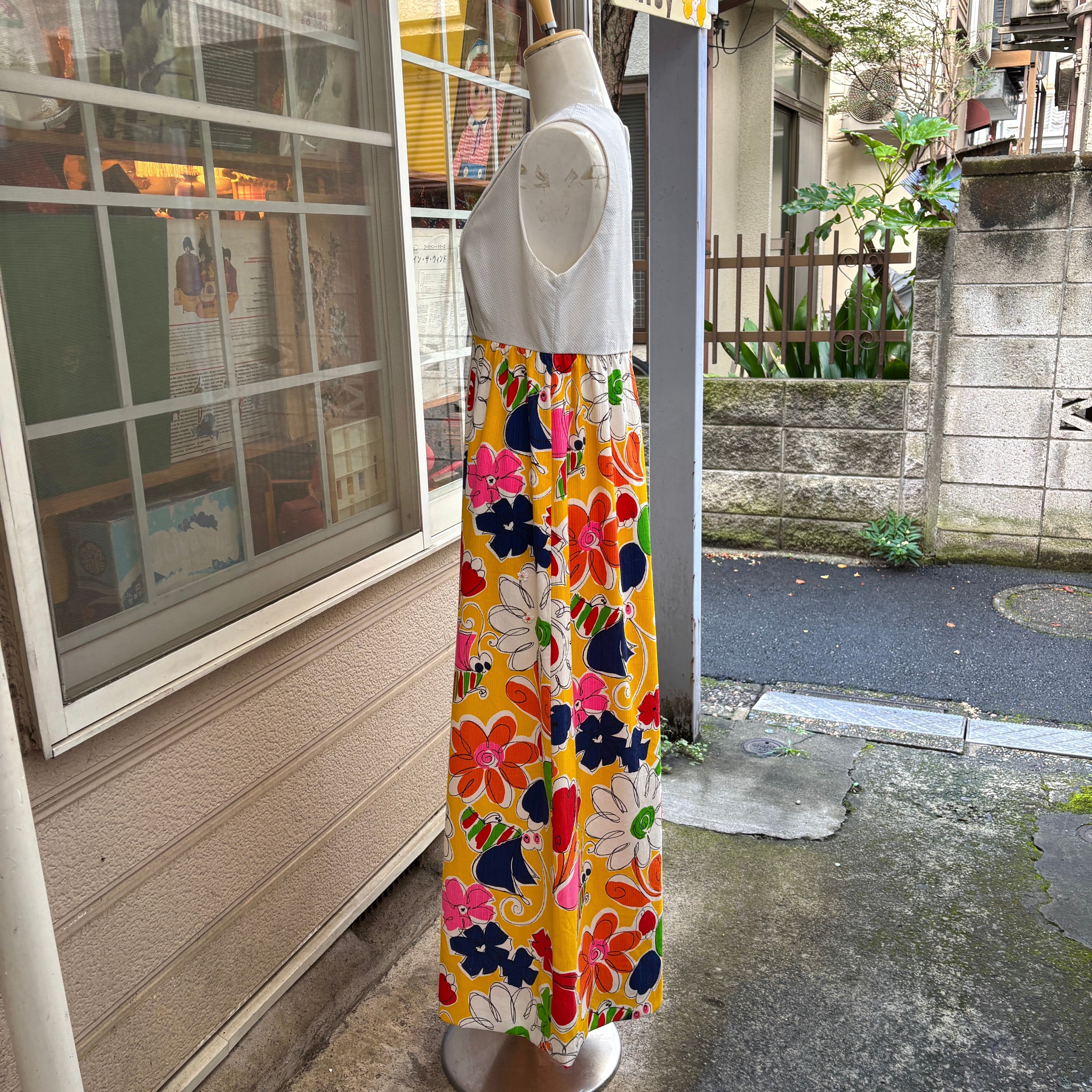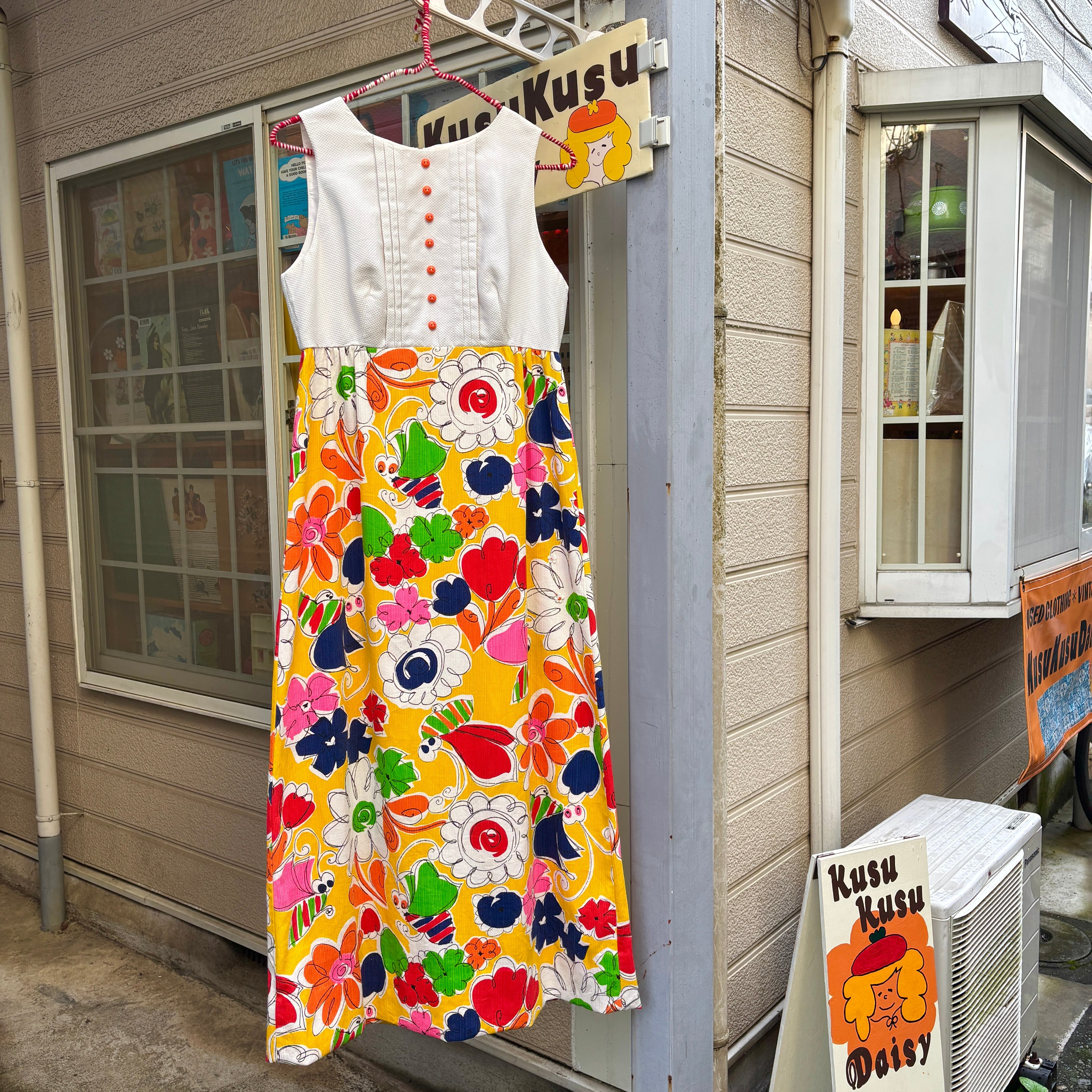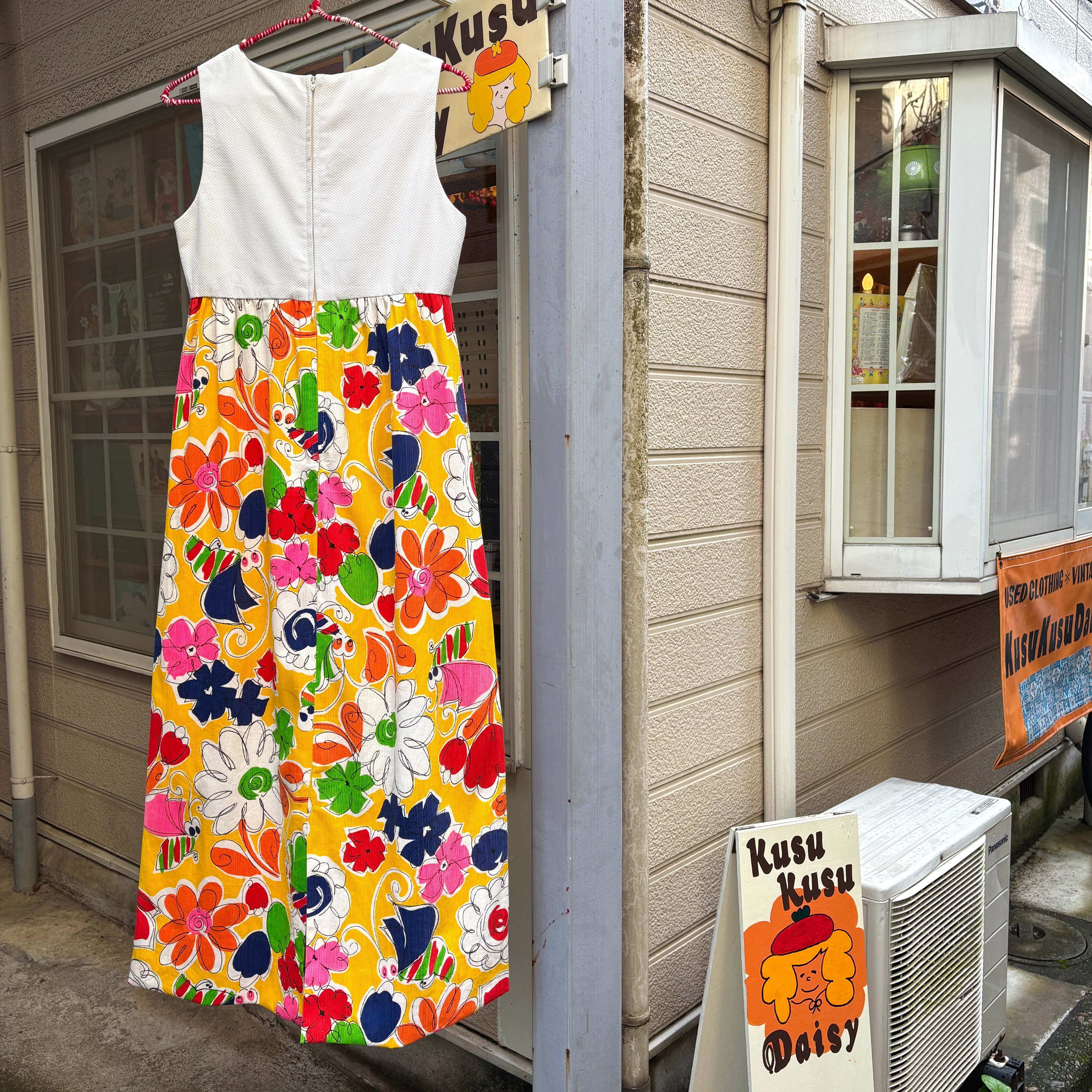 70'S USA Vintage flower&butterfly sleeveless dress。