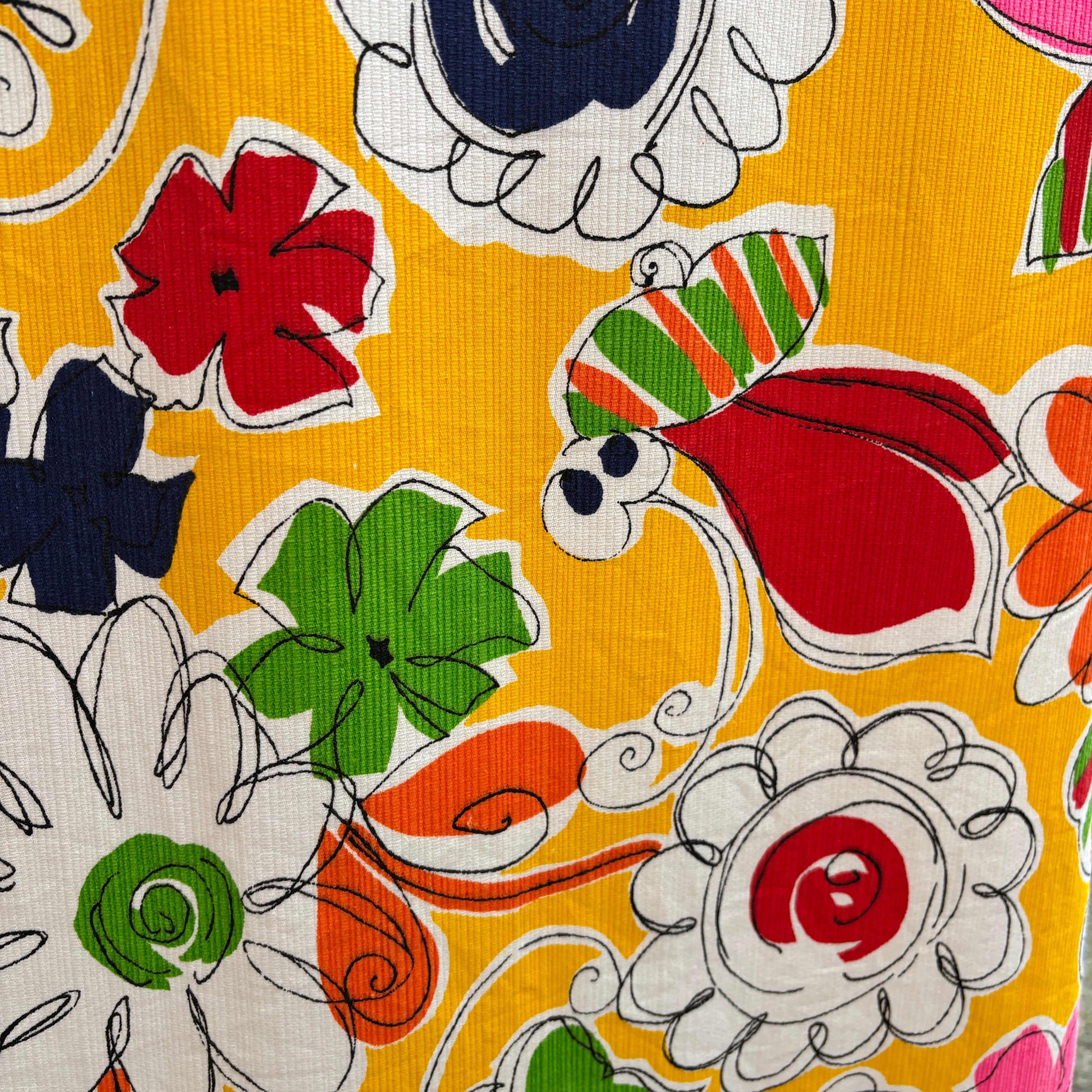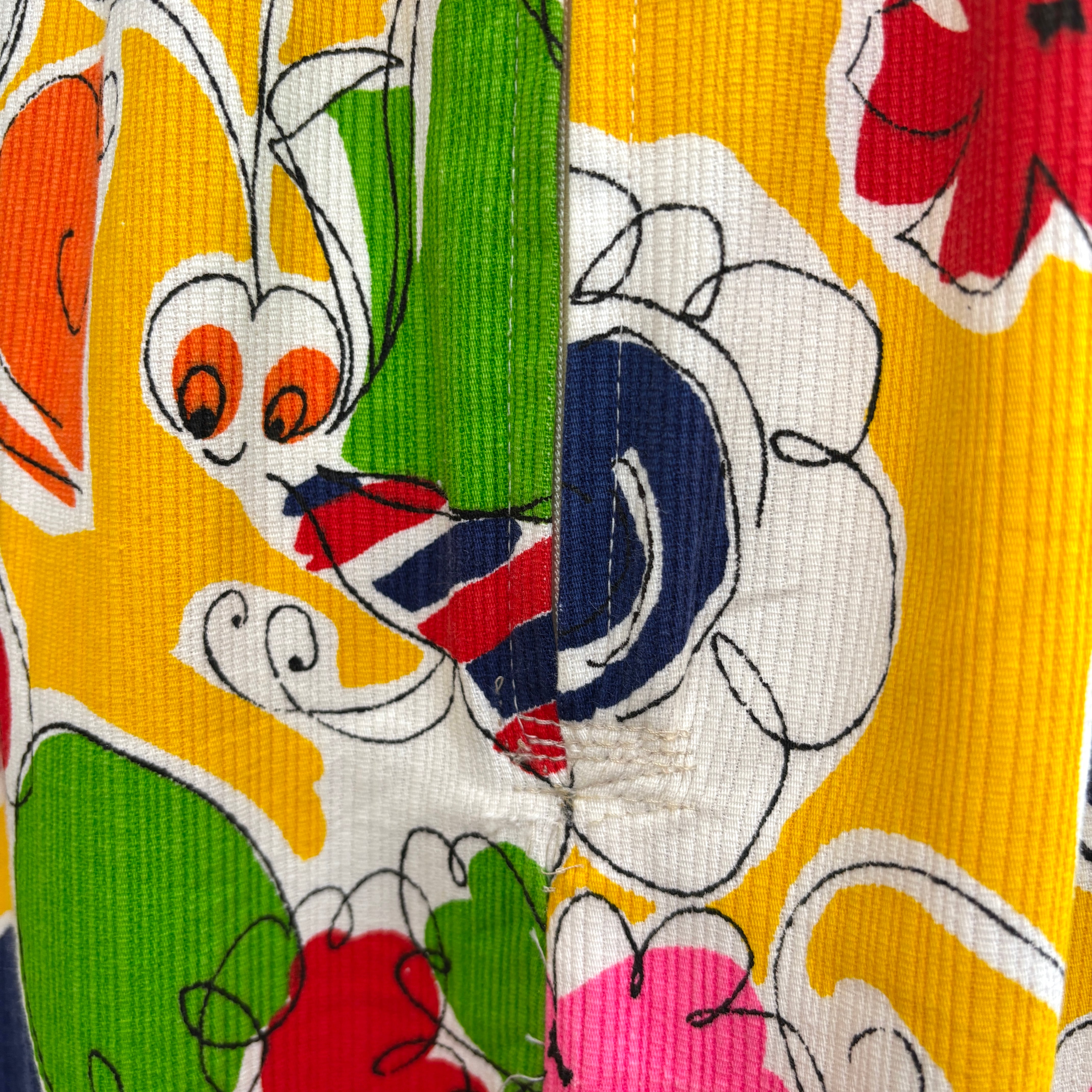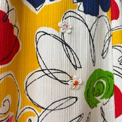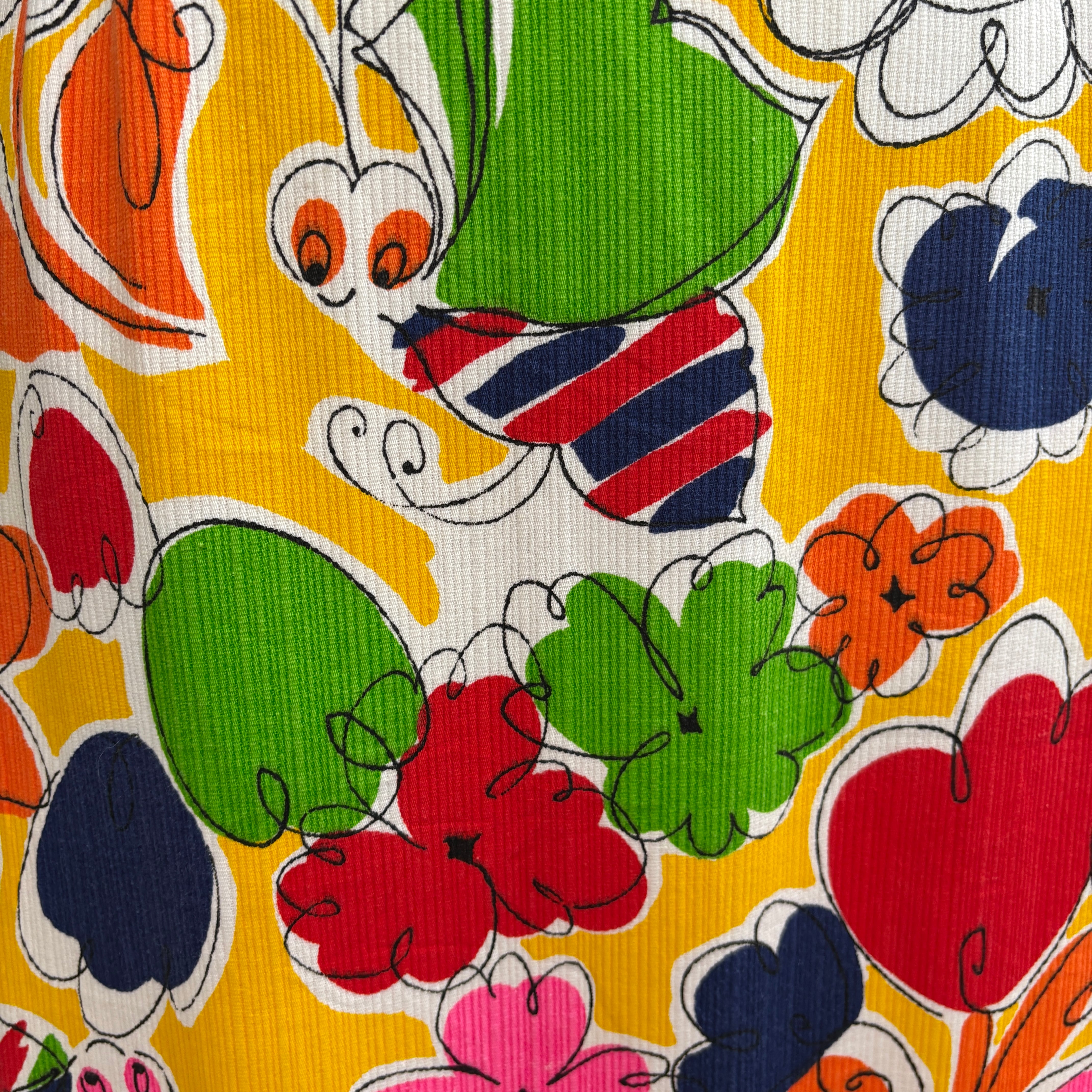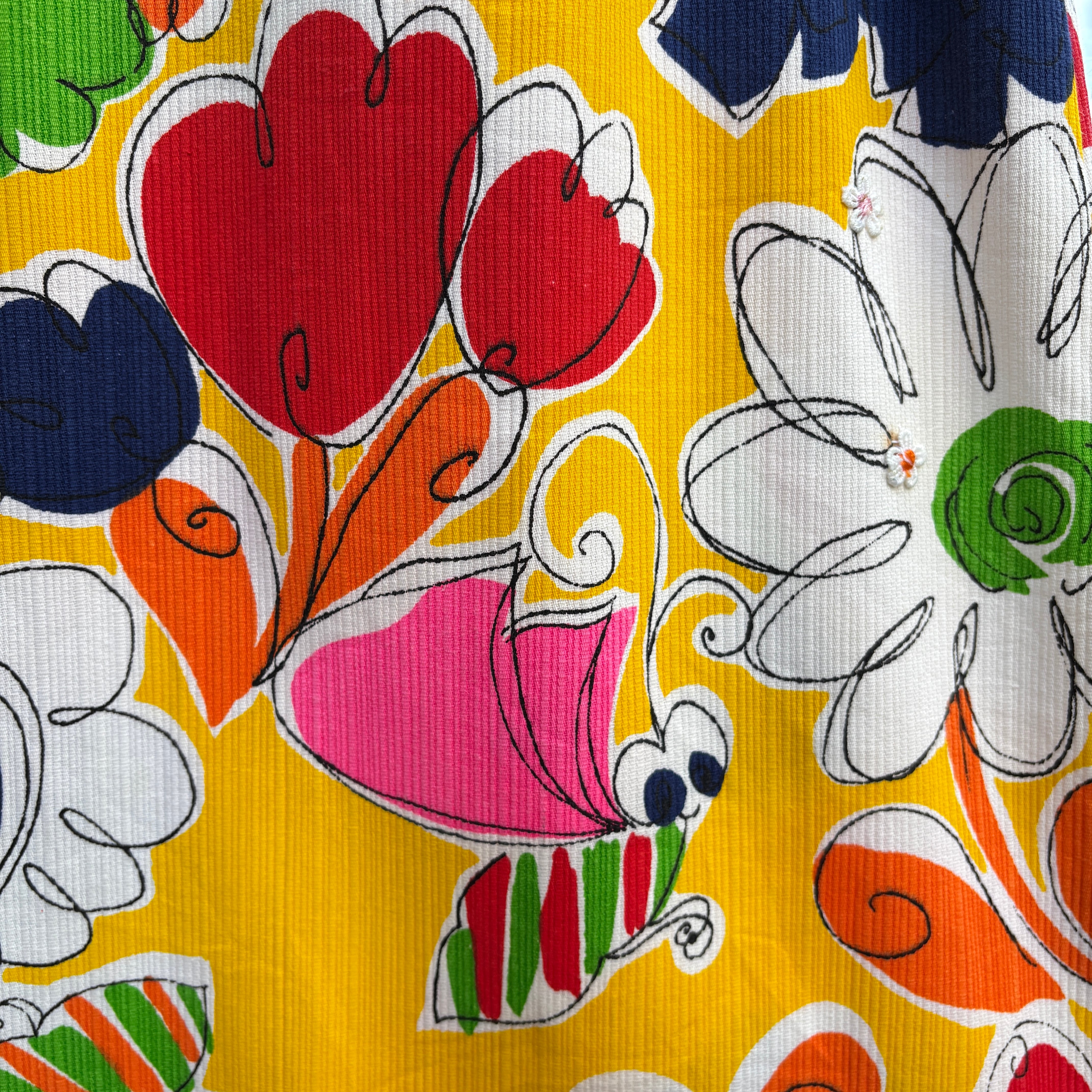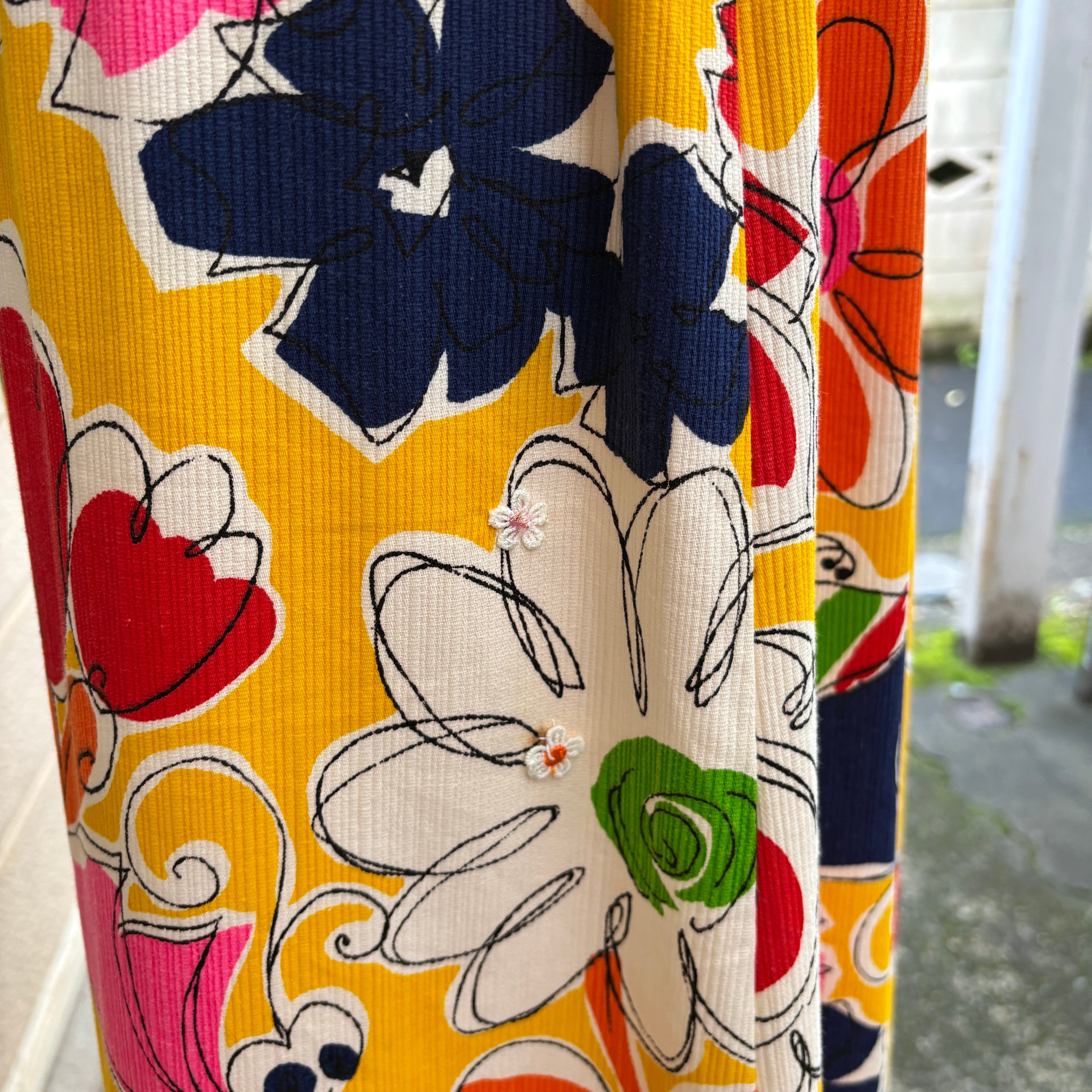 スカートは縦のラインに細かな織りの入った生地でイエローベースにオレンジ、ピンク、ネイビー、ライトグリーン、レッド、ホワイトのカラフルなカラーリングや手描きのようなポップなフラワー柄、ニコニコな表情のバタフライ柄がとっても可愛いデザインです。