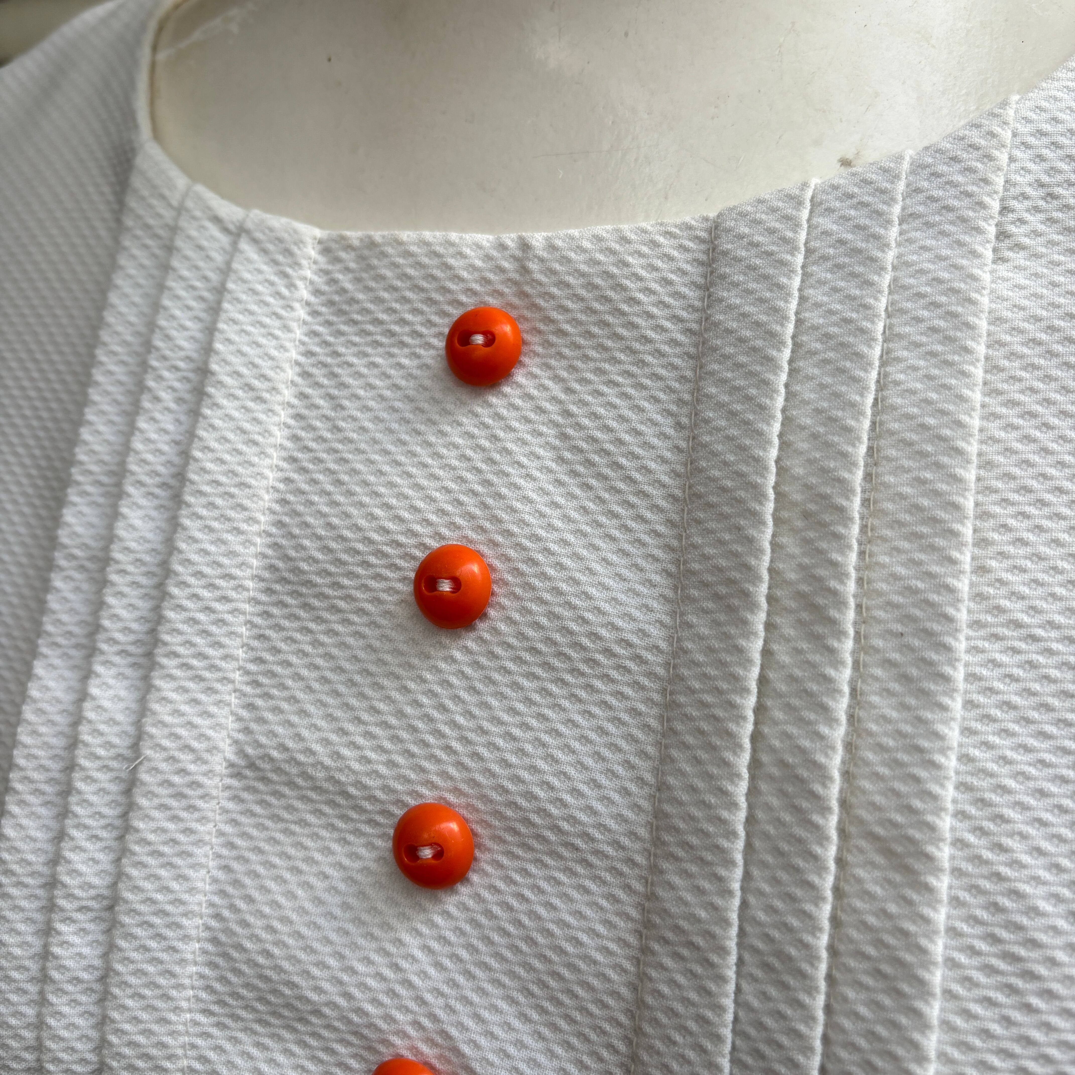 トップは細かな格子状の織りの入った生地で織り込まれたタックのラインやオレンジのオールドプラスチックの飾りボタンがとっても可愛いデザインです。