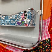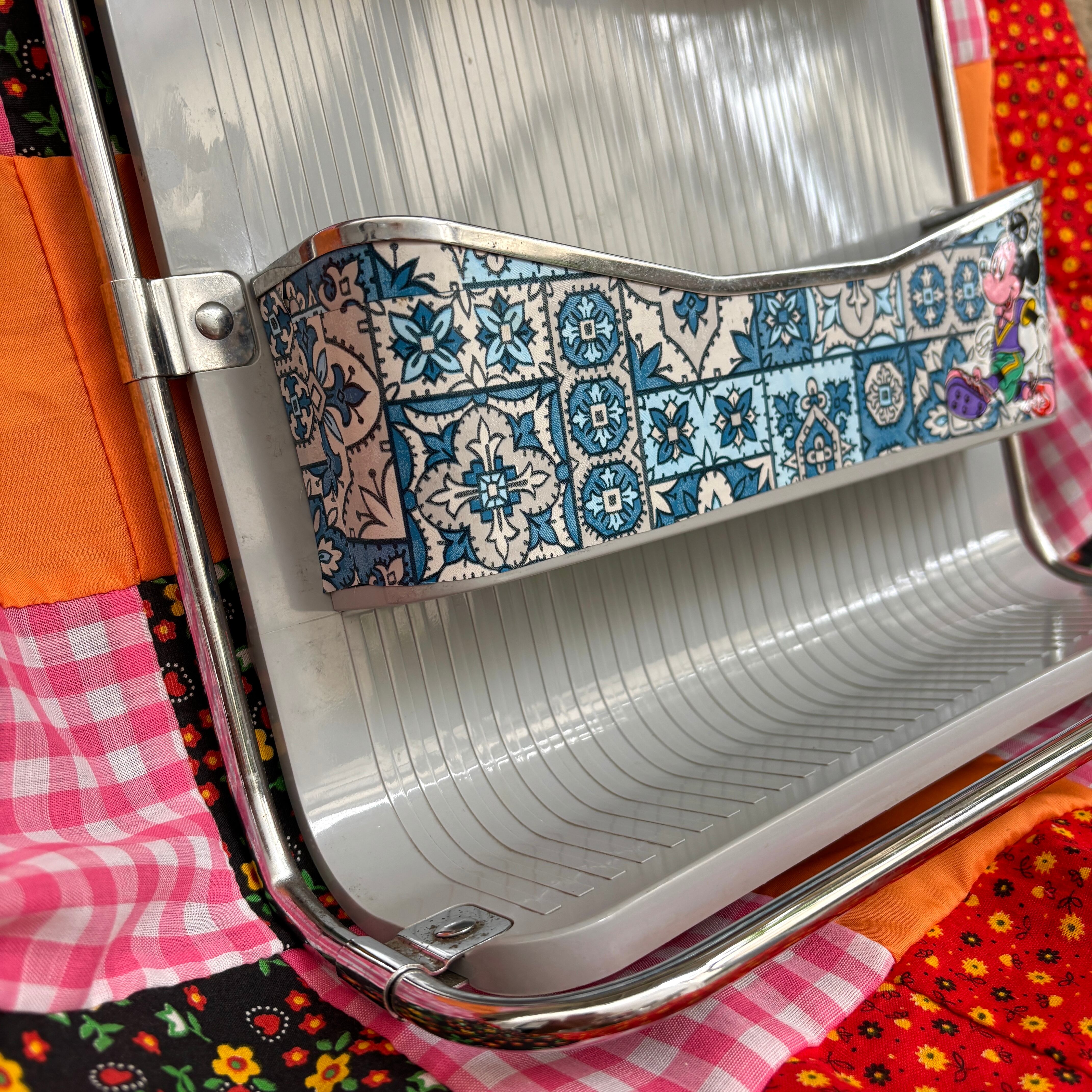上の片方のフレームとベースの留め具が欠損しておりますが、ご使用に支障は無く、リペアで貼られたフラワーパッチで欠損部分があまり気にならないかと思います。