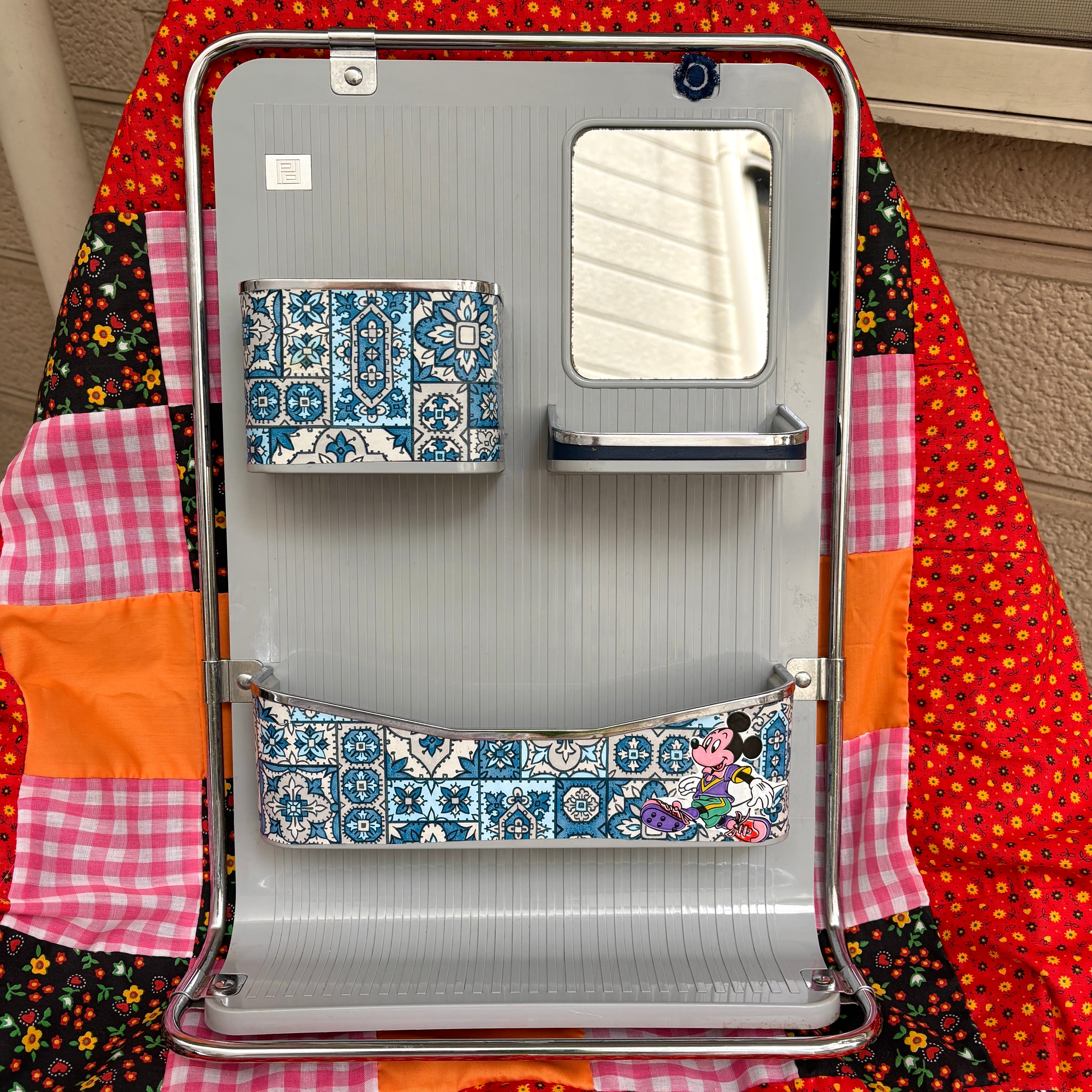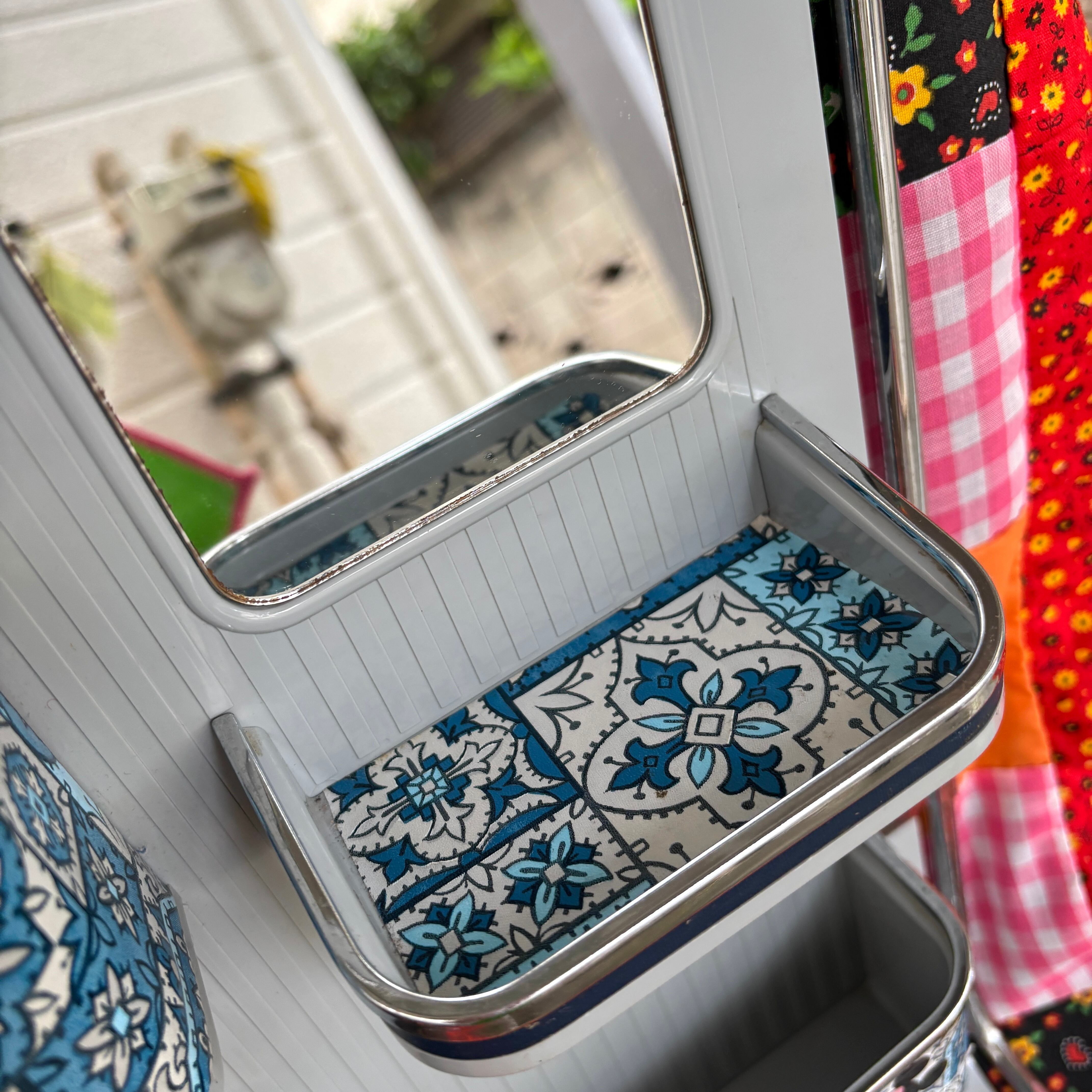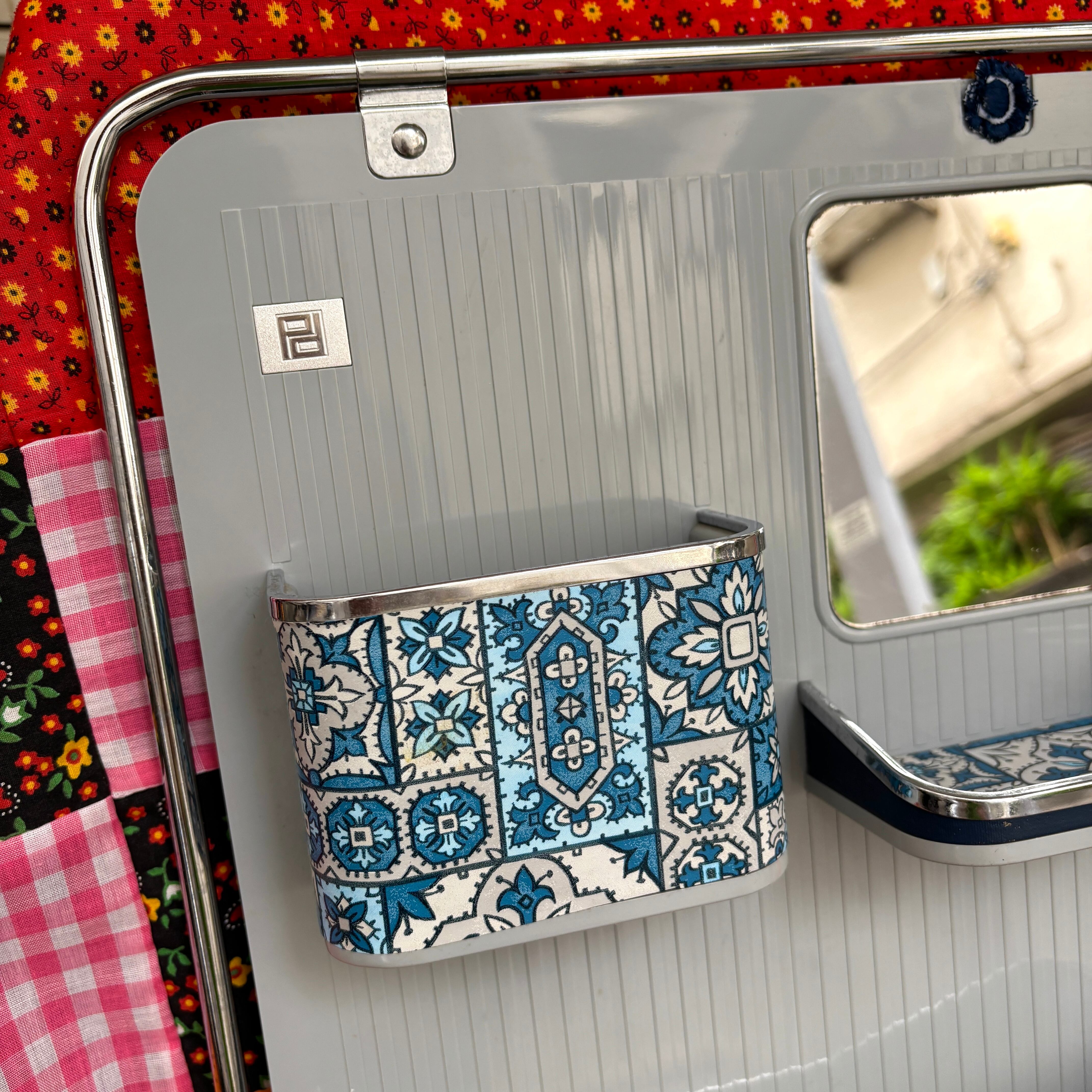 ごくライトなブルーに立体感のあるラインが入っているベースにシルバーのフレーム、角が丸みのあるミラーやヴィンテージのシールシートがカスタマイズされたポケットやトレーがとっても可愛いアイテムです。